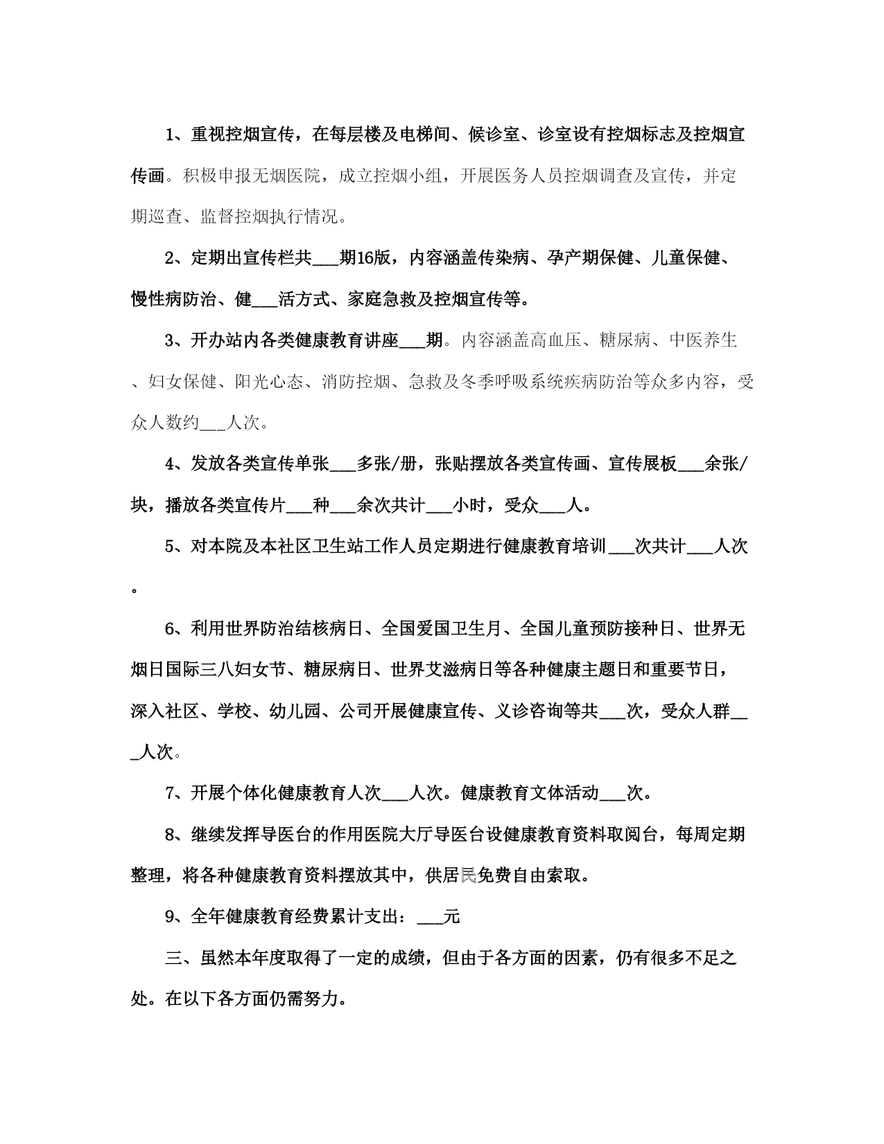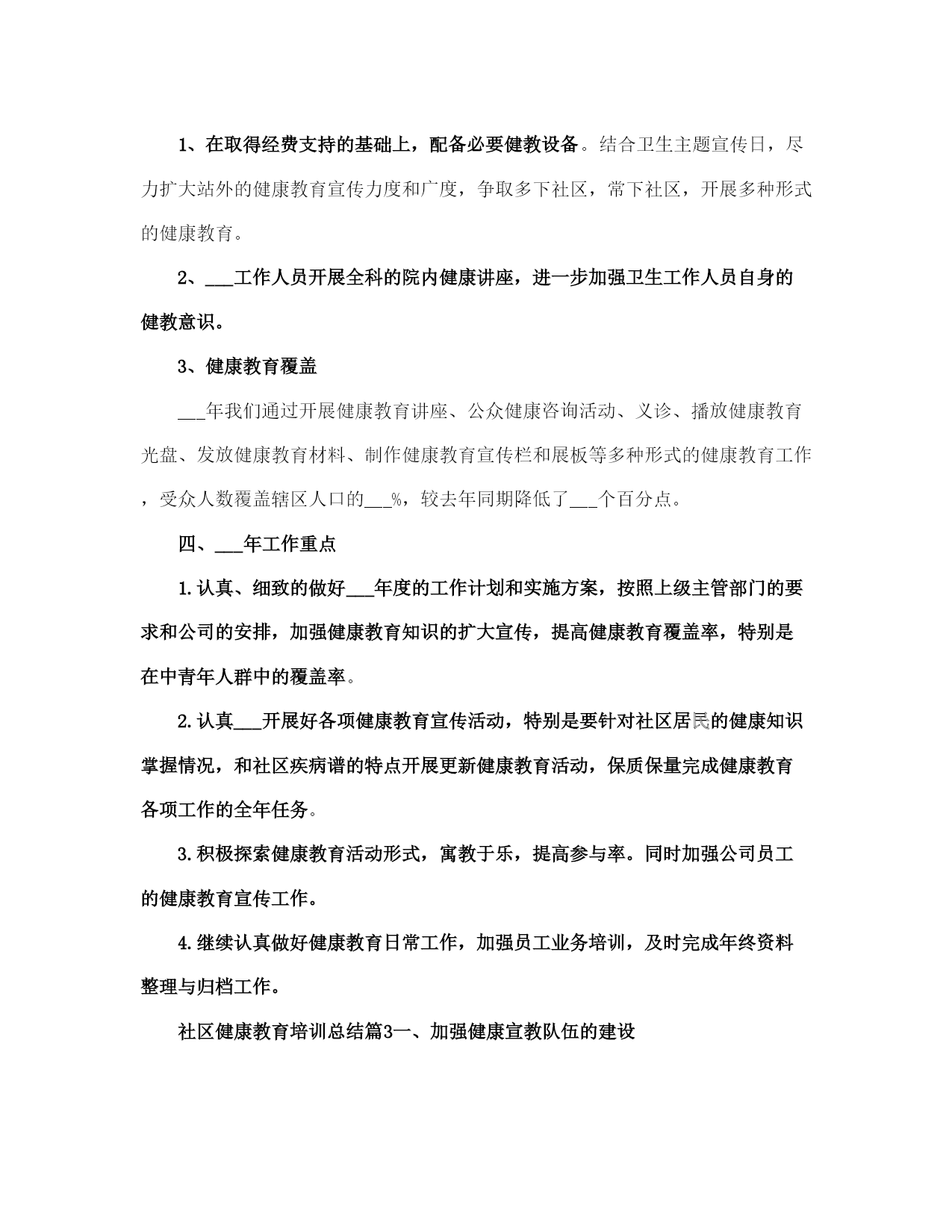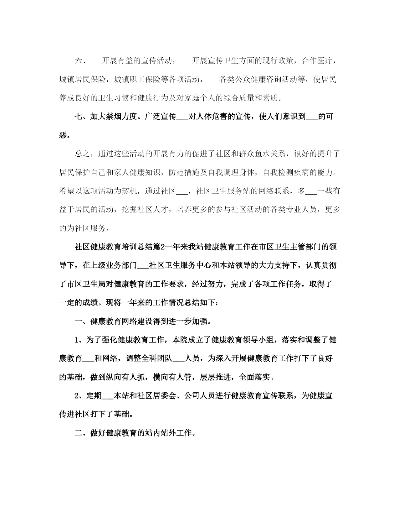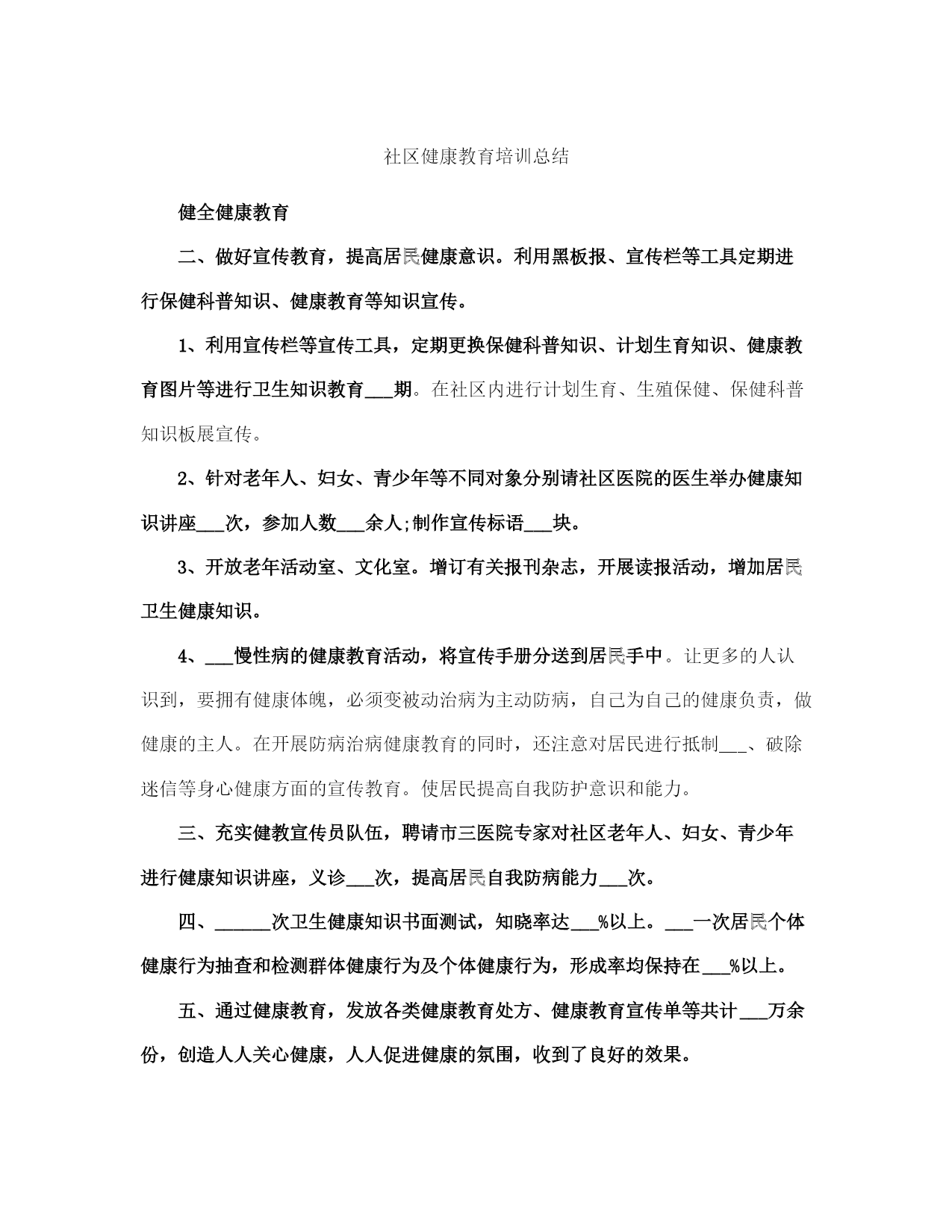 社区健康教育培训总结(完整版)文档资料可直接使用,可编辑,欢迎下载社区健康教育培训总结健全健康教育二、做好宣传教育,提高居民健康意识。利用黑板报、宣传栏等工具定期进行保健科普知识、健康教育等知识宣传。1、利用宣传栏等宣传工具,定期更换保健科普知识、计划生育知识、健康教育图片等进行卫生知识教育___期。在社区内进行计划生育、生殖保健、保健科普知识板展宣传。2、针对老年人、妇女、青少年等不同对象分别请社区医院的医生举办健康知识讲座___次,参加人数___余人;制作宣传标语___块。3、开放老年活动室、文化室。增订有关报刊杂志,开展读报活动,增加居民卫生健康知识。4、___慢性病的健康教育活动,将宣传手册分送到居民手中。让更多的人认识到,要拥有健康体魄,必须变被动治病为主动防病,自己为自己的健康负责,做健康的主人。在开展防病治病健康教育的同时,还注意对居民进行抵制___、破除迷信等身心健康方面的宣传教育。使居民提高自我防护意识和能力。三、充实健教宣传员队伍,聘请市三医院专家对社区老年人、妇女、青少年进行健康知识讲座,义诊___次,提高居民自我防病能力___次。四、______次卫生健康知识书面测试,知晓率达___%以上。___一次居民个体健康行为抽查和检测群体健康行为及个体健康行为,形成率均保持在___%以上。五、通过健康教育,发放各类健康教育处方、健康教育宣传单等共计___万余份,创造人人关心健康,人人促进健康的氛围,收到了良好的效果。六、___开展有益的宣传活动,___开展宣传卫生方面的现行政策,合作医疗,城镇居民保险,城镇职工保险等各项活动,___各类公众健康咨询活动等,使居民养成良好的卫生习惯和健康行为及对家庭个人的综合质量和素质。七、加大禁烟力度。广泛宣传___对人体危害的宣传,使人们意识到___的可恶。总之,通过这些活动的开展有力的促进了社区和群众鱼水关系,很好的提升了居民保护自己和家人健康知识,防范措施及自我调理身体,自我检测疾病的能力。希望以这项活动为契机,通过社区___,社区卫生服务站的网络联系,多___一些有益于居民的活动,挖掘社区人才,培养更多的参与社区活动的各类专业人员,更多的为社区服务。社区健康教育培训总结篇2一年来我站健康教育工作在市区卫生主管部门的领导下,在上级业务部门___社区卫生服务中心和本站领导的大力支持下,认真贯彻了市区卫生局对健康教育的工作要求,经过努力,完成了各项工作任务,取得了一定的成绩。现将一年来的工作情况总结如下:一、健康教育网络建设得到进一步加强。1、为了强化健康教育工作,本院成立了健康教育领导小组,落实和调整了健康教育___和网络,调整全科团队___人员,为深入开展健康教育工作打下了良好的基础,做到纵向有人抓,横向有人管,层层推进,全面落实。2、定期___本站和社区居委会、公司人员进行健康教育宣传联系,为健康宣传进社区打下了基础。二、做好健康教育的站内站外工作。1、重视控烟宣传,在每层楼及电梯间、候诊室、诊室设有控烟标志及控烟宣传画。积极申报无烟医院,成立控烟小组,开展医务人员控烟调查及宣传,并定期巡查、监督控烟执行情况。2、定期出宣传栏共___期16版,内容涵盖传染病、孕产期保健、儿童保健、慢性病防治、健___活方式、家庭急救及控烟宣传等。3、开办站内各类健康教育讲座___期。内容涵盖高血压、糖尿病、中医养生、妇女保健、阳光心态、消防控烟、急救及冬季呼吸系统疾病防治等众多内容,受众人数约___人次。4、发放各类宣传单张___多张/册,张贴摆放各类宣传画、宣传展板___余张/块,播放各类宣传片___种___余次共计___小时,受众___人。5、对本院及本社区卫生站工作人员定期进行健康教育培训___次共计___人次。6、利用世界防治结核病日、全国爱国卫生月、全国儿童预防接种日、世界无烟日国际三八妇女节、糖尿病日、世界艾滋病日等各种健康主题日和重要节日,深入社区、学校、幼儿园、公司开展健康宣传、义诊咨询等共___次,受众人群___人次。7、开展个体化健康教育人次___人次。健康教育文体活动___次。8、继续发挥导医台的作用医院大厅导医台设健康教育资料取阅台,每周定期整理,将各种健康教育资料摆放其中,供居民免费自由索取。9、全年健康教育经费累计支出:___元三、虽然本年度取得了一定的成绩,但由于各方面的因素,仍有很多不足之处。在以下各方面仍需努力。1、在取得经费支持的基础上,配备必要健教设备。结合卫生主题宣传日,尽力扩大站外的健康教育宣传力度和广度,争取多下社区,常下社区,开展多种形式的健康教育。2、___工作人员开展全科的院内健康讲座,进一步加强卫生工作人员自身的健教意识。3、健康教育覆盖___年我们通过开展健康教育讲座