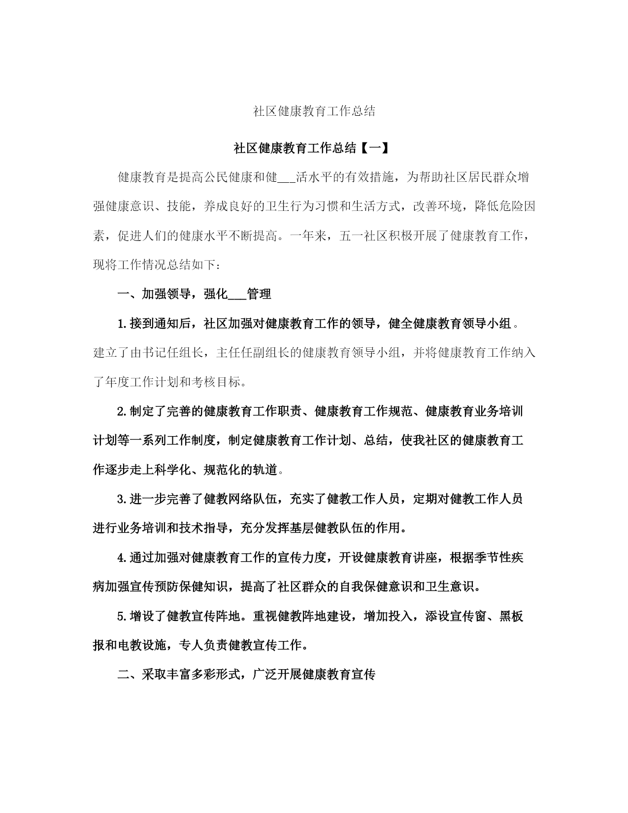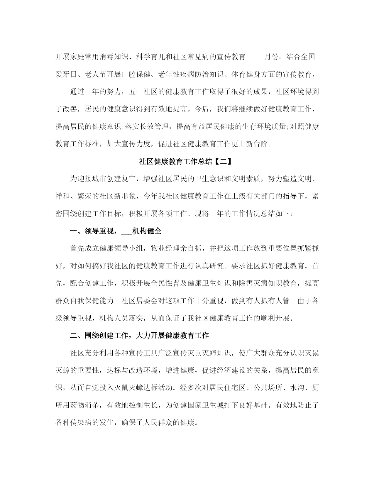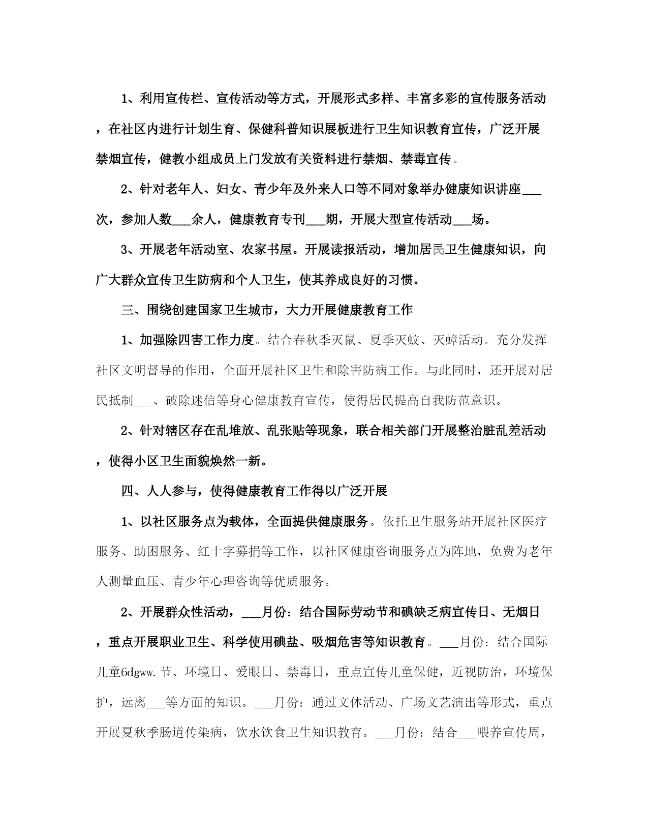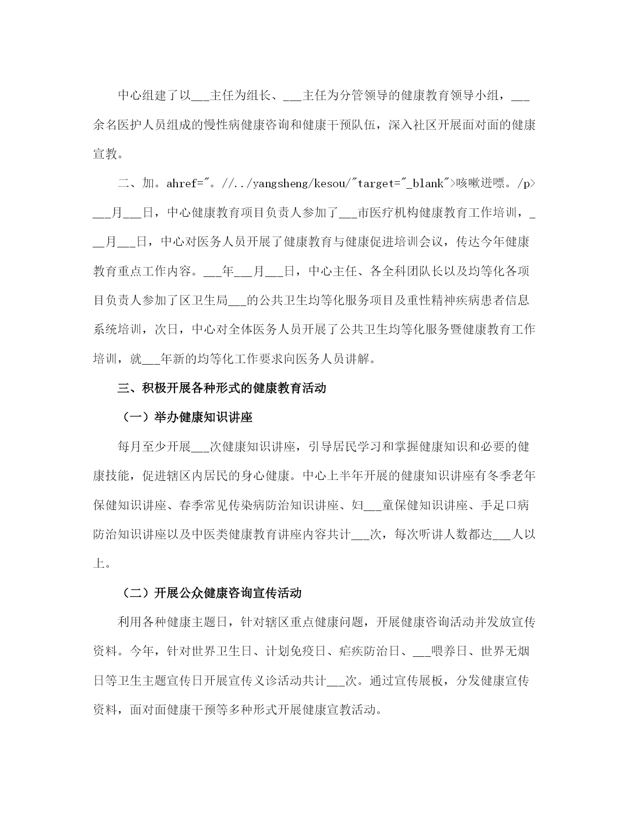 社区健康教育培训总结(完整版)文档资料可直接使用,可编辑,欢迎下载社区健康教育培训总结健全健康教育二、做好宣传教育,提高居民健康意识。利用黑板报、宣传栏等工具定期进行保健科普知识、健康教育等知识宣传。1、利用宣传栏等宣传工具,定期更换保健科普知识、计划生育知识、健康教育图片等进行卫生知识教育___期。在社区内进行计划生育、生殖保健、保健科普知识板展宣传。2、针对老年人、妇女、青少年等不同对象分别请社区医院的医生举办健康知识讲座___次,参加人数___余人;制作宣传标语___块。3、开放老年活动室、文化室。增订有关报刊杂志,开展读报活动,增加居民卫生健康知识。4、___慢性病的健康教育活动,将宣传手册分送到居民手中。让更多的人认识到,要拥有健康体魄,必须变被动治病为主动防病,自己为自己的健康负责,做健康的主人。在开展防病治病健康教育的同时,还注意对居民进行抵制___、破除迷信等身心健康方面的宣传教育。使居民提高自我防护意识和能力。三、充实健教宣传员队伍,聘请市三医院专家对社区老年人、妇女、青少年进行健康知识讲座,义诊___次,提高居民自我防病能力___次。四、______次卫生健康知识书面测试,知晓率达___%以上。___一次居民个体健康行为抽查和检测群体健康行为及个体健康行为,形成率均保持在___%以上。五、通过健康教育,发放各类健康教育处方、健康教育宣传单等共计___万余份,创造人人关心健康,人人促进健康的氛围,收到了良好的效果。六、___开展有益的宣传活动,___开展宣传卫生方面的现行政策,合作医疗,城镇居民保险,城镇职工保险等各项活动,___各类公众健康咨询活动等,使居民养成良好的卫生习惯和健康行为及对家庭个人的综合质量和素质。七、加大禁烟力度。广泛宣传___对人体危害的宣传,使人们意识到___的可恶。总之,通过这些活动的开展有力的促进了社区和群众鱼水关系,很好的提升了居民保护自己和家人健康知识,防范措施及自我调理身体,自我检测疾病的能力。希望以这项活动为契机,通过社区___,社区卫生服务站的网络联系,多___一些有益于居民的活动,挖掘社区人才,培养更多的参与社区活动的各类专业人员,更多的为社区服务。社区健康教育培训总结篇2一年来我站健康教育工作在市区卫生主管部门的领导下,在上级业务部门___社区卫生服务中心和本站领导的大力支持下,认真贯彻了市区卫生局对健康教育的工作要求,经过努力,完成了各项工作任务,取得了一定的成绩。现将一年来的工作情况总结如下:一、健康教育网络建设得到进一步加强。1、为了强化健康教育工作,本院成立了健康教育领导小组,落实和调整了健康教育___和网络,调整全科团队___人员,为深入开展健康教育工作打下了良好的基础,做到纵向有人抓,横向有人管,层层推进,全面落实。2、定期___本站和社区居委会、公司人员进行健康教育宣传联系,为健康宣传进社区打下了基础。二、做好健康教育的站内站外工作。1、重视控烟宣传,在每层楼及电梯间、候诊室、诊室设有控烟标志及控烟宣传画。积极申报无烟医院,成立控烟小组,开展医务人员控烟调查及宣传,并定期巡查、监督控烟执行情况。2、定期出宣传栏共___期16版,内容涵盖传染病、孕产期保健、儿童保健、慢性病防治、健___活方式、家庭急救及控烟宣传等。3、开办站内各类健康教育讲座___期。内容涵盖高血压、糖尿病、中医养生、妇女保健、阳光心态、消防控烟、急救及冬季呼吸系统疾病防治等众多内容,受众人数约___人次。4、发放各类宣传单张___多张/册,张贴摆放各类宣传画、宣传展板___余张/块,播放各类宣传片___种___余次共计___小时,受众___人。5、对本院及本社区卫生站工作人员定期进行健康教育培训___次共计___人次。6、利用世界防治结核病日、全国爱国卫生月、全国儿童预防接种日、世界无烟日国际三八妇女节、糖尿病日、世界艾滋病日等各种健康主题日和重要节日,深入社区、学校、幼儿园、公司开展健康宣传、义诊咨询等共___次,受众人群___人次。7、开展个体化健康教育人次___人次。健康教育文体活动___次。8、继续发挥导医台的作用医院大厅导医台设健康教育资料取阅台,每周定期整理,将各种健康教育资料摆放其中,供居民免费自由索取。9、全年健康教育经费累计支出:___元三、虽然本年度取得了一定的成绩,但由于各方面的因素,仍有很多不足之处。在以下各方面仍需努力。1、在取得经费支持的基础上,配备必要健教设备。结合卫生主题宣传日,尽力扩大站外的健康教育宣传力度和广度,争取多下社区,常下社区,开展多种形式的健康教育。2、___工作人员开展全科的院内健康讲座,进一步加强卫生工作人员自身的健教意识。3、健康教育覆盖___年我们通过开展健康教育讲座