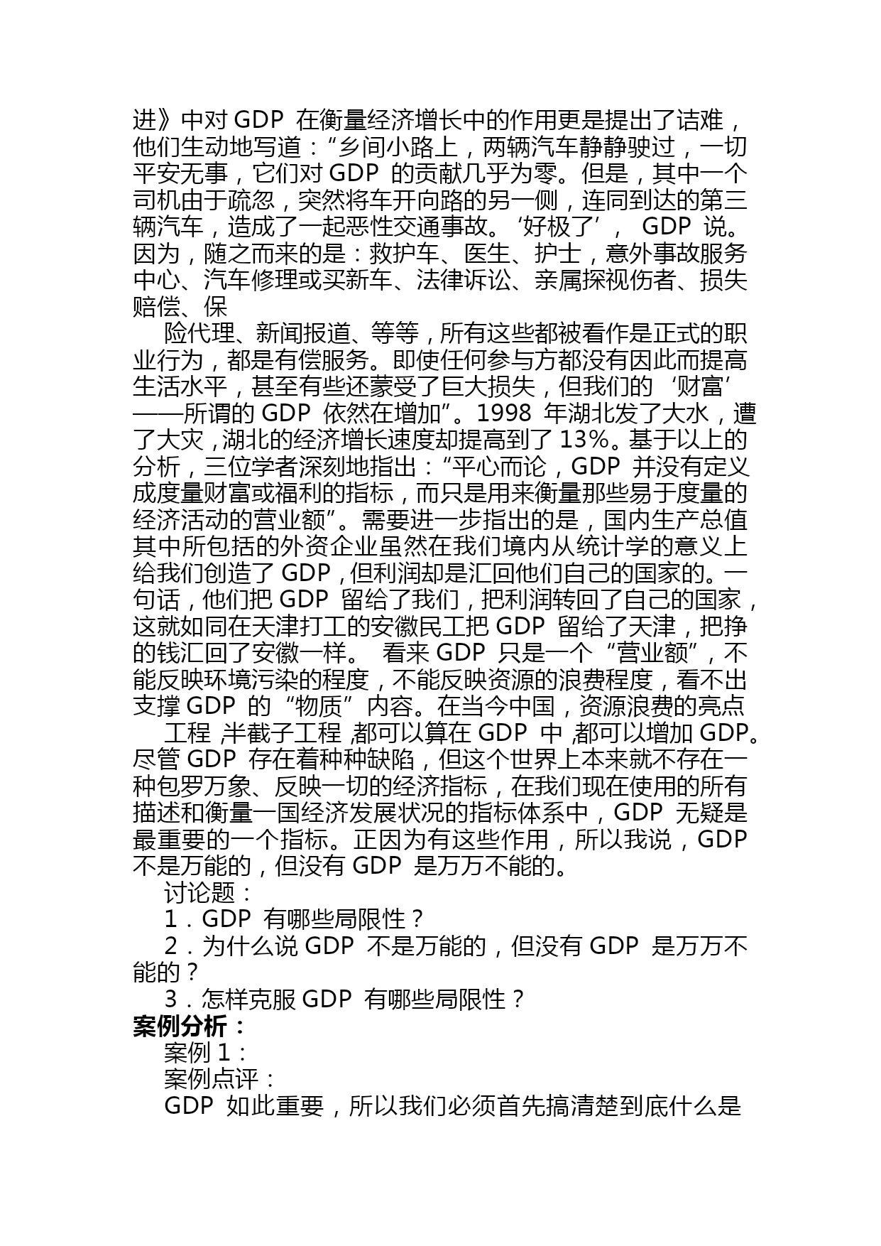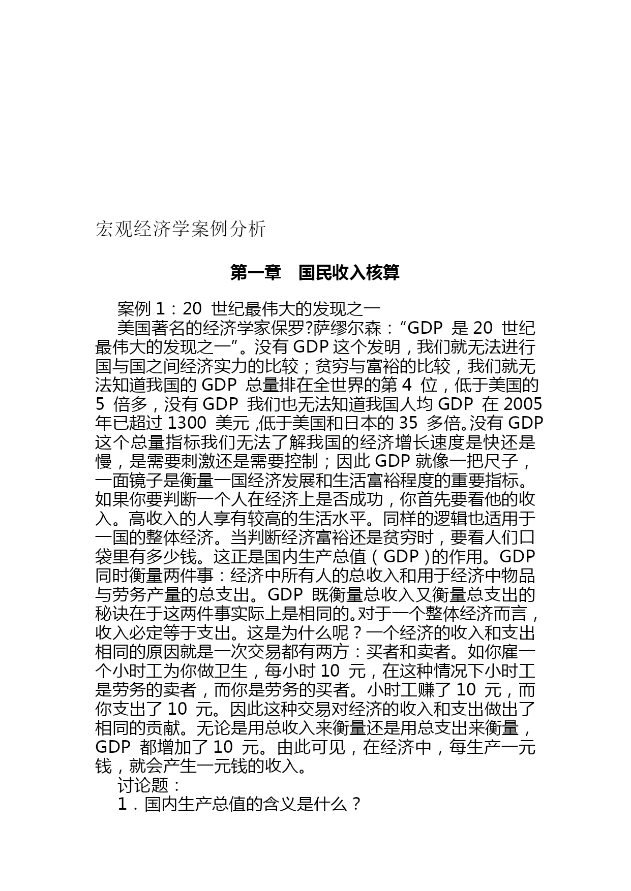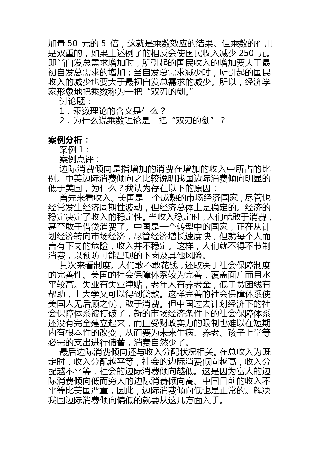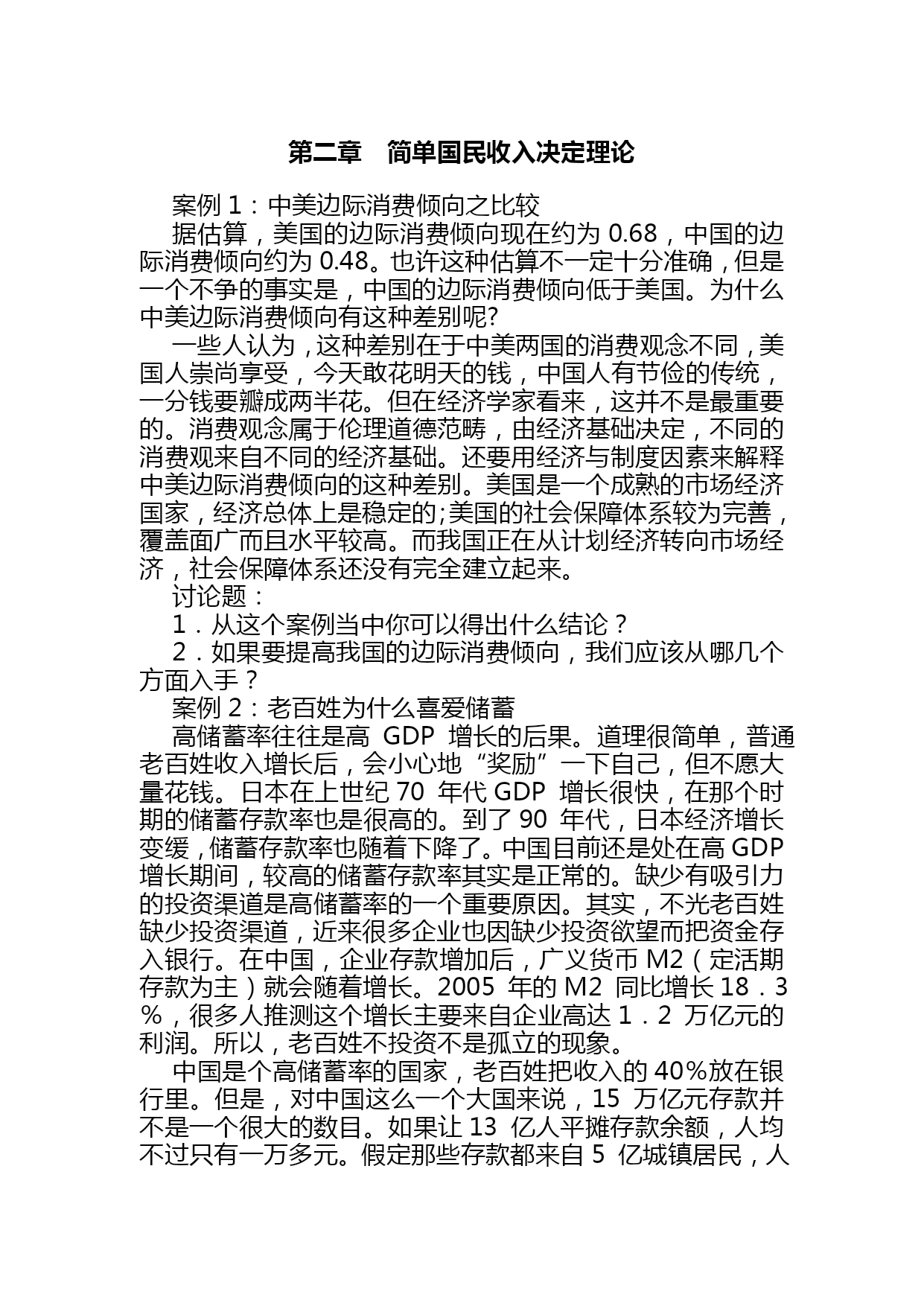 宏观经济学案例分析(完整版)资料(可以直接使用,可编辑优秀版资料,欢迎下载)宏观经济学案例分析第一章国民收入核算案例1:20世纪最伟大的发现之一美国著名的经济学家保罗?萨缪尔森:“GDP是20世纪最伟大的发现之一”。没有GDP这个发明,我们就无法进行国与国之间经济实力的比较;贫穷与富裕的比较,我们就无法知道我国的GDP总量排在全世界的第4位,低于美国的5倍多,没有GDP我们也无法知道我国人均GDP在2005年已超过1300美元,低于美国和日本的35多倍。没有GDP这个总量指标我们无法了解我国的经济增长速度是快还是慢,是需要刺激还是需要控制;因此GDP就像一把尺子,一面镜子是衡量一国经济发展和生活富裕程度的重要指标。如果你要判断一个人在经济上是否成功,你首先要看他的收入。高收入的人享有较高的生活水平。同样的逻辑也适用于一国的整体经济。当判断经济富裕还是贫穷时,要看人们口袋里有多少钱。这正是国内生产总值(GDP)的作用。GDP同时衡量两件事:经济中所有人的总收入和用于经济中物品与劳务产量的总支出。GDP既衡量总收入又衡量总支出的秘诀在于这两件事实际上是相同的。对于一个整体经济而言,收入必定等于支出。这是为什么呢?一个经济的收入和支出相同的原因就是一次交易都有两方:买者和卖者。如你雇一个小时工为你做卫生,每小时10元,在这种情况下小时工是劳务的卖者,而你是劳务的买者。小时工赚了10元,而你支出了10元。因此这种交易对经济的收入和支出做出了相同的贡献。无论是用总收入来衡量还是用总支出来衡量,GDP都增加了10元。由此可见,在经济中,每生产一元钱,就会产生一元钱的收入。讨论题:1.国内生产总值的含义是什么?2.计算国内生产总值支出法和收入法是什么?3.为什么国内生产总值(GDP)是20世纪最伟大的发明之一?案例2:从GDP看我国的差距国际货币基金组织按汇率法计算了179个国家和地区2005年国内生产总值和人均GDP的统计数据。数据显示,2005年GDP位居前十位的国家分别是美国、日本、德国、中国、英国、法国、意大利、西班牙、加拿大、和巴西。数据同时显示,2005年世界179个国家排名,中国人均GDP为1352美元,位居世界第112位,仍属中下收入国家行列。尽管与世界发达国家相比,这一数字还相当小,但中国人均GDP突破一千美元,表明中国跨过一个“门槛”。2005年人均GDP位居世界前十位的国家分别是卢森堡、挪威、瑞士、爱尔兰、丹麦、冰岛、美国、瑞典、英国和日本。中国香港居世界第23位;中国台湾居世界第36位。从上述数字看出,在2005年我国的GDP总量已超过了10万亿人民币,我国的经济增长速度是9.2%,这是非常了不起的成绩,尤其是在各国经济衰退的宏观形势下,但是我们和发达国家比差距还是很大的,从GDP的总量来看,如果我们把这10多万亿人民币比做一个蛋糕,那么美国就6个蛋糕,从人均GDP看差距就更大了,美国6个蛋糕除以3亿人,我们一个蛋糕除以13亿人,美国的人均GDP高出我们35倍之多。中外很多经济学家估计照这样的速度增长我国GDP总量有望在2021年赶上美国,但人均量赶上美国还任重道远。讨论题:1.我国与发达国家在GDP上的差距说明了什么?2.怎样才能增加我国的GDP总量和人均GDP量?案例3:GDP不是万能的,但没有GDP是万万不能的越来越多的人包括非常著名的学者,对GDP衡量经济增长的重要性发生了怀疑。斯蒂格利茨曾经指出,如果一对夫妇留在家中打扫卫生和做饭,这将不会被列入GDP的统计之内,假如这对夫妇外出工作,另外雇人做清洁和烹调工作,那么这对夫妇和佣人的经济活动都会被计入GDP。说得更明白一些,如果一名男士雇佣一名保姆,保姆的工资也将计入GDP。如果这位男士与保姆结婚,给保姆不发工资了,GDP就会减少。德国学者厄恩斯特?B?冯?魏茨察克和两位美国学者艾墨里?B洛文斯,L?亨特?洛文斯在他们合著的《四倍跃进》中对GDP在衡量经济增长中的作用更是提出了诘难,他们生动地写道:“乡间小路上,两辆汽车静静驶过,一切平安无事,它们对GDP的贡献几乎为零。但是,其中一个司机由于疏忽,突然将车开向路的另一侧,连同到达的第三辆汽车,造成了一起恶性交通事故。‘好极了’,GDP说。因为,随之而来的是:救护车、医生、护士,意外事故服务中心、汽车修理或买新车、法律诉讼、亲属探视伤者、损失赔偿、保险代理、新闻报道、等等,所有这些都被看作是正式的职业行为,都是有偿服务。即使任何参与方都没有因此而提高生活水平,甚至有些还蒙受了巨大损失,但我们的‘财富’——所谓的GDP依然在增加”。1998年湖北发了大水,遭了大灾,湖北的经济增长速度却提高到了13%。基于以上的分析,三位学者深刻地指出:“平心而论,GDP并没有定义成
