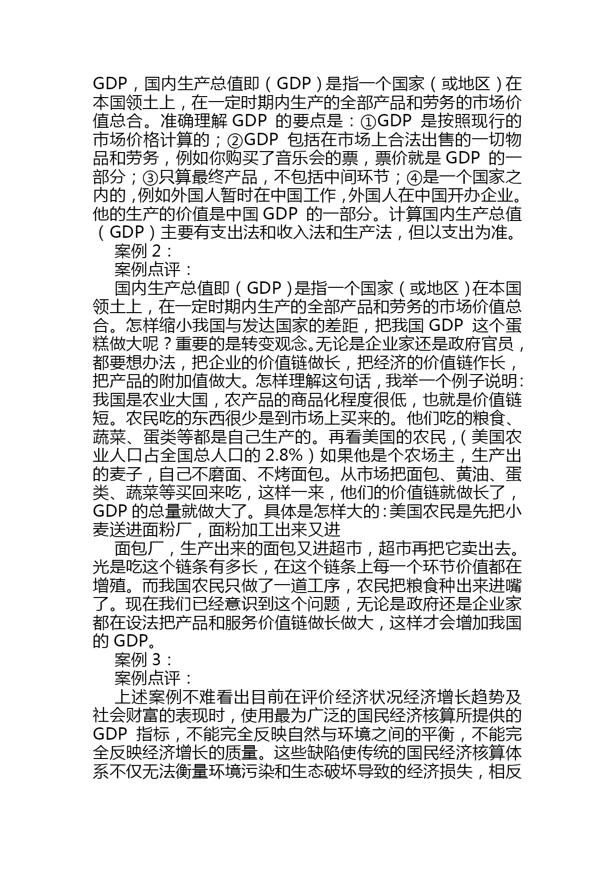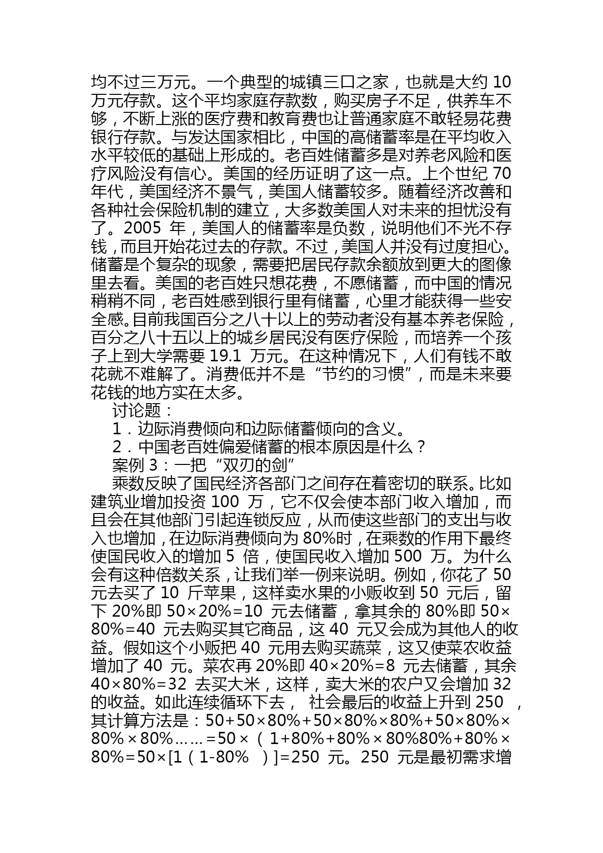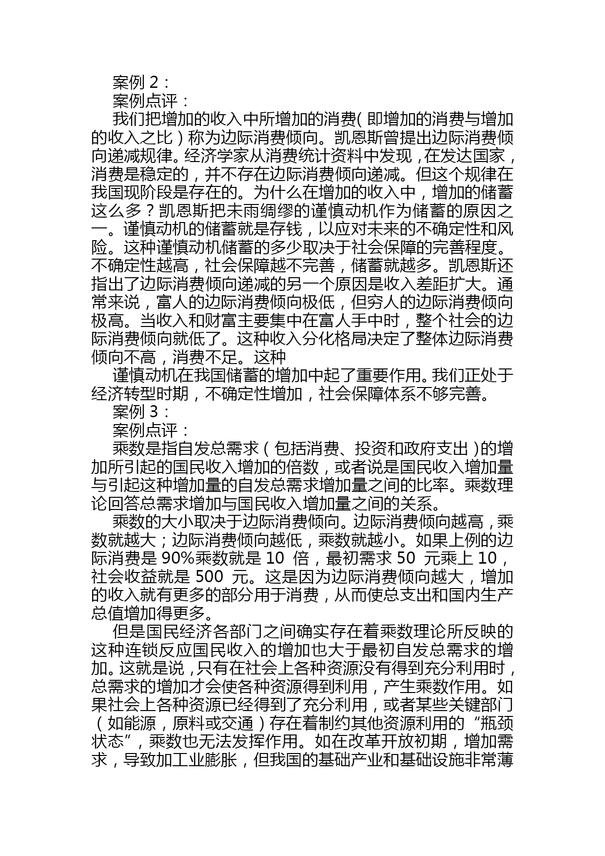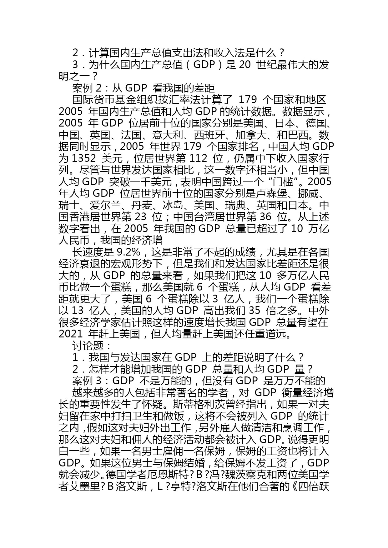 宏观经济学案例分析(完整版)资料(可以直接使用,可编辑优秀版资料,欢迎下载)宏观经济学案例分析第一章国民收入核算案例1:20世纪最伟大的发现之一美国著名的经济学家保罗?萨缪尔森:“GDP是20世纪最伟大的发现之一”。没有GDP这个发明,我们就无法进行国与国之间经济实力的比较;贫穷与富裕的比较,我们就无法知道我国的GDP总量排在全世界的第4位,低于美国的5倍多,没有GDP我们也无法知道我国人均GDP在2005年已超过1300美元,低于美国和日本的35多倍。没有GDP这个总量指标我们无法了解我国的经济增长速度是快还是慢,是需要刺激还是需要控制;因此GDP就像一把尺子,一面镜子是衡量一国经济发展和生活富裕程度的重要指标。如果你要判断一个人在经济上是否成功,你首先要看他的收入。高收入的人享有较高的生活水平。同样的逻辑也适用于一国的整体经济。当判断经济富裕还是贫穷时,要看人们口袋里有多少钱。这正是国内生产总值(GDP)的作用。GDP同时衡量两件事:经济中所有人的总收入和用于经济中物品与劳务产量的总支出。GDP既衡量总收入又衡量总支出的秘诀在于这两件事实际上是相同的。对于一个整体经济而言,收入必定等于支出。这是为什么呢?一个经济的收入和支出相同的原因就是一次交易都有两方:买者和卖者。如你雇一个小时工为你做卫生,每小时10元,在这种情况下小时工是劳务的卖者,而你是劳务的买者。小时工赚了10元,而你支出了10元。因此这种交易对经济的收入和支出做出了相同的贡献。无论是用总收入来衡量还是用总支出来衡量,GDP都增加了10元。由此可见,在经济中,每生产一元钱,就会产生一元钱的收入。讨论题:1.国内生产总值的含义是什么?2.计算国内生产总值支出法和收入法是什么?3.为什么国内生产总值(GDP)是20世纪最伟大的发明之一?案例2:从GDP看我国的差距国际货币基金组织按汇率法计算了179个国家和地区2005年国内生产总值和人均GDP的统计数据。数据显示,2005年GDP位居前十位的国家分别是美国、日本、德国、中国、英国、法国、意大利、西班牙、加拿大、和巴西。数据同时显示,2005年世界179个国家排名,中国人均GDP为1352美元,位居世界第112位,仍属中下收入国家行列。尽管与世界发达国家相比,这一数字还相当小,但中国人均GDP突破一千美元,表明中国跨过一个“门槛”。2005年人均GDP位居世界前十位的国家分别是卢森堡、挪威、瑞士、爱尔兰、丹麦、冰岛、美国、瑞典、英国和日本。中国香港居世界第23位;中国台湾居世界第36位。从上述数字看出,在2005年我国的GDP总量已超过了10万亿人民币,我国的经济增长速度是9.2%,这是非常了不起的成绩,尤其是在各国经济衰退的宏观形势下,但是我们和发达国家比差距还是很大的,从GDP的总量来看,如果我们把这10多万亿人民币比做一个蛋糕,那么美国就6个蛋糕,从人均GDP看差距就更大了,美国6个蛋糕除以3亿人,我们一个蛋糕除以13亿人,美国的人均GDP高出我们35倍之多。中外很多经济学家估计照这样的速度增长我国GDP总量有望在2021年赶上美国,但人均量赶上美国还任重道远。讨论题:1.我国与发达国家在GDP上的差距说明了什么?2.怎样才能增加我国的GDP总量和人均GDP量?案例3:GDP不是万能的,但没有GDP是万万不能的越来越多的人包括非常著名的学者,对GDP衡量经济增长的重要性发生了怀疑。斯蒂格利茨曾经指出,如果一对夫妇留在家中打扫卫生和做饭,这将不会被列入GDP的统计之内,假如这对夫妇外出工作,另外雇人做清洁和烹调工作,那么这对夫妇和佣人的经济活动都会被计入GDP。说得更明白一些,如果一名男士雇佣一名保姆,保姆的工资也将计入GDP。如果这位男士与保姆结婚,给保姆不发工资了,GDP就会减少。德国学者厄恩斯特?B?冯?魏茨察克和两位美国学者艾墨里?B洛文斯,L?亨特?洛文斯在他们合著的《四倍跃进》中对GDP在衡量经济增长中的作用更是提出了诘难,他们生动地写道:“乡间小路上,两辆汽车静静驶过,一切平安无事,它们对GDP的贡献几乎为零。但是,其中一个司机由于疏忽,突然将车开向路的另一侧,连同到达的第三辆汽车,造成了一起恶性交通事故。‘好极了’,GDP说。因为,随之而来的是:救护车、医生、护士,意外事故服务中心、汽车修理或买新车、法律诉讼、亲属探视伤者、损失赔偿、保险代理、新闻报道、等等,所有这些都被看作是正式的职业行为,都是有偿服务。即使任何参与方都没有因此而提高生活水平,甚至有些还蒙受了巨大损失,但我们的‘财富’——所谓的GDP依然在增加”。1998年湖北发了大水,遭了大灾,湖北的经济增长速度却提高到了13%。基于以上的分析,三位学者深刻地指出:“平心而论,GDP并没有定义成