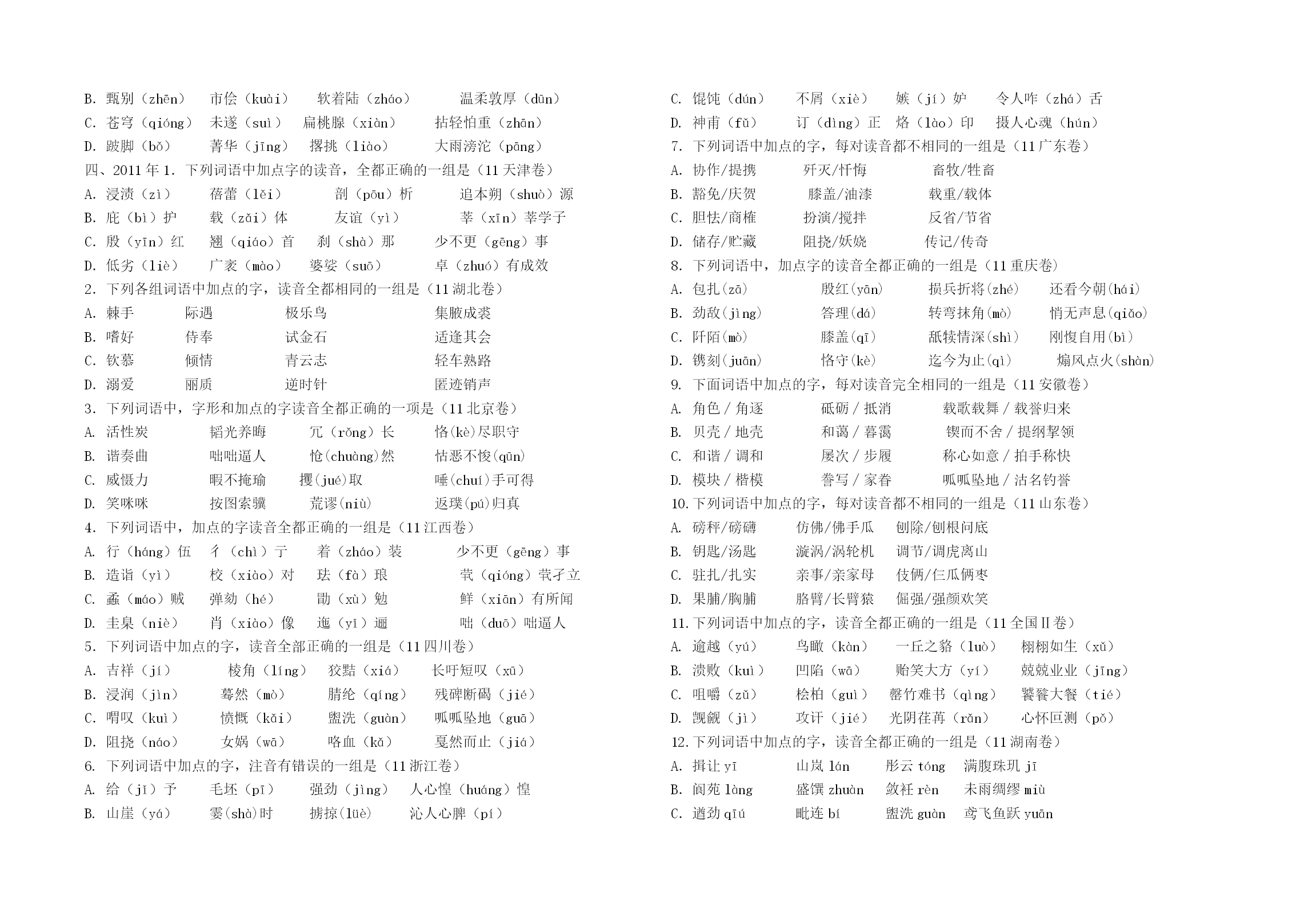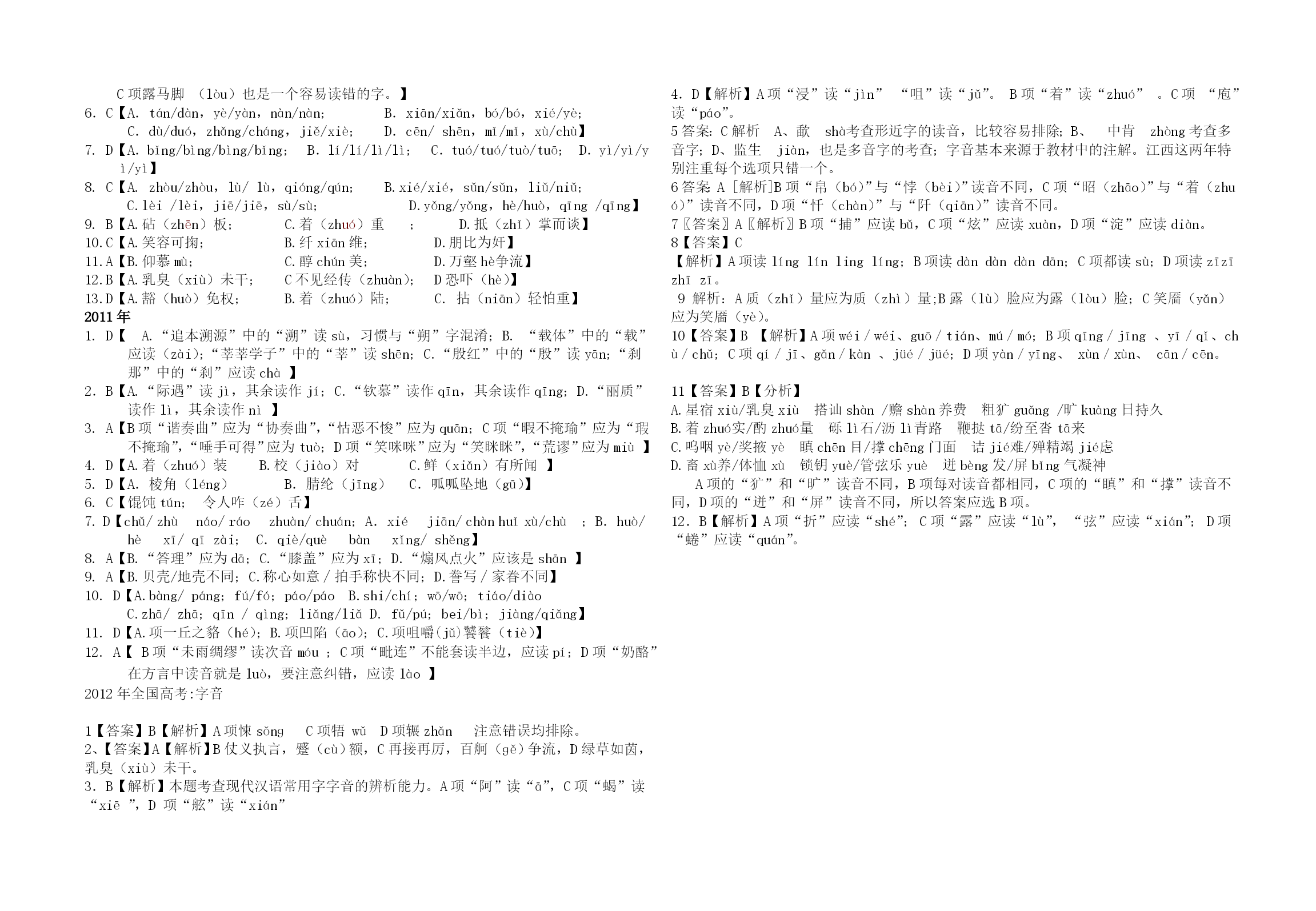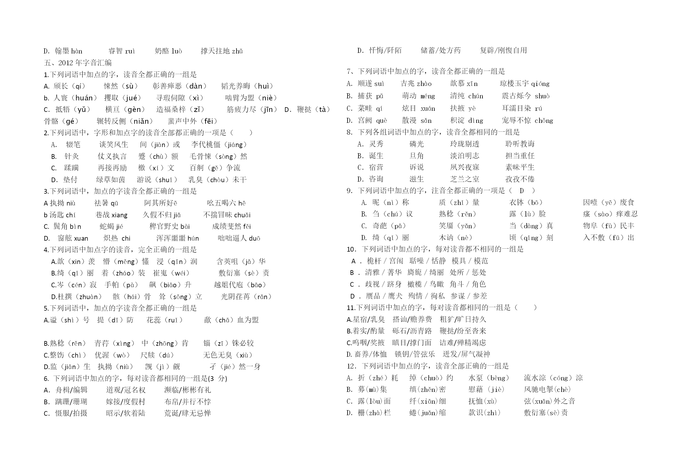 最新五年(2008——2012年)全国各地高考字音题汇编一2008年1、(全国卷I)下列词语中加点的字,读音全都正确的一组是A.刍议(chú)条分缕析(lǚ)圈养(quān)愀然不乐(qiǎo)B.倏忽(shū)越俎代庖(páo)牛虻(máng)自惭形秽(huì)C.靛蓝(dián)毁家纾难(shū)干涸(hé)白头偕老(xié)D.手帕(pà)相互龃龉(yǔ)麾下(huī)探本溯源(shuò)2、(全国卷2)下列词语中加点的字,读音全都正确的一组是A.迸发(bèng)不屈不挠(ráo)怆然(chuàng)婀娜多姿(ē)B.跻身(jī)岿然不动(kuī)女娲(wō)谆谆教导(zhūn)C.恫吓(xià)病入膏肓(huāng)浣衣(huàn)神情尴尬(gà)D.粗糙(cāo)徘徊观望(huái)糟粕(pò)锲而不舍(qiè)3.(北京卷)下列词语中,字形和加点的字的读音全都正确的一项是A.传媒难以起齿自诩(yǔ)闭目塞(sè)听B.芯片钩玄题要豢(juàn)养车载(zài)斗量C.转轨众口铄金执拗(niù)半嗔(chēn)半喜D.幅射赋于重任补给(jǐ)便(biàn)宜行事4.(天津卷)下列词语中加点的字读音全都正确的一组是A.闷(mēn)热镌(juān)刻通缉(jí)咸与(yù)维新宁缺毋(wú)滥B.生肖(xiāo)克(kē)扣梵(fàn)文混(hún)水摸鱼方枘(ruì)圆凿C.嘈(cāo)杂绷(běng)脸订(dìng)正歃(shà)血为盟徇(xún)私舞弊D.卓(zhuó)越坍圮(pǐ)拮据(jū)自作(zuò)自受桀(jié)骜不驯5.(重庆卷)下列各组词语中加点字的读音,有错误的一组是(D)A.对峙zhì犒劳kào追本溯源sù蓦然回首mòB.侥幸jiào浇水jiāo不屈不挠náo骁勇善战xiāoC.监察chá趁机chèn披荆斩棘jīng脸色刷白shuàD.刹那chà切磋qiè正当防卫dāng姗姗来迟shān6.(江苏卷)下列词语中加点的字,每对读音都不相同的一组是(3分)A.识别/博闻强识模仿/装模作样剥削/生吞活剥B.朝圣/朝令夕改提防/提心吊胆绿茵/绿林好汉C.箴言/缄默无言蠕动/耳濡目染粗犷/旷日持久D.湍急/惴惴不安讳言/经天纬地勘察/堪称一绝7、(广东卷)下列词语中加点的字,每对的读音都不相同的一项是A、滋润/蕴含赡养/瞻仰调试/调和B、对峙/嗜好竣工/英俊强迫/倔强C、造诣/逃逸堤岸/提拔抹黑/抹布D、湖畔/装扮怄气/枢纽阻塞/边塞8.(江西卷)下列词语中加点的字,读音全都正确的一组是A.付梓(zī)炮(pào)烙栉(zhì)沐锱(zì)铢必较B.颔(hàn)首亘(gèn)古不恤(xù)否(fǒu)极泰来C.歆(xīn)羡下乘(chéng)隽(juàn)永咸与(yù)维新D.执拗(niù)邂(xiè)逅忐(tǎn)忑便(biàn)宜行事9.(湖北卷)下列各组词语中加点的字,注音全都正确的一组是A.卓著(zhuō)质量(zhì)褒义词(bāo)因噎废食(yē)B.比较(jiào)恫吓(hè)着重号(zhuó)熠熠生辉(yì)C.处理(chù)恪守(kè)嘹望哨(liǎo)刚愎自用(bì)D.供应(gōng参与(yú)骨子里(gǔ)装聋作哑(lóng)10.(安徽卷)下列各组词语中,斜线“/”前后加点字的读音完全相同的一组是A.清澈/掣肘殷红/湮没瞠目/螳臂当车B.箴言/斟酌蛊惑/商贾船舷/扣人心弦C.联袂/抉择整饬/炽烈辍学/风姿绰约D.徘徊/脚踝戏谑/琐屑惬意/锲而不舍11.(浙江卷)下列词语中加点字的读音,完全相同的一组是A.删除膻味籼米潸然泪下B.信笺歼灭缄默间不容发C.飙升鱼鳔剽悍彪炳青史D.血缘戏谑噱头空穴来风12.(湖南卷)下列词语中加点的字,读音全都正确的一组是A.颔联hàn思忖cǔn悄声qiāo物阜民安fùB摒弃bìng咋舌zé泠然lěng倾箱倒箧qièC沉浸jìn跻身jī撰写zhuàn大笔如椽yuánD宽宥yòu车辆liàng仓廪lǐn凭栏骋目Chěng13.(四川卷)下列词语中加点的字,每对读音都相同的一组是A.中肯/中意穿着/歪打正着得心应手/应接不暇B.创伤/重创桂冠/弹冠相庆好大喜功/乐善好施C.供稿/供应涤纶/羽扇纶巾厚古薄今/日薄西山D.解数/解读寒舍/退避三舍曲径通幽/曲尽其妙14、(山东卷)下列词语中加点的字,读音全都正确的一组是A、仲(zhòng)裁阿(ē)谀入场券(quàn)捕(pǔ)风捉影B、袅娜(nuó)勒(lēi)紧嚼(jué)舌头百孔千疮(chuāng)C、精辟(pì)躯壳(qiào)横剖(pōu)面一语中的(dì)D、柏(bǎi)树
