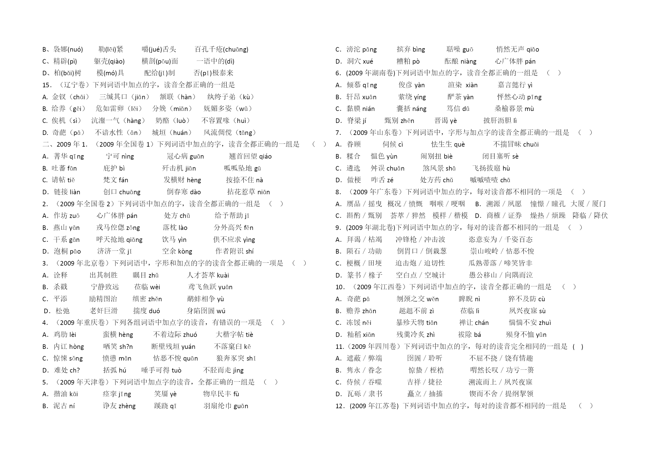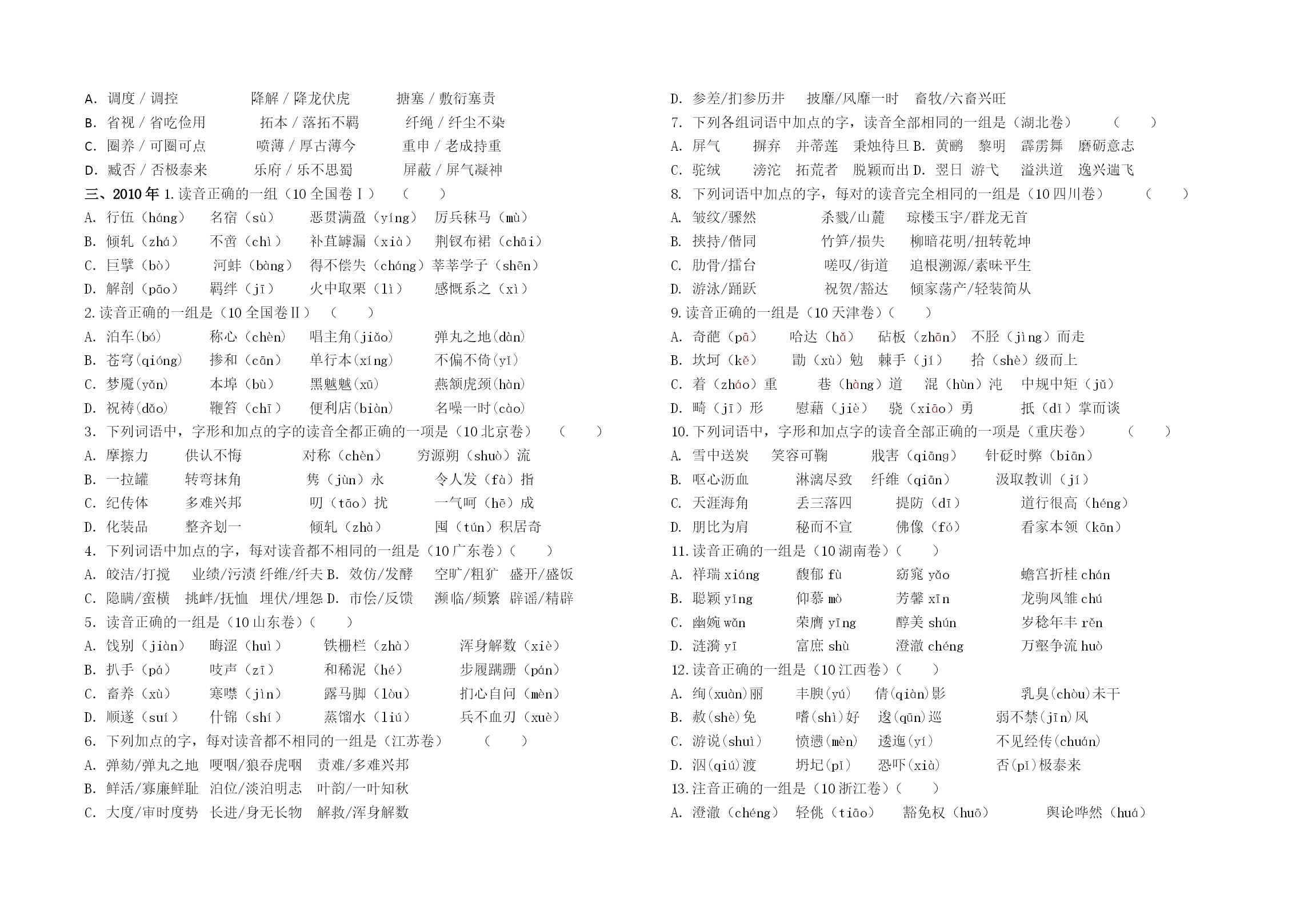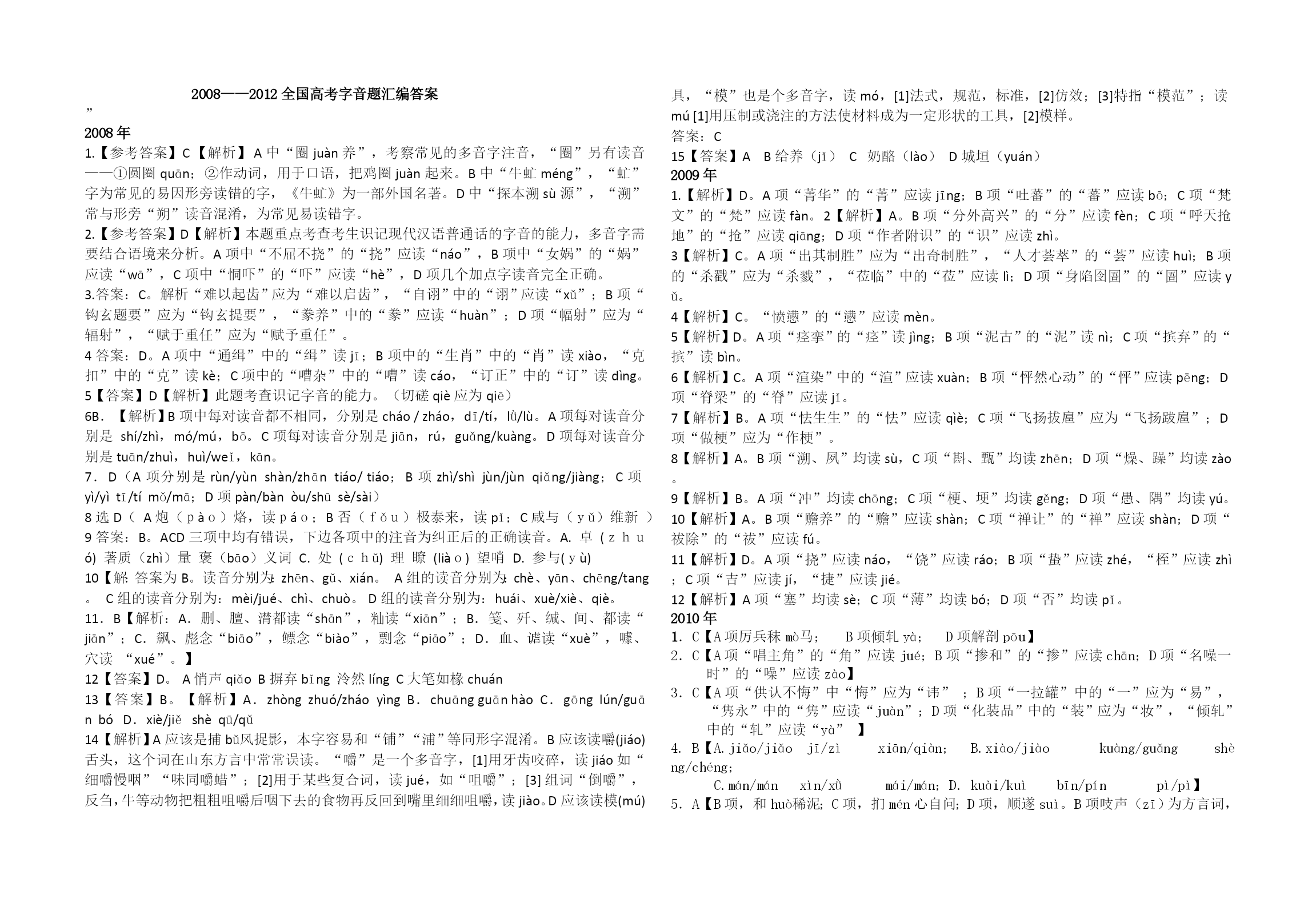 最新五年(2008——2012年)全国各地高考字音题汇编一2008年1、(全国卷I)下列词语中加点的字,读音全都正确的一组是A.刍议(chú)条分缕析(lǚ)圈养(quān)愀然不乐(qiǎo)B.倏忽(shū)越俎代庖(páo)牛虻(máng)自惭形秽(huì)C.靛蓝(dián)毁家纾难(shū)干涸(hé)白头偕老(xié)D.手帕(pà)相互龃龉(yǔ)麾下(huī)探本溯源(shuò)2、(全国卷2)下列词语中加点的字,读音全都正确的一组是A.迸发(bèng)不屈不挠(ráo)怆然(chuàng)婀娜多姿(ē)B.跻身(jī)岿然不动(kuī)女娲(wō)谆谆教导(zhūn)C.恫吓(xià)病入膏肓(huāng)浣衣(huàn)神情尴尬(gà)D.粗糙(cāo)徘徊观望(huái)糟粕(pò)锲而不舍(qiè)3.(北京卷)下列词语中,字形和加点的字的读音全都正确的一项是A.传媒难以起齿自诩(yǔ)闭目塞(sè)听B.芯片钩玄题要豢(juàn)养车载(zài)斗量C.转轨众口铄金执拗(niù)半嗔(chēn)半喜D.幅射赋于重任补给(jǐ)便(biàn)宜行事4.(天津卷)下列词语中加点的字读音全都正确的一组是A.闷(mēn)热镌(juān)刻通缉(jí)咸与(yù)维新宁缺毋(wú)滥B.生肖(xiāo)克(kē)扣梵(fàn)文混(hún)水摸鱼方枘(ruì)圆凿C.嘈(cāo)杂绷(běng)脸订(dìng)正歃(shà)血为盟徇(xún)私舞弊D.卓(zhuó)越坍圮(pǐ)拮据(jū)自作(zuò)自受桀(jié)骜不驯5.(重庆卷)下列各组词语中加点字的读音,有错误的一组是(D)A.对峙zhì犒劳kào追本溯源sù蓦然回首mòB.侥幸jiào浇水jiāo不屈不挠náo骁勇善战xiāoC.监察chá趁机chèn披荆斩棘jīng脸色刷白shuàD.刹那chà切磋qiè正当防卫dāng姗姗来迟shān6.(江苏卷)下列词语中加点的字,每对读音都不相同的一组是(3分)A.识别/博闻强识模仿/装模作样剥削/生吞活剥B.朝圣/朝令夕改提防/提心吊胆绿茵/绿林好汉C.箴言/缄默无言蠕动/耳濡目染粗犷/旷日持久D.湍急/惴惴不安讳言/经天纬地勘察/堪称一绝7、(广东卷)下列词语中加点的字,每对的读音都不相同的一项是A、滋润/蕴含赡养/瞻仰调试/调和B、对峙/嗜好竣工/英俊强迫/倔强C、造诣/逃逸堤岸/提拔抹黑/抹布D、湖畔/装扮怄气/枢纽阻塞/边塞8.(江西卷)下列词语中加点的字,读音全都正确的一组是A.付梓(zī)炮(pào)烙栉(zhì)沐锱(zì)铢必较B.颔(hàn)首亘(gèn)古不恤(xù)否(fǒu)极泰来C.歆(xīn)羡下乘(chéng)隽(juàn)永咸与(yù)维新D.执拗(niù)邂(xiè)逅忐(tǎn)忑便(biàn)宜行事9.(湖北卷)下列各组词语中加点的字,注音全都正确的一组是A.卓著(zhuō)质量(zhì)褒义词(bāo)因噎废食(yē)B.比较(jiào)恫吓(hè)着重号(zhuó)熠熠生辉(yì)C.处理(chù)恪守(kè)嘹望哨(liǎo)刚愎自用(bì)D.供应(gōng参与(yú)骨子里(gǔ)装聋作哑(lóng)10.(安徽卷)下列各组词语中,斜线“/”前后加点字的读音完全相同的一组是A.清澈/掣肘殷红/湮没瞠目/螳臂当车B.箴言/斟酌蛊惑/商贾船舷/扣人心弦C.联袂/抉择整饬/炽烈辍学/风姿绰约D.徘徊/脚踝戏谑/琐屑惬意/锲而不舍11.(浙江卷)下列词语中加点字的读音,完全相同的一组是A.删除膻味籼米潸然泪下B.信笺歼灭缄默间不容发C.飙升鱼鳔剽悍彪炳青史D.血缘戏谑噱头空穴来风12.(湖南卷)下列词语中加点的字,读音全都正确的一组是A.颔联hàn思忖cǔn悄声qiāo物阜民安fùB摒弃bìng咋舌zé泠然lěng倾箱倒箧qièC沉浸jìn跻身jī撰写zhuàn大笔如椽yuánD宽宥yòu车辆liàng仓廪lǐn凭栏骋目Chěng13.(四川卷)下列词语中加点的字,每对读音都相同的一组是A.中肯/中意穿着/歪打正着得心应手/应接不暇B.创伤/重创桂冠/弹冠相庆好大喜功/乐善好施C.供稿/供应涤纶/羽扇纶巾厚古薄今/日薄西山D.解数/解读寒舍/退避三舍曲径通幽/曲尽其妙14、(山东卷)下列词语中加点的字,读音全都正确的一组是A、仲(zhòng)裁阿(ē)谀入场券(quàn)捕(pǔ)风捉影B、袅娜(nuó)勒(lēi)紧嚼(jué)舌头百孔千疮(chuāng)C、精辟(pì)躯壳(qiào)横剖(pōu)面一语中的(dì)D、柏(bǎi)树