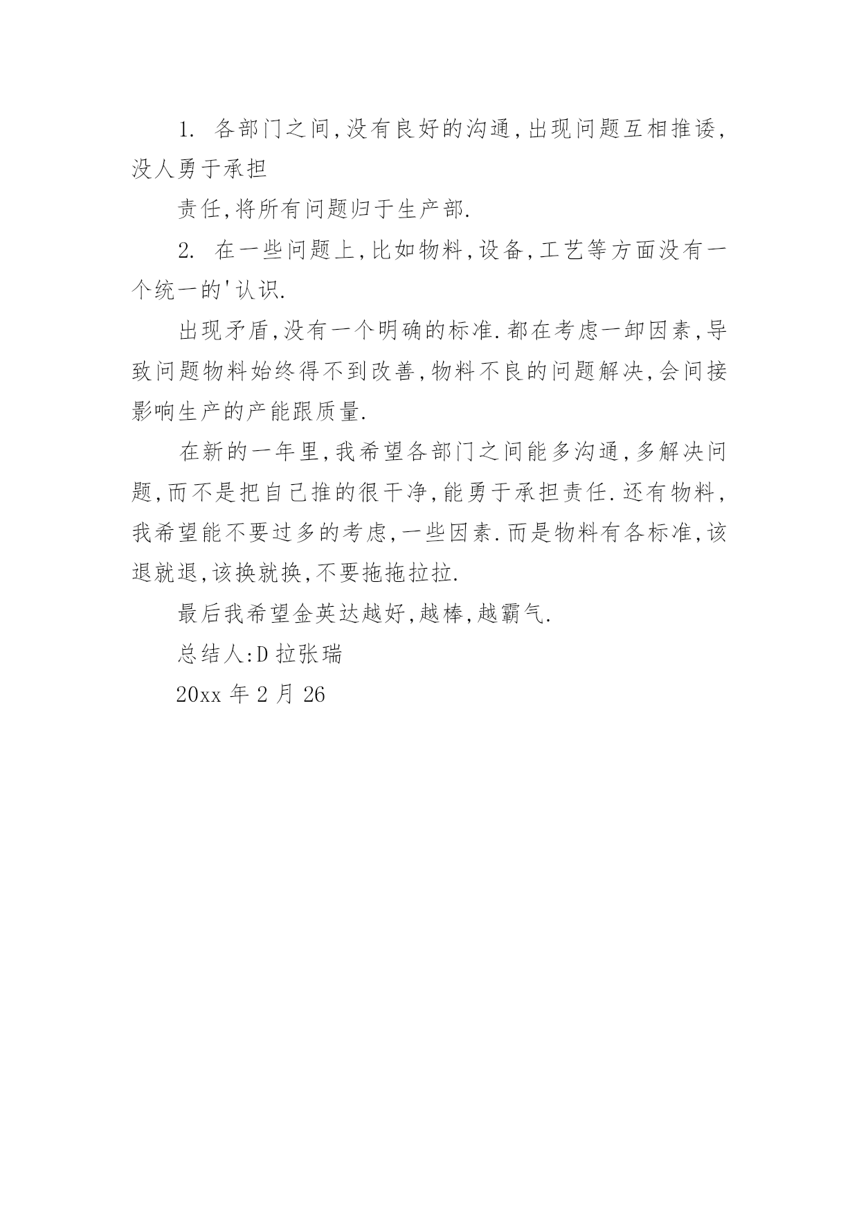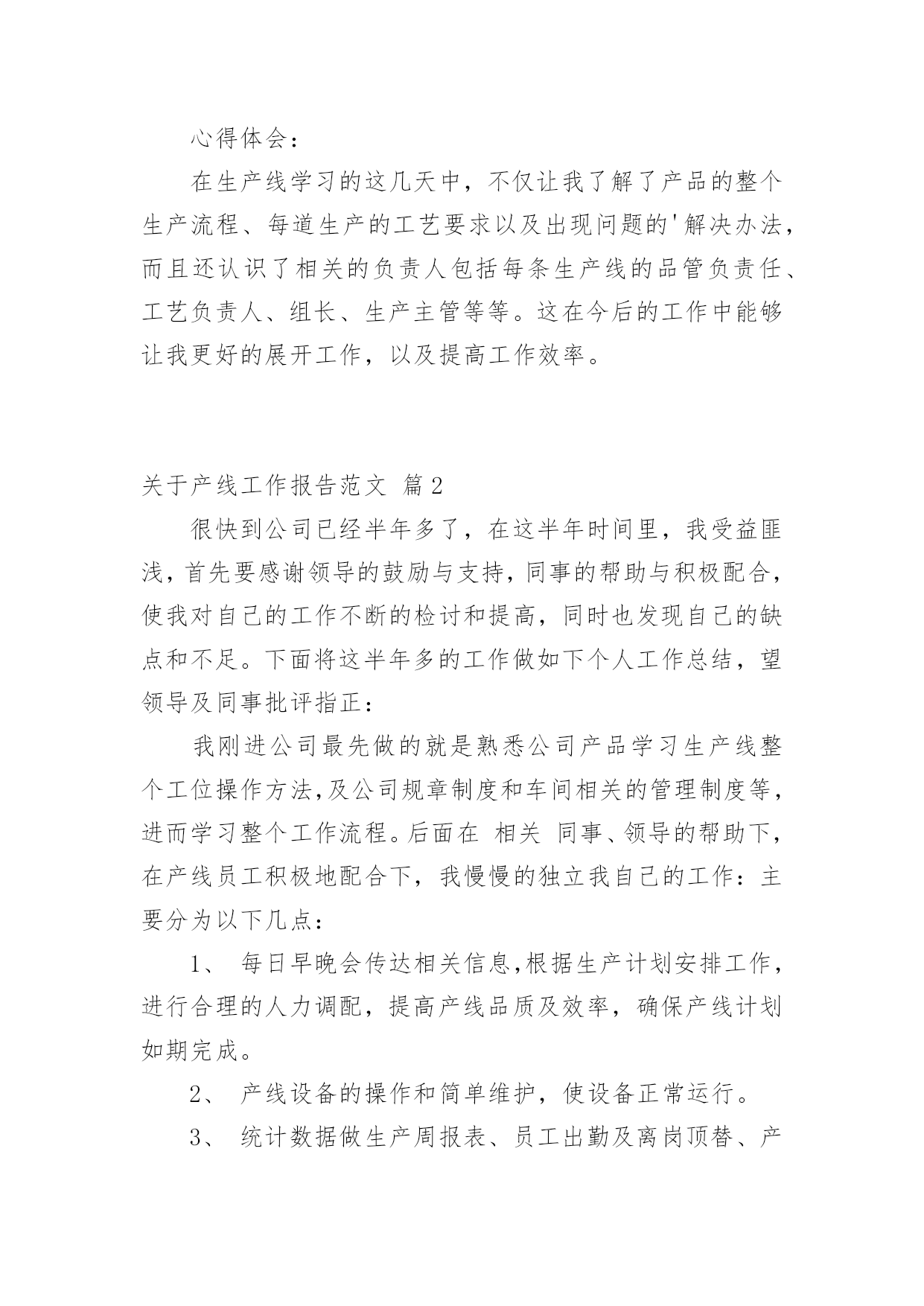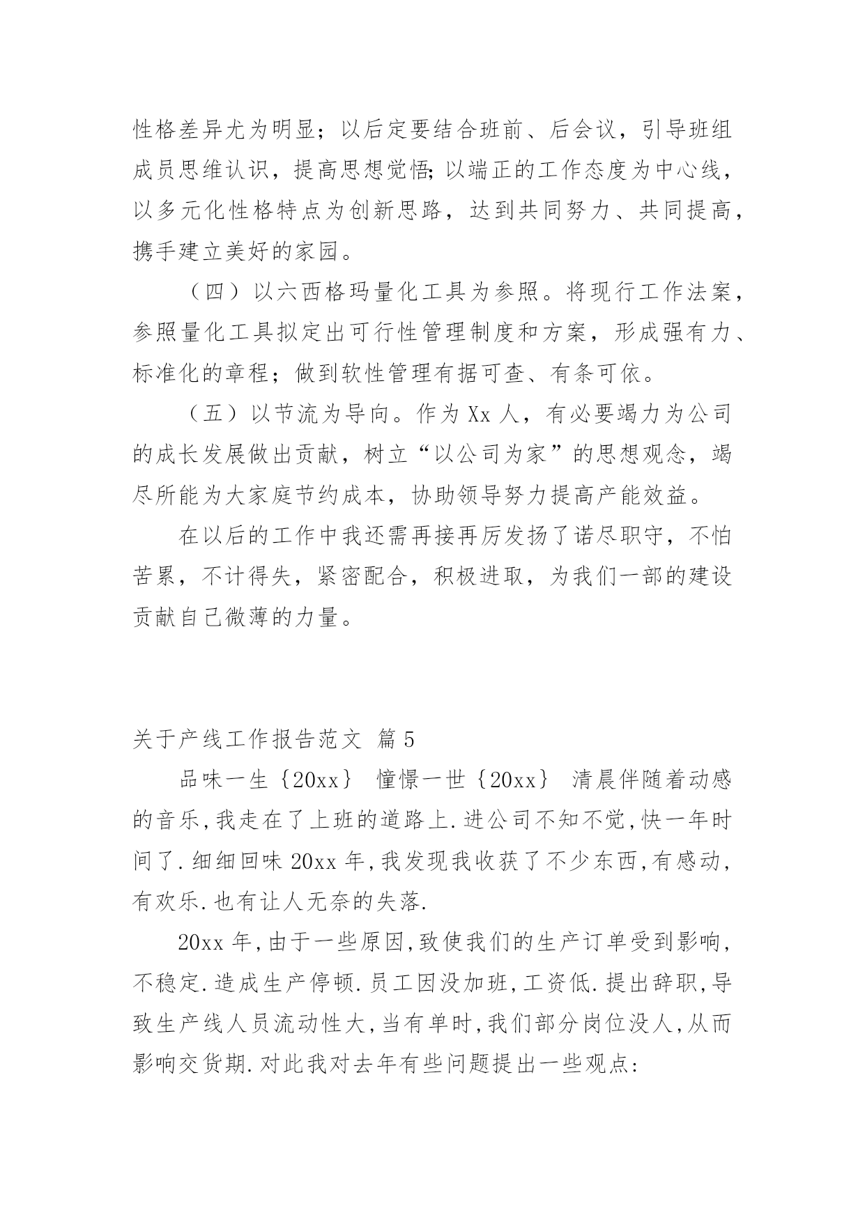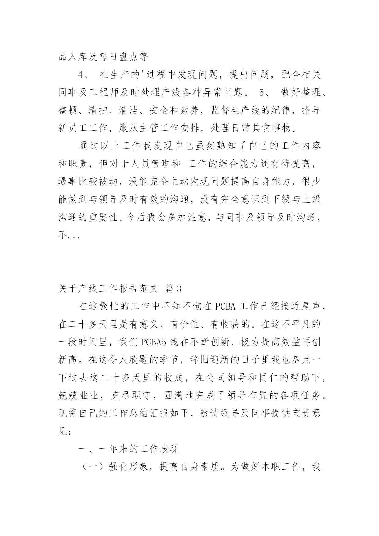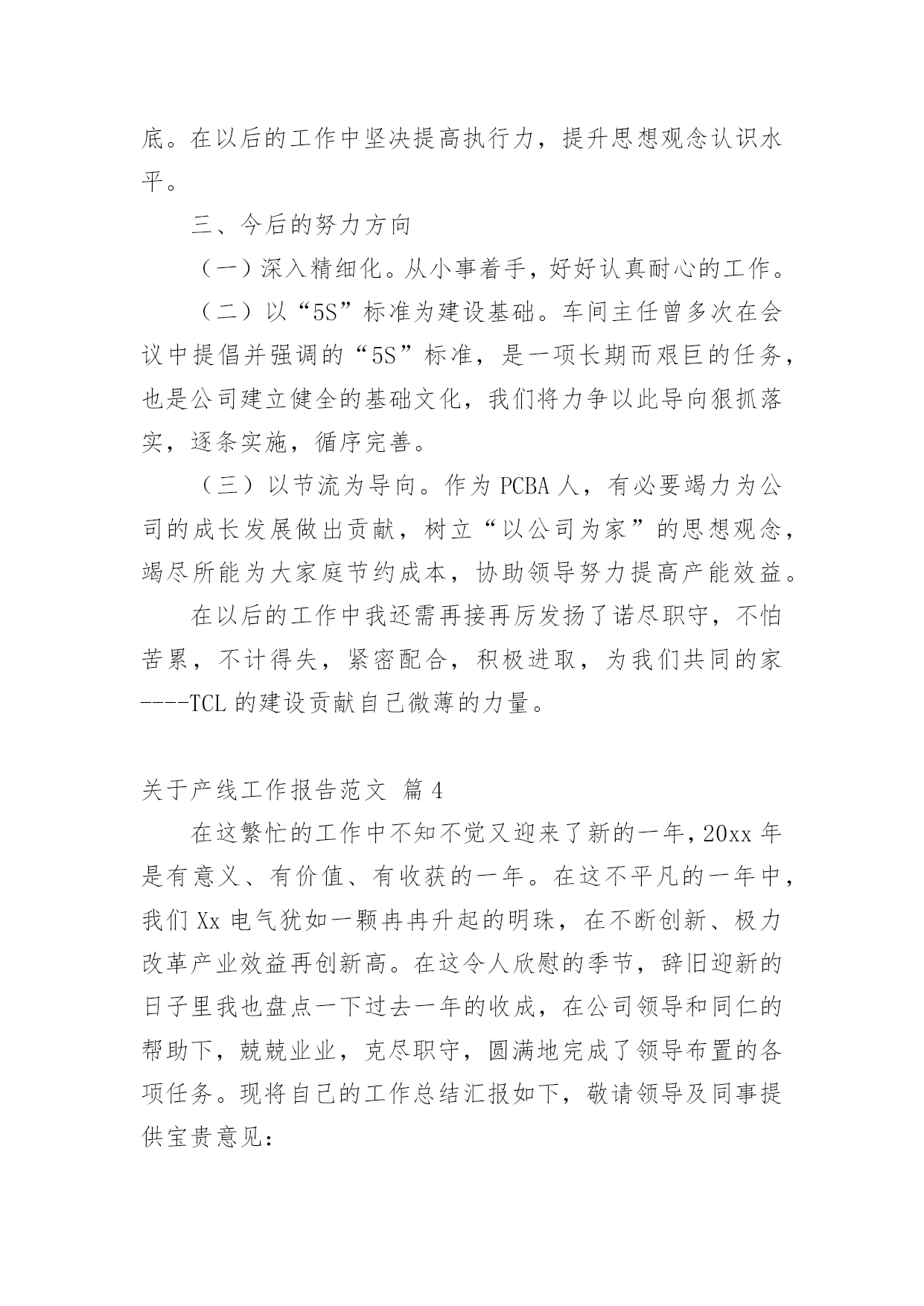 产线工作报告关于产线工作报告范文关于产线工作报告范文篇1制造课生产流程:备料→利用电芯分选机和内助测试仪匹配电芯→电池贴黑色衬垫贴→点焊机固定两粒电芯的正负极→点焊机固定电池正负极与电路板引出的导线→电烙铁焊接正负导线与USB电路板的连接→参数的测试→装入电池外壳→固定螺丝→再次测量参数→外观查看是否有刮痕→产品的完成。包装课生产流程:(铭牌线)拆电池→电池摆放→性能测试→贴铭牌→(喷码线)喷码/激光打码→贴茶色胶→贴防伪标→(包装线)拆透明带→检铁壳→拆铁盒→放包装袋→放三包凭证→放泡壳→放电池→合拢铁壳→贴条形码→装透明袋→贴长方标→对单/装框→(理货组)外包装喷码→电池装箱→电池打包→称重→出货常见的问题:包装课员工在工作中易出现的问题:(1)铁盒中电池型号放错。(2)贴铭牌贴移位,有异物渗入导致起泡。(3)打码时区域选错。在生产过程中品管负责人会不定时的进行产品抽检,以保证在包装过程中不出现错误。心得体会:在生产线学习的这几天中,不仅让我了解了产品的整个生产流程、每道生产的工艺要求以及出现问题的'解决办法,而且还认识了相关的负责人包括每条生产线的品管负责任、工艺负责人、组长、生产主管等等。这在今后的工作中能够让我更好的展开工作,以及提高工作效率。关于产线工作报告范文篇2很快到公司已经半年多了,在这半年时间里,我受益匪浅,首先要感谢领导的鼓励与支持,同事的帮助与积极配合,使我对自己的工作不断的检讨和提高,同时也发现自己的缺点和不足。下面将这半年多的工作做如下个人工作总结,望领导及同事批评指正:我刚进公司最先做的就是熟悉公司产品学习生产线整个工位操作方法,及公司规章制度和车间相关的管理制度等,进而学习整个工作流程。后面在相关同事、领导的帮助下,在产线员工积极地配合下,我慢慢的独立我自己的工作:主要分为以下几点:1、每日早晚会传达相关信息,根据生产计划安排工作,进行合理的人力调配,提高产线品质及效率,确保产线计划如期完成。2、产线设备的操作和简单维护,使设备正常运行。3、统计数据做生产周报表、员工出勤及离岗顶替、产品入库及每日盘点等4、在生产的'过程中发现问题,提出问题,配合相关同事及工程师及时处理产线各种异常问题。5、做好整理、整顿、清扫、清洁、安全和素养,监督生产线的纪律,指导新员工工作,服从主管工作安排,处理日常其它事物。通过以上工作我发现自己虽然熟知了自己的工作内容和职责,但对于人员管理和工作的综合能力还有待提高,遇事比较被动,没能完全主动发现问题提高自身能力,很少能做到与领导及时有效的沟通,没有完全意识到下级与上级沟通的重要性。今后我会多加注意,与同事及领导及时沟通,不...关于产线工作报告范文篇3在这繁忙的工作中不知不觉在PCBA工作已经接近尾声,在二十多天里是有意义、有价值、有收获的。在这不平凡的一段时间里,我们PCBA5线在不断创新、极力提高效益再创新高。在这令人欣慰的季节,辞旧迎新的日子里我也盘点一下过去这二十多天里的收成,在公司领导和同仁的帮助下,兢兢业业,克尽职守,圆满地完成了领导布置的各项任务。现将自己的工作总结汇报如下,敬请领导及同事提供宝贵意见:一、一年来的工作表现(一)强化形象,提高自身素质。为做好本职工作,我坚持严格要求,注重以身作则,以诚待人,一是爱岗敬业讲奉献。我的工作主要是插件,因此,我正确认识自身的工作和价值,正确处理苦与乐,得与失、个人利益和集体利益的关系,坚持甘于奉献、诚实敬业,二是锤炼自身努力提高本职业务水平。经过这一段时间的学习和锻炼,我在工作上取得一定的进步,利用积极工作汲取经验的同时,细心学习他人长处,改掉自己不足,并虚心向领导、同事请教,在不断学习和探索中使自身更方面的能力得到提高。(二)严于律已,不断加强作风。这一段时间来我对自身严格要求,始终把耐得平淡、舍得付出、默默无闻作为自己的准则,始终把作风建设的重点放在严谨、细致、扎实、求实脚踏实地埋头苦干上。在工作中,以制度、纪律规范自己的一切言行,严格遵守公司各项规章制度,尊重领导,团结同志,谦虚谨慎,主动接受来自各方面的意见,不断改进工作方式方法。(三)强化职能,做好服务工作。工作中,我注重把握根本,努力提高服务水平。在这一段时间里,不管遇到上的'困难,我都积极配合做好工作,同事们的心都能往一处想,劲都往一处使,不计得失,只希望把工作圆满完成。二、工作中的不足(一)情感观念过重,工作的时候参杂个人想法。(二)立足现有条件创新观念有待提高。(三)传达和落实公司精神任务,态度不够坚决。总是考虑到个人利益和自己的小算盘,对公司的任务未能贯彻到底。在以后的工作中坚决提高执行力,提升思想观念认识水平。三、今后的努力方向(一)深入精细化。从小事着手,好好认真耐心的工作。(二)以“5S”标准为建设基础。车间主任曾多次在会议中提倡并