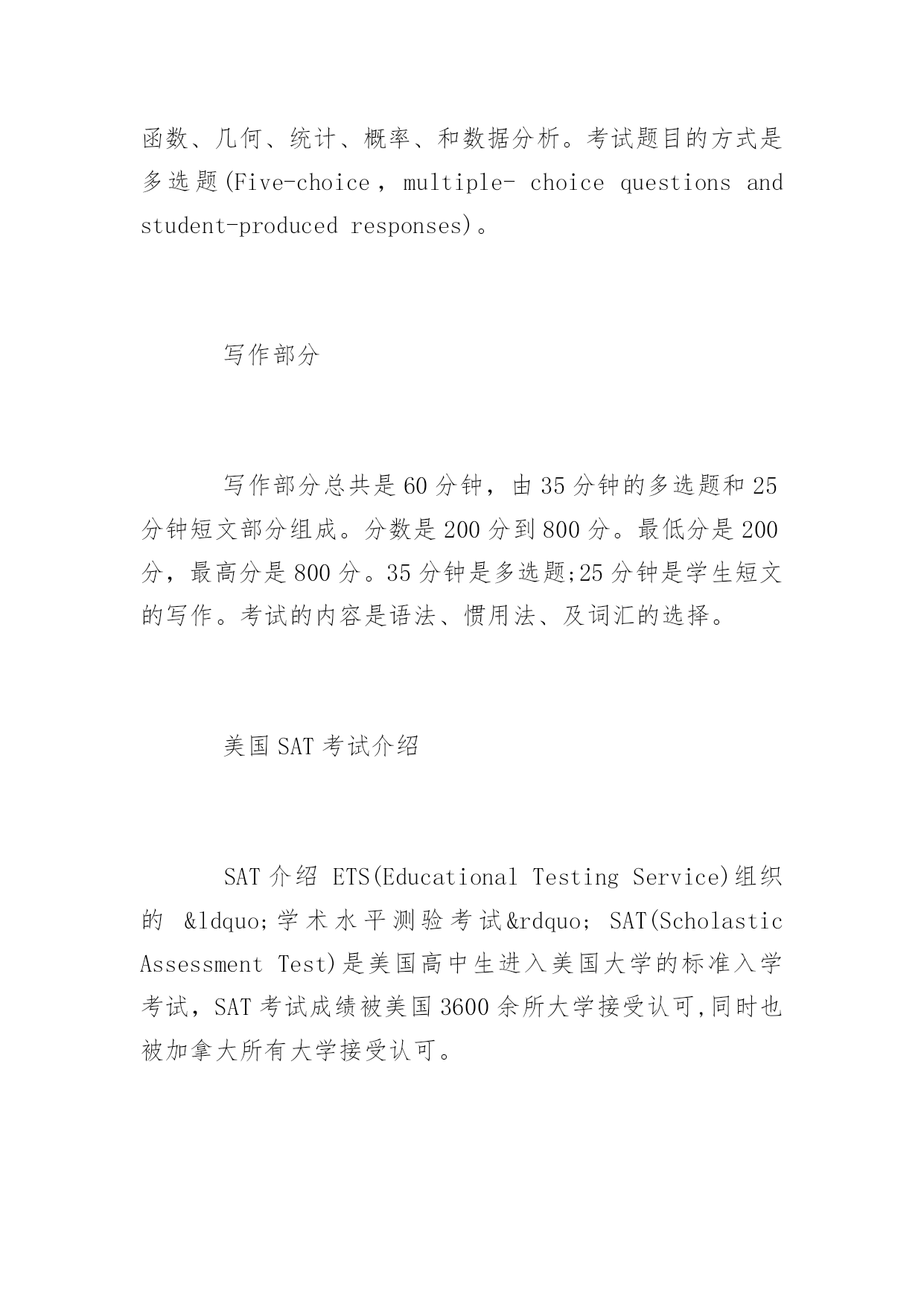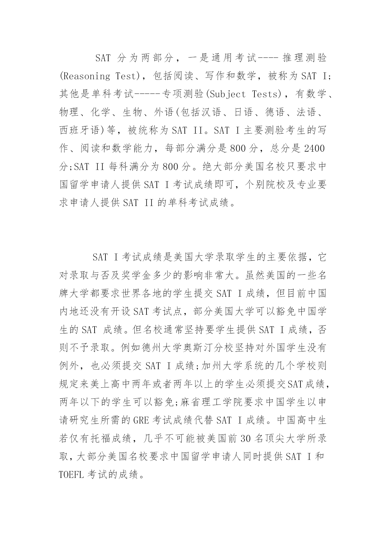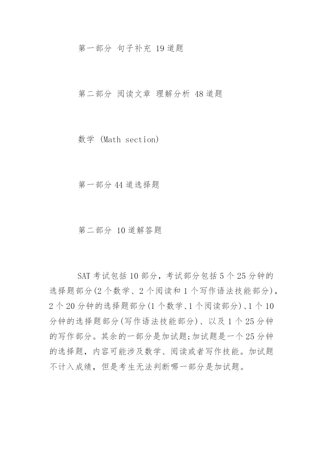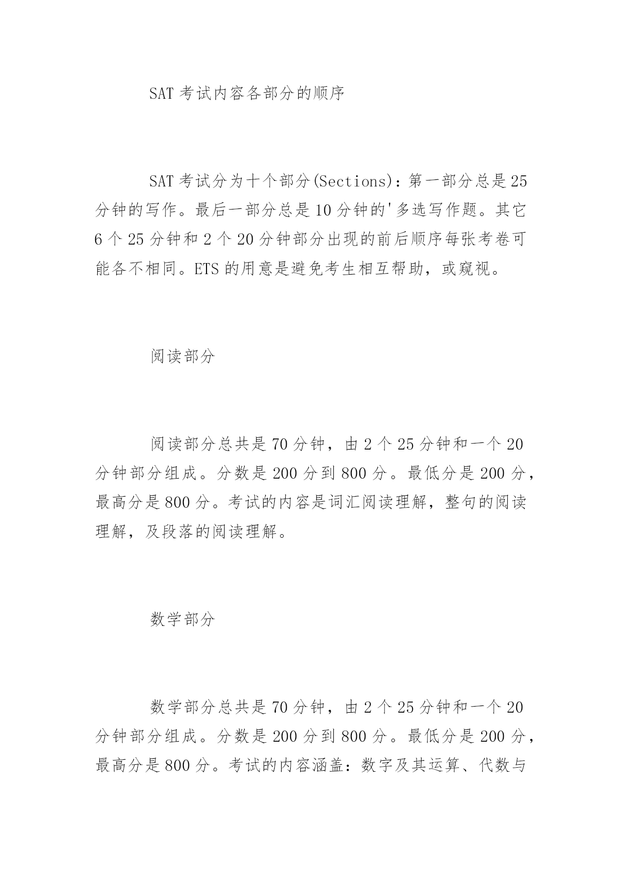 SAT考试内容介绍SAT考试内容介绍相信SAT考试内容是不少考生关心的问题,下面应届毕业生网小编就为大家介绍一下SAT考试内容,希望对大家有所帮助。一是通用考试----推理测验(ReasoningTest),包括阅读、写作和数学,被称为SAT或NEWSAT;第二个是单科考试-----专项测验(SubjectTests),有数学、物理、化学、生物、外语(包括汉语、日语、德语、法语、西班牙语)等,被统称为SAT2。SAT1主要测验考生的写作、阅读和数学能力,每部分满分是800分,总分是2400分;SAT2每科满分为800分。绝大部分美国名校只要求中国留学申请人提供SAT通用考试的成绩即可,个别院校及专业要求申请人提供SAT2的单科考试成绩。考试内容:SAT1考试时间三小时四十五分钟题型为选择题及写作,主要测验考生的阅读、数学及写作能力满分2400分SAT2考试时间一小时题型大部分为选择题,主要考察考生某一专业的知识。SAT2是单科考试,有数学、物理、化学、生物、外语(包括汉语、日语、德语、法语、西班牙语)等,根据各专业和学校的要求参加。下面主要介绍SAT通用考试:SAT(ReasoningTest)的考察重点写作(writing)三个部分第一部分writingtest议论文写作第二部分改错,句子错误和语篇错误阅读(Criticalreading)第一部分句子补充19道题第二部分阅读文章理解分析48道题数学(Mathsection)第一部分44道选择题第二部分10道解答题SAT考试包括10部分,考试部分包括5个25分钟的选择题部分(2个数学、2个阅读和1个写作语法技能部分),2个20分钟的选择题部分(1个数学、1个阅读部分)、1个10分钟的选择题部分(写作语法技能部分)、以及1个25分钟的写作部分。其余的一部分是加试题;加试题是一个25分钟的选择题,内容可能涉及数学、阅读或者写作技能。加试题不计入成绩,但是考生无法判断哪一部分是加试题。阅读部分包括:句子填空和阅读理解,一共67道题,阅读理解部分分长文章和短文章每个部分的句子填空题大致是按难度顺序出现的,先出现的题目比较简单;阅读理解部分不按难度排序。数学部分包括:选择题和10道主观填空题,共有54道题目每个部分的数学部分大致是按难度顺序出现的,先出现的题目比较简单;写作部分包括:语篇写作、句子找错、修改句子、修改语篇除了10道数学部分的主观题填空题,其余的部分都是选择题。SAT考试内容各部分的顺序SAT考试分为十个部分(Sections):第一部分总是25分钟的写作。最后一部分总是10分钟的'多选写作题。其它6个25分钟和2个20分钟部分出现的前后顺序每张考卷可能各不相同。ETS的用意是避免考生相互帮助,或窥视。阅读部分阅读部分总共是70分钟,由2个25分钟和一个20分钟部分组成。分数是200分到800分。最低分是200分,最高分是800分。考试的内容是词汇阅读理解,整句的阅读理解,及段落的阅读理解。数学部分数学部分总共是70分钟,由2个25分钟和一个20分钟部分组成。分数是200分到800分。最低分是200分,最高分是800分。考试的内容涵盖:数字及其运算、代数与函数、几何、统计、概率、和数据分析。考试题目的方式是多选题(Five-choice,multiple-choicequestionsandstudent-producedresponses)。写作部分写作部分总共是60分钟,由35分钟的多选题和25分钟短文部分组成。分数是200分到800分。最低分是200分,最高分是800分。35分钟是多选题;25分钟是学生短文的写作。考试的内容是语法、惯用法、及词汇的选择。美国SAT考试介绍SAT介绍ETS(EducationalTestingService)组织的“学术水平测验考试”SAT(ScholasticAssessmentTest)是美国高中生进入美国大学的标准入学考试,SAT考试成绩被美国3600余所大学接受认可,同时也被加拿大所有大学接受认可。SAT分为两部分,一是通用考试----推理测验(ReasoningTest),包括阅读、写作和数学,被称为SATI;其他是单科考试-----专项测验(SubjectTests),有数学、物理、化学、生物、外语(包括汉语、日语、德语、法语、西班牙语)等,被统称为SATII。SATI主要测验考生的写作、阅读和数学能力,每部分满分是800分,总分是2400分;SATII每科满分为800分。绝大部分美国名校只要求中国留学申请人提供SATI考试成绩即可,个别院校及专业要求申请人提供SATII的单科考试成绩。SATI考试成绩是美国大学
