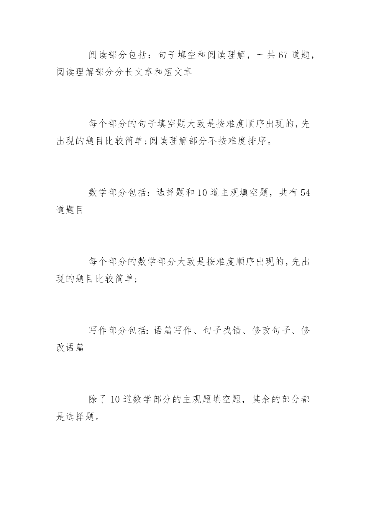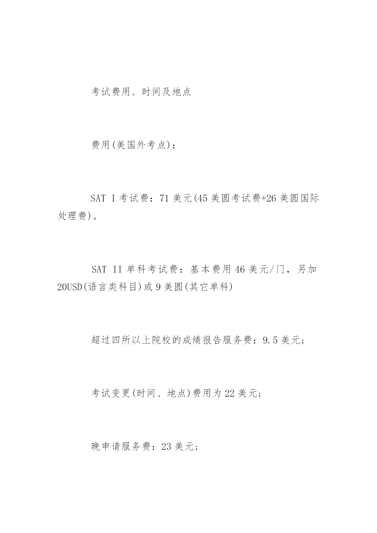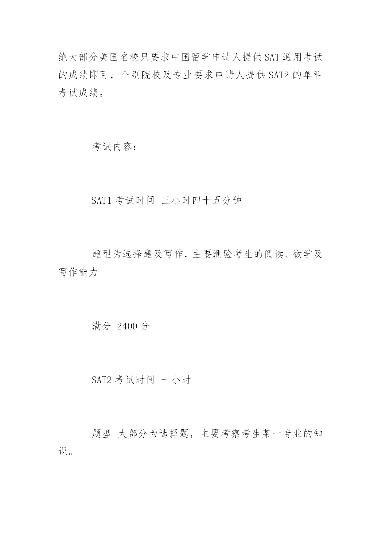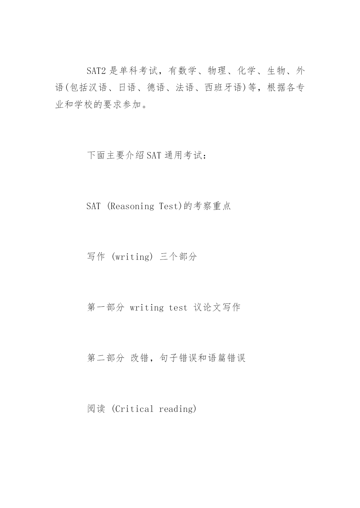 SAT考试内容介绍SAT考试内容介绍相信SAT考试内容是不少考生关心的问题,下面应届毕业生网小编就为大家介绍一下SAT考试内容,希望对大家有所帮助。一是通用考试----推理测验(ReasoningTest),包括阅读、写作和数学,被称为SAT或NEWSAT;第二个是单科考试-----专项测验(SubjectTests),有数学、物理、化学、生物、外语(包括汉语、日语、德语、法语、西班牙语)等,被统称为SAT2。SAT1主要测验考生的写作、阅读和数学能力,每部分满分是800分,总分是2400分;SAT2每科满分为800分。绝大部分美国名校只要求中国留学申请人提供SAT通用考试的成绩即可,个别院校及专业要求申请人提供SAT2的单科考试成绩。考试内容:SAT1考试时间三小时四十五分钟题型为选择题及写作,主要测验考生的阅读、数学及写作能力满分2400分SAT2考试时间一小时题型大部分为选择题,主要考察考生某一专业的知识。SAT2是单科考试,有数学、物理、化学、生物、外语(包括汉语、日语、德语、法语、西班牙语)等,根据各专业和学校的要求参加。下面主要介绍SAT通用考试:SAT(ReasoningTest)的考察重点写作(writing)三个部分第一部分writingtest议论文写作第二部分改错,句子错误和语篇错误阅读(Criticalreading)第一部分句子补充19道题第二部分阅读文章理解分析48道题数学(Mathsection)第一部分44道选择题第二部分10道解答题SAT考试包括10部分,考试部分包括5个25分钟的选择题部分(2个数学、2个阅读和1个写作语法技能部分),2个20分钟的选择题部分(1个数学、1个阅读部分)、1个10分钟的选择题部分(写作语法技能部分)、以及1个25分钟的写作部分。其余的一部分是加试题;加试题是一个25分钟的选择题,内容可能涉及数学、阅读或者写作技能。加试题不计入成绩,但是考生无法判断哪一部分是加试题。阅读部分包括:句子填空和阅读理解,一共67道题,阅读理解部分分长文章和短文章每个部分的句子填空题大致是按难度顺序出现的,先出现的题目比较简单;阅读理解部分不按难度排序。数学部分包括:选择题和10道主观填空题,共有54道题目每个部分的数学部分大致是按难度顺序出现的,先出现的题目比较简单;写作部分包括:语篇写作、句子找错、修改句子、修改语篇除了10道数学部分的主观题填空题,其余的部分都是选择题。SAT考试内容各部分的顺序SAT考试分为十个部分(Sections):第一部分总是25分钟的写作。最后一部分总是10分钟的'多选写作题。其它6个25分钟和2个20分钟部分出现的前后顺序每张考卷可能各不相同。ETS的用意是避免考生相互帮助,或窥视。阅读部分阅读部分总共是70分钟,由2个25分钟和一个20分钟部分组成。分数是200分到800分。最低分是200分,最高分是800分。考试的内容是词汇阅读理解,整句的阅读理解,及段落的阅读理解。数学部分数学部分总共是70分钟,由2个25分钟和一个20分钟部分组成。分数是200分到800分。最低分是200分,最高分是800分。考试的内容涵盖:数字及其运算、代数与函数、几何、统计、概率、和数据分析。考试题目的方式是多选题(Five-choice,multiple-choicequestionsandstudent-producedresponses)。写作部分写作部分总共是60分钟,由35分钟的多选题和25分钟短文部分组成。分数是200分到800分。最低分是200分,最高分是800分。35分钟是多选题;25分钟是学生短文的写作。考试的内容是语法、惯用法、及词汇的选择。美国SAT考试介绍SAT介绍ETS(EducationalTestingService)组织的“学术水平测验考试”SAT(ScholasticAssessmentTest)是美国高中生进入美国大学的标准入学考试,SAT考试成绩被美国3600余所大学接受认可,同时也被加拿大所有大学接受认可。SAT分为两部分,一是通用考试----推理测验(ReasoningTest),包括阅读、写作和数学,被称为SATI;其他是单科考试-----专项测验(SubjectTests),有数学、物理、化学、生物、外语(包括汉语、日语、德语、法语、西班牙语)等,被统称为SATII。SATI主要测验考生的写作、阅读和数学能力,每部分满分是800分,总分是2400分;SATII每科满分为800分。绝大部分美国名校只要求中国留学申请人提供SATI考试成绩即可,个别院校及专业要求申请人提供SATII的单科考试成绩。SATI考试成绩是美国大学