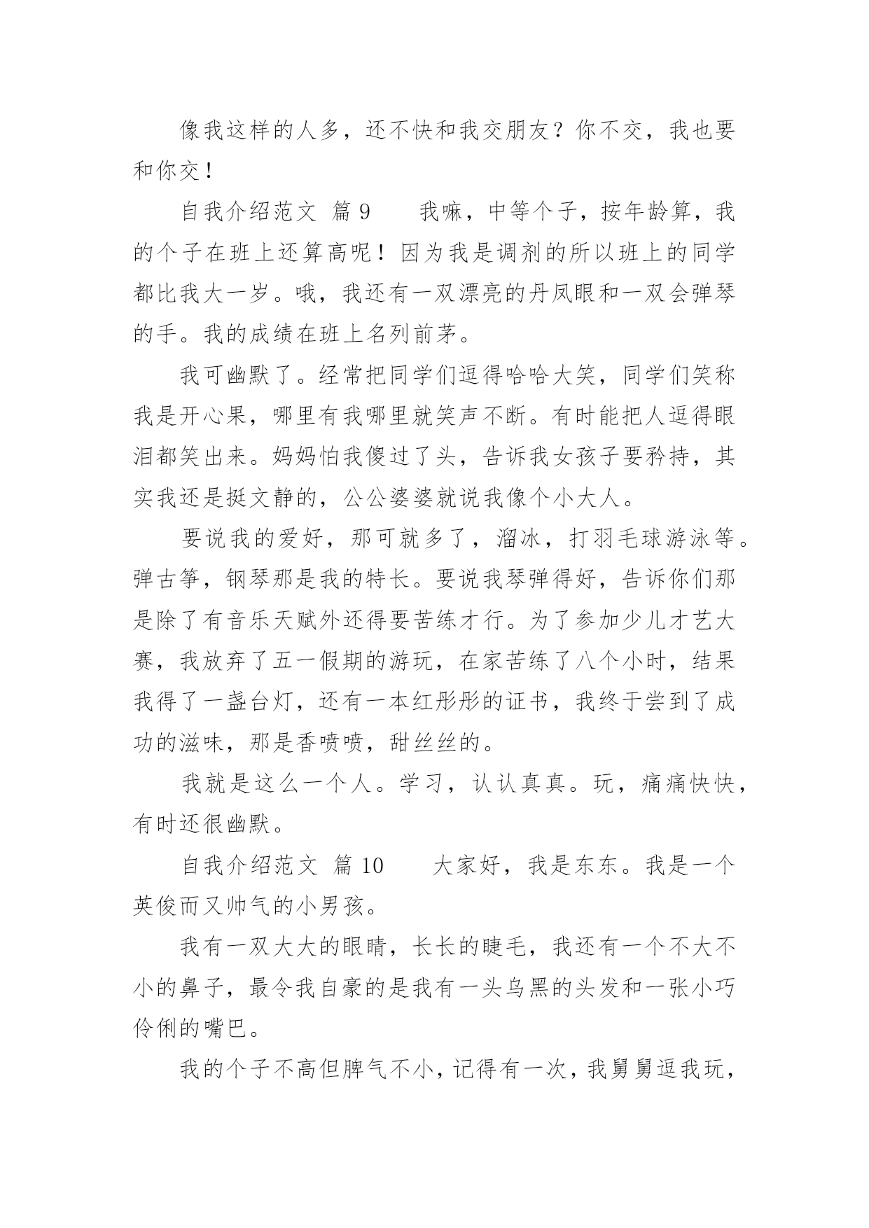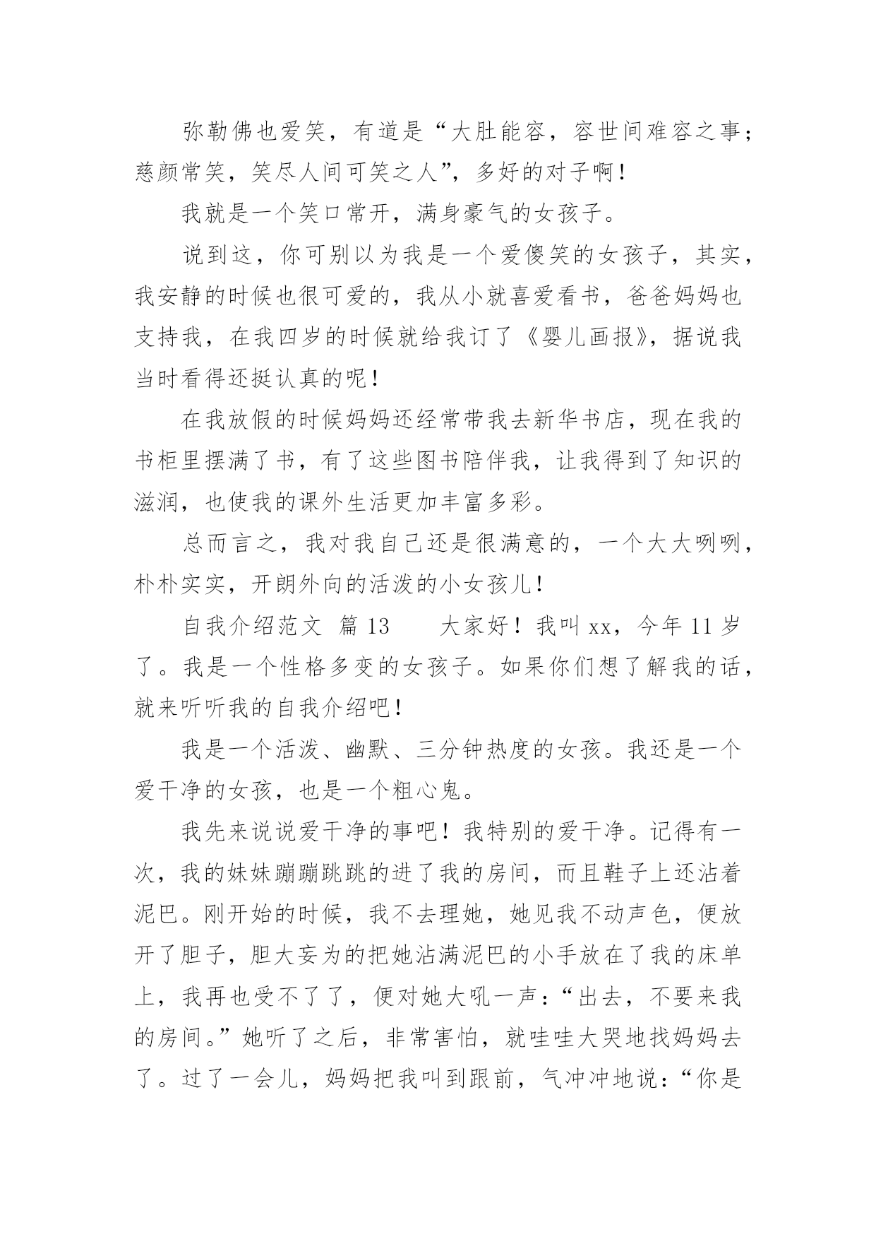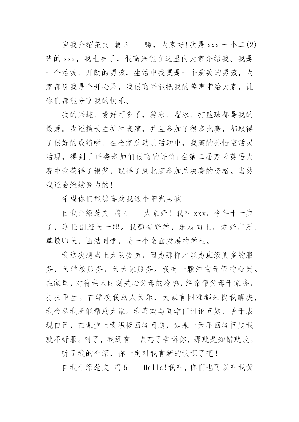 自我介绍自我介绍范文集锦14篇当去到一个新环境下,通常需要我们进行自我介绍,用自我介绍往往可以向他人介绍自己。相信大家又在为写自我介绍犯愁了吧!下面是小编收集整理的自我介绍范文,欢迎阅读与收藏。自我介绍范文篇1我,是一个机灵可爱的男孩儿。圆圆的脸蛋上,长着一双调皮的大眼睛,眼珠儿忽闪忽闪的,好像两颗晶莹透亮的黑宝石,只要我一眨眼,就能想出一个“鬼点子”,大家都叫我“鬼点子精灵”。我很幽默,哪里有我,哪里就有笑声。有一次,在上作文课时,老师问我们“流连忘返”是什么意思,我开口说:“吃了榴莲忘了返回去付钱。”同学们一听,哄堂大笑。虽然我让大家开心,但也扰乱了课堂纪律,在这一方面,我以后要多加注意。当然,我也有优点,在上语文课时,经常踊跃发言,老师还夸我好词佳句积累的多,我知道,这与平时多读书、多写日记有关。有句格言说得好:“读一本好书就是和许多高尚的人谈话。”今后我一定要多和好书交朋友,争取上课回答出更精彩的问题。怎么样,听我介绍了这些内容,是不是你们也想和我交朋友,告诉你们吧,我叫***,欢迎你们到**路小学三年级四班来找我。自我介绍范文篇2本人自小就接受长辈和老师的良好思想道德教育,严格要求自己,为人诚实,勤奋好学,不断求上进,在大学的三年里,经过学院的半军事化管理,使自己变得更加坚强。作为一名计算机专业的大学生,本人热爱本专业并为其投入了巨大的热情和精力。本人思想积极上进,性格开朗,生活作风严谨,责任心强,办事沉稳、执着,能吃苦耐劳,适应性强,具有良好的心理素质。本人积极要求上进,热爱祖国,拥护中国共产党,积极向党的组织靠拢,向我们伟大的中国共产党看齐。本人还坚持党的四项基本原则和改革开放政策、关心国家和社会的大事,具有很强的爱国主义精神。认真贯彻学校严谨,求实,团结,进去的校训,学习雷锋助人为乐的精神,积极加入一些义务活动并坚持到社会上做好事。学习上,本人学习目的明确,基础知识扎实,并努力做到各方面的均衡发展,在学习过程中,我注重理论与实际相结合,虽然实践不够,但是我定会在以后的工作和学习中努力增加。生活上,本人严格要求自己,生活朴素,生活作风严谨,积极参加各种有益的社会活动,认真投入到学校的各项组织活动中,踊跃参加班集体活动。热爱学习,办事稳重谨慎,能吃苦耐劳,能独立完成工作、实际动手能力另外还具有团体协作精神,具有优秀的职业道德和责任感,能迅速的适应各种环境,并融合其中。接受能力好,自学能力强,人际关系优良这是我最大的优点,它使我可以迅速的学到自己所需要的知识,并加以应用。喜欢挑战,自信,有较强的团队意识。自我介绍范文篇3嗨,大家好!我是xxx一小二(2)班的xxx,我七岁了,很高兴能在这里向大家介绍我。我是一个活泼、开朗的男孩,生活中我更是一个爱笑的男孩,大家都说我是个开心果,我很高兴能把我的笑声带给大家,让你们都能分享我的快乐。我的兴趣、爱好可多了,游泳、溜冰、打篮球都是我的最爱。我还擅长主持和表演,并且参加了很多比赛,都取得了很好的成绩哟。在全家总动员活动中,我演的孙悟空活灵活现,得到了评委老师们很高的评价;在第二届楚天英语大赛中我获得了银奖,取得了到北京参加总决赛的资格。当然我还会继续努力的!希望你们能够喜欢我这个阳光男孩自我介绍范文篇4大家好!我叫xxx,今年十一岁了,现任副班长一职。我勤奋好学,乐观向上,爱好广泛、尊敬师长,团结同学,是一个全面发展的学生。我这次想当上大队委员,因为那样才能为班级更多的服务,为学校服务,为大家服务。我有一颗洁白无假的心灵。在家里,对待亲人时刻关心父母的冷热,经常帮父母干家务,打扫卫生。在学校我助人为乐,大家有困难都来找我解决,我会尽我所能帮助大家。我喜欢与同学们讨论问题,善于表现自己,在课堂上我积极回答问题,如果一天不回答问题我就不舒服。对了,我还有一点忘了告诉你,那就是知错就改。听了我的介绍,你一定对我有新的认识了吧!自我介绍范文篇5Hello!我叫,你们也可以叫我黄蕊,我今年13岁,刚刚要步入初中,下面请听听我的自我介绍吧!please我是一个短发的女孩,有一双大眼睛,一双是妈妈赐予我的,一双是爸爸赐予我的,因为我一个是单眼皮,一个是双眼皮,双眼皮是妈妈的,单眼皮是爸爸的,哈哈有趣吧!我还有一个向上翘的鼻子,一个樱桃小嘴红红的,这就是我的长相,下面请听听我获得的荣誉吧。我是勃利县镇安小学毕业的,虽然不是一所非常著名的小学但我很爱那里,毕竟我在那获得了好多的荣誉。我成多次获得过文明星,纪律星,其实我不是一个守纪律的学生,也不是一个讲文明的学生,我也往地上扔过果皮等一些垃圾,上课时也捉过一些小动作,老师不应该给我的,但我现在已是一个中学生了,就要改掉以前的不足点,成为一名优秀的好学生。我也常常为自己性格常跟别人吵架,大家都说我的性格太独特了,没有人能和我一样,甚至好会有人