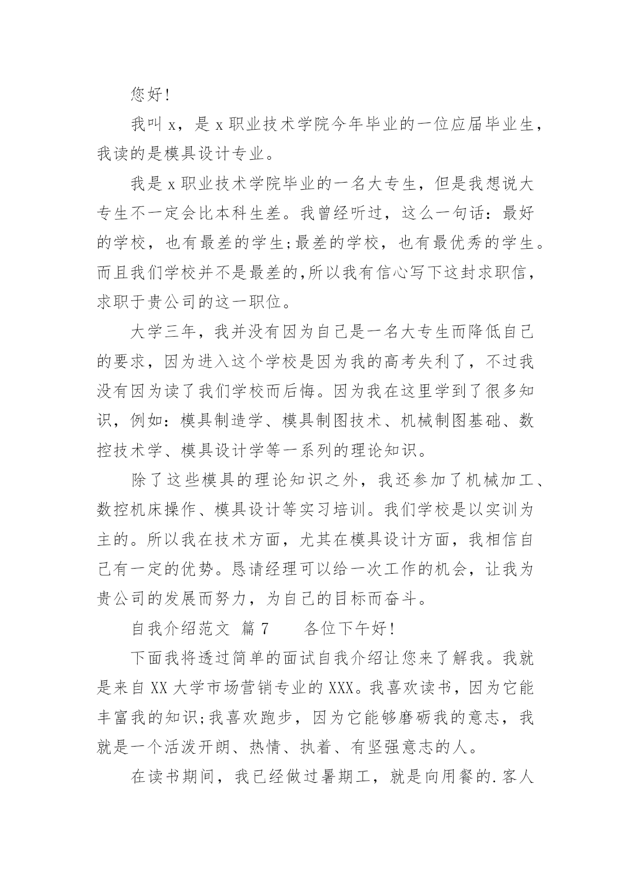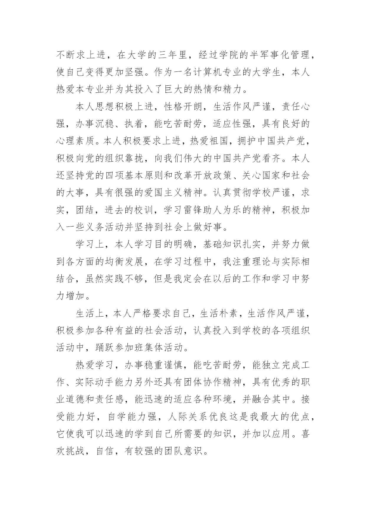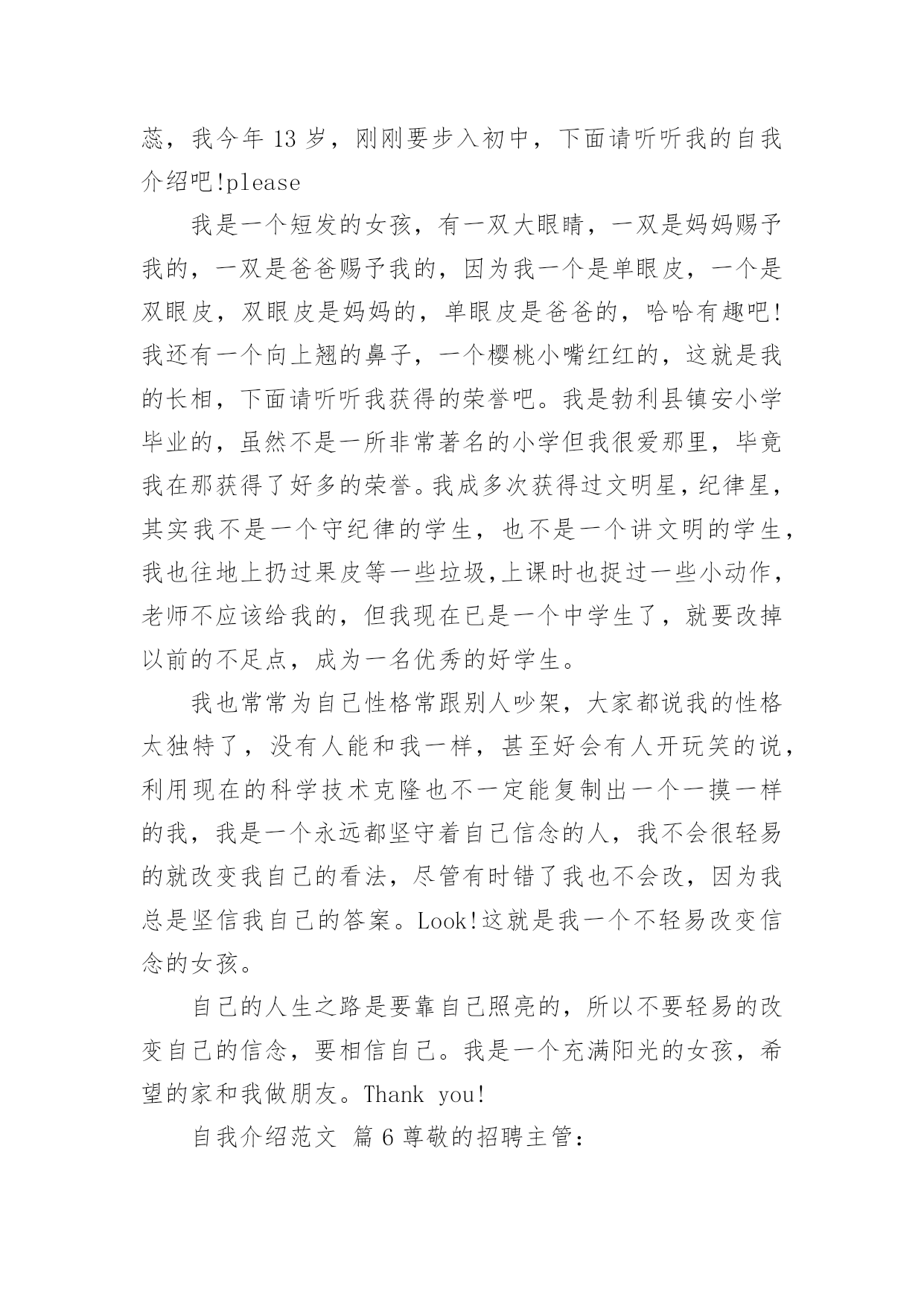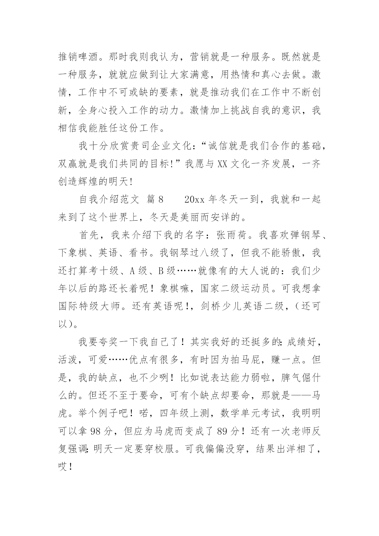 自我介绍自我介绍范文集锦14篇当去到一个新环境下,通常需要我们进行自我介绍,用自我介绍往往可以向他人介绍自己。相信大家又在为写自我介绍犯愁了吧!下面是小编收集整理的自我介绍范文,欢迎阅读与收藏。自我介绍范文篇1我,是一个机灵可爱的男孩儿。圆圆的脸蛋上,长着一双调皮的大眼睛,眼珠儿忽闪忽闪的,好像两颗晶莹透亮的黑宝石,只要我一眨眼,就能想出一个“鬼点子”,大家都叫我“鬼点子精灵”。我很幽默,哪里有我,哪里就有笑声。有一次,在上作文课时,老师问我们“流连忘返”是什么意思,我开口说:“吃了榴莲忘了返回去付钱。”同学们一听,哄堂大笑。虽然我让大家开心,但也扰乱了课堂纪律,在这一方面,我以后要多加注意。当然,我也有优点,在上语文课时,经常踊跃发言,老师还夸我好词佳句积累的多,我知道,这与平时多读书、多写日记有关。有句格言说得好:“读一本好书就是和许多高尚的人谈话。”今后我一定要多和好书交朋友,争取上课回答出更精彩的问题。怎么样,听我介绍了这些内容,是不是你们也想和我交朋友,告诉你们吧,我叫***,欢迎你们到**路小学三年级四班来找我。自我介绍范文篇2本人自小就接受长辈和老师的良好思想道德教育,严格要求自己,为人诚实,勤奋好学,不断求上进,在大学的三年里,经过学院的半军事化管理,使自己变得更加坚强。作为一名计算机专业的大学生,本人热爱本专业并为其投入了巨大的热情和精力。本人思想积极上进,性格开朗,生活作风严谨,责任心强,办事沉稳、执着,能吃苦耐劳,适应性强,具有良好的心理素质。本人积极要求上进,热爱祖国,拥护中国共产党,积极向党的组织靠拢,向我们伟大的中国共产党看齐。本人还坚持党的四项基本原则和改革开放政策、关心国家和社会的大事,具有很强的爱国主义精神。认真贯彻学校严谨,求实,团结,进去的校训,学习雷锋助人为乐的精神,积极加入一些义务活动并坚持到社会上做好事。学习上,本人学习目的明确,基础知识扎实,并努力做到各方面的均衡发展,在学习过程中,我注重理论与实际相结合,虽然实践不够,但是我定会在以后的工作和学习中努力增加。生活上,本人严格要求自己,生活朴素,生活作风严谨,积极参加各种有益的社会活动,认真投入到学校的各项组织活动中,踊跃参加班集体活动。热爱学习,办事稳重谨慎,能吃苦耐劳,能独立完成工作、实际动手能力另外还具有团体协作精神,具有优秀的职业道德和责任感,能迅速的适应各种环境,并融合其中。接受能力好,自学能力强,人际关系优良这是我最大的优点,它使我可以迅速的学到自己所需要的知识,并加以应用。喜欢挑战,自信,有较强的团队意识。自我介绍范文篇3嗨,大家好!我是xxx一小二(2)班的xxx,我七岁了,很高兴能在这里向大家介绍我。我是一个活泼、开朗的男孩,生活中我更是一个爱笑的男孩,大家都说我是个开心果,我很高兴能把我的笑声带给大家,让你们都能分享我的快乐。我的兴趣、爱好可多了,游泳、溜冰、打篮球都是我的最爱。我还擅长主持和表演,并且参加了很多比赛,都取得了很好的成绩哟。在全家总动员活动中,我演的孙悟空活灵活现,得到了评委老师们很高的评价;在第二届楚天英语大赛中我获得了银奖,取得了到北京参加总决赛的资格。当然我还会继续努力的!希望你们能够喜欢我这个阳光男孩自我介绍范文篇4大家好!我叫xxx,今年十一岁了,现任副班长一职。我勤奋好学,乐观向上,爱好广泛、尊敬师长,团结同学,是一个全面发展的学生。我这次想当上大队委员,因为那样才能为班级更多的服务,为学校服务,为大家服务。我有一颗洁白无假的心灵。在家里,对待亲人时刻关心父母的冷热,经常帮父母干家务,打扫卫生。在学校我助人为乐,大家有困难都来找我解决,我会尽我所能帮助大家。我喜欢与同学们讨论问题,善于表现自己,在课堂上我积极回答问题,如果一天不回答问题我就不舒服。对了,我还有一点忘了告诉你,那就是知错就改。听了我的介绍,你一定对我有新的认识了吧!自我介绍范文篇5Hello!我叫,你们也可以叫我黄蕊,我今年13岁,刚刚要步入初中,下面请听听我的自我介绍吧!please我是一个短发的女孩,有一双大眼睛,一双是妈妈赐予我的,一双是爸爸赐予我的,因为我一个是单眼皮,一个是双眼皮,双眼皮是妈妈的,单眼皮是爸爸的,哈哈有趣吧!我还有一个向上翘的鼻子,一个樱桃小嘴红红的,这就是我的长相,下面请听听我获得的荣誉吧。我是勃利县镇安小学毕业的,虽然不是一所非常著名的小学但我很爱那里,毕竟我在那获得了好多的荣誉。我成多次获得过文明星,纪律星,其实我不是一个守纪律的学生,也不是一个讲文明的学生,我也往地上扔过果皮等一些垃圾,上课时也捉过一些小动作,老师不应该给我的,但我现在已是一个中学生了,就要改掉以前的不足点,成为一名优秀的好学生。我也常常为自己性格常跟别人吵架,大家都说我的性格太独特了,没有人能和我一样,甚至好会有人