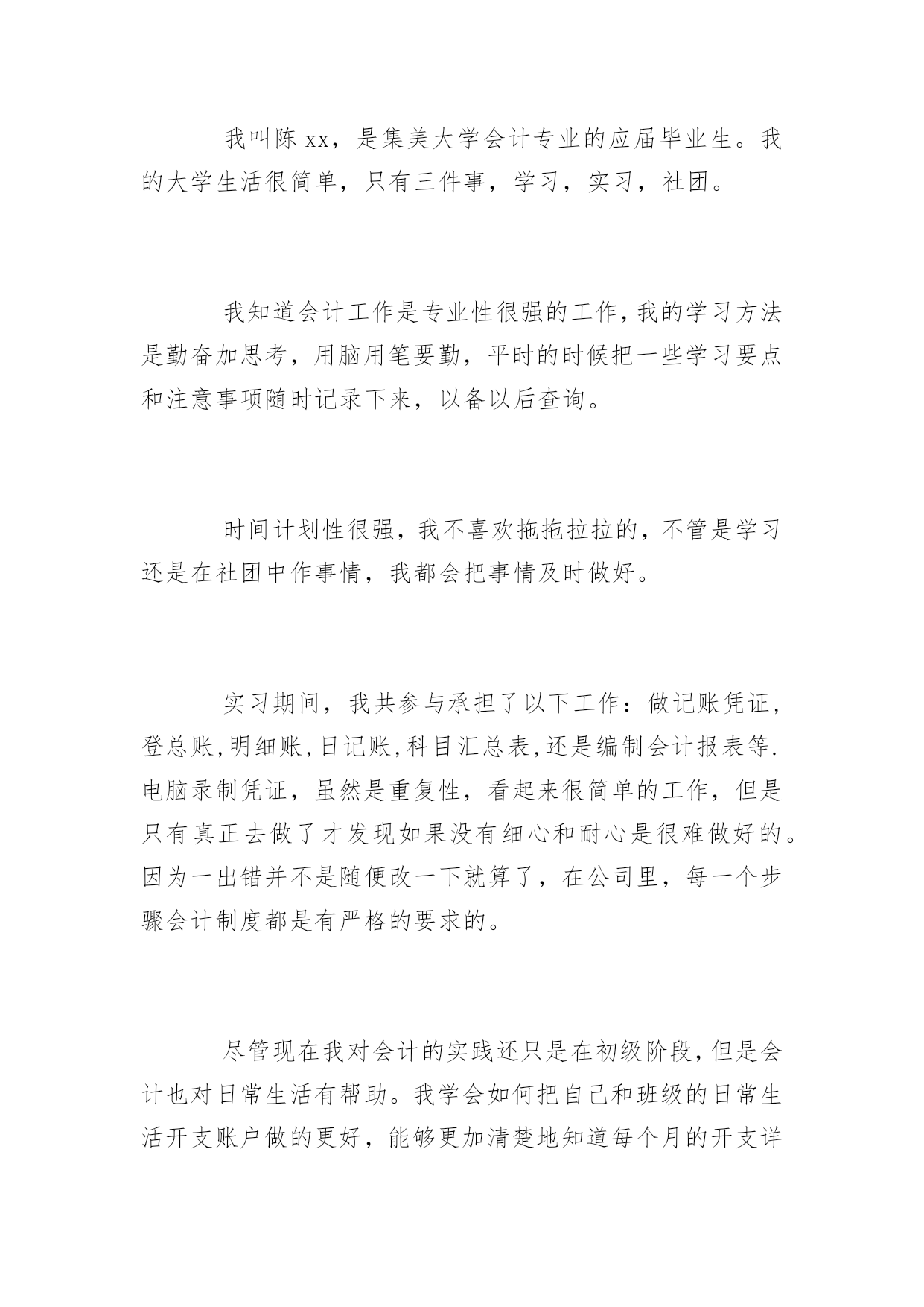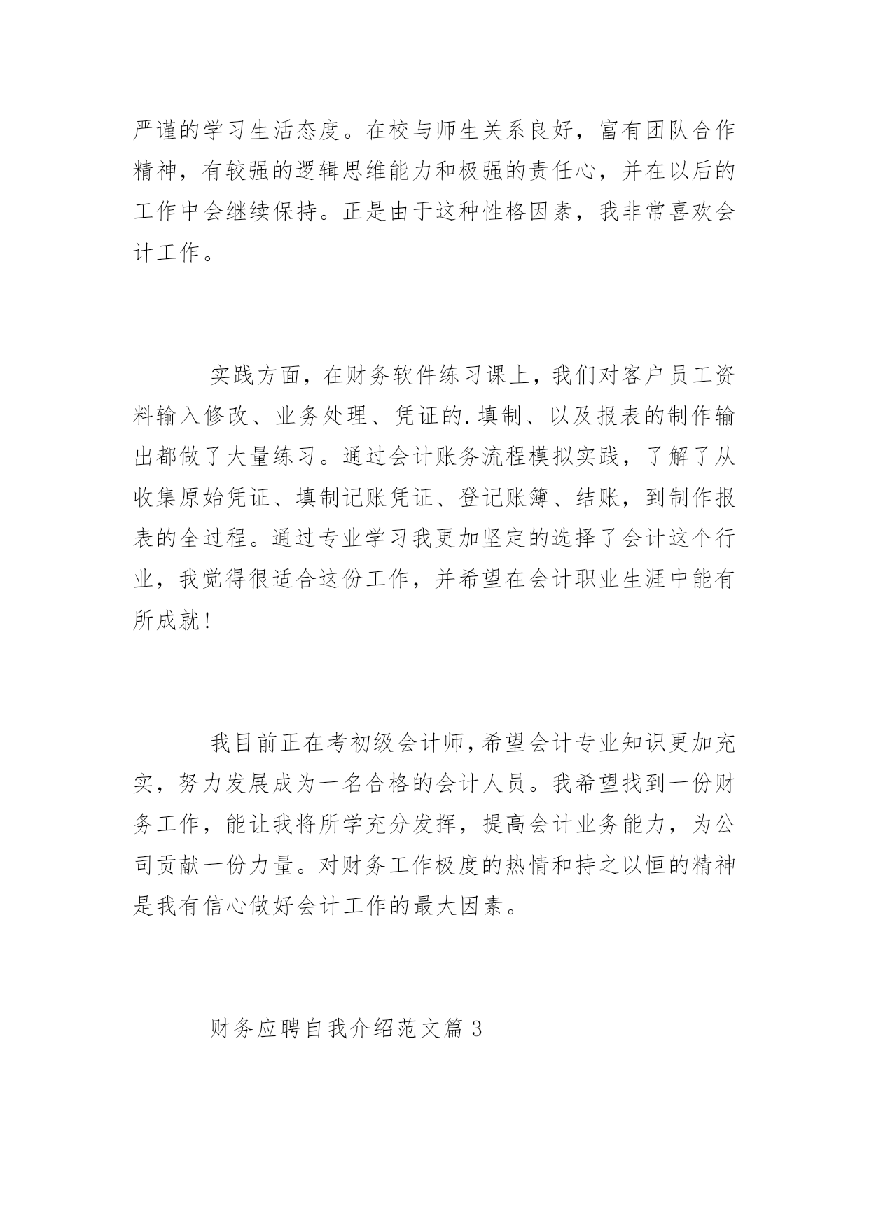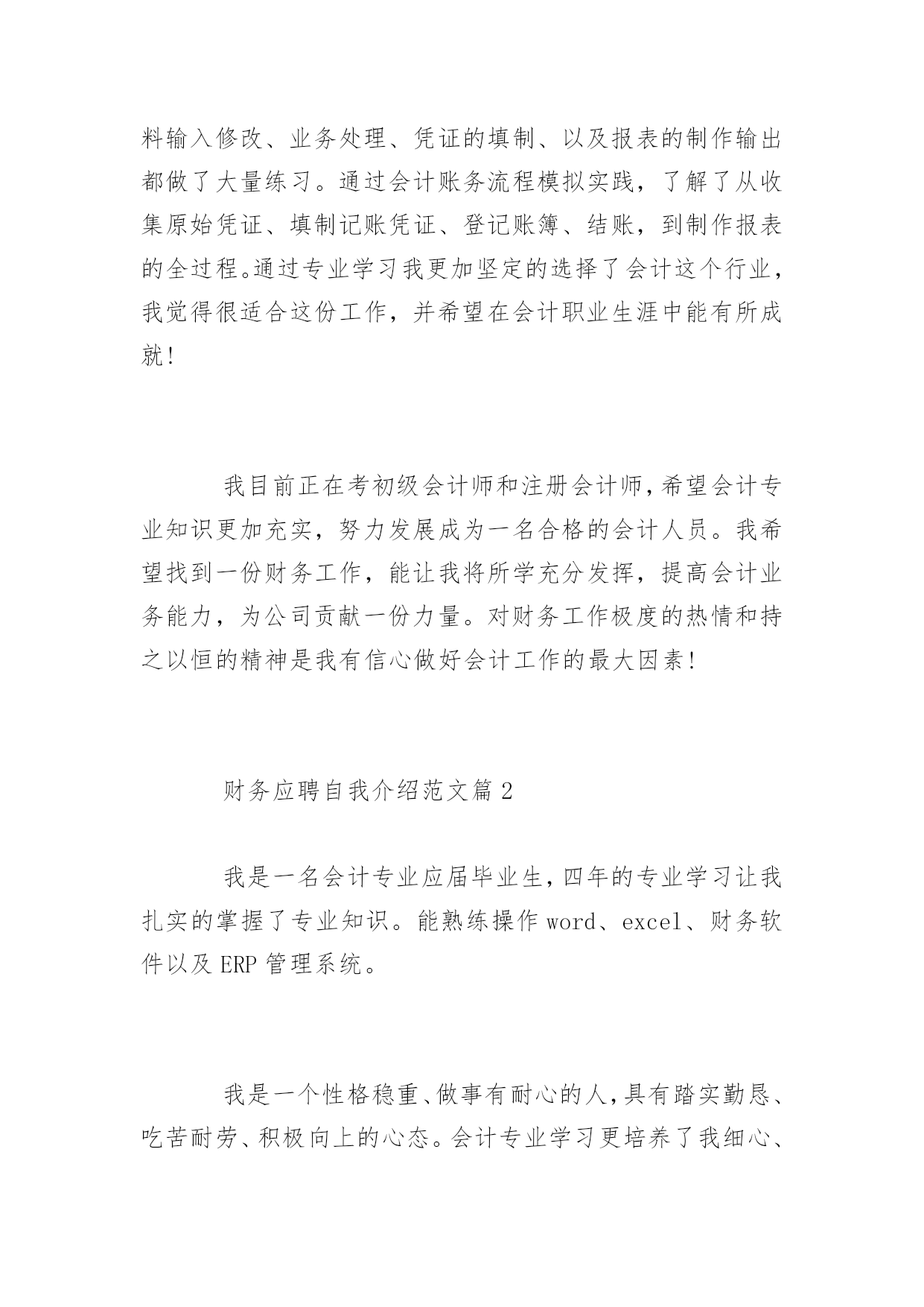 财务应聘自我介绍财务应聘自我介绍范文介绍是人际交往中互相了解的基本方式,正确的介绍可以使不相识的相互认识,也可以通过落落大方的介绍和自我介绍,显示出良好的交际风度。为此小编为大家精心推荐一些财务应聘自我介绍范文的优秀例文,希望对大家有帮助。财务应聘自我介绍范文篇1大家好,很荣幸能参加公司的这次面试。我是一名会计专业应届生,四年的专业学习让我扎实的掌握了专业知识。能熟练操作word、excel、用友u8财务软件以及erp管理系统。富有团队合作精神,有较强的逻辑思维能力和极强的'责任心,并在以后的工作中会继续保持。正是由于这种性格因素,我非常喜欢会计工作。实践方面,在财务软件练习课上,我们对客户员工资料输入修改、业务处理、凭证的填制、以及报表的制作输出都做了大量练习。通过会计账务流程模拟实践,了解了从收集原始凭证、填制记账凭证、登记账簿、结账,到制作报表的全过程。通过专业学习我更加坚定的选择了会计这个行业,我觉得很适合这份工作,并希望在会计职业生涯中能有所成就!我目前正在考初级会计师和注册会计师,希望会计专业知识更加充实,努力发展成为一名合格的会计人员。我希望找到一份财务工作,能让我将所学充分发挥,提高会计业务能力,为公司贡献一份力量。对财务工作极度的热情和持之以恒的精神是我有信心做好会计工作的最大因素!财务应聘自我介绍范文篇2我是一名会计专业应届毕业生,四年的专业学习让我扎实的掌握了专业知识。能熟练操作word、excel、财务软件以及ERP管理系统。我是一个性格稳重、做事有耐心的人,具有踏实勤恳、吃苦耐劳、积极向上的心态。会计专业学习更培养了我细心、严谨的学习生活态度。在校与师生关系良好,富有团队合作精神,有较强的逻辑思维能力和极强的责任心,并在以后的工作中会继续保持。正是由于这种性格因素,我非常喜欢会计工作。实践方面,在财务软件练习课上,我们对客户员工资料输入修改、业务处理、凭证的.填制、以及报表的制作输出都做了大量练习。通过会计账务流程模拟实践,了解了从收集原始凭证、填制记账凭证、登记账簿、结账,到制作报表的全过程。通过专业学习我更加坚定的选择了会计这个行业,我觉得很适合这份工作,并希望在会计职业生涯中能有所成就!我目前正在考初级会计师,希望会计专业知识更加充实,努力发展成为一名合格的会计人员。我希望找到一份财务工作,能让我将所学充分发挥,提高会计业务能力,为公司贡献一份力量。对财务工作极度的热情和持之以恒的精神是我有信心做好会计工作的最大因素。财务应聘自我介绍范文篇3我叫陈xx,是集美大学会计专业的应届毕业生。我的大学生活很简单,只有三件事,学习,实习,社团。我知道会计工作是专业性很强的工作,我的学习方法是勤奋加思考,用脑用笔要勤,平时的时候把一些学习要点和注意事项随时记录下来,以备以后查询。时间计划性很强,我不喜欢拖拖拉拉的,不管是学习还是在社团中作事情,我都会把事情及时做好。实习期间,我共参与承担了以下工作:做记账凭证,登总账,明细账,日记账,科目汇总表,还是编制会计报表等.电脑录制凭证,虽然是重复性,看起来很简单的工作,但是只有真正去做了才发现如果没有细心和耐心是很难做好的。因为一出错并不是随便改一下就算了,在公司里,每一个步骤会计制度都是有严格的要求的。尽管现在我对会计的实践还只是在初级阶段,但是会计也对日常生活有帮助。我学会如何把自己和班级的日常生活开支账户做的更好,能够更加清楚地知道每个月的开支详情,还懂得该如何规划下个月的开支以使钱花在该花的地方。社团中我参加的'舞蹈协会,舞蹈是我的兴趣,在社团中我是组织部的一员,我的职责主要是组织日常的舞蹈培训和组织策划大型舞会。在社团中我感触最深的是团结和沟通,有时候工作难免会遇到一些不配合,如果不去沟通,矛盾就会越来越大。所以现在我会换位思考很重要。在班级中很支持班委的活动。