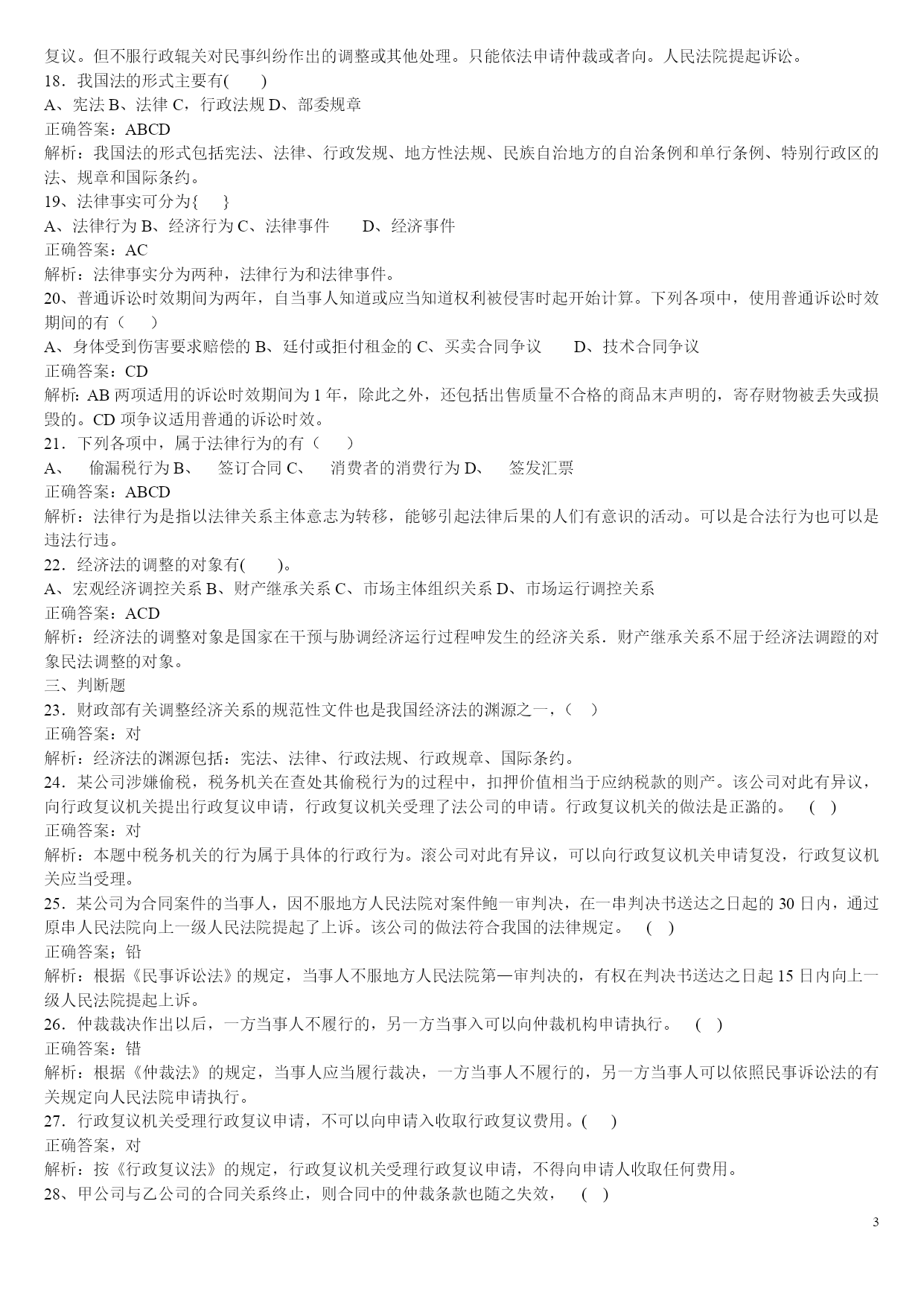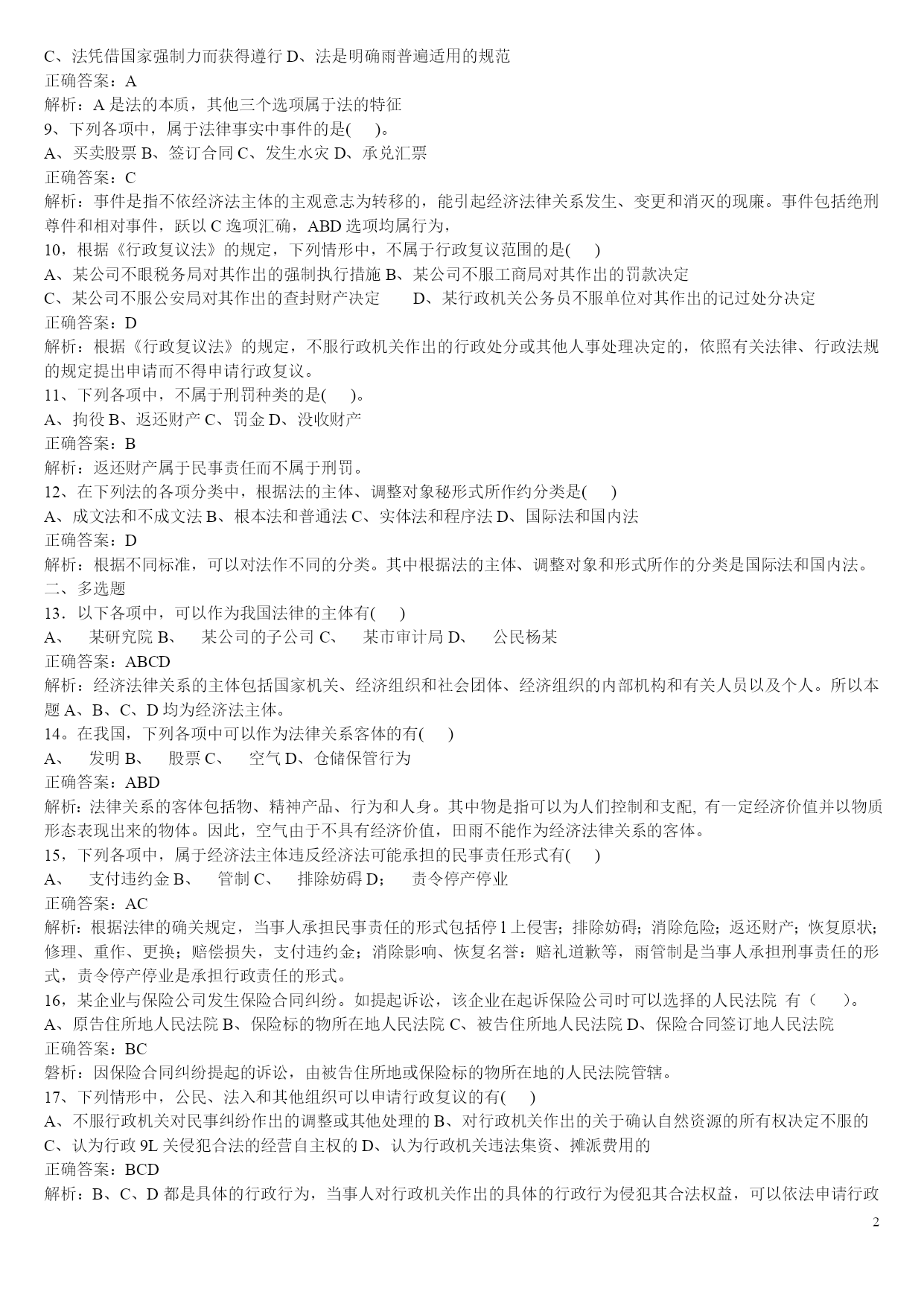 PAGEPAGE4经济法基础第1章练习及答案1.我国法的形式具有不同的效力等级。下列各项中,效力低于宪法的是()A、宪法B、同级政府规章C、法律O、行政法规正确答案:C解析:我国法的表现形式中,国内法部分的法律效力由高到低依次为宪法、法律、行政法规、规章。法律规定和调整的是国家、社会和公民生活中某—方面带根本性的社会关系或基本闷题,法律效力和地位仅次于宪法。2.《会计法》规定从事会计工作的人员,必须取得会计从业资格,按照法律规范的强制性程度的不同分类,该法律规范属于()。A、强制性规范B、禁止