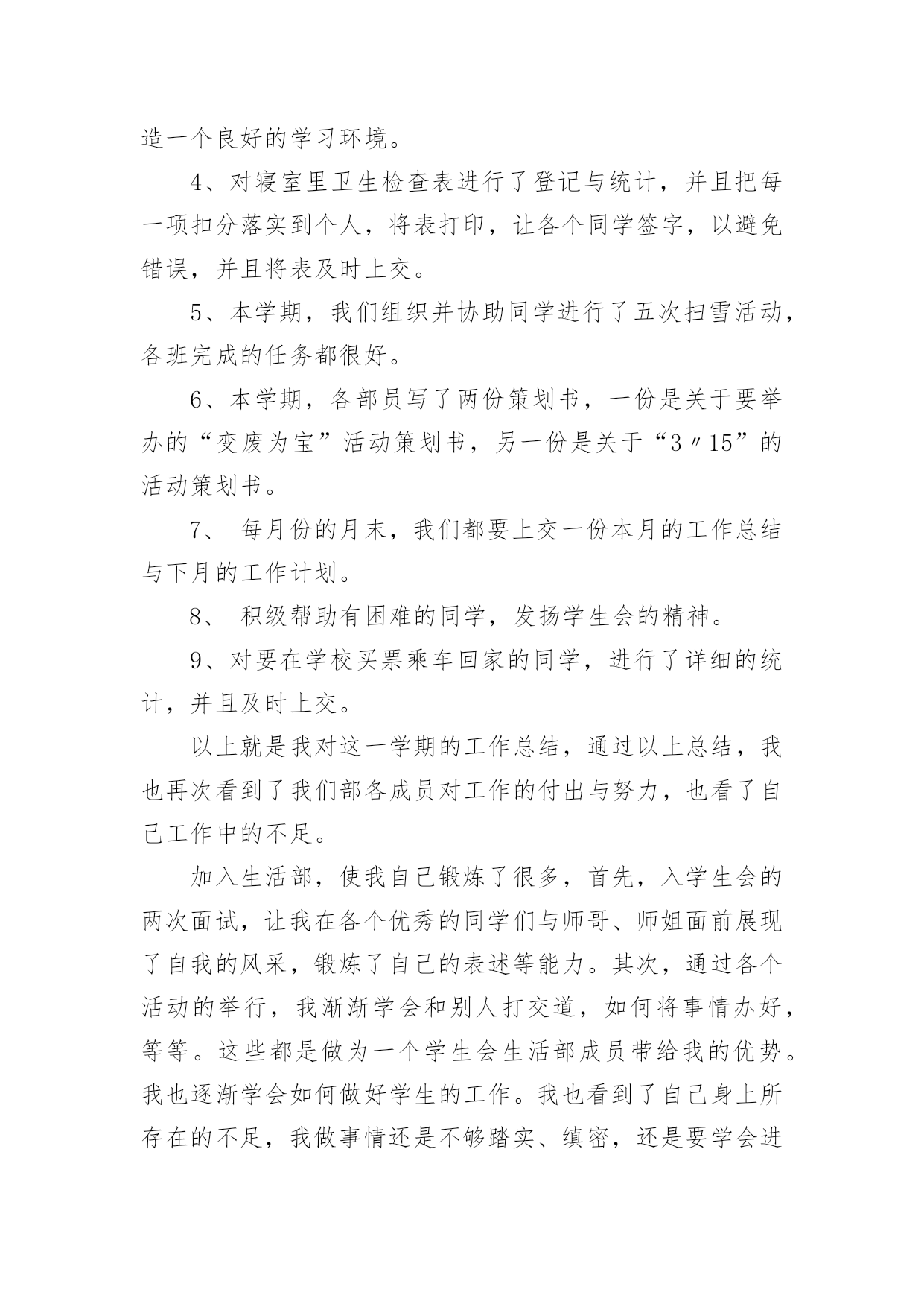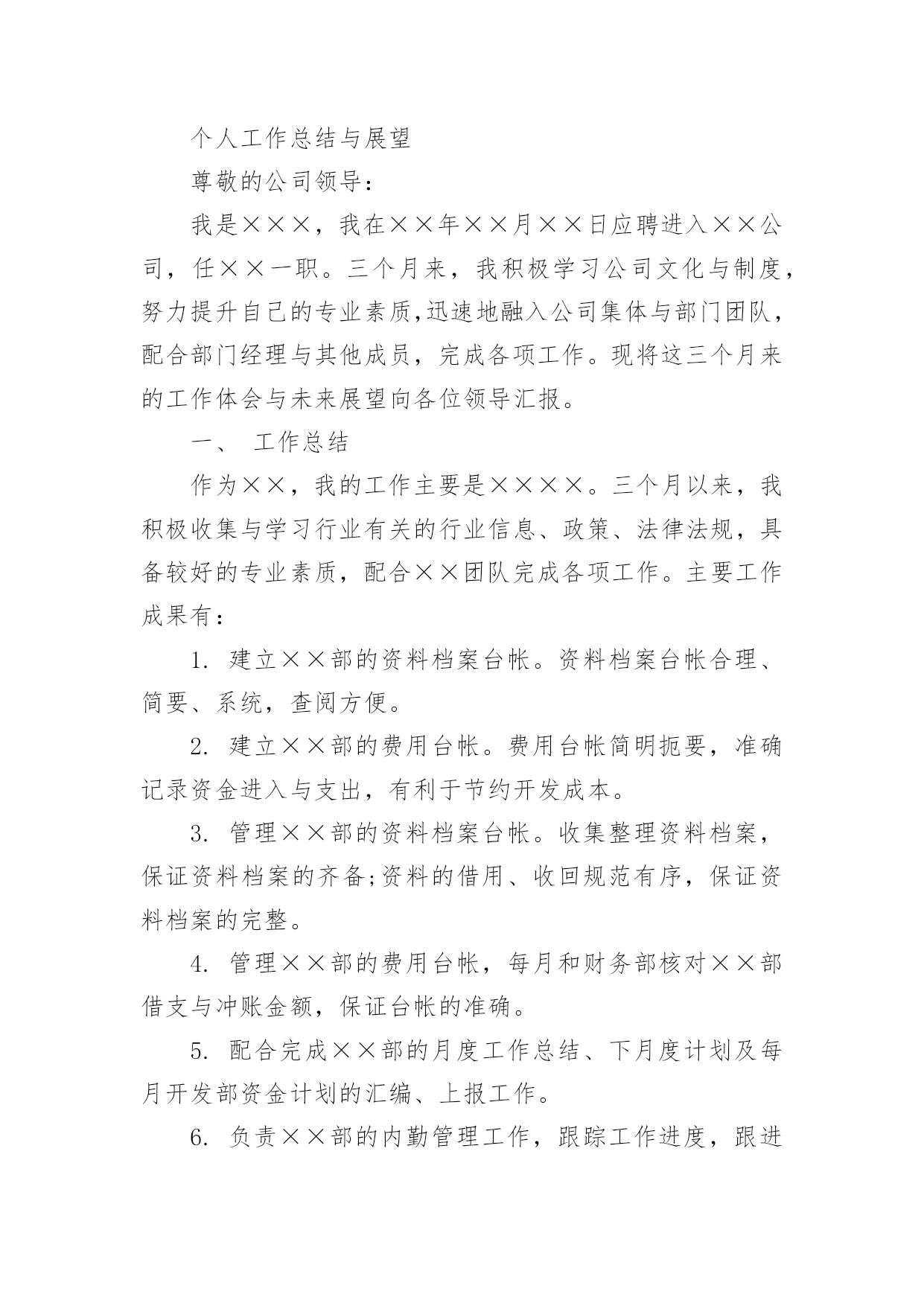 工作总结与展望工作总结与展望转眼半年过去了,这学期的工作也接近尾声,很庆幸也很高兴能够加入经管学院的学生会,并且有幸进入我最喜欢的部门——生活部。生活部是一个重要的部门,我们的主要职责是关心同学生活,尽力解决和满足同学们提出的各种问题和需求,为大家提供方便,定期检查宿舍卫生与班级卫生,配合学院的工作及学生活动的后勤工作,尽量配合其他部门活动等。通过学生会各个部门的努力和配合,我们部门的各项活动得以有序的顺利完成,同时我们部的各部员都完成各自工作,并且部员之间积极配合,禀着“为同学服务”的原则,我们部的工作完成的非常顺利,但同时我们也认识到了工作中的不足,但我们决心在以后的工作中改正不足,下面我对过去一学期生活部的工作做一下回顾和小结:1、这学期,我们进行了学生会与分团委的纳新活动,我有幸加入生活部,和我一起进入生活部的伙伴还有四个,我们的加入使我们部增其旧制,工作能力进一步的加强。2、我们进行了走寝、查寝等活动。走寝主要检查寝室卫生,并且夜晚走寝时主要查看寝员的晚归和夜不归寝的情况,并进行登记与监督。3、我们对班级的卫生进行定期检查,并且给各班生活委员开会,要求他们认真负责起各班级的卫生,给同学们创造一个良好的学习环境。4、对寝室里卫生检查表进行了登记与统计,并且把每一项扣分落实到个人,将表打印,让各个同学签字,以避免错误,并且将表及时上交。5、本学期,我们组织并协助同学进行了五次扫雪活动,各班完成的任务都很好。6、本学期,各部员写了两份策划书,一份是关于要举办的“变废为宝”活动策划书,另一份是关于“3〃15”的活动策划书。7、每月份的月末,我们都要上交一份本月的工作总结与下月的工作计划。8、积级帮助有困难的同学,发扬学生会的精神。9、对要在学校买票乘车回家的同学,进行了详细的统计,并且及时上交。以上就是我对这一学期的工作总结,通过以上总结,我也再次看到了我们部各成员对工作的付出与努力,也看了自己工作中的不足。加入生活部,使我自己锻炼了很多,首先,入学生会的两次面试,让我在各个优秀的同学们与师哥、师姐面前展现了自我的风采,锻炼了自己的表述等能力。其次,通过各个活动的举行,我渐渐学会和别人打交道,如何将事情办好,等等。这些都是做为一个学生会生活部成员带给我的优势。我也逐渐学会如何做好学生的工作。我也看到了自己身上所存在的不足,我做事情还是不够踏实、缜密,还是要学会进一步与人相处的礼节。我会在下学期的工作里,改掉自己的这些不足,尽自己的最大努力去干好工作,做一个合格的学生会成员!在下一学期新的年度中,生活部会全面贯彻学生会的指导方针,大力维护同学们的基本权益,逐步提高同学们的生活质量,用创新的思维为同学们更好的服务,我们会谨记社会主义的荣辱观,积级开展有益同学们身农科院健康发展的活动,以便丰富同学们的课余活动,为同学们的大学时光绚烂多姿。针对实际情况,生活部为本年度的计划做出了以下的展望:1、积极检查各班的卫生情况,并定期的给各班生活委员开会、督促生活委员尽职做好本班工作。2、继续检查寝室的卫生与违规电器情况。3、继续监督学生晚归和夜不归寝情况。4、在“3〃15”这天,开展好活动宣传等。5、下年度每个月会按时交本月的工作总结与下月的工作计划。6、继续为同学们服务,尽量帮助别人。以上是我下一年度工作计划,我决心在这一年度里努力提高自己的能力,改变自己的缺点。希望下一年度,我们部员更加能相互配合彼此工作,将我们的生活部越办越好!生活部:张云芸20XX年12月20日个人工作总结与展望尊敬的公司领导:我是×××,我在××年××月××日应聘进入××公司,任××一职。三个月来,我积极学习公司文化与制度,努力提升自己的专业素质,迅速地融入公司集体与部门团队,配合部门经理与其他成员,完成各项工作。现将这三个月来的工作体会与未来展望向各位领导汇报。一、工作总结作为××,我的工作主要是××××。三个月以来,我积极收集与学习行业有关的行业信息、政策、法律法规,具备较好的专业素质,配合××团队完成各项工作。主要工作成果有:1.建立××部的资料档案台帐。资料档案台帐合理、简要、系统,查阅方便。2.建立××部的费用台帐。费用台帐简明扼要,准确记录资金进入与支出,有利于节约开发成本。3.管理××部的资料档案台帐。收集整理资料档案,保证资料档案的齐备;资料的借用、收回规范有序,保证资料档案的完整。4.管理××部的费用台帐,每月和财务部核对××部借支与冲账金额,保证台帐的准确。5.配合完成××部的月度工作总结、下月度计划及每月开发部资金计划的汇编、上报工作。6.负责××部的内勤管理工作,跟踪工作进度,跟进配套文件。7.协助经理协调与各部门之间的关系。二、工作计划根据个人岗位职责及任务分配,针对前阶段工作中存在的问题,加以思考、分析、改进,对下一步的工作有清晰的