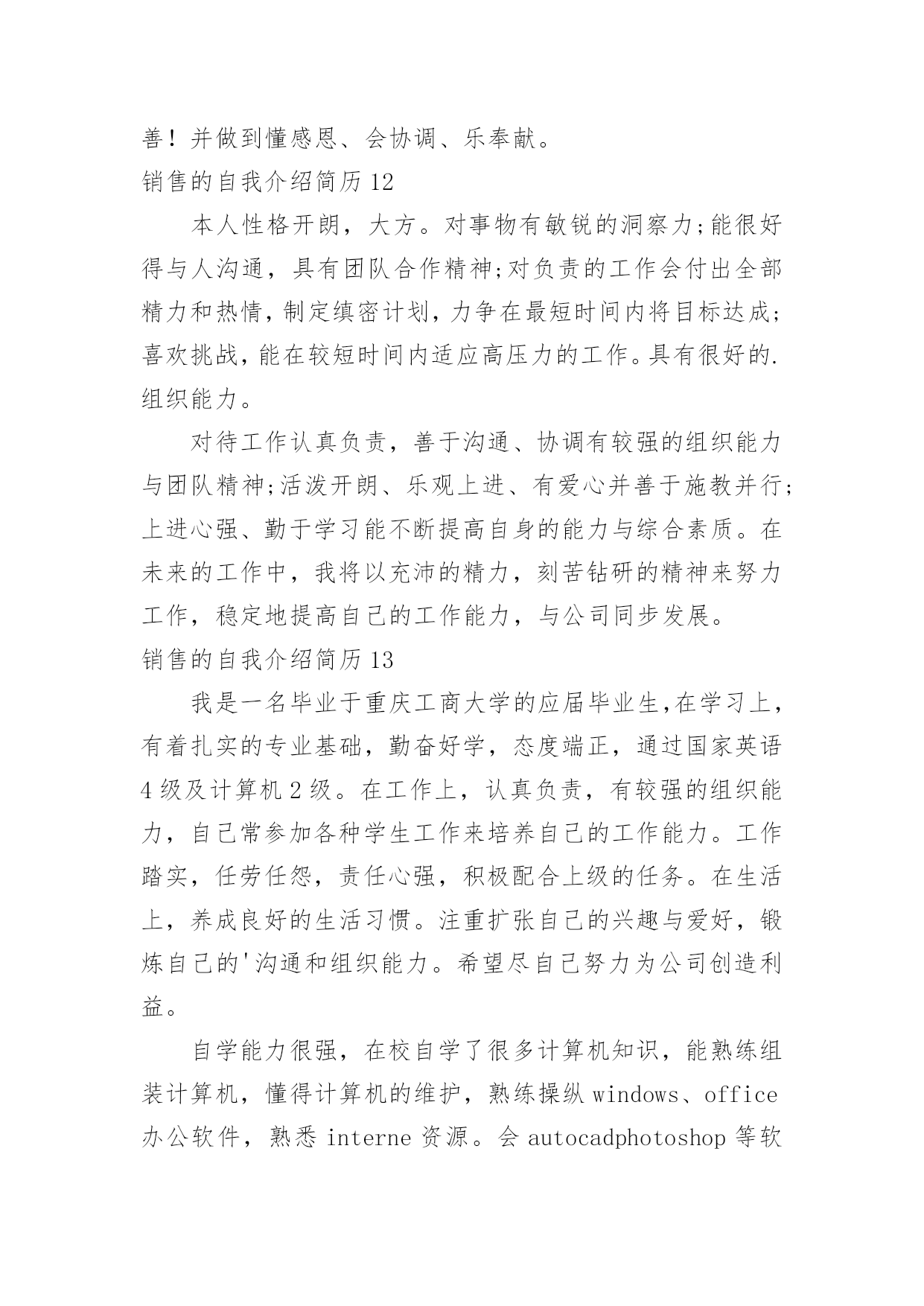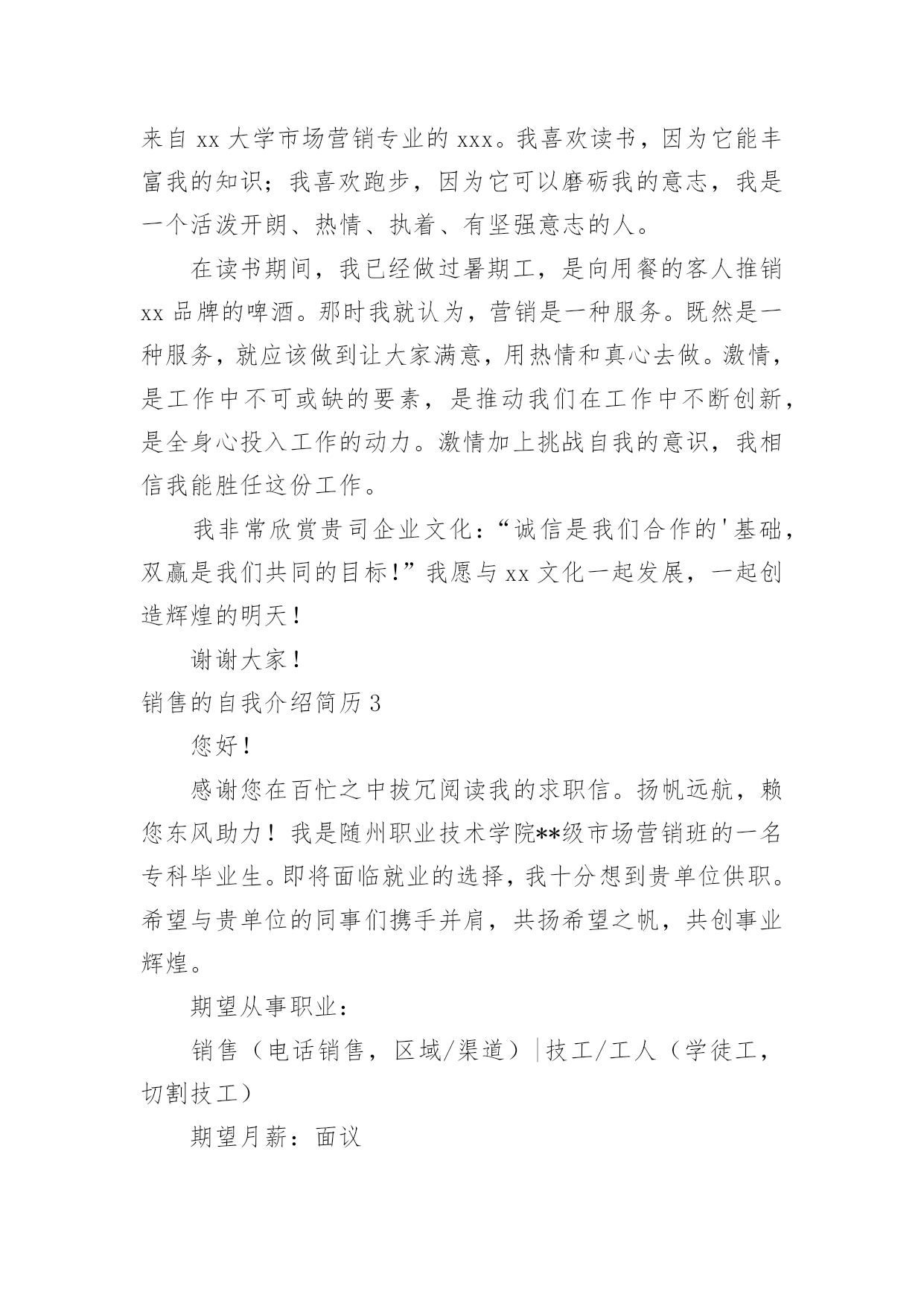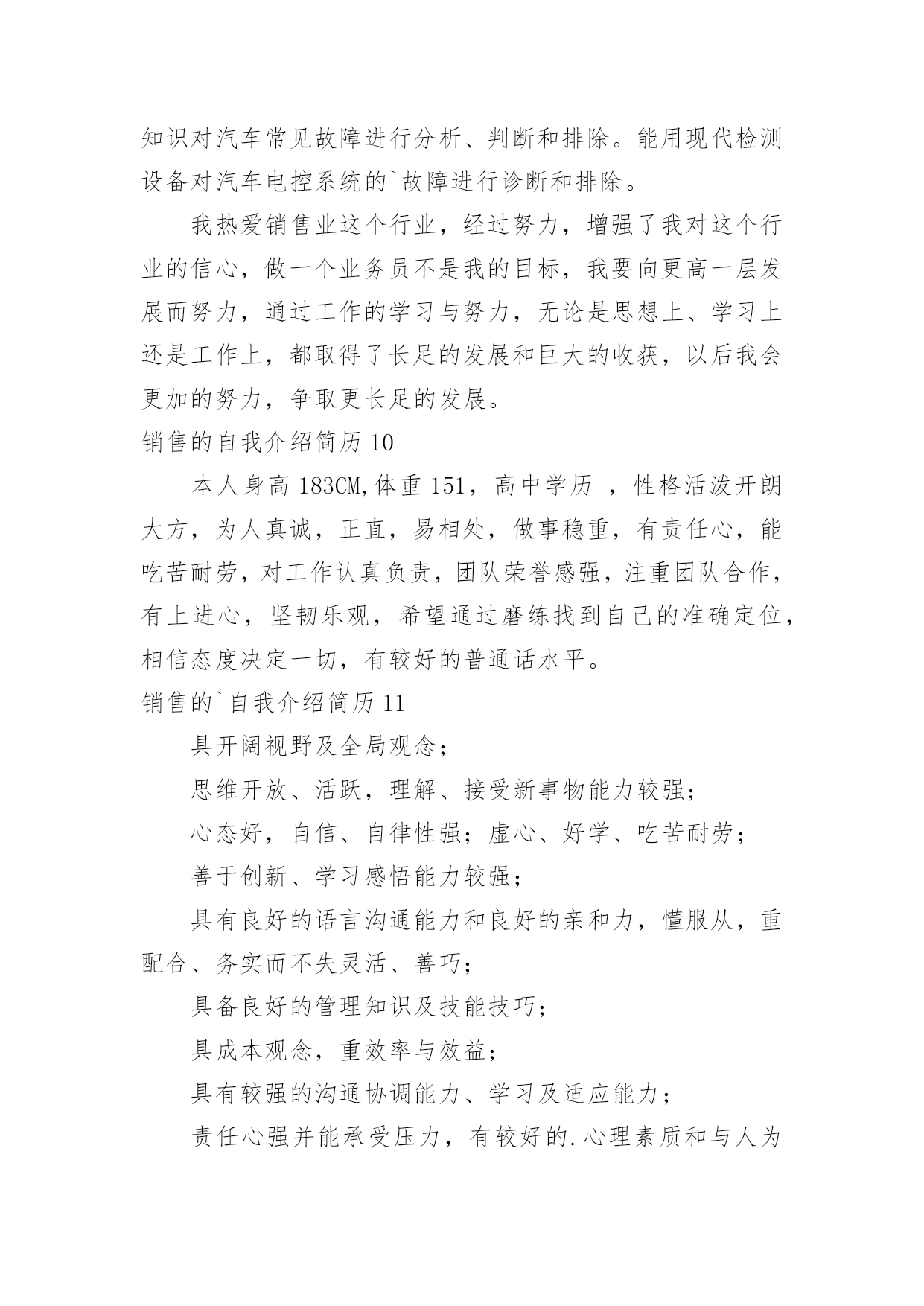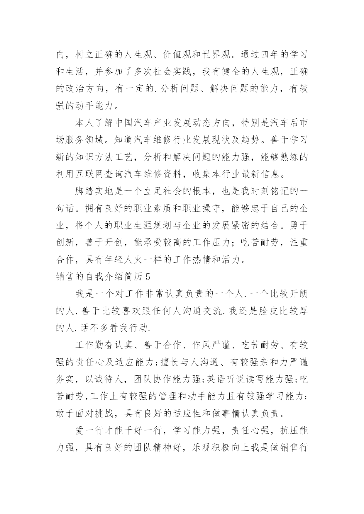 销售的自我介绍简历销售的自我介绍简历15篇光阴的迅速,一眨眼就过去了,我们找工作的时间越来越近,是时候抽出时间写简历了哦。相信许多人会觉得简历很难写吧,下面是小编整理的销售的自我介绍简历,供大家参考借鉴,希望可以帮助到有需要的朋友。销售的自我介绍简历120xx年毕业于贵州黔西县世杰中学在校期间,寒暑假时都在打工学习经验。7月开始,帮助家里打理服装店,直到20xx年4月。20xx年4月到贵阳华科声特信息有限公司担任10086客服,同年7月担任10086客服班长,带领自己的一个团队,团队最少时候,12人,最多时候28人。并在同年的10。11。12月获得整个中心排名第一的奖励!20xx年7月,被公司提升为区域经理,主要负责各个地州业务的对接20xx年8月,由于公司内部问题,从而选择离开公司来到北京。本人性格活泼,大方,爱好音乐,在校时是校乐队主吉他手,喜欢打篮球,在校时也是校篮球队队员!我的.座右铭是,天道酬勤!销售的自我介绍简历2尊敬的领导:您好!下面我将通过简单的面试自我介绍让您来了解我。我是来自xx大学市场营销专业的xxx。我喜欢读书,因为它能丰富我的知识;我喜欢跑步,因为它可以磨砺我的意志,我是一个活泼开朗、热情、执着、有坚强意志的人。在读书期间,我已经做过暑期工,是向用餐的客人推销xx品牌的啤酒。那时我就认为,营销是一种服务。既然是一种服务,就应该做到让大家满意,用热情和真心去做。激情,是工作中不可或缺的要素,是推动我们在工作中不断创新,是全身心投入工作的动力。激情加上挑战自我的意识,我相信我能胜任这份工作。我非常欣赏贵司企业文化:“诚信是我们合作的'基础,双赢是我们共同的目标!”我愿与xx文化一起发展,一起创造辉煌的明天!谢谢大家!销售的自我介绍简历3您好!感谢您在百忙之中拔冗阅读我的求职信。扬帆远航,赖您东风助力!我是随州职业技术学院**级市场营销班的一名专科毕业生。即将面临就业的选择,我十分想到贵单位供职。希望与贵单位的同事们携手并肩,共扬希望之帆,共创事业辉煌。期望从事职业:销售(电话销售,区域/渠道)|技工/工人(学徒工,切割技工)期望月薪:面议工作经历曾经在电脑城做渠道销售。主要是对所在区域的产品的销售和管理,以及售后服务。自我描述本人性格:温和、谦虚、自律、自信,踏实肯干,工作认真,责任心极强。不落后于人。本人适应性强,勤勉不懈,并具有良好的团队精神。同时相信能在紧张的工作中不断的提升。如果我有幸能在贵公司工作,那么我会在以后的工作和学习中积极进取,为贵公司创造价值、实现自己的价值。“宝剑锋从磨砺出,梅花香自苦寒来。”经过三年多的专业学习和大学生活的磨炼,进校时天真、幼稚的我现已变得沉着和冷静。为了立足社会,为了自己的事业成功,四年中我不断努力学习,不论是基础课,还是专业课,都取得了较好的成绩。大学期间英语达到国家四级水平,计算机过国家二级,并通过了全国普通话测试二级甲等考试。此外,我还积极地参加各种社会活动,抓住每一个机会,锻炼自己。大学四年,我深深地感受到,与优秀学生共事,使我在竞争中获益;向实际困难挑战,让我在挫折中成长。我热爱贵单位所从事的事业,殷切地期望能够在您的领导下,为这一光荣的`事业添砖加瓦;并且在实践中不断学习、进步。十多年的寒窗苦读,现在的我已豪情满怀、信心十足。事业上的成功需要知识、毅力、汗水、机会的完美结合。同样,一个单位的荣誉需要承载她的载体——人的无私奉献。我恳请贵单位给我一个机会,让我有幸成为你们中的一员,我将以百倍的热情和勤奋踏实的工作来回报您的知遇之恩。期盼能得到您的回音!感谢您在百忙之中抽暇审批这份材料。销售的自我介绍简历4您好!本人欲申请贵公司招聘的医药代表的职位。我自信符合贵公司的要求。今年7月,我将从北京医学高等专科学校毕业。所学专业为临床医学。通过3年的在校学习,掌握了基本的医学知识,并多次参加学校组织的各种实习活动。在学校内,积极担任班干部、学生会成员、校报学生记者等并先后组织策划了班级元旦晚会以及“奥运记者谁来当”等活动;在社会实践方面,我参加了第十一届全运会的志愿服务工作,并积极利用假期在迪信通做手机销售等。这些经历锻炼了我自学能力、语言表达能力、沟通能力、组织策划以及亲和力等的同时也形成了我“高调做事、低调做人”的原则。一切让事实说话。最后,我发自内心的喜欢医药代表的工作,虽然医药代表的工作比较辛苦,但在这种充满挑战的氛围中努力奋斗,我会感受到自己的价值和对事业的满足感。加之我对贵公司这种“家”文化的向往。我今天非常兴奋且自信的来应聘这个职位。作为汽车专业的一名应届毕业生。在学校期间,我始终以提高自身的综合素质为目标,以自我的全面发展为努力方向,树立正确的人生观、价值观和世界观。通过四年的学习和生活,并参加了多次社会实践,我有健全的人生观,正确的政治方向