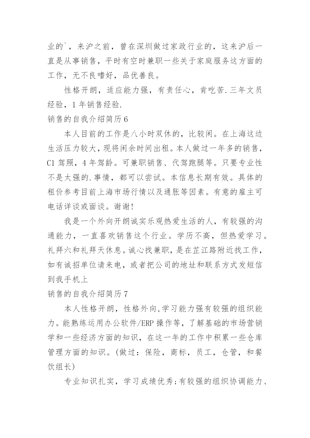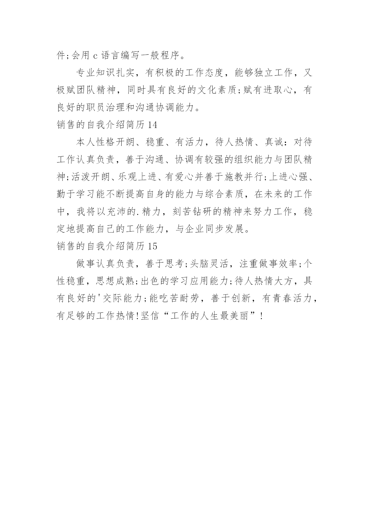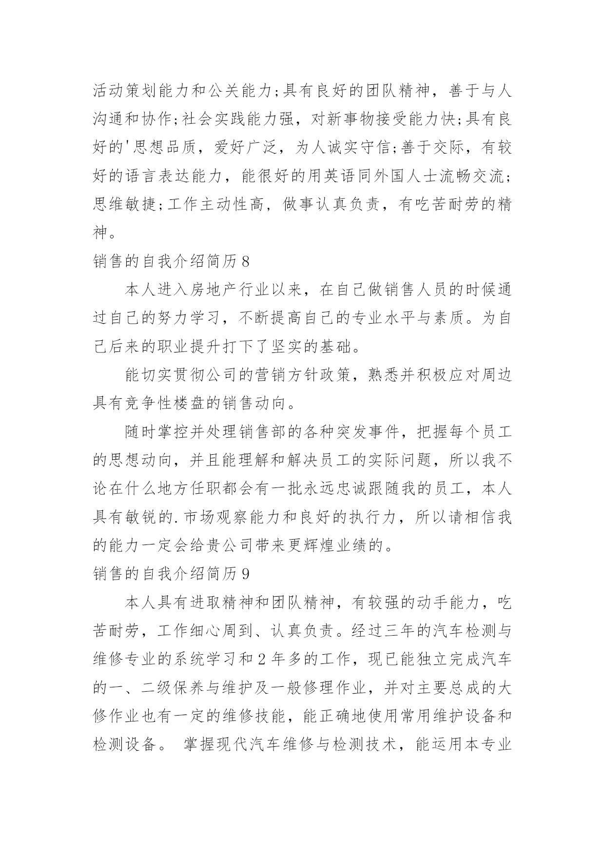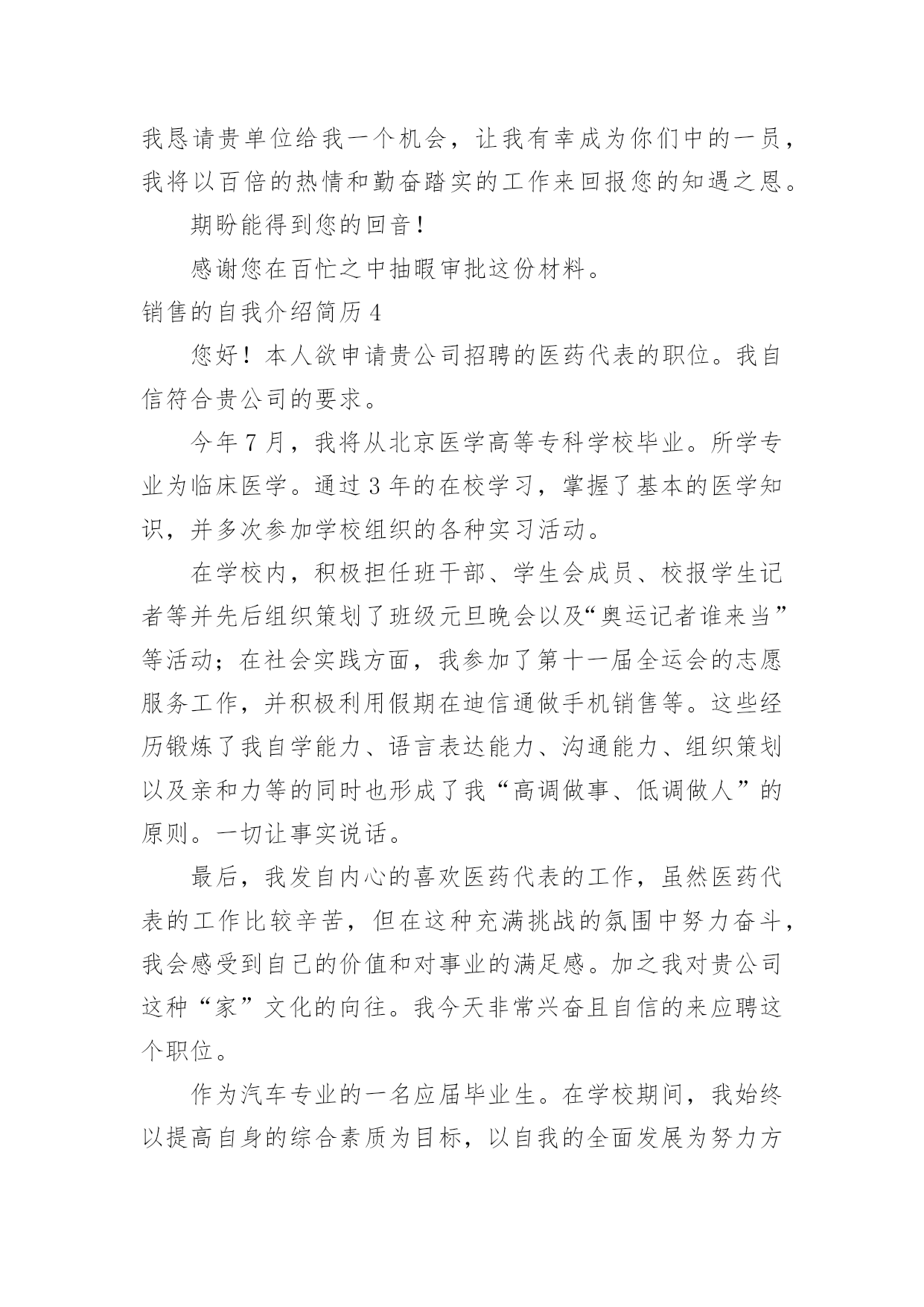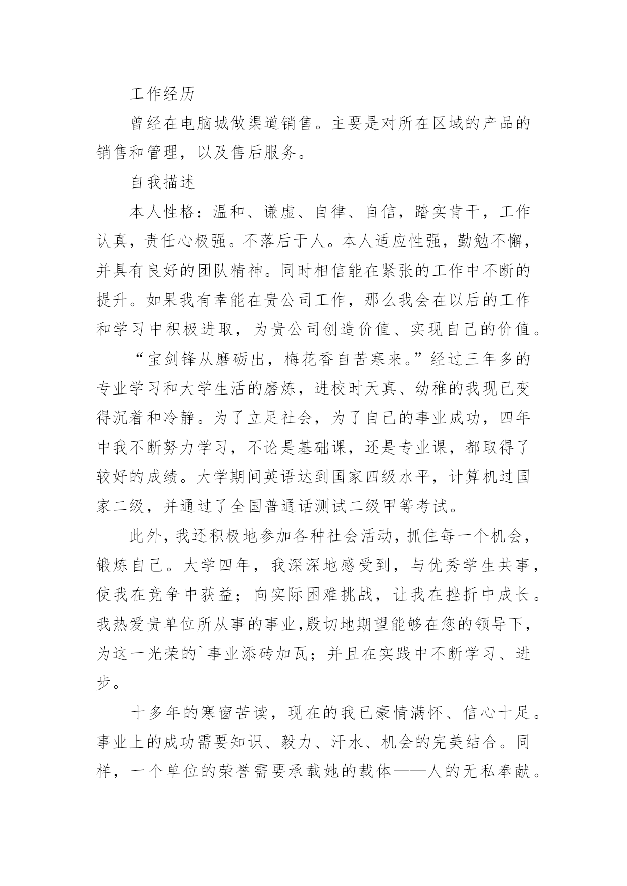 销售的自我介绍简历销售的自我介绍简历15篇光阴的迅速,一眨眼就过去了,我们找工作的时间越来越近,是时候抽出时间写简历了哦。相信许多人会觉得简历很难写吧,下面是小编整理的销售的自我介绍简历,供大家参考借鉴,希望可以帮助到有需要的朋友。销售的自我介绍简历120xx年毕业于贵州黔西县世杰中学在校期间,寒暑假时都在打工学习经验。7月开始,帮助家里打理服装店,直到20xx年4月。20xx年4月到贵阳华科声特信息有限公司担任10086客服,同年7月担任10086客服班长,带领自己的一个团队,团队最少时候,12人,最多时候28人。并在同年的10。11。12月获得整个中心排名第一的奖励!20xx年7月,被公司提升为区域经理,主要负责各个地州业务的对接20xx年8月,由于公司内部问题,从而选择离开公司来到北京。本人性格活泼,大方,爱好音乐,在校时是校乐队主吉他手,喜欢打篮球,在校时也是校篮球队队员!我的.座右铭是,天道酬勤!销售的自我介绍简历2尊敬的领导:您好!下面我将通过简单的面试自我介绍让您来了解我。我是来自xx大学市场营销专业的xxx。我喜欢读书,因为它能丰富我的知识;我喜欢跑步,因为它可以磨砺我的意志,我是一个活泼开朗、热情、执着、有坚强意志的人。在读书期间,我已经做过暑期工,是向用餐的客人推销xx品牌的啤酒。那时我就认为,营销是一种服务。既然是一种服务,就应该做到让大家满意,用热情和真心去做。激情,是工作中不可或缺的要素,是推动我们在工作中不断创新,是全身心投入工作的动力。激情加上挑战自我的意识,我相信我能胜任这份工作。我非常欣赏贵司企业文化:“诚信是我们合作的'基础,双赢是我们共同的目标!”我愿与xx文化一起发展,一起创造辉煌的明天!谢谢大家!销售的自我介绍简历3您好!感谢您在百忙之中拔冗阅读我的求职信。扬帆远航,赖您东风助力!我是随州职业技术学院**级市场营销班的一名专科毕业生。即将面临就业的选择,我十分想到贵单位供职。希望与贵单位的同事们携手并肩,共扬希望之帆,共创事业辉煌。期望从事职业:销售(电话销售,区域/渠道)|技工/工人(学徒工,切割技工)期望月薪:面议工作经历曾经在电脑城做渠道销售。主要是对所在区域的产品的销售和管理,以及售后服务。自我描述本人性格:温和、谦虚、自律、自信,踏实肯干,工作认真,责任心极强。不落后于人。本人适应性强,勤勉不懈,并具有良好的团队精神。同时相信能在紧张的工作中不断的提升。如果我有幸能在贵公司工作,那么我会在以后的工作和学习中积极进取,为贵公司创造价值、实现自己的价值。“宝剑锋从磨砺出,梅花香自苦寒来。”经过三年多的专业学习和大学生活的磨炼,进校时天真、幼稚的我现已变得沉着和冷静。为了立足社会,为了自己的事业成功,四年中我不断努力学习,不论是基础课,还是专业课,都取得了较好的成绩。大学期间英语达到国家四级水平,计算机过国家二级,并通过了全国普通话测试二级甲等考试。此外,我还积极地参加各种社会活动,抓住每一个机会,锻炼自己。大学四年,我深深地感受到,与优秀学生共事,使我在竞争中获益;向实际困难挑战,让我在挫折中成长。我热爱贵单位所从事的事业,殷切地期望能够在您的领导下,为这一光荣的`事业添砖加瓦;并且在实践中不断学习、进步。十多年的寒窗苦读,现在的我已豪情满怀、信心十足。事业上的成功需要知识、毅力、汗水、机会的完美结合。同样,一个单位的荣誉需要承载她的载体——人的无私奉献。我恳请贵单位给我一个机会,让我有幸成为你们中的一员,我将以百倍的热情和勤奋踏实的工作来回报您的知遇之恩。期盼能得到您的回音!感谢您在百忙之中抽暇审批这份材料。销售的自我介绍简历4您好!本人欲申请贵公司招聘的医药代表的职位。我自信符合贵公司的要求。今年7月,我将从北京医学高等专科学校毕业。所学专业为临床医学。通过3年的在校学习,掌握了基本的医学知识,并多次参加学校组织的各种实习活动。在学校内,积极担任班干部、学生会成员、校报学生记者等并先后组织策划了班级元旦晚会以及“奥运记者谁来当”等活动;在社会实践方面,我参加了第十一届全运会的志愿服务工作,并积极利用假期在迪信通做手机销售等。这些经历锻炼了我自学能力、语言表达能力、沟通能力、组织策划以及亲和力等的同时也形成了我“高调做事、低调做人”的原则。一切让事实说话。最后,我发自内心的喜欢医药代表的工作,虽然医药代表的工作比较辛苦,但在这种充满挑战的氛围中努力奋斗,我会感受到自己的价值和对事业的满足感。加之我对贵公司这种“家”文化的向往。我今天非常兴奋且自信的来应聘这个职位。作为汽车专业的一名应届毕业生。在学校期间,我始终以提高自身的综合素质为目标,以自我的全面发展为努力方向,树立正确的人生观、价值观和世界观。通过四年的学习和生活,并参加了多次社会实践,我有健全的人生观,正确的政治方向