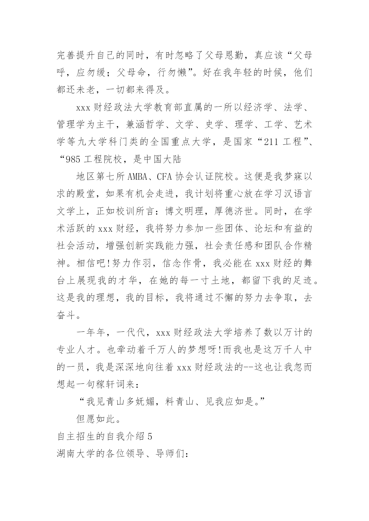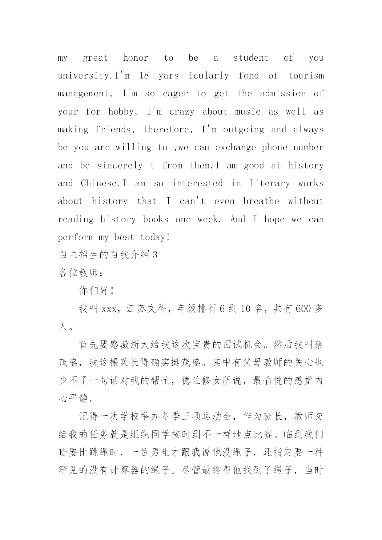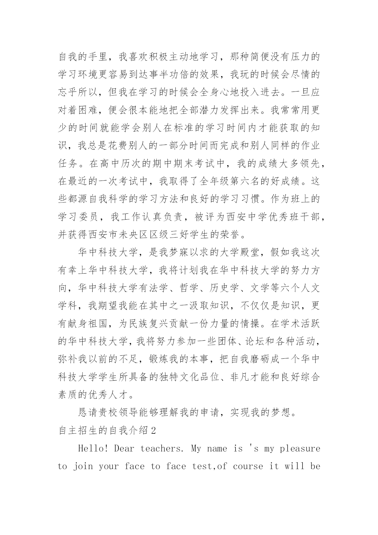 自主招生的自我介绍自主招生的自我介绍当来到一个陌生环境中,进行自我介绍是必不可少的,通过自我介绍可以让他人了解我们。那么自我介绍应该包括什么内容呢?以下是小编帮大家整理的自主招生的自我介绍,欢迎大家分享。自主招生的自我介绍1尊敬的华中科技大学自主招生领导:您好!我是西安中学高三学生xxx。我期望经过贵校的自主招生来实现我在华中科技大学学习的梦想,感激您在百忙中抽出时间审阅我的申请材料。一向以来,华中科技大学对我都有很大的吸引力,她有着悠久的历史,深厚的文化底蕴,丰富的教学资源,良好的学术氛围,强烈的时代气息,为社会培养出许多杰出人才,是国家教育部直属的“211”工程和“985”工程重点建设大学,有许多专业在国内都名列前茅。近年我校许多优秀学生都不约而同的选择贵校为第一志愿,我也十分渴望能在明年7月拿到贵校的录取通知书,成为贵校的一名学生,成为一名对社会、对祖国有用的人才。从小学习成绩一向领先的我,凭借自我的努力考入自我梦想的高中——西安中学,经过三年的锤炼,我已经从一个简单明快的女该成长为意志坚强、底蕴深厚、成熟内敛、热爱生活、有爱心、有同情心、有上进心、德智体全面发展的优秀学生。我性格开朗,兴趣广泛,天文地理、国内国际形势、音乐美术都会引起我极大的兴趣与关注。我喜欢参加学校组织的各种活动,在西安中学建校100周年庆典活动中,我积极主动加入到自愿者的行列,在社会实践中得到了锻炼;我喜欢写作,参加了校组织的作文大赛,并获得三等奖,在此收获了许多知识,同时也发觉自我的不足;我喜欢唱歌,参加了学校歌手大赛,虽然没有入围,但锻炼了自我的勇气;我喜欢电脑制作,高一时生物课幻灯制作,我总是代表小组制作出最精彩的作品,使我在计算机软件的运用上有了提高。我热爱生活,始终对生活充满信心和期望。在这个美丽的世界上,我享受着春花的美丽,秋月的温馨,夏雨的活力,冬雪的坚韧。我喜欢感受欢乐,我期望把欢乐传递给我身边的每一个人,我为强者欢呼,为弱者流泪,我相信送人玫瑰手留余香。我在班上有很好的同学缘不只是由于我的班干部职务,更来自我单纯、直率、热情的性格。我会常常不厌其烦地给同学讲一道已经讲过多少遍的数学题,我会郑重其事地给同学公开我学习英语的最佳诀窍,我会在学习之余和同学一齐去图书馆遨游于知识的`海洋里,一齐去KTV陶醉在美妙的旋律中。我是一个做事果断、有主见的人,愿意把主动权掌握的自我的手里,我喜欢积极主动地学习,那种简便没有压力的学习环境更容易到达事半功倍的效果,我玩的时候会尽情的忘乎所以,但我在学习的时候会全身心地投入进去。一旦应对着困难,便会很本能地把全部潜力发挥出来。我常常用更少的时间就能学会别人在标准的学习时间内才能获取的知识,我总是花费别人的一部分时间而完成和别人同样的作业任务。在高中历次的期中期末考试中,我的成绩大多领先,在最近的一次考试中,我取得了全年级第六名的好成绩。这些都源自我科学的学习方法和良好的学习习惯。作为班上的学习委员,我工作认真负责,被评为西安中学优秀班干部,并获得西安市未央区区级三好学生的荣誉。华中科技大学,是我梦寐以求的大学殿堂,假如我这次有幸上华中科技大学,我将计划我在华中科技大学的努力方向,华中科技大学有法学、哲学、历史学、文学等六个人文学科,我期望我能在其中之一汲取知识,不仅仅是知识,更有献身祖国,为民族复兴贡献一份力量的情操。在学术活跃的华中科技大学,我将努力参加一些团体、论坛和各种活动,弥补我以前的不足,锻炼我的本事,把自我磨砺成一个华中科技大学学生所具备的独特文化品位、非凡才能和良好综合素质的优秀人才。恳请贵校领导能够理解我的申请,实现我的梦想。自主招生的自我介绍2Hello!Dearteachers.Mynameis'smypleasuretojoinyourfacetofacetest,ofcourseitwillbemygreathonortobeastudentofyouuniversity.I'm18yarsicularlyfondoftourismmanagement,I'msoeagertogettheadmissionofyourforhobby,I'mcrazyaboutmusicaswellasmakingfriends,therefore,I'moutgoingandalwaysbeyouarewillingto,wecanexchangephonenumberandbesincerelytfromthem,IamgoodathistoryandChinese.IamsointerestedinliteraryworksabouthistorythatIcan'tevenbreathewithoutreadinghistorybooksoneweek.AndIhopewecanp