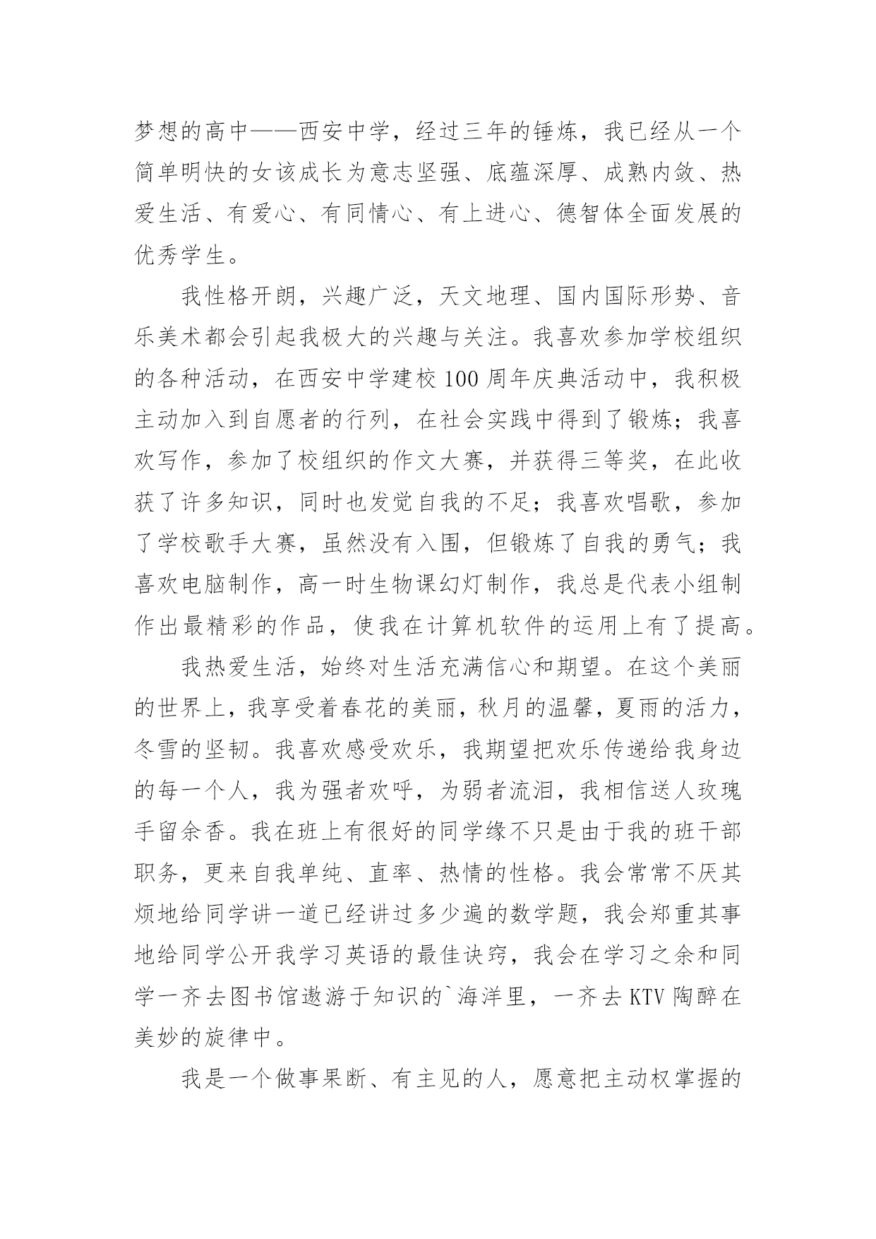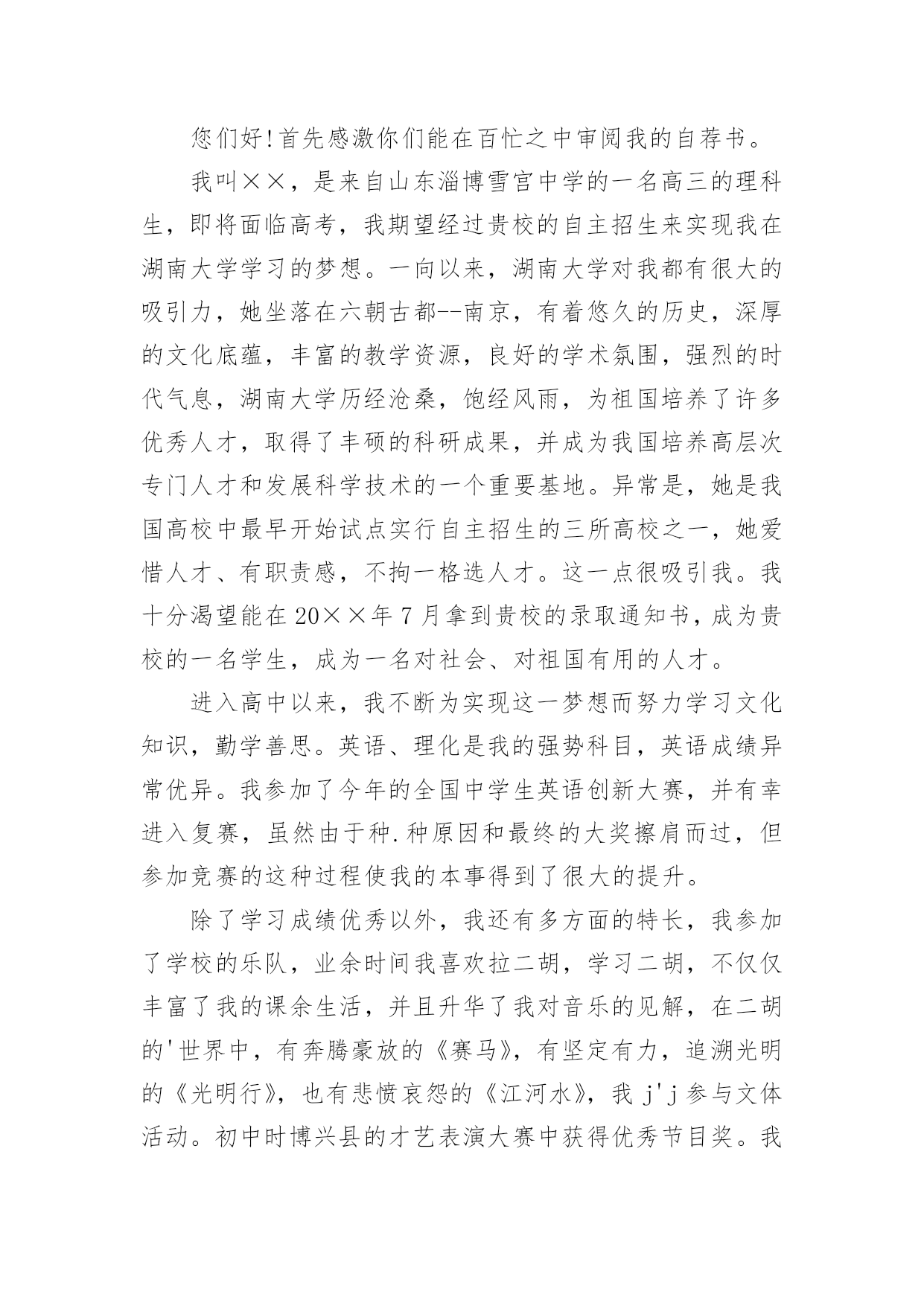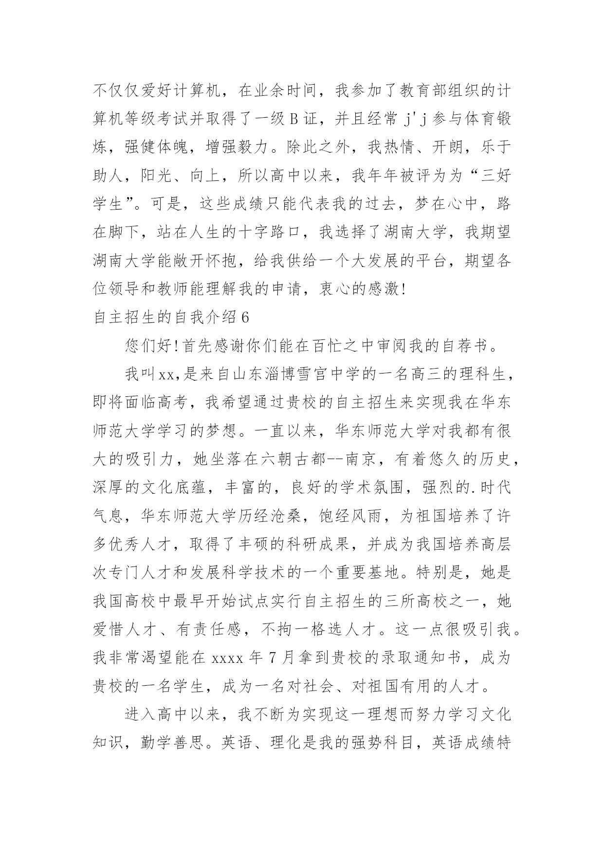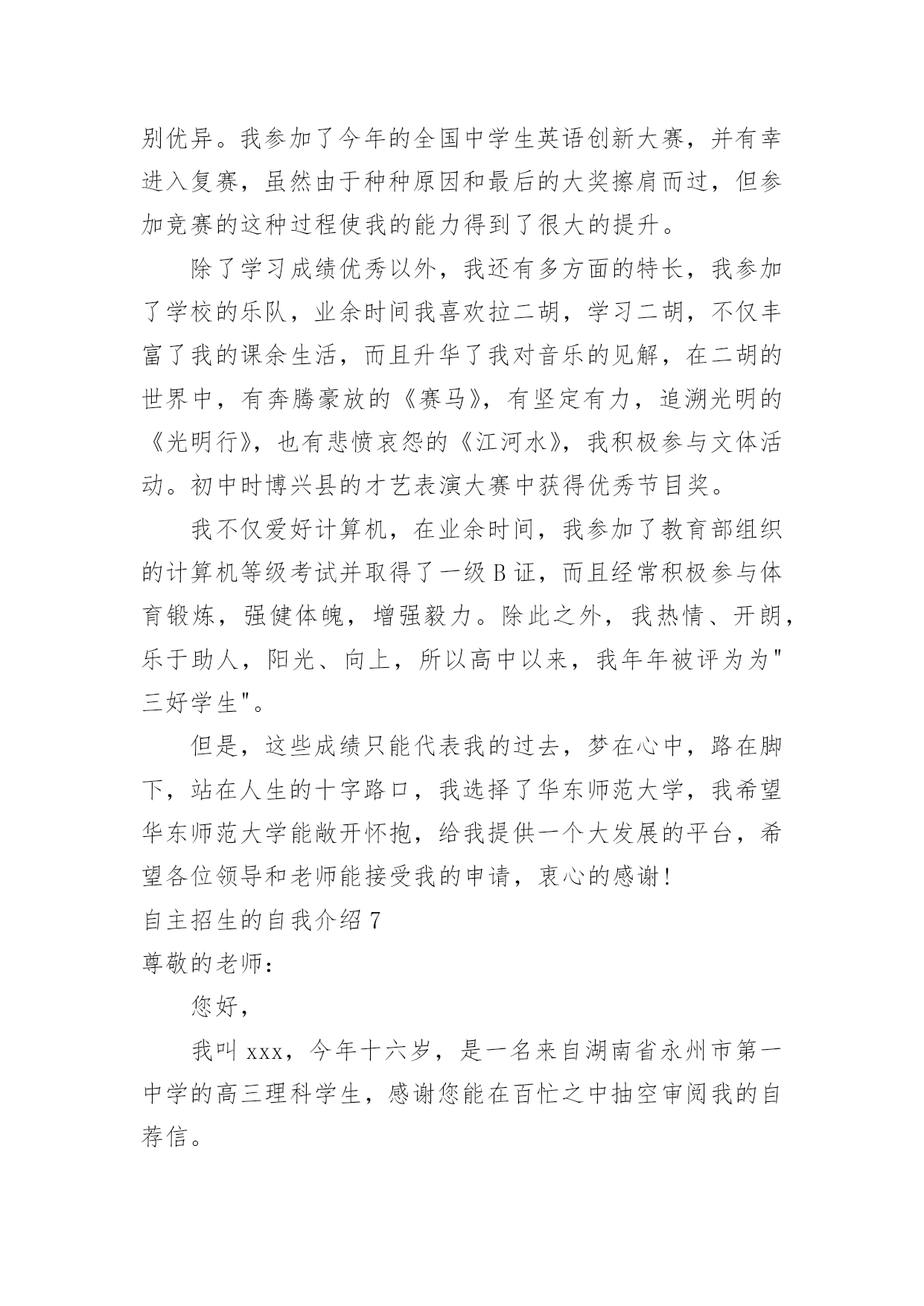 自主招生的自我介绍自主招生的自我介绍当来到一个陌生环境中,进行自我介绍是必不可少的,通过自我介绍可以让他人了解我们。那么自我介绍应该包括什么内容呢?以下是小编帮大家整理的自主招生的自我介绍,欢迎大家分享。自主招生的自我介绍1尊敬的华中科技大学自主招生领导:您好!我是西安中学高三学生xxx。我期望经过贵校的自主招生来实现我在华中科技大学学习的梦想,感激您在百忙中抽出时间审阅我的申请材料。一向以来,华中科技大学对我都有很大的吸引力,她有着悠久的历史,深厚的文化底蕴,丰富的教学资源,良好的学术氛围,强烈的时代气息,为社会培养出许多杰出人才,是国家教育部直属的“211”工程和“985”工程重点建设大学,有许多专业在国内都名列前茅。近年我校许多优秀学生都不约而同的选择贵校为第一志愿,我也十分渴望能在明年7月拿到贵校的录取通知书,成为贵校的一名学生,成为一名对社会、对祖国有用的人才。从小学习成绩一向领先的我,凭借自我的努力考入自我梦想的高中——西安中学,经过三年的锤炼,我已经从一个简单明快的女该成长为意志坚强、底蕴深厚、成熟内敛、热爱生活、有爱心、有同情心、有上进心、德智体全面发展的优秀学生。我性格开朗,兴趣广泛,天文地理、国内国际形势、音乐美术都会引起我极大的兴趣与关注。我喜欢参加学校组织的各种活动,在西安中学建校100周年庆典活动中,我积极主动加入到自愿者的行列,在社会实践中得到了锻炼;我喜欢写作,参加了校组织的作文大赛,并获得三等奖,在此收获了许多知识,同时也发觉自我的不足;我喜欢唱歌,参加了学校歌手大赛,虽然没有入围,但锻炼了自我的勇气;我喜欢电脑制作,高一时生物课幻灯制作,我总是代表小组制作出最精彩的作品,使我在计算机软件的运用上有了提高。我热爱生活,始终对生活充满信心和期望。在这个美丽的世界上,我享受着春花的美丽,秋月的温馨,夏雨的活力,冬雪的坚韧。我喜欢感受欢乐,我期望把欢乐传递给我身边的每一个人,我为强者欢呼,为弱者流泪,我相信送人玫瑰手留余香。我在班上有很好的同学缘不只是由于我的班干部职务,更来自我单纯、直率、热情的性格。我会常常不厌其烦地给同学讲一道已经讲过多少遍的数学题,我会郑重其事地给同学公开我学习英语的最佳诀窍,我会在学习之余和同学一齐去图书馆遨游于知识的`海洋里,一齐去KTV陶醉在美妙的旋律中。我是一个做事果断、有主见的人,愿意把主动权掌握的自我的手里,我喜欢积极主动地学习,那种简便没有压力的学习环境更容易到达事半功倍的效果,我玩的时候会尽情的忘乎所以,但我在学习的时候会全身心地投入进去。一旦应对着困难,便会很本能地把全部潜力发挥出来。我常常用更少的时间就能学会别人在标准的学习时间内才能获取的知识,我总是花费别人的一部分时间而完成和别人同样的作业任务。在高中历次的期中期末考试中,我的成绩大多领先,在最近的一次考试中,我取得了全年级第六名的好成绩。这些都源自我科学的学习方法和良好的学习习惯。作为班上的学习委员,我工作认真负责,被评为西安中学优秀班干部,并获得西安市未央区区级三好学生的荣誉。华中科技大学,是我梦寐以求的大学殿堂,假如我这次有幸上华中科技大学,我将计划我在华中科技大学的努力方向,华中科技大学有法学、哲学、历史学、文学等六个人文学科,我期望我能在其中之一汲取知识,不仅仅是知识,更有献身祖国,为民族复兴贡献一份力量的情操。在学术活跃的华中科技大学,我将努力参加一些团体、论坛和各种活动,弥补我以前的不足,锻炼我的本事,把自我磨砺成一个华中科技大学学生所具备的独特文化品位、非凡才能和良好综合素质的优秀人才。恳请贵校领导能够理解我的申请,实现我的梦想。自主招生的自我介绍2Hello!Dearteachers.Mynameis'smypleasuretojoinyourfacetofacetest,ofcourseitwillbemygreathonortobeastudentofyouuniversity.I'm18yarsicularlyfondoftourismmanagement,I'msoeagertogettheadmissionofyourforhobby,I'mcrazyaboutmusicaswellasmakingfriends,therefore,I'moutgoingandalwaysbeyouarewillingto,wecanexchangephonenumberandbesincerelytfromthem,IamgoodathistoryandChinese.IamsointerestedinliteraryworksabouthistorythatIcan'tevenbreathewithoutreadinghistorybooksoneweek.AndIhopewecanp