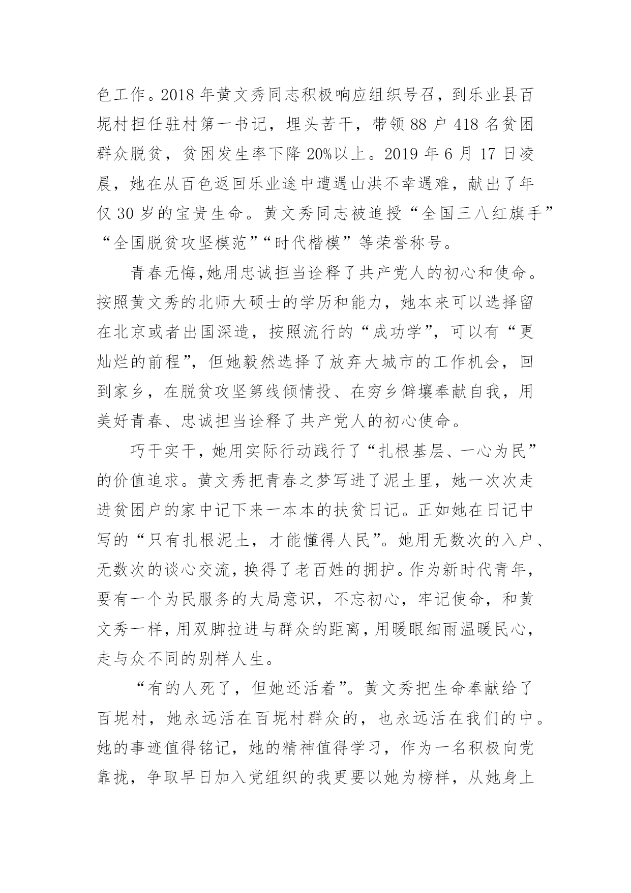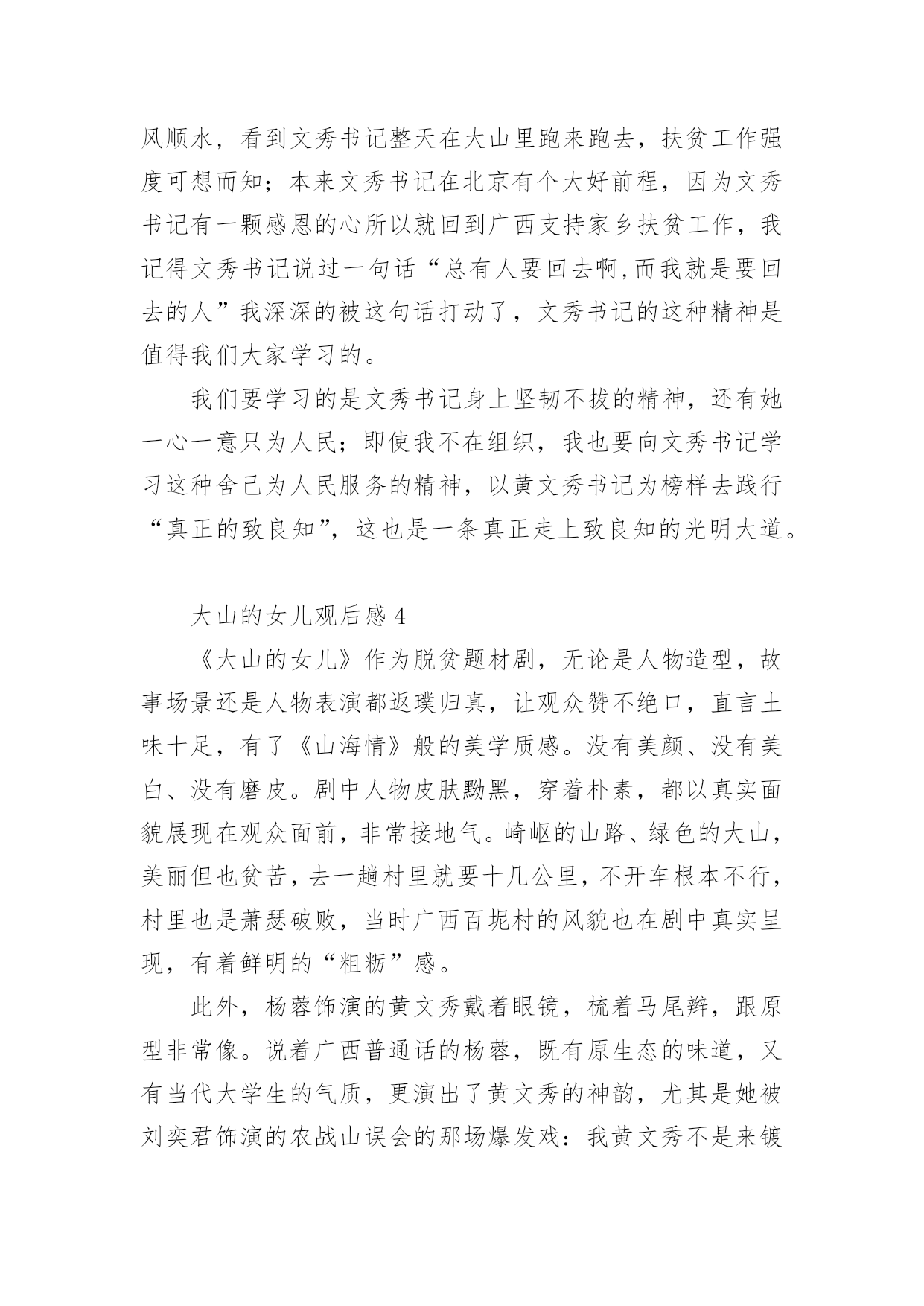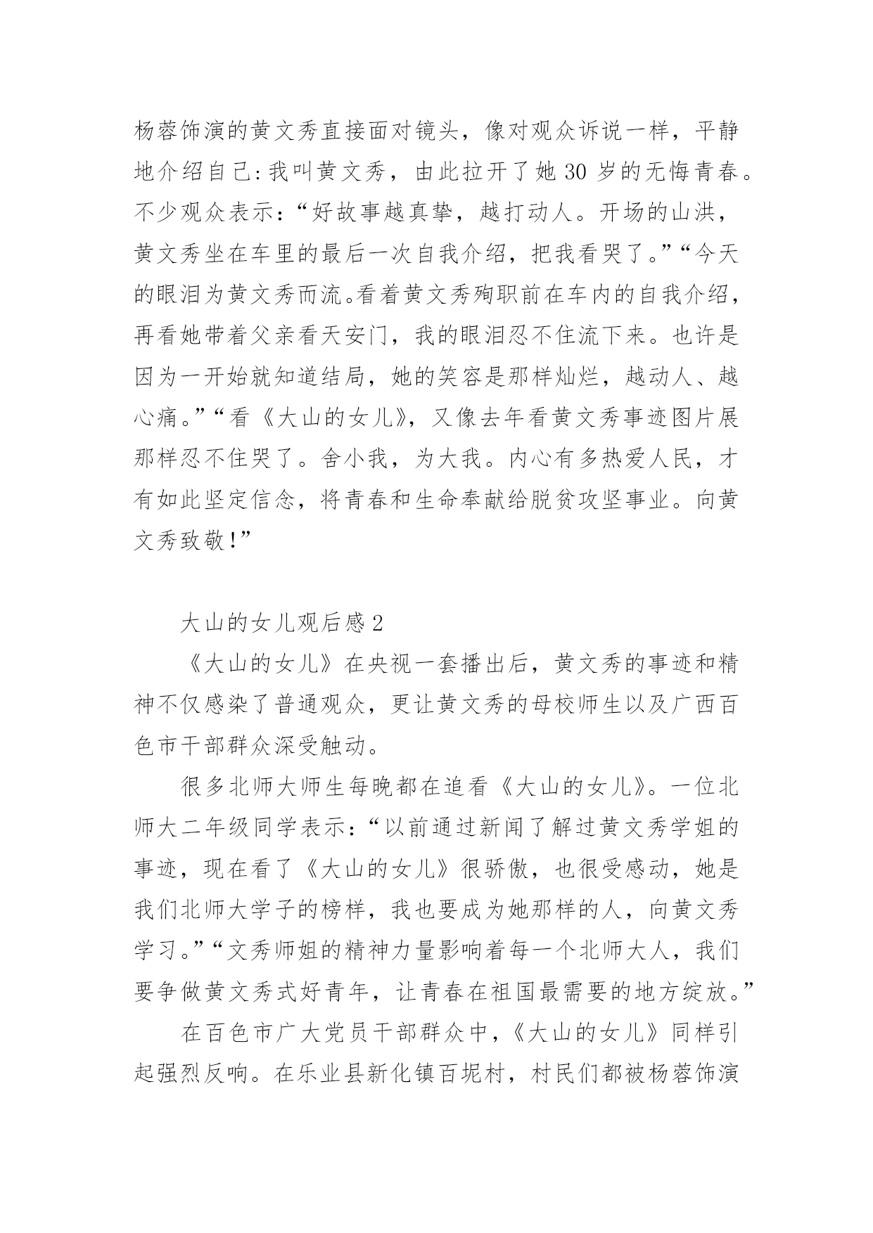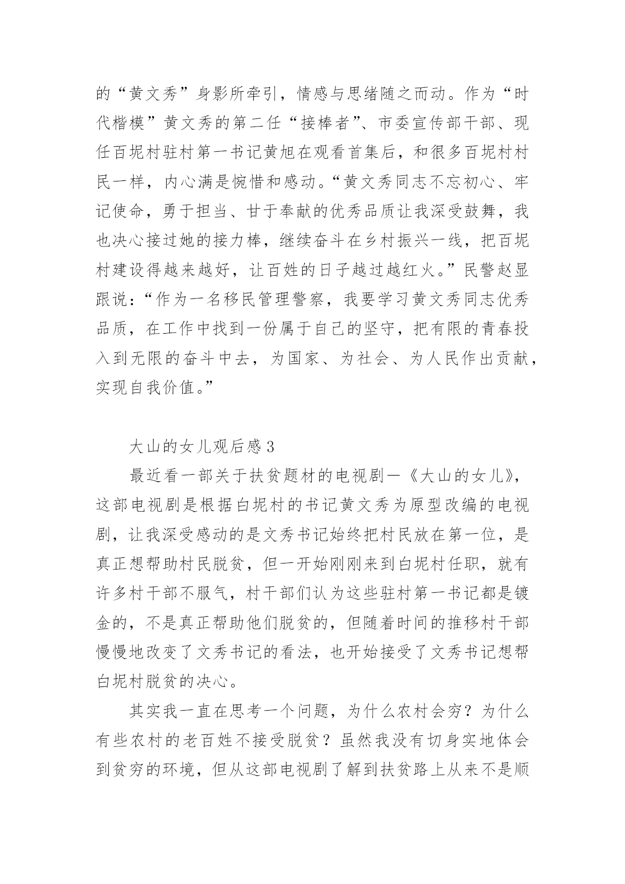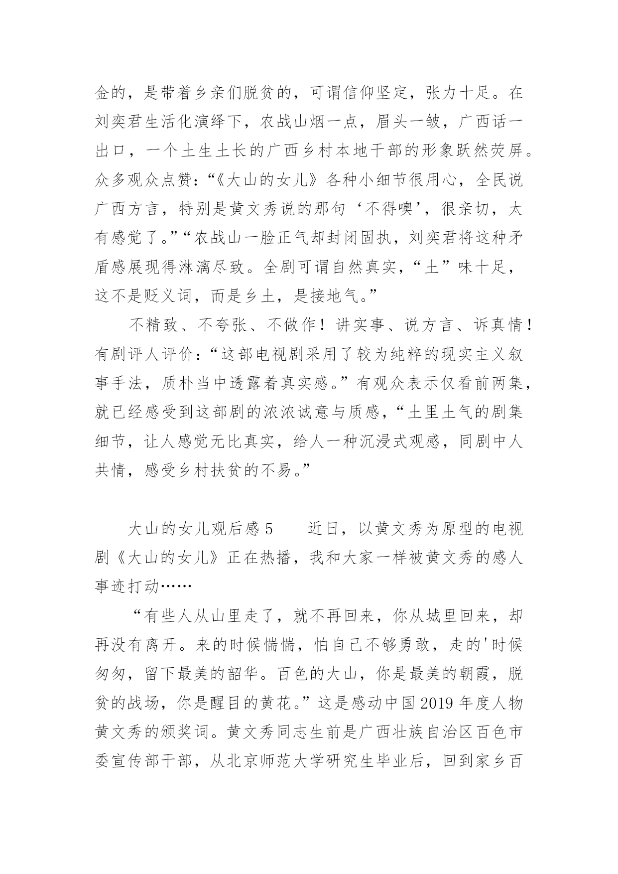 大山的女儿观后感大山的女儿观后感(通用5篇)认真看完一部作品以后,相信大家的收获肯定不少吧,是时候抽出时间写写观后感了。但是观后感有什么要求呢?以下是小编整理的大山的女儿观后感(通用5篇),欢迎大家分享。大山的女儿观后感1有些人从山里走了,就不再回来,你从城里回来,却再没有离开......感动中国的颁奖盛典上,白岩松这样向黄文秀致颁奖词,催人泪下。以“时代楷模”黄文秀为原型创作,正在央视一套热播的.电视剧《大山的女儿》则再次引领观众走进黄文秀30岁平凡而伟大的奋斗人生,点点滴滴,情真意切,令人泪目。换一种方式认识黄文秀。不同于以往平铺直叙,娓娓道来的英模题材剧,《大山的女儿》节奏飞快,艺术表达新奇,开场就以倒叙手法将观众的情绪迅速拉到顶点。暴雨之夜,黄文秀独自驾车行驶在崎岖山路上,年迈父母担忧返程的女儿,百坭村同事不停打电话发微信预警山洪,让她不要回村,可惜一切都来不及了……该剧开篇用急促紧张的镜头真实再现了黄文秀生命的最后时刻,令人心痛。然而故事讲到这里,导演却出人意料地采用了打破第四面墙的电影语言——杨蓉饰演的黄文秀直接面对镜头,像对观众诉说一样,平静地介绍自己:我叫黄文秀,由此拉开了她30岁的无悔青春。不少观众表示:“好故事越真挚,越打动人。开场的山洪,黄文秀坐在车里的最后一次自我介绍,把我看哭了。”“今天的眼泪为黄文秀而流。看着黄文秀殉职前在车内的自我介绍,再看她带着父亲看天安门,我的眼泪忍不住流下来。也许是因为一开始就知道结局,她的笑容是那样灿烂,越动人、越心痛。”“看《大山的女儿》,又像去年看黄文秀事迹图片展那样忍不住哭了。舍小我,为大我。内心有多热爱人民,才有如此坚定信念,将青春和生命奉献给脱贫攻坚事业。向黄文秀致敬!”大山的女儿观后感2《大山的女儿》在央视一套播出后,黄文秀的事迹和精神不仅感染了普通观众,更让黄文秀的母校师生以及广西百色市干部群众深受触动。很多北师大师生每晚都在追看《大山的女儿》。一位北师大二年级同学表示:“以前通过新闻了解过黄文秀学姐的事迹,现在看了《大山的女儿》很骄傲,也很受感动,她是我们北师大学子的榜样,我也要成为她那样的人,向黄文秀学习。”“文秀师姐的精神力量影响着每一个北师大人,我们要争做黄文秀式好青年,让青春在祖国最需要的地方绽放。”在百色市广大党员干部群众中,《大山的女儿》同样引起强烈反响。在乐业县新化镇百坭村,村民们都被杨蓉饰演的“黄文秀”身影所牵引,情感与思绪随之而动。作为“时代楷模”黄文秀的第二任“接棒者”、市委宣传部干部、现任百坭村驻村第一书记黄旭在观看首集后,和很多百坭村村民一样,内心满是惋惜和感动。“黄文秀同志不忘初心、牢记使命,勇于担当、甘于奉献的优秀品质让我深受鼓舞,我也决心接过她的接力棒,继续奋斗在乡村振兴一线,把百坭村建设得越来越好,让百姓的日子越过越红火。”民警赵显跟说:“作为一名移民管理警察,我要学习黄文秀同志优秀品质,在工作中找到一份属于自己的坚守,把有限的青春投入到无限的奋斗中去,为国家、为社会、为人民作出贡献,实现自我价值。”大山的女儿观后感3最近看一部关于扶贫题材的电视剧-《大山的女儿》,这部电视剧是根据白坭村的书记黄文秀为原型改编的电视剧,让我深受感动的是文秀书记始终把村民放在第一位,是真正想帮助村民脱贫,但一开始刚刚来到白坭村任职,就有许多村干部不服气,村干部们认为这些驻村第一书记都是镀金的,不是真正帮助他们脱贫的,但随着时间的推移村干部慢慢地改变了文秀书记的看法,也开始接受了文秀书记想帮白坭村脱贫的决心。其实我一直在思考一个问题,为什么农村会穷?为什么有些农村的老百姓不接受脱贫?虽然我没有切身实地体会到贫穷的环境,但从这部电视剧了解到扶贫路上从来不是顺风顺水,看到文秀书记整天在大山里跑来跑去,扶贫工作强度可想而知;本来文秀书记在北京有个大好前程,因为文秀书记有一颗感恩的心所以就回到广西支持家乡扶贫工作,我记得文秀书记说过一句话“总有人要回去啊,而我就是要回去的人”我深深的被这句话打动了,文秀书记的这种精神是值得我们大家学习的。我们要学习的是文秀书记身上坚韧不拔的精神,还有她一心一意只为人民;即使我不在组织,我也要向文秀书记学习这种舍己为人民服务的精神,以黄文秀书记为榜样去践行“真正的致良知”,这也是一条真正走上致良知的光明大道。大山的女儿观后感4《大山的女儿》作为脱贫题材剧,无论是人物造型,故事场景还是人物表演都返璞归真,让观众赞不绝口,直言土味十足,有了《山海情》般的美学质感。没有美颜、没有美白、没有磨皮。剧中人物皮肤黝黑,穿着朴素,都以真实面貌展现在观众面前,非常接地气。崎岖的山路、绿色的大山,美丽但也贫苦,去一趟村里就要十几公里,不开车根本不行,村里也是萧瑟破败,当时广西百坭村的风貌也在剧中真实呈现,有着鲜明的“粗粝”感。此外,杨蓉饰