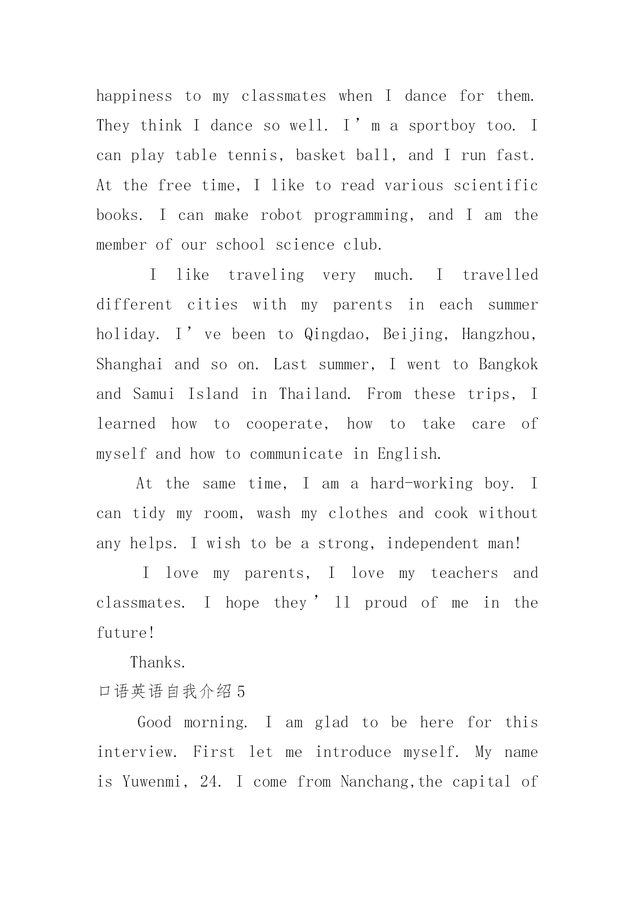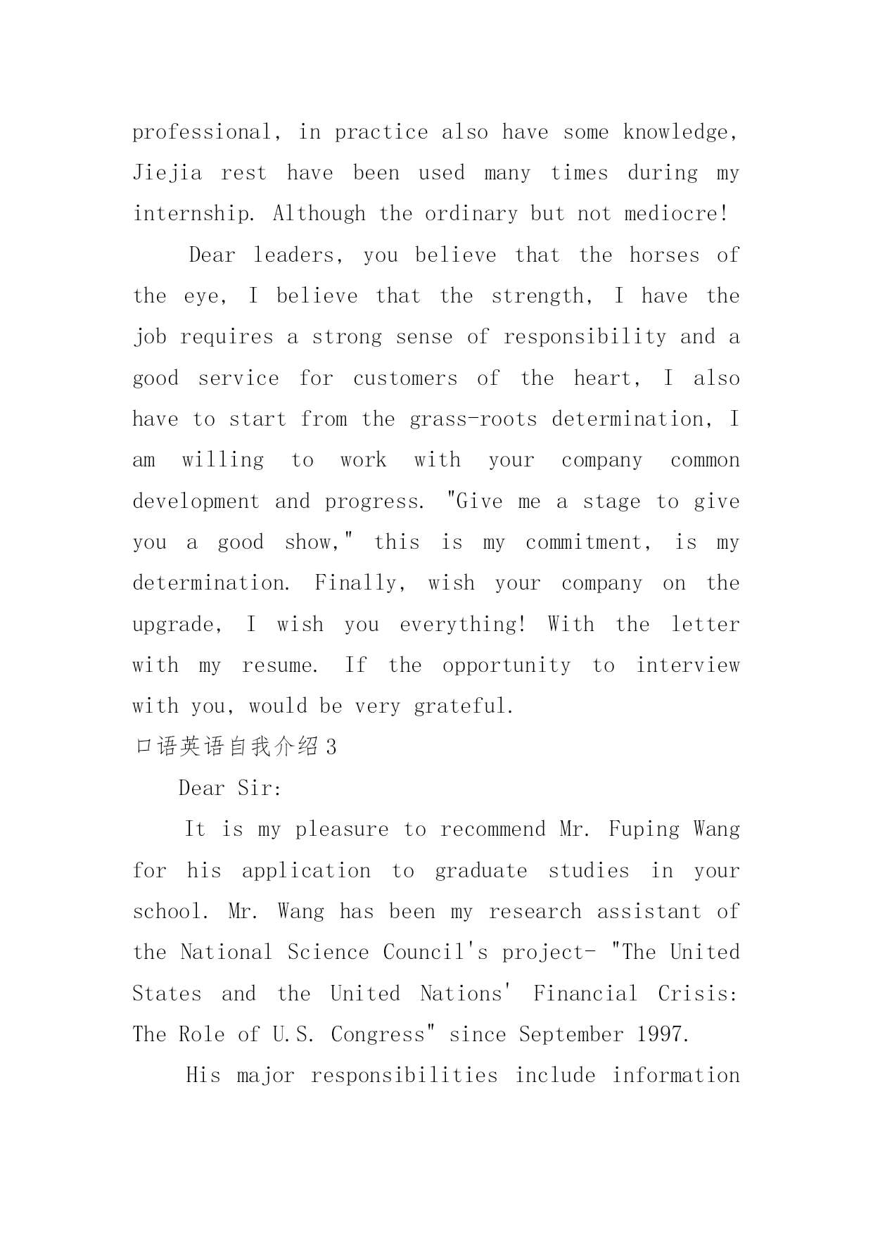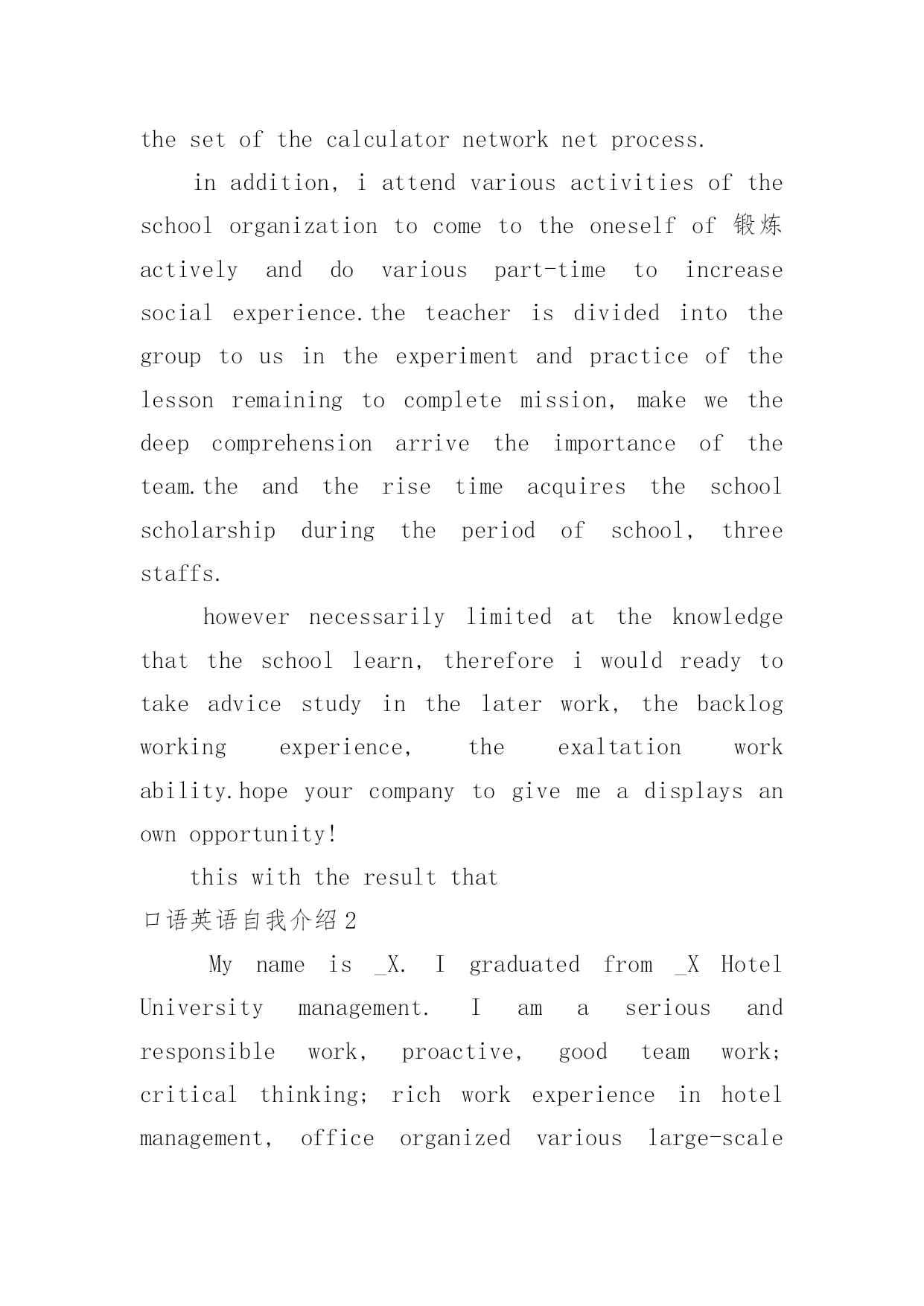 口语英语自我介绍口语英语自我介绍来到一个新的地方后,时常要进行自我介绍,自我介绍是人与人进行沟通的出发点。如何写出一个与众不同的'自我介绍?下面是小编精心整理的口语英语自我介绍,欢迎大家分享。口语英语自我介绍1comefromshandongprovince.thisyearis21yearsold,,isastudentwhowillsoongraduate.passesthefoundationknowledgethattheteachersguidancecontroledacalculatorwithpersonaleffortfirmlyintheschool.mainlystudiedclanguageatthesoftwareaspect.c#.javaetc.plaitthedistancelanguage,thedatastructure,vf.accessetc.databaseisapplied,calculatoroperatesystem.studiedthedreamweaverwebpagemanufactureandtheaspnetworktoweaveadistancealso.studiedthecalculatornetworkatthehardwareaspect,thecalculatorconstructionwithbinemanytimestoattendtopackmachine,setthefulfillmentofthenetoperationlesson,makemecontroltheworkprincipleofthecalculatorandthesetofthecalculatornetworknetprocess.inaddition,iattendvariousactivitiesoftheschoolorganizationtocometotheoneselfof锻炼activelyanddovariouspart-timetoincreasesocialexperience.theteacherisdividedintothegrouptousintheexperimentandpracticeofthelessonremainingtocompletemission,makewethedeepcomprehensionarrivetheimportanceoftheteam.theandtherisetimeacquirestheschoolscholarshipduringtheperiodofschool,threestaffs.howevernecessarilylimitedattheknowledgethattheschoollearn,thereforeiwouldreadytotakeadvicestudyinthelaterwork,thebacklogworkingexperience,theexaltationworkability.hopeyourcompanytogivemeadisplaysanownopportunity!thiswiththeresultthat口语英语自我介绍2Mynameis_X.Igraduatedfrom_XHotelUniversitymanagement.Iamaseriousandresponsiblework,proactive,goodteamwork;criticalthinking;richworkexperienceinhotelmanagement,officeorganizedvariouslarge-scalereception,delicacyFestival,banquetsalesandmanagementorganizationoflargebanquetisoneofmyworkstrengths.Comprehensivemanagementability,hasthehighstarhotelcateringfieldcoordinationability,operationabilityandinnovationability;goodtodevelophighstarhotelconstructionuntilthehotelnormaloperationexperience;familiarwiththeuseofvarioustypesofhotelmanagementsystemsoftware.Thecateringfinancialmanagementandcostcontrolhasastrongabilitytowork!Accordingt