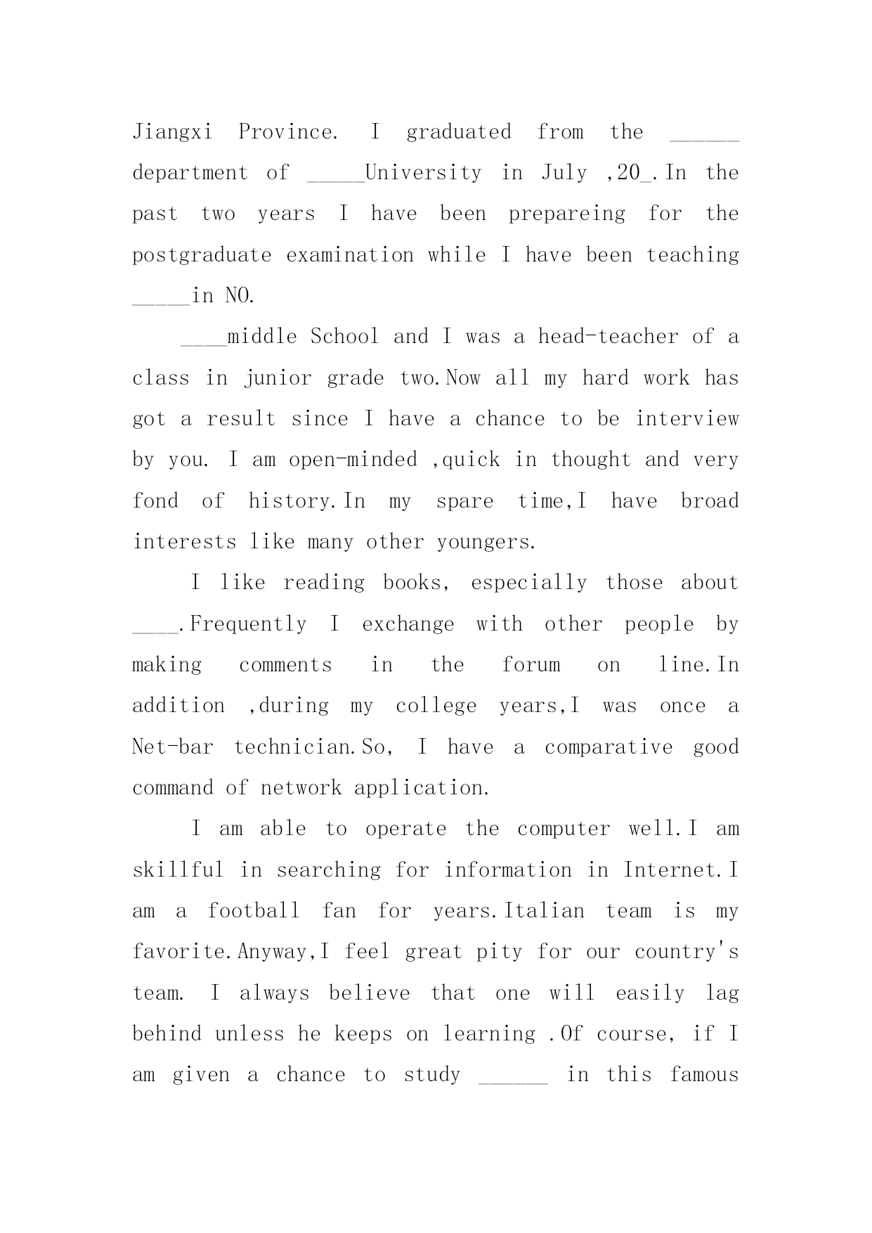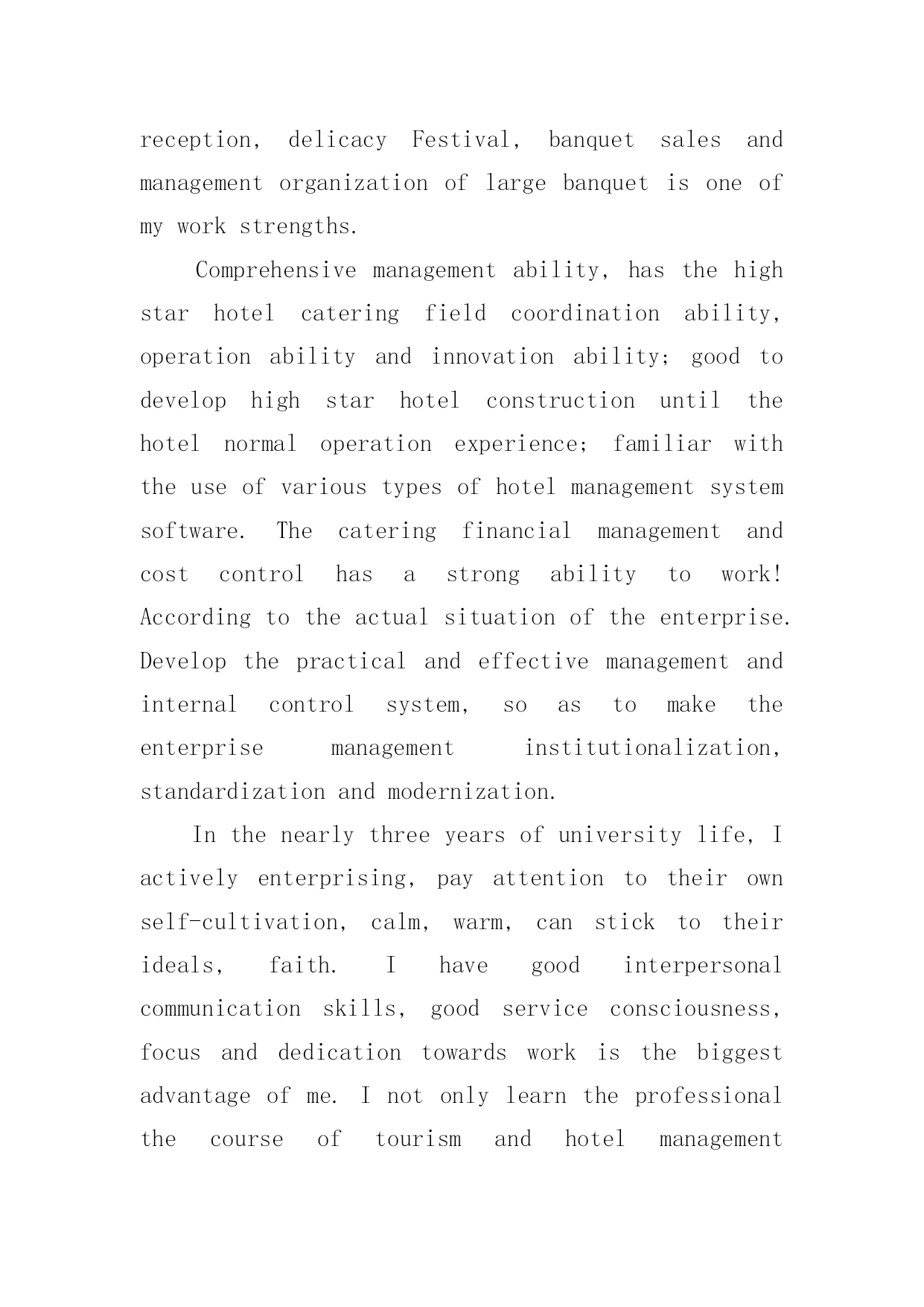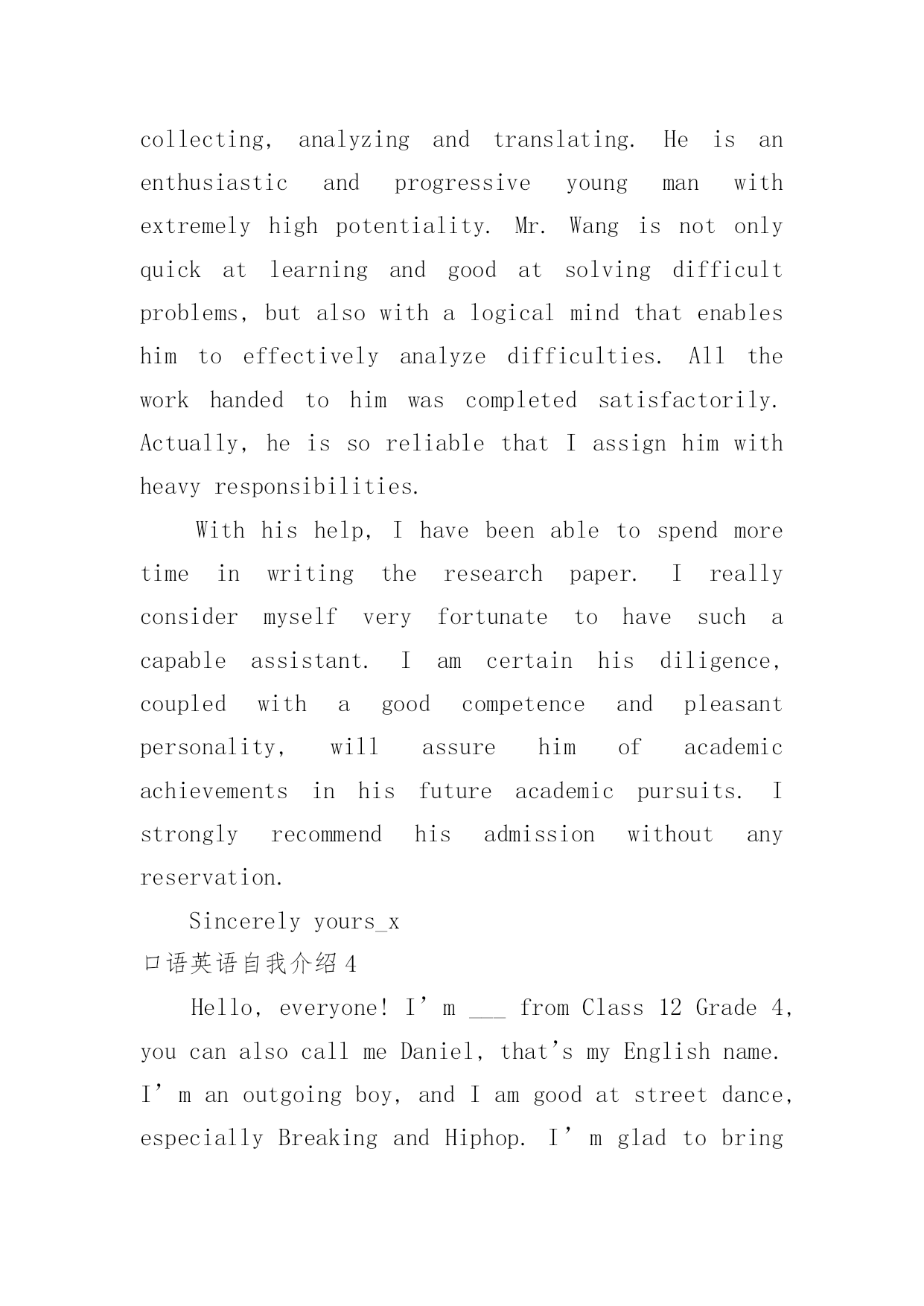 口语英语自我介绍口语英语自我介绍来到一个新的地方后,时常要进行自我介绍,自我介绍是人与人进行沟通的出发点。如何写出一个与众不同的'自我介绍?下面是小编精心整理的口语英语自我介绍,欢迎大家分享。口语英语自我介绍1comefromshandongprovince.thisyearis21yearsold,,isastudentwhowillsoongraduate.passesthefoundationknowledgethattheteachersguidancecontroledacalculatorwithpersonaleffortfirmlyintheschool.mainlystudiedclanguageatthesoftwareaspect.c#.javaetc.plaitthedistancelanguage,thedatastructure,vf.accessetc.databaseisapplied,calculatoroperatesystem.studiedthedreamweaverwebpagemanufactureandtheaspnetworktoweaveadistancealso.studiedthecalculatornetworkatthehardwareaspect,thecalculatorconstructionwithbinemanytimestoattendtopackmachine,setthefulfillmentofthenetoperationlesson,makemecontroltheworkprincipleofthecalculatorandthesetofthecalculatornetworknetprocess.inaddition,iattendvariousactivitiesoftheschoolorganizationtocometotheoneselfof锻炼activelyanddovariouspart-timetoincreasesocialexperience.theteacherisdividedintothegrouptousintheexperimentandpracticeofthelessonremainingtocompletemission,makewethedeepcomprehensionarrivetheimportanceoftheteam.theandtherisetimeacquirestheschoolscholarshipduringtheperiodofschool,threestaffs.howevernecessarilylimitedattheknowledgethattheschoollearn,thereforeiwouldreadytotakeadvicestudyinthelaterwork,thebacklogworkingexperience,theexaltationworkability.hopeyourcompanytogivemeadisplaysanownopportunity!thiswiththeresultthat口语英语自我介绍2Mynameis_X.Igraduatedfrom_XHotelUniversitymanagement.Iamaseriousandresponsiblework,proactive,goodteamwork;criticalthinking;richworkexperienceinhotelmanagement,officeorganizedvariouslarge-scalereception,delicacyFestival,banquetsalesandmanagementorganizationoflargebanquetisoneofmyworkstrengths.Comprehensivemanagementability,hasthehighstarhotelcateringfieldcoordinationability,operationabilityandinnovationability;goodtodevelophighstarhotelconstructionuntilthehotelnormaloperationexperience;familiarwiththeuseofvarioustypesofhotelmanagementsystemsoftware.Thecateringfinancialmanagementandcostcontrolhasastrongabilitytowork!Accordingt