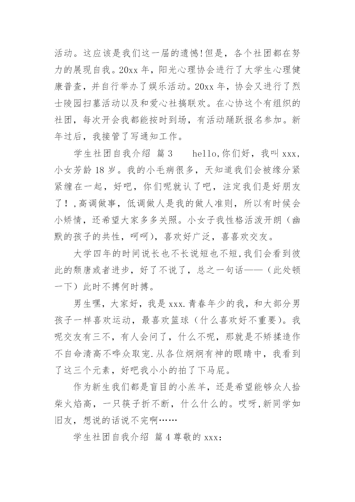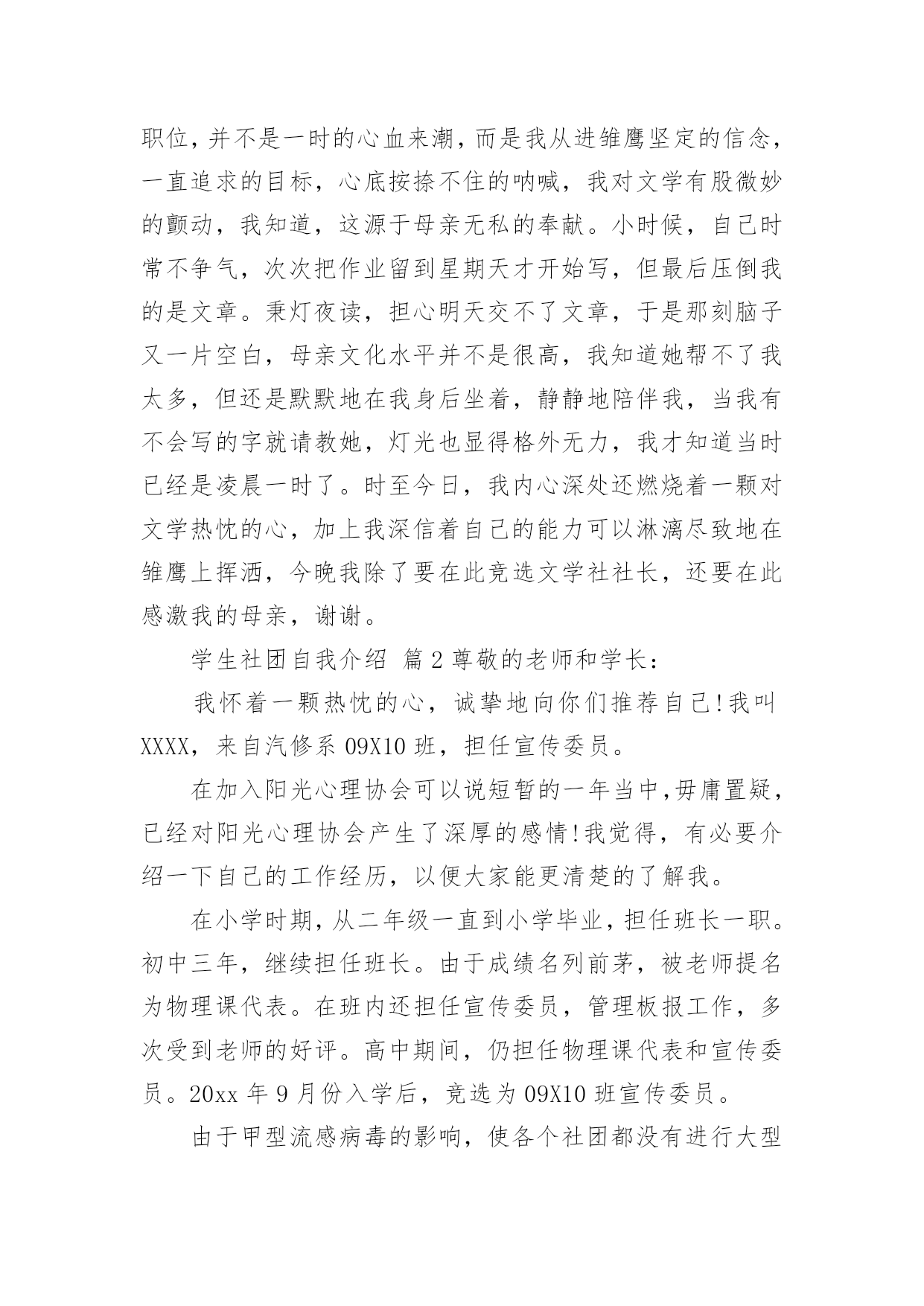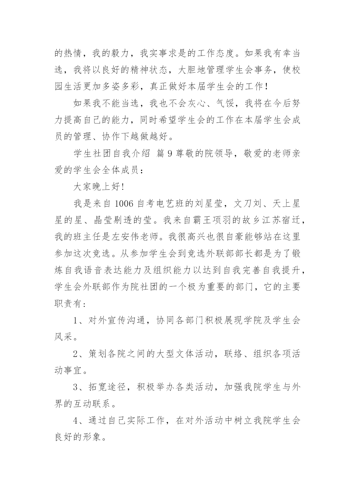 学生社团自我介绍学生社团自我介绍(精选20篇)当到达一个陌生的环境后,进行自我介绍是必不可少的,用自我介绍往往可以来展示自己。相信大家又在为写自我介绍犯愁了吧!下面是小编为大家收集的学生社团自我介绍,欢迎大家分享。学生社团自我介绍篇1尊敬的老师,亲爱的同学们:大家晚上好!我叫邝振涛,是文学社宣传部干事。一年前,我们就是在这个深秋季节进入雏鹰文学社这个大家庭,还记得第一次上台自我介绍,我紧张地连手都不能握紧了,然而一年后,我却是站在这儿大声宣读着我的目标与追求,我要竞选的职位是——第二十届雏鹰文学社社长。我怀着激昂的心情进入文学社,很快融入到大家庭里,并成为学姐学长眼里的“小雏鹰”。在过去的一年,它给我快乐,点滴的经历让我的生活更加丰富多姿,同时认识了不少的朋友;它给我信念,让我知道在未来的生活中要不断地向前迈进,不管前方的路是崎岖,还是平坦的,也要坚定走完全程;它给我责任,让我知道有些成长已经责无旁贷走到我身边了,无法去逃避任何事情;它给我感触,只因它是我灵魂深处最真实的情愫,在我心情低落,消极的时候,只有通过写作,文字与文字的接纳,才能让自己舒坦些而,是雏鹰,是它给我动力,是它让我再次感受到雏鹰情是多么强烈。我为什么要竞选文学社社长呢?对于我而言,竞选这个职位,并不是一时的心血来潮,而是我从进雏鹰坚定的信念,一直追求的目标,心底按捺不住的呐喊,我对文学有股微妙的颤动,我知道,这源于母亲无私的奉献。小时候,自己时常不争气,次次把作业留到星期天才开始写,但最后压倒我的是文章。秉灯夜读,担心明天交不了文章,于是那刻脑子又一片空白,母亲文化水平并不是很高,我知道她帮不了我太多,但还是默默地在我身后坐着,静静地陪伴我,当我有不会写的字就请教她,灯光也显得格外无力,我才知道当时已经是凌晨一时了。时至今日,我内心深处还燃烧着一颗对文学热忱的心,加上我深信着自己的能力可以淋漓尽致地在雏鹰上挥洒,今晚我除了要在此竞选文学社社长,还要在此感激我的母亲,谢谢。学生社团自我介绍篇2尊敬的老师和学长:我怀着一颗热忱的心,诚挚地向你们推荐自己!我叫XXXX,来自汽修系09X10班,担任宣传委员。在加入阳光心理协会可以说短暂的一年当中,毋庸置疑,已经对阳光心理协会产生了深厚的感情!我觉得,有必要介绍一下自己的工作经历,以便大家能更清楚的了解我。在小学时期,从二年级一直到小学毕业,担任班长一职。初中三年,继续担任班长。由于成绩名列前茅,被老师提名为物理课代表。在班内还担任宣传委员,管理板报工作,多次受到老师的好评。高中期间,仍担任物理课代表和宣传委员。20xx年9月份入学后,竞选为09X10班宣传委员。由于甲型流感病毒的影响,使各个社团都没有进行大型活动。这应该是我们这一届的遗憾!但是,各个社团都在努力的展现自我。20xx年,阳光心理协会进行了大学生心理健康普查,并自行举办了娱乐活动。20xx年,协会又进行了烈士陵园扫墓活动以及和爱心社搞联欢。在心协这个有组织的社团,每次开会我都能按时到场,有活动踊跃报名参加。新年过后,我接管了写通知工作。学生社团自我介绍篇3hello,你们好,我叫xxx,小女芳龄18岁。我的小毛病很多,天知道我们会被缘分紧紧缠在一起,好吧,你们呢就认了吧,注定我们是好朋友了!,高调做事,低调做人是我的做人准则,所以有时候会小矫情,还希望大家多多关照。小女子我性格活泼开朗(幽默的孩子的共性,呵呵),喜欢好广泛,喜喜欢交友。大学四年的时间说长也不长说短也不短,我们会看到彼此的颓唐或者进步,好了不说了,总之一句话——(此处顿一下)此时不搏何时搏。男生嘿,大家好,我是xxx.青春年少的我,和大部分男孩子一样喜欢运动,最喜欢篮球(什么喜欢好不重要)。我呢交友有三不,有人会问了,什么不呢,那就是不矫揉造作不自命清高不哗众取宠.从各位炯炯有神的眼睛中,我看到了这三个元素,好吧我小小的拍了下马屁。作为新生我们都是盲目的小羔羊,还是希望能够众人拾柴火焰高,一只筷子折不断,什么什么的。哎呀,新同学如旧友,想说的话说不完啊……学生社团自我介绍篇4尊敬的xxx:您好!我叫xxx,在法语系学习,有相当好的语言功底,和外教沟通很好,热情开朗,喜欢交朋友。我从小立志刻苦学习,将来一定要成为国家栋梁之才。我在中学学习期间不但是一名学习认真,品学兼优的好学生,而且是一个小有名气的“交友家”。此外,我的特长是英文,爱好是篮球,特别是在比赛场上更能表现我的不怕苦不怕累和团队精神。世上最怕的就是“认真”二字,xx是一个做事认真的人,总是执着地带着激情学习。自我认为可塑性强,接受新知识新环境的能力强,可以认真地说,你教我什么,我懂什么,你让我做什么,我能做好什么,这就是我的可塑性。尽管我煞费苦心把自己介绍给x,用意是不言而喻的:希望您能赏识我,接收我。学生社团自我介绍篇5在