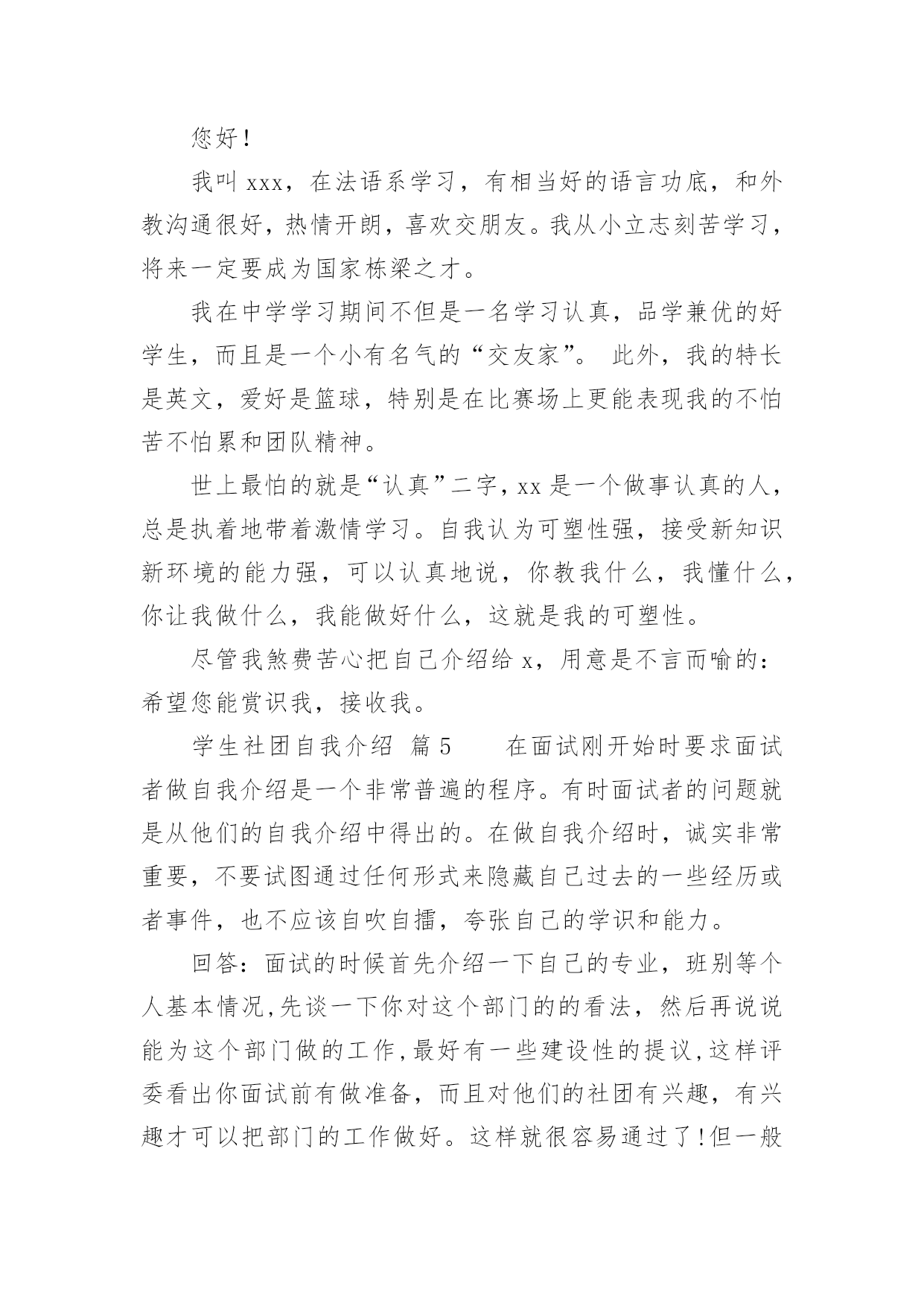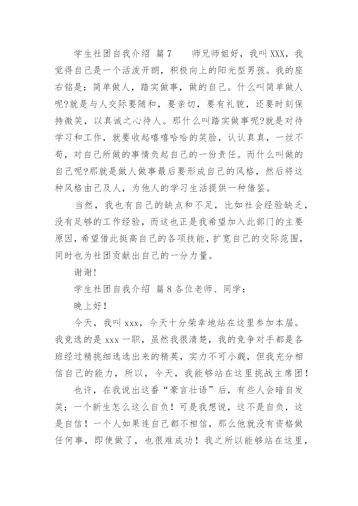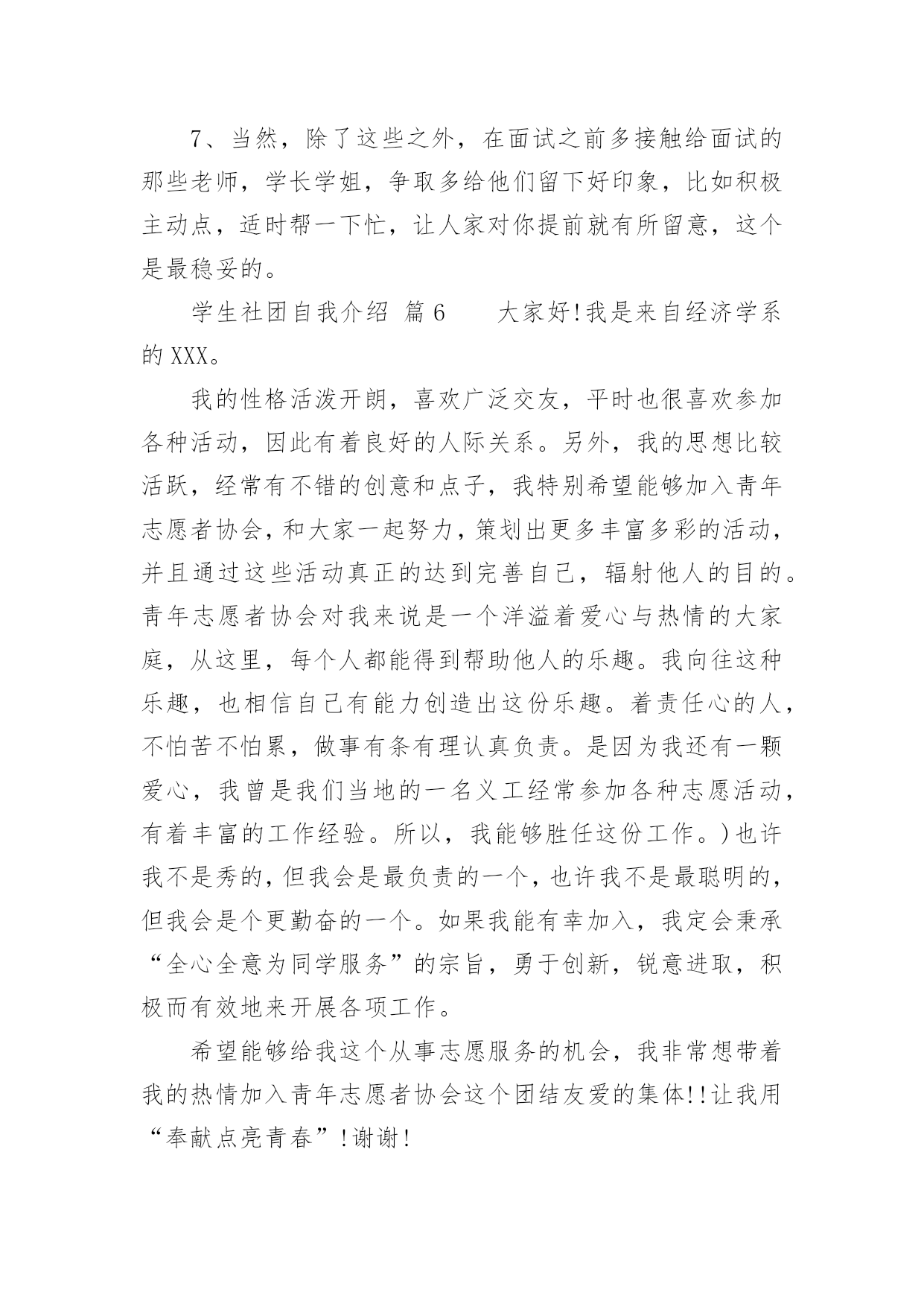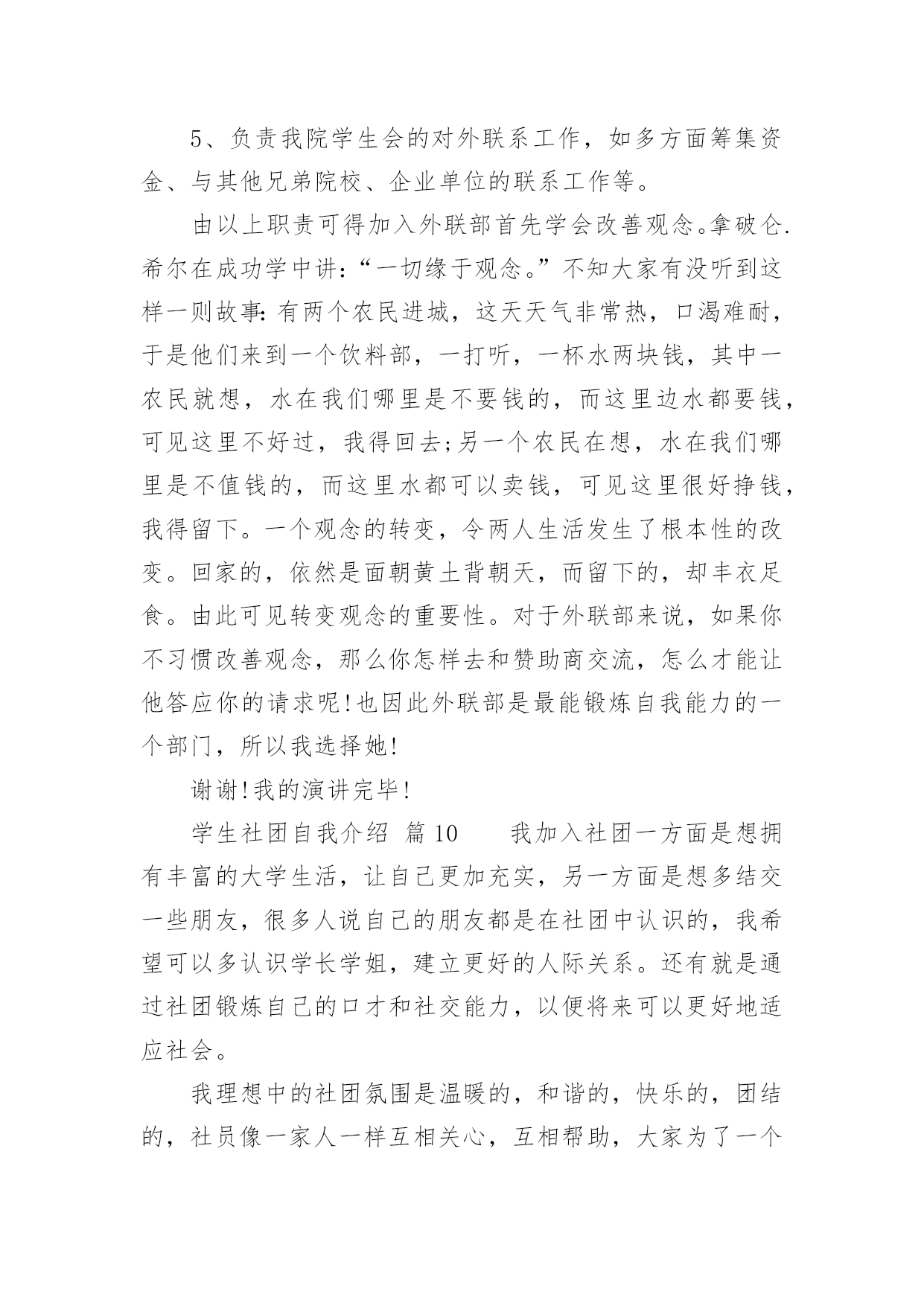 学生社团自我介绍学生社团自我介绍(精选20篇)当到达一个陌生的环境后,进行自我介绍是必不可少的,用自我介绍往往可以来展示自己。相信大家又在为写自我介绍犯愁了吧!下面是小编为大家收集的学生社团自我介绍,欢迎大家分享。学生社团自我介绍篇1尊敬的老师,亲爱的同学们:大家晚上好!我叫邝振涛,是文学社宣传部干事。一年前,我们就是在这个深秋季节进入雏鹰文学社这个大家庭,还记得第一次上台自我介绍,我紧张地连手都不能握紧了,然而一年后,我却是站在这儿大声宣读着我的目标与追求,我要竞选的职位是——第二十届雏鹰文学社社长。我怀着激昂的心情进入文学社,很快融入到大家庭里,并成为学姐学长眼里的“小雏鹰”。在过去的一年,它给我快乐,点滴的经历让我的生活更加丰富多姿,同时认识了不少的朋友;它给我信念,让我知道在未来的生活中要不断地向前迈进,不管前方的路是崎岖,还是平坦的,也要坚定走完全程;它给我责任,让我知道有些成长已经责无旁贷走到我身边了,无法去逃避任何事情;它给我感触,只因它是我灵魂深处最真实的情愫,在我心情低落,消极的时候,只有通过写作,文字与文字的接纳,才能让自己舒坦些而,是雏鹰,是它给我动力,是它让我再次感受到雏鹰情是多么强烈。我为什么要竞选文学社社长呢?对于我而言,竞选这个职位,并不是一时的心血来潮,而是我从进雏鹰坚定的信念,一直追求的目标,心底按捺不住的呐喊,我对文学有股微妙的颤动,我知道,这源于母亲无私的奉献。小时候,自己时常不争气,次次把作业留到星期天才开始写,但最后压倒我的是文章。秉灯夜读,担心明天交不了文章,于是那刻脑子又一片空白,母亲文化水平并不是很高,我知道她帮不了我太多,但还是默默地在我身后坐着,静静地陪伴我,当我有不会写的字就请教她,灯光也显得格外无力,我才知道当时已经是凌晨一时了。时至今日,我内心深处还燃烧着一颗对文学热忱的心,加上我深信着自己的能力可以淋漓尽致地在雏鹰上挥洒,今晚我除了要在此竞选文学社社长,还要在此感激我的母亲,谢谢。学生社团自我介绍篇2尊敬的老师和学长:我怀着一颗热忱的心,诚挚地向你们推荐自己!我叫XXXX,来自汽修系09X10班,担任宣传委员。在加入阳光心理协会可以说短暂的一年当中,毋庸置疑,已经对阳光心理协会产生了深厚的感情!我觉得,有必要介绍一下自己的工作经历,以便大家能更清楚的了解我。在小学时期,从二年级一直到小学毕业,担任班长一职。初中三年,继续担任班长。由于成绩名列前茅,被老师提名为物理课代表。在班内还担任宣传委员,管理板报工作,多次受到老师的好评。高中期间,仍担任物理课代表和宣传委员。20xx年9月份入学后,竞选为09X10班宣传委员。由于甲型流感病毒的影响,使各个社团都没有进行大型活动。这应该是我们这一届的遗憾!但是,各个社团都在努力的展现自我。20xx年,阳光心理协会进行了大学生心理健康普查,并自行举办了娱乐活动。20xx年,协会又进行了烈士陵园扫墓活动以及和爱心社搞联欢。在心协这个有组织的社团,每次开会我都能按时到场,有活动踊跃报名参加。新年过后,我接管了写通知工作。学生社团自我介绍篇3hello,你们好,我叫xxx,小女芳龄18岁。我的小毛病很多,天知道我们会被缘分紧紧缠在一起,好吧,你们呢就认了吧,注定我们是好朋友了!,高调做事,低调做人是我的做人准则,所以有时候会小矫情,还希望大家多多关照。小女子我性格活泼开朗(幽默的孩子的共性,呵呵),喜欢好广泛,喜喜欢交友。大学四年的时间说长也不长说短也不短,我们会看到彼此的颓唐或者进步,好了不说了,总之一句话——(此处顿一下)此时不搏何时搏。男生嘿,大家好,我是xxx.青春年少的我,和大部分男孩子一样喜欢运动,最喜欢篮球(什么喜欢好不重要)。我呢交友有三不,有人会问了,什么不呢,那就是不矫揉造作不自命清高不哗众取宠.从各位炯炯有神的眼睛中,我看到了这三个元素,好吧我小小的拍了下马屁。作为新生我们都是盲目的小羔羊,还是希望能够众人拾柴火焰高,一只筷子折不断,什么什么的。哎呀,新同学如旧友,想说的话说不完啊……学生社团自我介绍篇4尊敬的xxx:您好!我叫xxx,在法语系学习,有相当好的语言功底,和外教沟通很好,热情开朗,喜欢交朋友。我从小立志刻苦学习,将来一定要成为国家栋梁之才。我在中学学习期间不但是一名学习认真,品学兼优的好学生,而且是一个小有名气的“交友家”。此外,我的特长是英文,爱好是篮球,特别是在比赛场上更能表现我的不怕苦不怕累和团队精神。世上最怕的就是“认真”二字,xx是一个做事认真的人,总是执着地带着激情学习。自我认为可塑性强,接受新知识新环境的能力强,可以认真地说,你教我什么,我懂什么,你让我做什么,我能做好什么,这就是我的可塑性。尽管我煞费苦心把自己介绍给x,用意是不言而喻的:希望您能赏识我,接收我。学生社团自我介绍篇5在