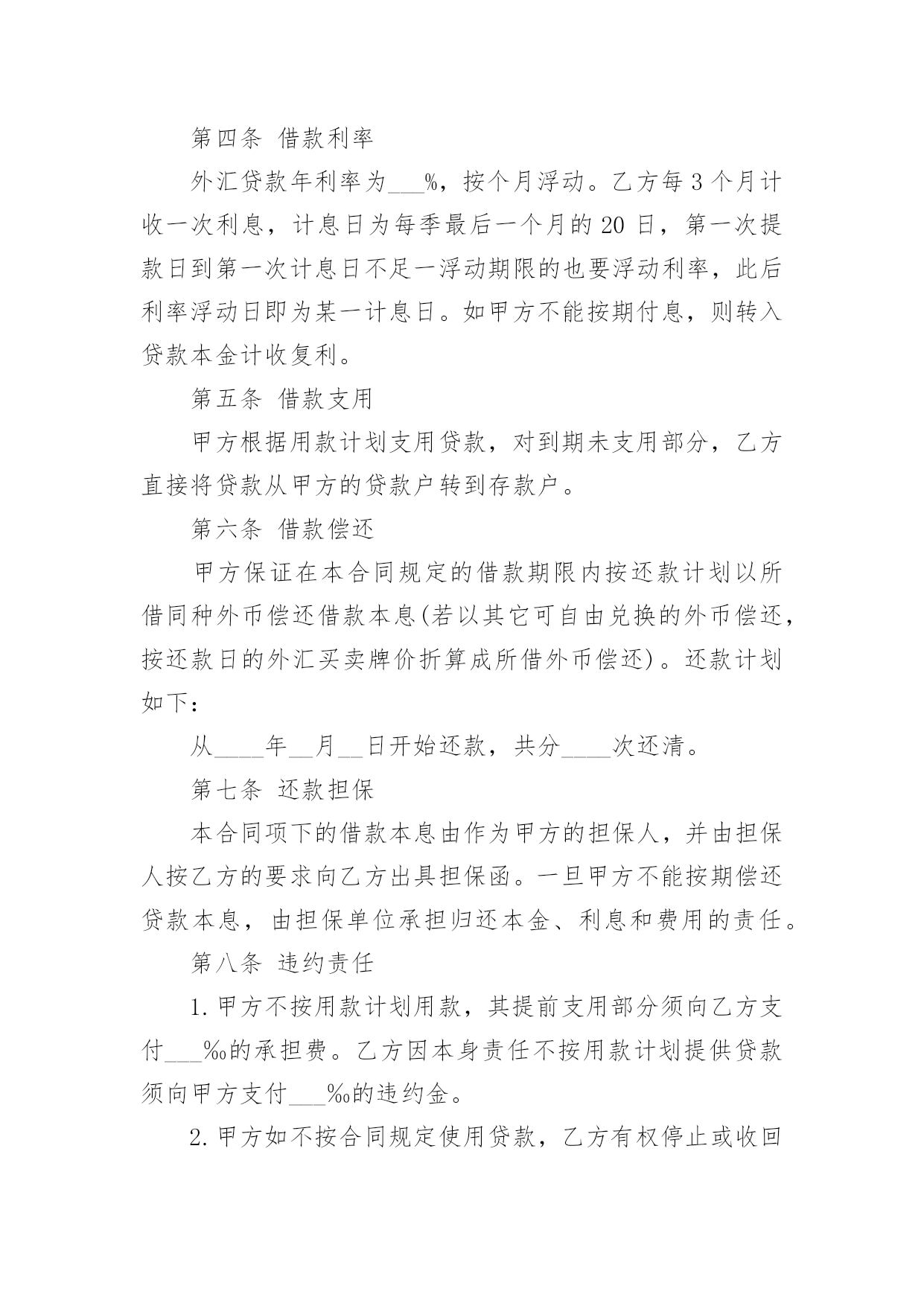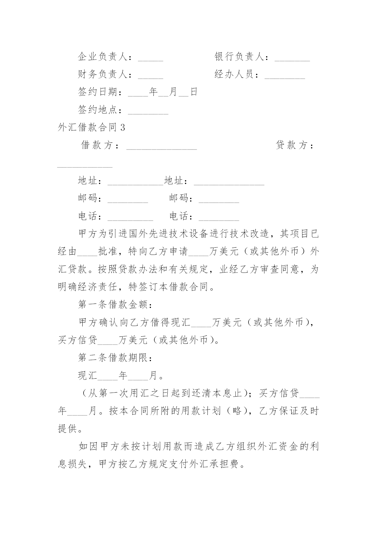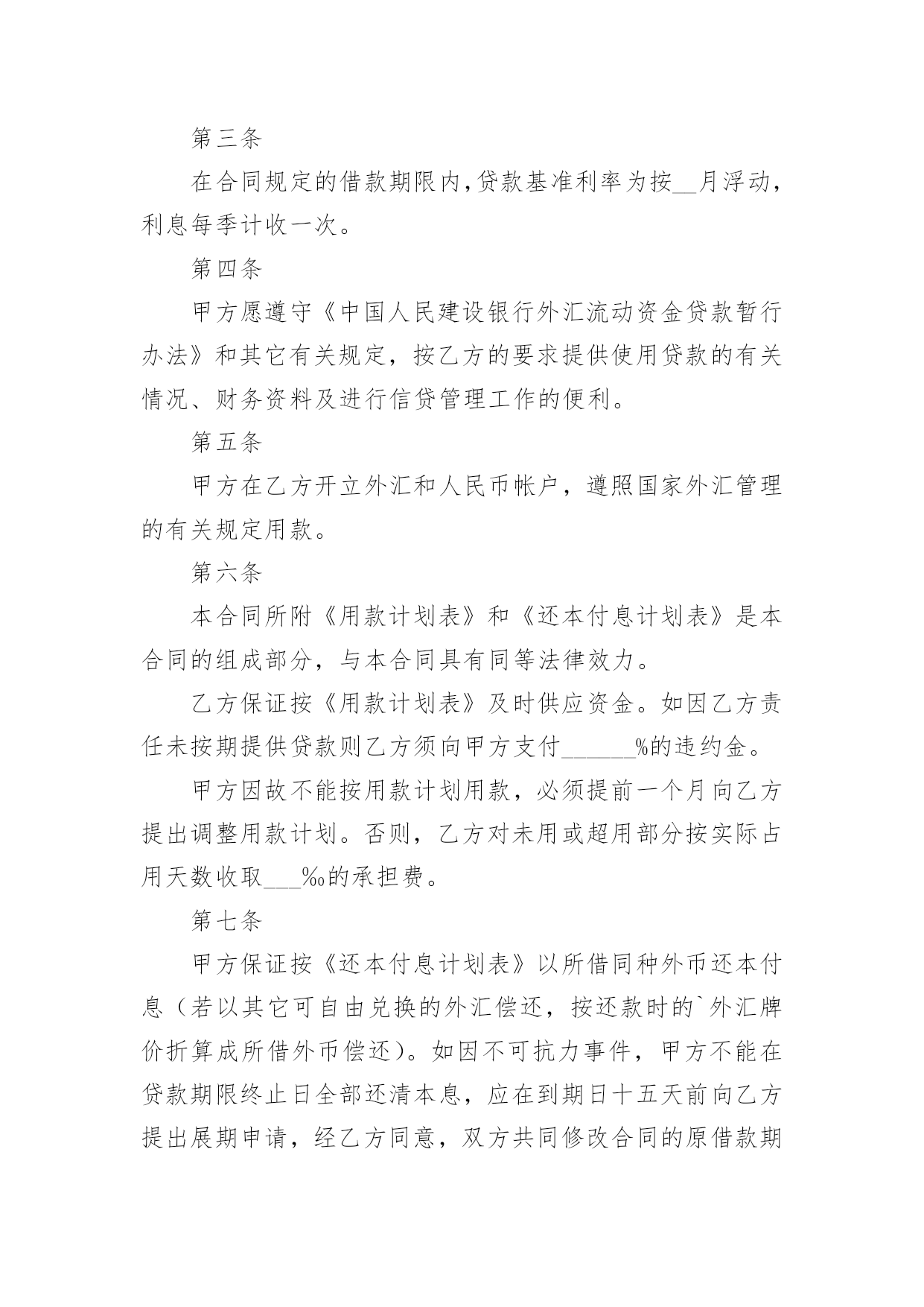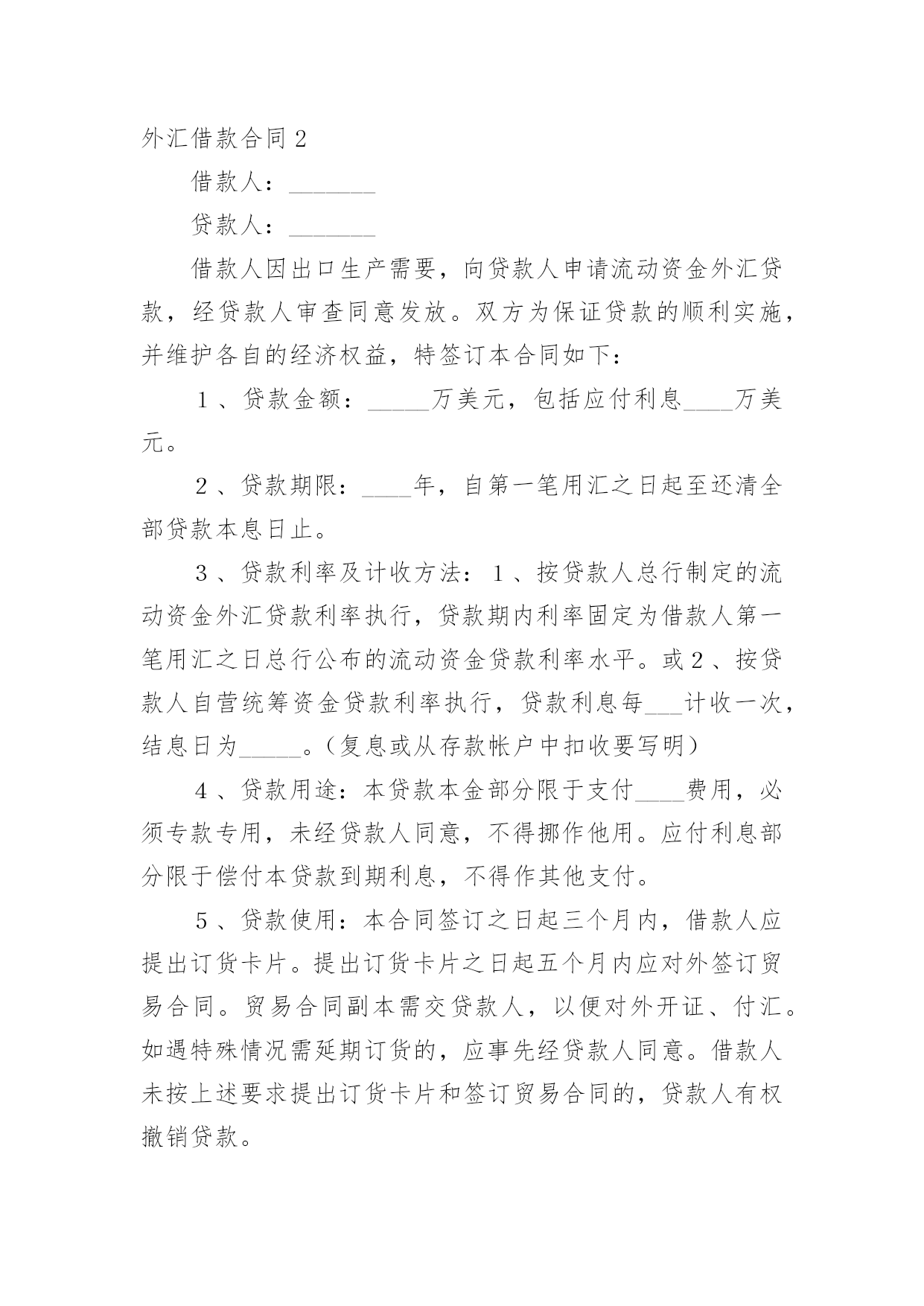 外汇借款合同外汇借款合同【荐】随着时间的推移,合同出现的次数越来越多,签订合同是减少和防止发生争议的重要措施。那么大家知道正规的合同书怎么写吗?以下是小编精心整理的外汇借款合同,欢迎阅读与收藏。外汇借款合同1编号:_______借款单位:____(以下简称甲方)贷款银行:______(以下简称乙方)甲方用于__________________,所需外汇资金,于____年__月__日向乙方申请外汇贷款。乙方根据甲方填报的《外汇借款申请书》(编号:_____)和其它有关资料,经审查同意向甲方发放外汇流动资金贷款。为明确责任,恪守信用,特签订本合同并共同遵守。第一条甲方向乙方借(外币名称)_____万元(大写金额:______)。第二条借款期限自第一笔用汇日起到还清全部本息日止,即从______年__月__日至______年__月__日,共__月。第三条在合同规定的借款期限内,贷款基准利率为按__月浮动,利息每季计收一次。第四条甲方愿遵守《中国人民建设银行外汇流动资金贷款暂行办法》和其它有关规定,按乙方的要求提供使用贷款的有关情况、财务资料及进行信贷管理工作的便利。第五条甲方在乙方开立外汇和人民币帐户,遵照国家外汇管理的有关规定用款。第六条本合同所附《用款计划表》和《还本付息计划表》是本合同的组成部分,与本合同具有同等法律效力。乙方保证按《用款计划表》及时供应资金。如因乙方责任未按期提供贷款则乙方须向甲方支付______%的违约金。甲方因故不能按用款计划用款,必须提前一个月向乙方提出调整用款计划。否则,乙方对未用或超用部分按实际占用天数收取___‰的承担费。第七条甲方保证按《还本付息计划表》以所借同种外币还本付息(若以其它可自由兑换的外汇偿还,按还款时的`外汇牌价折算成所借外币偿还)。如因不可抗力事件,甲方不能在贷款期限终止日全部还清本息,应在到期日十五天前向乙方提出展期申请,经乙方同意,双方共同修改合同的原借款期限,并重新确定相应的贷款利率。未经乙方同意展期的贷款,乙方对逾期部分加收__%的逾期利息。第八条甲方保证本合同规定的用途使用贷款,如发生挪用,乙方除限期纠正外,对被挪用部分加收__%的罚息,并有权停止或收回全部或部分贷款。第九条本合同项下的借款本息由作为甲方的担保人,并由担保人按乙方的要求向乙方出具担保书。一旦甲方无力清偿贷款本息,应由担保人履行还贷款本息的责任。第十条本合同以外的其它事项,由甲、乙方双方共同按照《中华人民共和国经济合同法》和国务院《借款合同条例》的有关规定办理。第十一条本合同经甲、乙双方签章生效,至全部贷款本息收回后失效。本合同正本一式二份,甲、乙双方各执一份。甲方:______乙方:______单位名称:____(公章)单位名称:____(公章)签约人:_____(签章)签约人:_____(签章)____年__月__日签订于:______外汇借款合同2借款人:_______贷款人:_______借款人因出口生产需要,向贷款人申请流动资金外汇贷款,经贷款人审查同意发放。双方为保证贷款的顺利实施,并维护各自的经济权益,特签订本合同如下:1、贷款金额:_____万美元,包括应付利息____万美元。2、贷款期限:____年,自第一笔用汇之日起至还清全部贷款本息日止。3、贷款利率及计收方法:1、按贷款人总行制定的流动资金外汇贷款利率执行,贷款期内利率固定为借款人第一笔用汇之日总行公布的流动资金贷款利率水平。或2、按贷款人自营统筹资金贷款利率执行,贷款利息每___计收一次,结息日为_____。(复息或从存款帐户中扣收要写明)4、贷款用途:本贷款本金部分限于支付____费用,必须专款专用,未经贷款人同意,不得挪作他用。应付利息部分限于偿付本贷款到期利息,不得作其他支付。5、贷款使用:本合同签订之日起三个月内,借款人应提出订货卡片。提出订货卡片之日起五个月内应对外签订贸易合同。贸易合同副本需交贷款人,以便对外开证、付汇。如遇特殊情况需延期订货的,应事先经贷款人同意。借款人未按上述要求提出订货卡片和签订贸易合同的,贷款人有权撤销贷款。6、用款计划:根据支付进度,本项贷款提款计划为:__月____万美元;__月____万美元;__月____万美元。贷款人允许借款人按实际情况调整用款计划。提款期到期,未提用贷款,如借贷双方无其他约定,借款人不得再继续支用贷款。7、贷款偿还:借款人以新增出口创汇和人民币销售收入或其他资金归还贷款,借款人保证在本合同规定的贷款期限内按下列计划偿还贷款:__月____万美元;__月____万美元。如贷款项目提前实际经济效益,借款人应提前偿还贷款。如月度还款计划不能实现,借款人应事先提出调整还款计划,并经贷款人同意,否则贷款人将按贷款违约处理;如借款人不能按期还款,最迟在贷款到期前十五天应向贷款