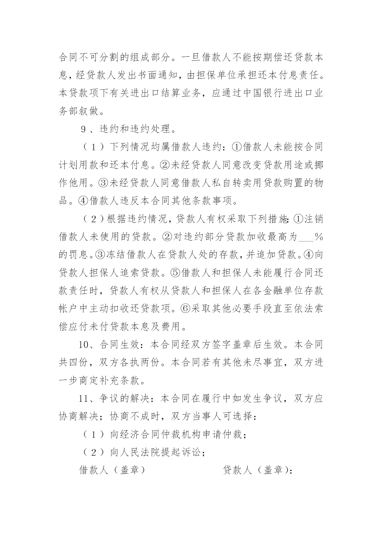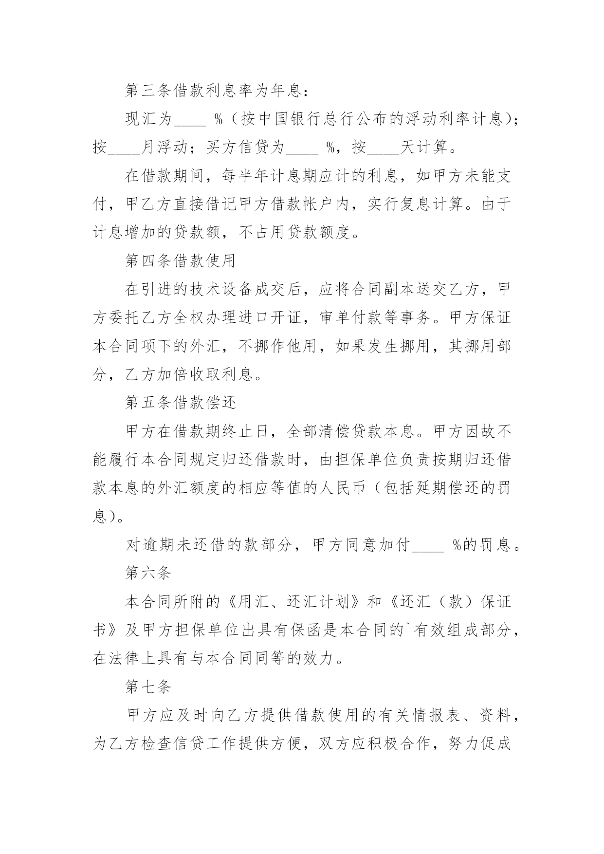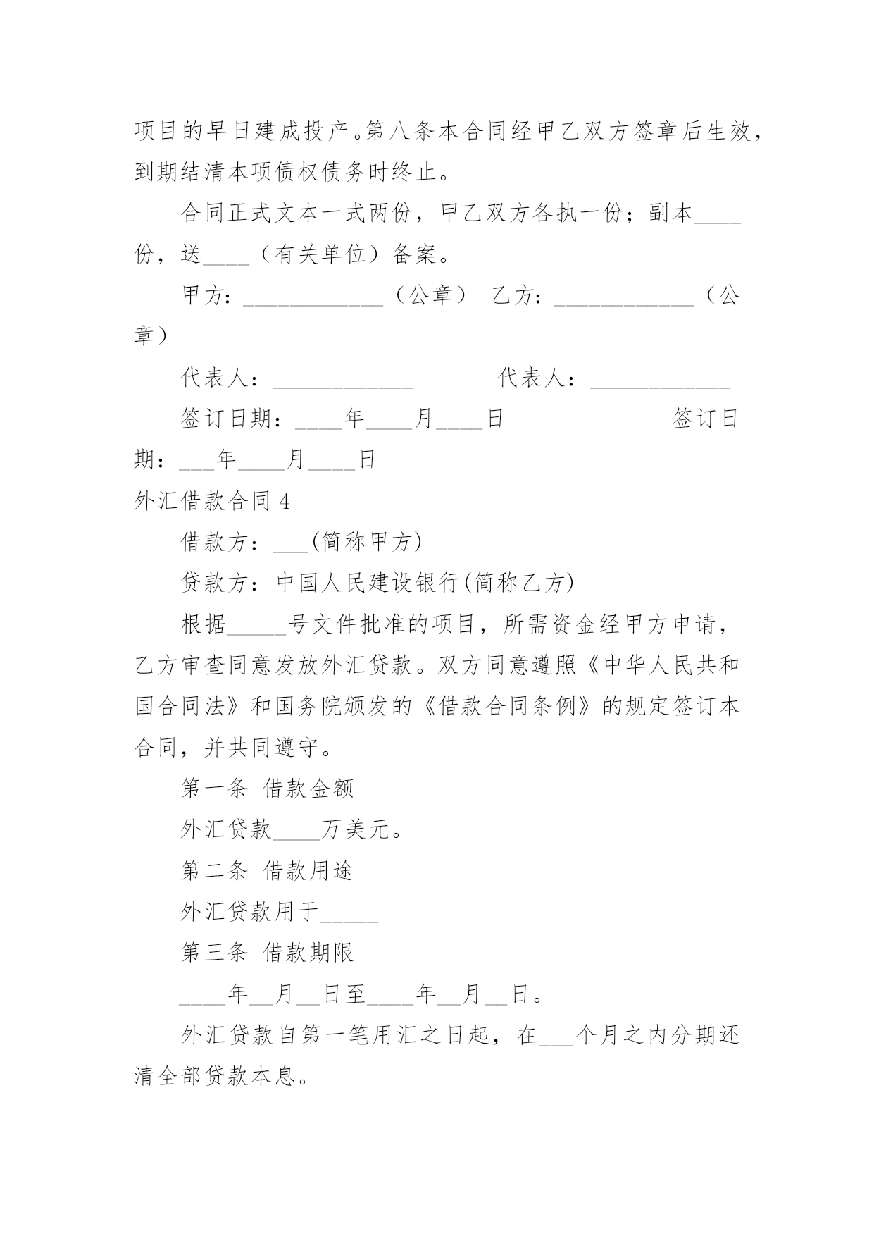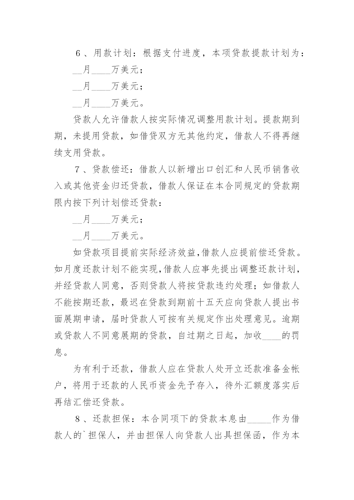 外汇借款合同外汇借款合同【荐】随着时间的推移,合同出现的次数越来越多,签订合同是减少和防止发生争议的重要措施。那么大家知道正规的合同书怎么写吗?以下是小编精心整理的外汇借款合同,欢迎阅读与收藏。外汇借款合同1编号:_______借款单位:____(以下简称甲方)贷款银行:______(以下简称乙方)甲方用于__________________,所需外汇资金,于____年__月__日向乙方申请外汇贷款。乙方根据甲方填报的《外汇借款申请书》(编号:_____)和其它有关资料,经审查同意向甲方发放外汇流动资金贷款。为明确责任,恪守信用,特签订本合同并共同遵守。第一条甲方向乙方借(外币名称)_____万元(大写金额:______)。第二条借款期限自第一笔用汇日起到还清全部本息日止,即从______年__月__日至______年__月__日,共__月。第三条在合同规定的借款期限内,贷款基准利率为按__月浮动,利息每季计收一次。第四条甲方愿遵守《中国人民建设银行外汇流动资金贷款暂行办法》和其它有关规定,按乙方的要求提供使用贷款的有关情况、财务资料及进行信贷管理工作的便利。第五条甲方在乙方开立外汇和人民币帐户,遵照国家外汇管理的有关规定用款。第六条本合同所附《用款计划表》和《还本付息计划表》是本合同的组成部分,与本合同具有同等法律效力。乙方保证按《用款计划表》及时供应资金。如因乙方责任未按期提供贷款则乙方须向甲方支付______%的违约金。甲方因故不能按用款计划用款,必须提前一个月向乙方提出调整用款计划。否则,乙方对未用或超用部分按实际占用天数收取___‰的承担费。第七条甲方保证按《还本付息计划表》以所借同种外币还本付息(若以其它可自由兑换的外汇偿还,按还款时的`外汇牌价折算成所借外币偿还)。如因不可抗力事件,甲方不能在贷款期限终止日全部还清本息,应在到期日十五天前向乙方提出展期申请,经乙方同意,双方共同修改合同的原借款期限,并重新确定相应的贷款利率。未经乙方同意展期的贷款,乙方对逾期部分加收__%的逾期利息。第八条甲方保证本合同规定的用途使用贷款,如发生挪用,乙方除限期纠正外,对被挪用部分加收__%的罚息,并有权停止或收回全部或部分贷款。第九条本合同项下的借款本息由作为甲方的担保人,并由担保人按乙方的要求向乙方出具担保书。一旦甲方无力清偿贷款本息,应由担保人履行还贷款本息的责任。第十条本合同以外的其它事项,由甲、乙方双方共同按照《中华人民共和国经济合同法》和国务院《借款合同条例》的有关规定办理。第十一条本合同经甲、乙双方签章生效,至全部贷款本息收回后失效。本合同正本一式二份,甲、乙双方各执一份。甲方:______乙方:______单位名称:____(公章)单位名称:____(公章)签约人:_____(签章)签约人:_____(签章)____年__月__日签订于:______外汇借款合同2借款人:_______贷款人:_______借款人因出口生产需要,向贷款人申请流动资金外汇贷款,经贷款人审查同意发放。双方为保证贷款的顺利实施,并维护各自的经济权益,特签订本合同如下:1、贷款金额:_____万美元,包括应付利息____万美元。2、贷款期限:____年,自第一笔用汇之日起至还清全部贷款本息日止。3、贷款利率及计收方法:1、按贷款人总行制定的流动资金外汇贷款利率执行,贷款期内利率固定为借款人第一笔用汇之日总行公布的流动资金贷款利率水平。或2、按贷款人自营统筹资金贷款利率执行,贷款利息每___计收一次,结息日为_____。(复息或从存款帐户中扣收要写明)4、贷款用途:本贷款本金部分限于支付____费用,必须专款专用,未经贷款人同意,不得挪作他用。应付利息部分限于偿付本贷款到期利息,不得作其他支付。5、贷款使用:本合同签订之日起三个月内,借款人应提出订货卡片。提出订货卡片之日起五个月内应对外签订贸易合同。贸易合同副本需交贷款人,以便对外开证、付汇。如遇特殊情况需延期订货的,应事先经贷款人同意。借款人未按上述要求提出订货卡片和签订贸易合同的,贷款人有权撤销贷款。6、用款计划:根据支付进度,本项贷款提款计划为:__月____万美元;__月____万美元;__月____万美元。贷款人允许借款人按实际情况调整用款计划。提款期到期,未提用贷款,如借贷双方无其他约定,借款人不得再继续支用贷款。7、贷款偿还:借款人以新增出口创汇和人民币销售收入或其他资金归还贷款,借款人保证在本合同规定的贷款期限内按下列计划偿还贷款:__月____万美元;__月____万美元。如贷款项目提前实际经济效益,借款人应提前偿还贷款。如月度还款计划不能实现,借款人应事先提出调整还款计划,并经贷款人同意,否则贷款人将按贷款违约处理;如借款人不能按期还款,最迟在贷款到期前十五天应向贷款
