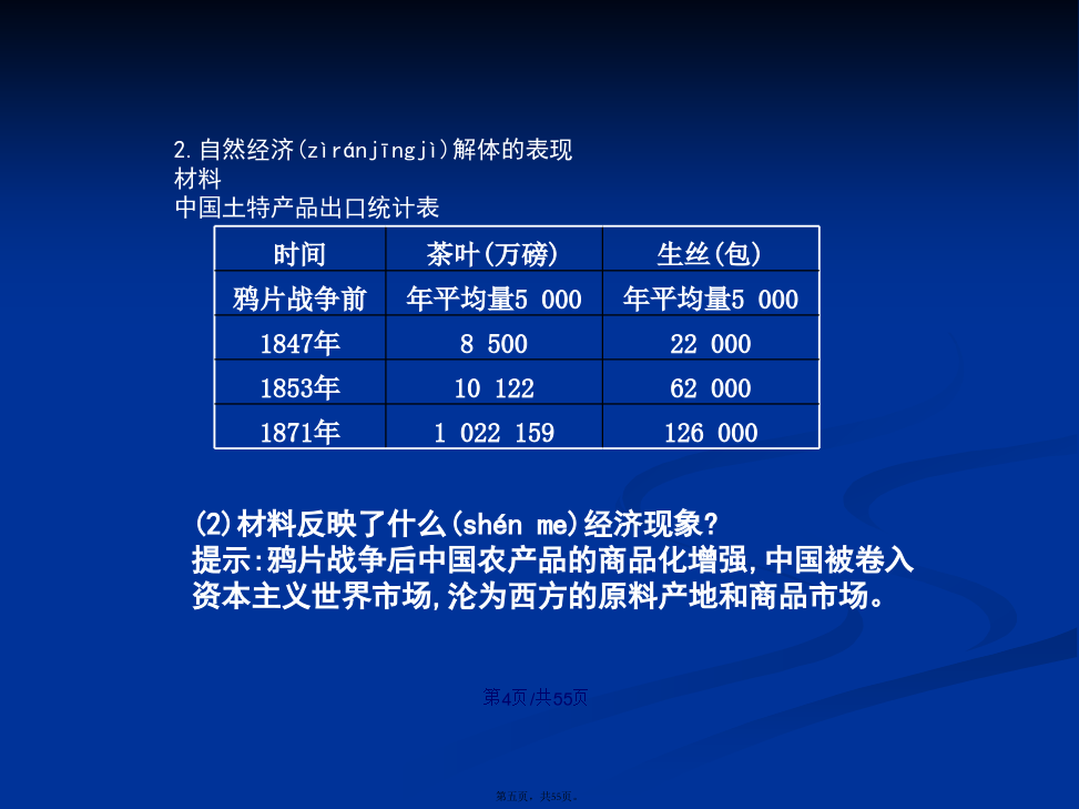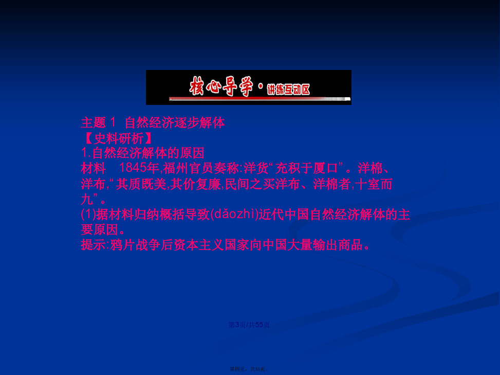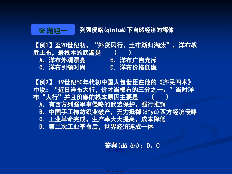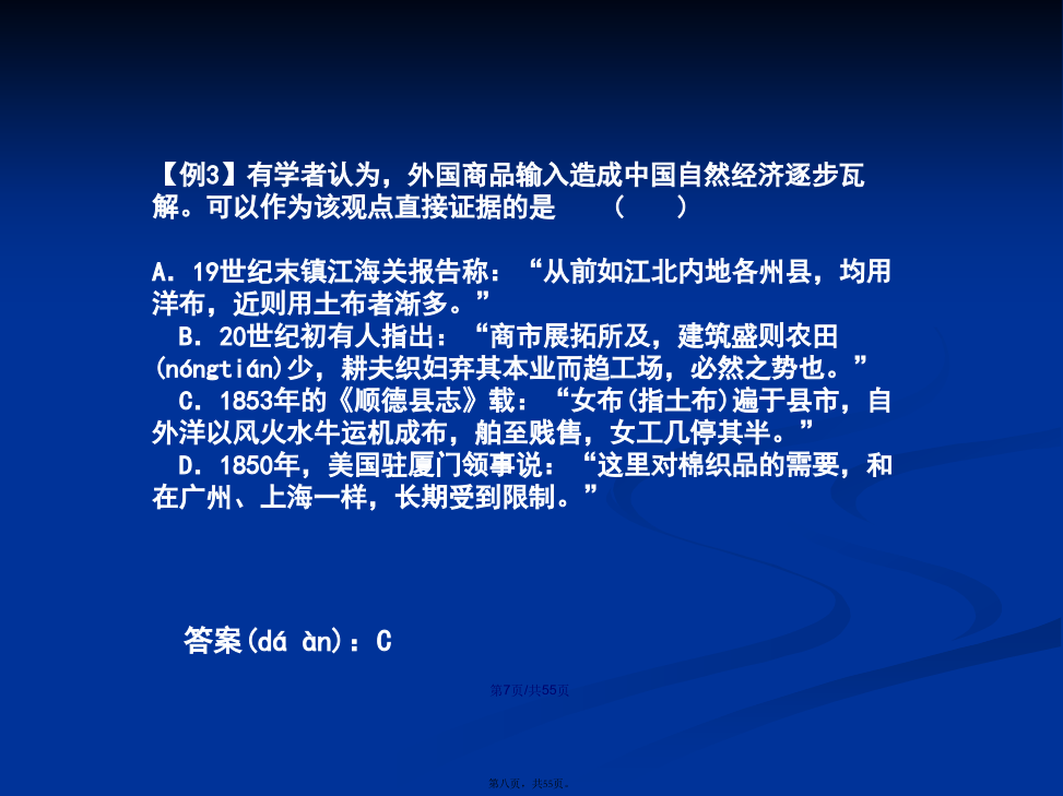 会计学考点一鸦片战争前后经济结构(jiégòu)的变动鸦片战争(YāpiànZhànzhēng)前主题1自然经济逐步解体【史料研析】1.自然经济解体的原因材料1845年,福州官员奏称:洋货“充积于厦口”。洋棉、洋布,“其质既美,其价复廉,民间之买洋布、洋棉者,十室而九”。(1)据材料归纳概括导致(dǎozhì)近代中国自然经济解体的主要原因。提示:鸦片战争后资本主义国家向中国大量输出商品。2.自然经济(zìránjīngjì)解体的表现材料中国土特产品出口统计表为资本主义的发展提供了劳动力市场和商品市场,促进(cùjìn)了近代民族工业的兴起。※题组一【例3】有学者认为,外国商品输入造成中国自然经济逐步瓦解。可以作为该观点直接证据的是()A.19世纪末镇江海关报告称:“从前如江北内地各州县,均用洋布,近则用土布者渐多。”B.20世纪初有人指出:“商市展拓所及,建筑盛则农田(nóngtián)少,耕夫织妇弃其本业而趋工场,必然之势也。”C.1853年的《顺德县志》载:“女布(指土布)遍于县市,自外洋以风火水牛运机成布,舶至贱售,女工几停其半。”D.1850年,美国驻厦门领事说:“这里对棉织品的需要,和在广州、上海一样,长期受到限制。”【例4】据统计,19世纪40年代下半期,广州对外贸易的绝对值出现下降的趋势,对英国的贸易总额由3100万元下降到1600万元,来广州的美国(měiɡuó)商船由93艘下降到70艘。上述现象出现的主要原因是()A.广东人民抵制洋货B.《南京条约》开放五口通商C.鸦片战争后中外贸易缩减D.清政府限制广州对外贸易【例5】以下是中国土特产品出口统计表。对表中信息(xìnxī)的正确评述是()【例6】19世纪60年代后中国农副产品出口(chūkǒu)不断增长,它所产生的社会影响不包括()A.扭转了中国外贸入超的局面B.为民族资本主义产生创造条件C.促使自然经济进一步解体D.有利于农业生产的商品化鸦片战争后,我国东南沿海农业出现了许多新的变化,主要“新”在()A.增加了许多农业新品种B.农产品商品化的程度(chéngdù)提高C.出现了近代化的农业D.生产方式出现了质的飞跃考点二中国(zhōnɡɡuó)民族资本主义曲折发展A、封建自然经济;B、洋务(yángwù)经济;C、外国资本主义经济;D、民族资本主义经济;E、官僚资本主义经济;①上海:方举赞—发昌机器(jīqì)厂;②广东:陈启源—继昌隆缫丝厂;③天津:朱其昂—贻来牟机器(jīqì)磨坊;主题2近代(jìndài)中国民族工业的兴起和初步发展【史料研析】1.民族工业的产生材料1872年,侨商陈启源在广东南海创建了中国第一家机器缫丝厂——继昌隆缫丝厂。“出丝精美,行销于欧美两洲,价值之高,倍于从前,遂获厚利”,“三四年间,南(海)、顺(德)两邑相继起者多至百数十家”。2.民族工业(gōngyè)的特点材料影响(yǐngxiǎng)【例7】张之洞说:“臣愚以为华民所需外洋之物,瞄应悉行仿造,虽不尽断来源,亦可渐开风气。”这表明他主张()A.仿效西方政治制度B.兴办近代军事工业C.创办近代民用工业D.学习西方自然科学(zìránkēxué)【例8】据记载,1888年清朝政府在北京西苑修建了一条铁路,慈禧太后因火车司机坐在自己前面开车,弃用了从德国引进的蒸汽机车而改用太监牵拉。这说明()A.顽周势力拒绝引进西方科技B.封建等级制度阻碍社会发展C.清廷天朝大国思想根深蒂固D.封建迷信阻碍近代科技传播【例9】1870—1910年中国一些(yīxiē)进口货物占总进口值的百分比我国学者陈旭麓认为洋务运动“包含着逸出旧轨的趋向”。他认为洋务运动()A.促进了近代民族(mínzú)工业的产生B.导致自然经济开始走向解体C.催生了买办和买办化的商人D.引起了商业和金融业的变化1873年侨商陈启源创办继昌隆缫丝厂,采用蒸汽机和传动装置,雇女工数百人,“出丝精美,行销于欧美两洲,价值之高,倍于从前,遂获厚利”。这说明继昌隆缫丝厂()A.属于近代的民族(mínzú)工业B.产品主要面向国内市场C.实质是外国资本家在华创办的企业D.没有跳出中国传统生产方式下表是《1840~1894年我国投资民族企业的人数比例表》。这一现象不能反映的信息是()A.民族资本的来源多元化B.民族工业产生(chǎnshēng)途径多样化C.部分投资者来自国外D.民族工业得到迅速发展晚清一著名人士提出,“机器厂可兴作业,小轮舟可便通达”。建议“宜纵民为之,并加保护”。这种主张被正式(zhèngshì)推行是在()A.19世纪70年代B.19世纪80年代C.19世纪90年代D.20世纪20