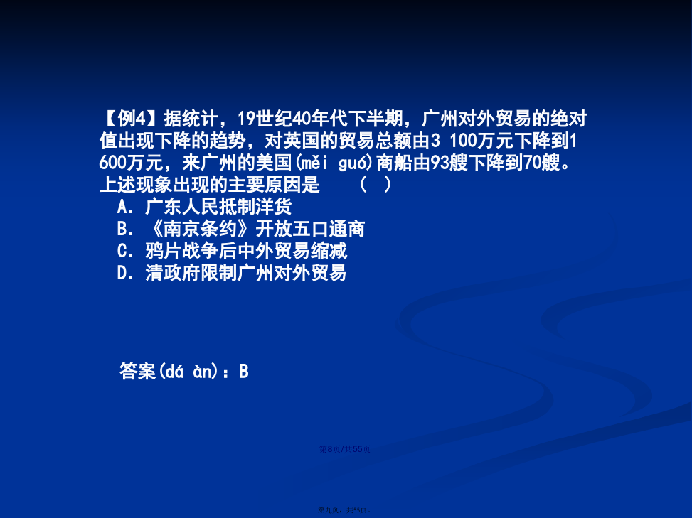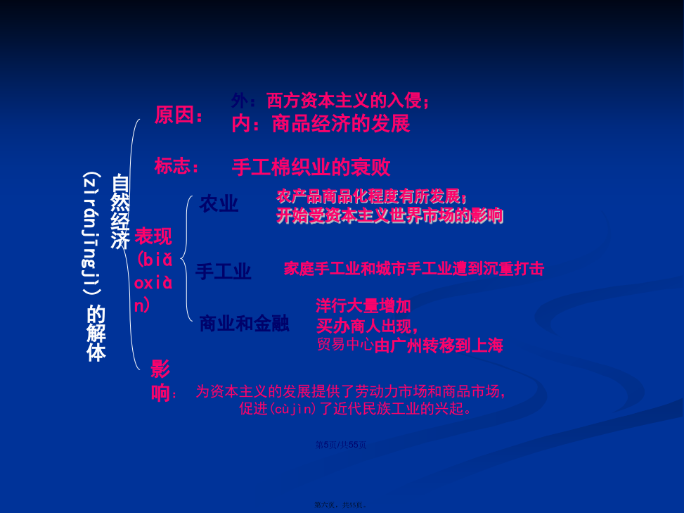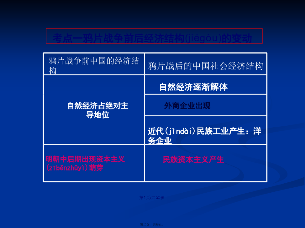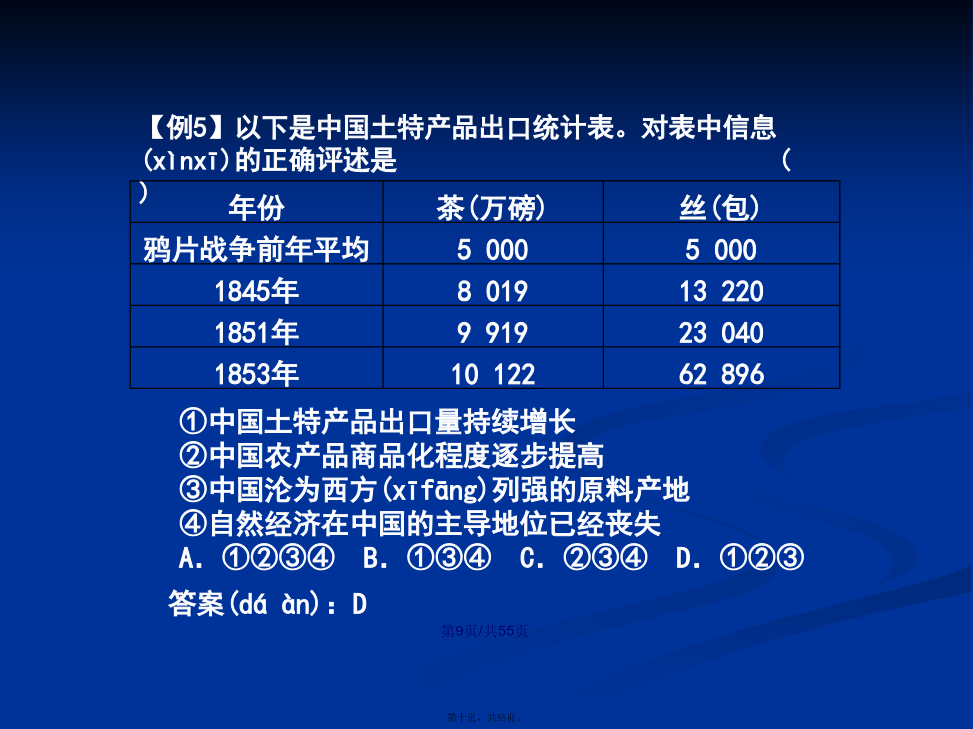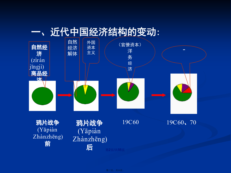 会计学考点一鸦片战争前后经济结构(jiégòu)的变动鸦片战争(YāpiànZhànzhēng)前主题1自然经济逐步解体【史料研析】1.自然经济解体的原因材料1845年,福州官员奏称:洋货“充积于厦口”。洋棉、洋布,“其质既美,其价复廉,民间之买洋布、洋棉者,十室而九”。(1)据材料归纳概括导致(dǎozhì)近代中国自然经济解体的主要原因。提示:鸦片战争后资本主义国家向中国大量输出商品。2.自然经济(zìránjīngjì)解体的表现材料中国土特产品出口统计表为资本主义的发展提供了劳动力市场和商品市场,促进(cùjìn)了近代民族工业的兴起。※题组一【例3】有学者认为,外国商品输入造成中国自然经济逐步瓦解。可以作为该观点直接证据的是()A.19世纪末镇江海关报告称:“从前如江北内地各州县,均用洋布,近则用土布者渐多。”B.20世纪初有人指出:“商市展拓所及,建筑盛则农田(nóngtián)少,耕夫织妇弃其本业而趋工场,必然之势也。”C.1853年的《顺德县志》载:“女布(指土布)遍于县市,自外洋以风火水牛运机成布,舶至贱售,女工几停其半。”D.1850年,美国驻厦门领事说:“这里对棉织品的需要,和在广州、上海一样,长期受到限制。”【例4】据统计,19世纪40年代下半期,广州对外贸易的绝对值出现下降的趋势,对英国的贸易总额由3100万元下降到1600万元,来广州的美国(měiɡuó)商船由93艘下降到70艘。上述现象出现的主要原因是()A.广东人民抵制洋货B.《南京条约》开放五口通商C.鸦片战争后中外贸易缩减D.清政府限制广州对外贸易【例5】以下是中国土特产品出口统计表。对表中信息(xìnxī)的正确评述是()【例6】19世纪60年代后中国农副产品出口(chūkǒu)不断增长,它所产生的社会影响不包括()A.扭转了中国外贸入超的局面B.为民族资本主义产生创造条件C.促使自然经济进一步解体D.有利于农业生产的商品化鸦片战争后,我国东南沿海农业出现了许多新的变化,主要“新”在()A.增加了许多农业新品种B.农产品商品化的程度(chéngdù)提高C.出现了近代化的农业D.生产方式出现了质的飞跃考点二中国(zhōnɡɡuó)民族资本主义曲折发展A、封建自然经济;B、洋务(yángwù)经济;C、外国资本主义经济;D、民族资本主义经济;E、官僚资本主义经济;①上海:方举赞—发昌机器(jīqì)厂;②广东:陈启源—继昌隆缫丝厂;③天津:朱其昂—贻来牟机器(jīqì)磨坊;主题2近代(jìndài)中国民族工业的兴起和初步发展【史料研析】1.民族工业的产生材料1872年,侨商陈启源在广东南海创建了中国第一家机器缫丝厂——继昌隆缫丝厂。“出丝精美,行销于欧美两洲,价值之高,倍于从前,遂获厚利”,“三四年间,南(海)、顺(德)两邑相继起者多至百数十家”。2.民族工业(gōngyè)的特点材料影响(yǐngxiǎng)【例7】张之洞说:“臣愚以为华民所需外洋之物,瞄应悉行仿造,虽不尽断来源,亦可渐开风气。”这表明他主张()A.仿效西方政治制度B.兴办近代军事工业C.创办近代民用工业D.学习西方自然科学(zìránkēxué)【例8】据记载,1888年清朝政府在北京西苑修建了一条铁路,慈禧太后因火车司机坐在自己前面开车,弃用了从德国引进的蒸汽机车而改用太监牵拉。这说明()A.顽周势力拒绝引进西方科技B.封建等级制度阻碍社会发展C.清廷天朝大国思想根深蒂固D.封建迷信阻碍近代科技传播【例9】1870—1910年中国一些(yīxiē)进口货物占总进口值的百分比我国学者陈旭麓认为洋务运动“包含着逸出旧轨的趋向”。他认为洋务运动()A.促进了近代民族(mínzú)工业的产生B.导致自然经济开始走向解体C.催生了买办和买办化的商人D.引起了商业和金融业的变化1873年侨商陈启源创办继昌隆缫丝厂,采用蒸汽机和传动装置,雇女工数百人,“出丝精美,行销于欧美两洲,价值之高,倍于从前,遂获厚利”。这说明继昌隆缫丝厂()A.属于近代的民族(mínzú)工业B.产品主要面向国内市场C.实质是外国资本家在华创办的企业D.没有跳出中国传统生产方式下表是《1840~1894年我国投资民族企业的人数比例表》。这一现象不能反映的信息是()A.民族资本的来源多元化B.民族工业产生(chǎnshēng)途径多样化C.部分投资者来自国外D.民族工业得到迅速发展晚清一著名人士提出,“机器厂可兴作业,小轮舟可便通达”。建议“宜纵民为之,并加保护”。这种主张被正式(zhèngshì)推行是在()A.19世纪70年代B.19世纪80年代C.19世纪90年代D.20世纪20