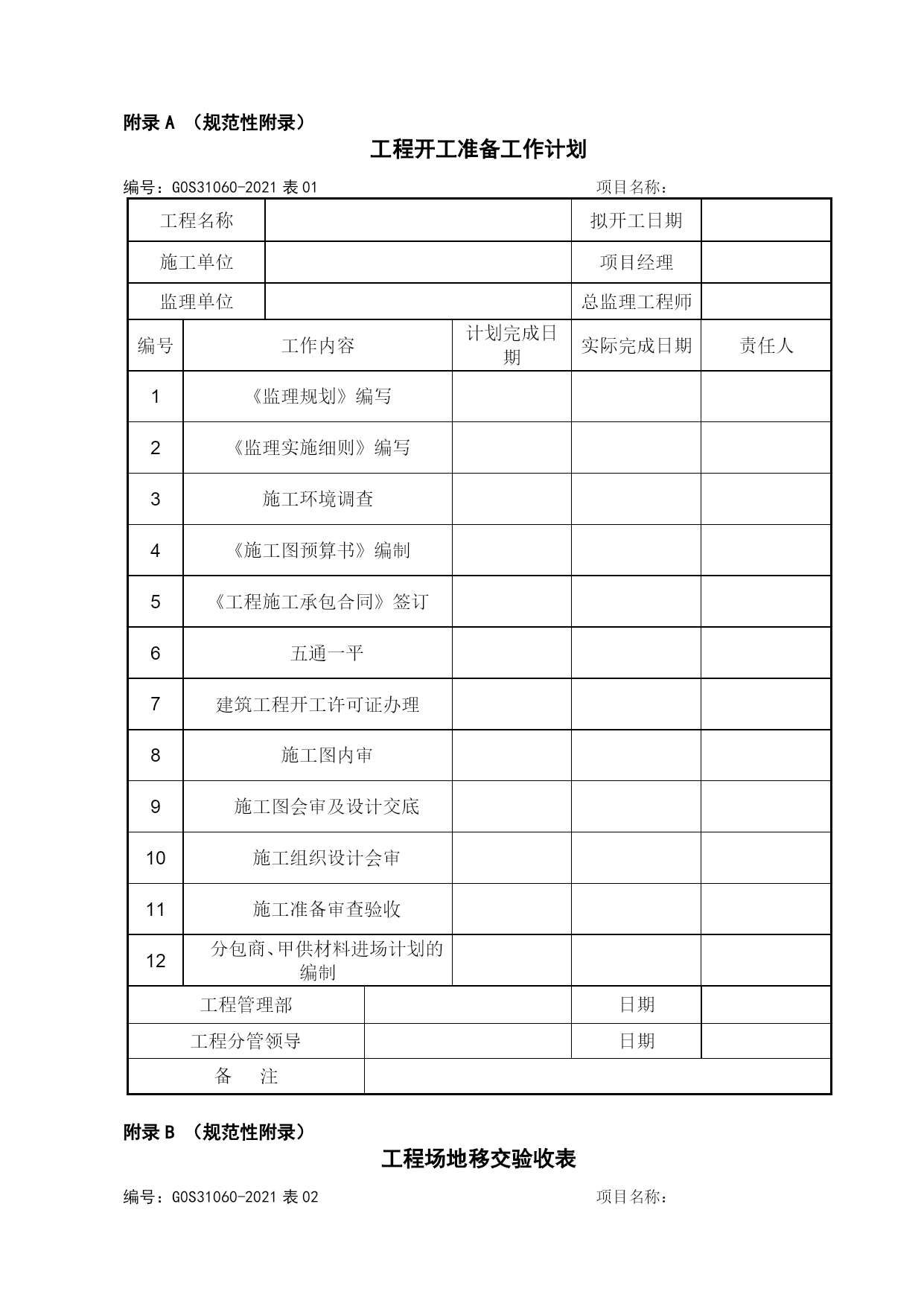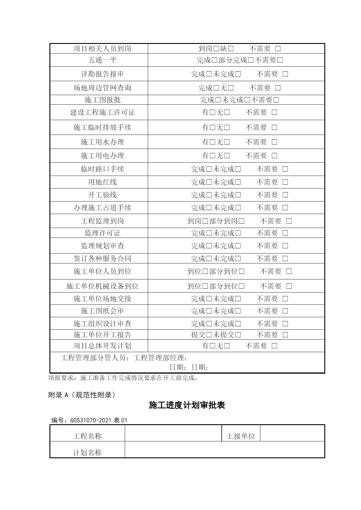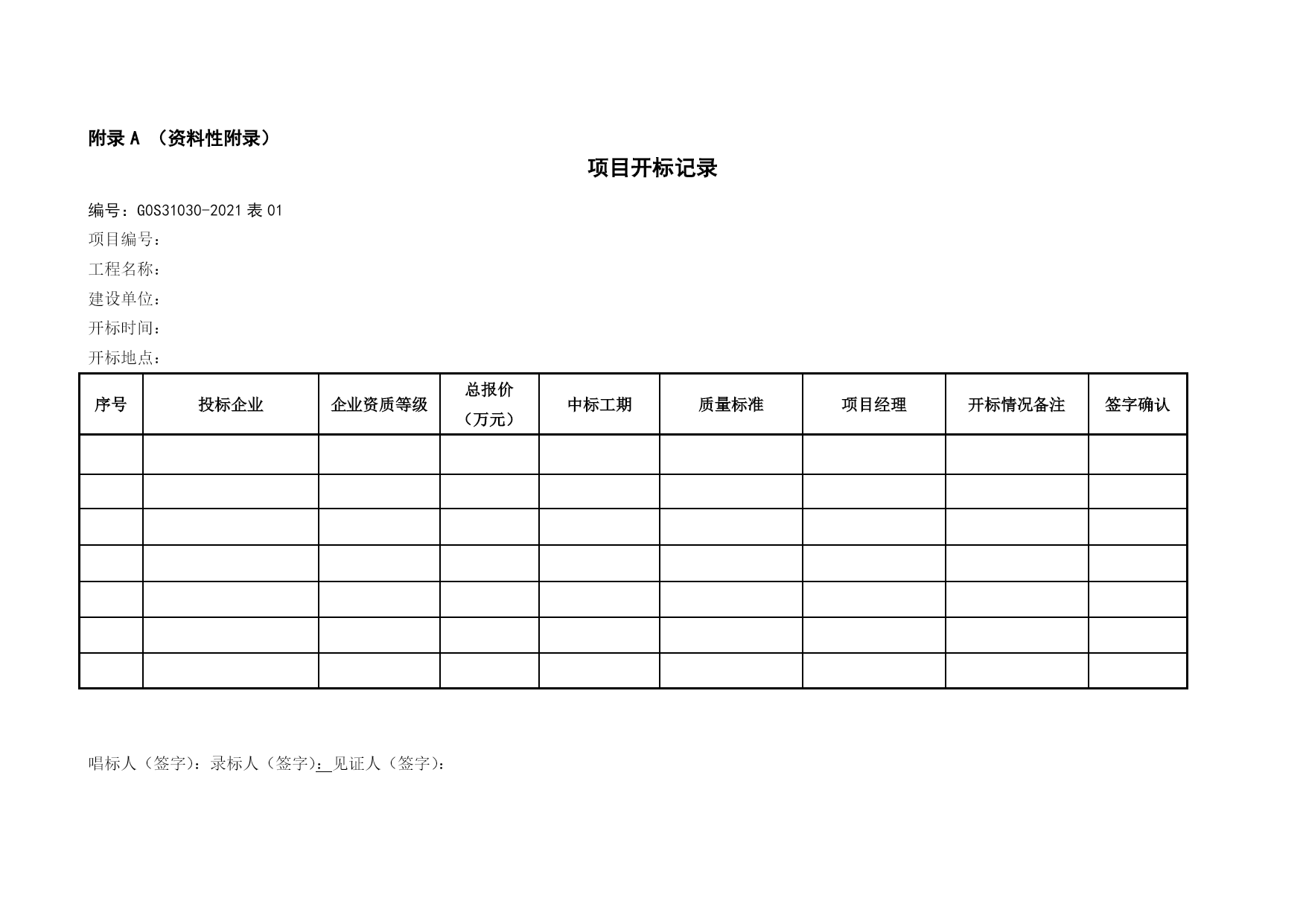 项目运营手册工程弦之建安工程分弦-表单优质资料(可以直接使用,可编辑优质资料,欢迎下载)附录A(规范性附录)施工现场环境、地下管线调查表编号:G0S31010-2021表01项目名称工程名称施工场地位置计划开工时间调查单位填写日期调查内容:经办人:日期:工程管理部负责人:日期:复核意见:工程分管领导:日期:表格说明:工程开工前,工程管理部必须组织填写此表,经各方同意、确认现场环境、地下管线不影响工程施工后才可开工。本表须附场地平面图,共同作为项目公司资料存档。附录B(规范性附录)工程管理部人员花名册编号:G0S31-2021表01项目名称:填写日期:年月日序号姓名性别岗位主要工作职责备注附录A(资料性附录)项目开标记录编号:G0S31030-2021表01项目编号:工程名称:建设单位:开标时间:开标地点:序号投标企业企业资质等级总报价(万元)中标工期质量标准项目经理开标情况备注签字确认唱标人(签字):录标人(签字):见证人(签字):附录B(资料性附录)中标通知书编号:G0S31030-2021模02******公司(建设单位)的**工程,于***年**月**日公开开标后,经评标委员会评定并报集团相关部门备案,现确定你单位为中标人,中标标价为***万元,中标工期***日历天,工程质量符合国家施工验收规范合格标准。项目经理***。你单位收到中标通知书后,在***年**月**日**时前到***(建设单位)与招标人签订承发包合同。本次中标总建筑面积:*****平方米面积填报依据共*幢幢号面积幢号面积其中本次中标包括下列内容打桩工程有弱电工程本次招标未包括土建工程有幕墙工程有安装工程有钢结构(网架)本工程无此内容装饰装修工程本次招标未包括市政工程本工程无此内容消防工程有室外附属工程有招标人:(盖章)招标代理机构:(盖章)法定代表人或委托代表人:法定代表人或委托代表人:(签字或盖章)(签字或盖章)年月日年月日附录A(规范性附录)工程开工准备工作计划编号:G0S31060-2021表01项目名称:工程名称拟开工日期施工单位项目经理监理单位总监理工程师编号工作内容计划完成日期实际完成日期责任人1《监理规划》编写2《监理实施细则》编写3施工环境调查4《施工图预算书》编制5《工程施工承包合同》签订6五通一平7建筑工程开工许可证办理8施工图内审9施工图会审及设计交底10施工组织设计会审11施工准备审查验收12分包商、甲供材料进场计划的编制工程管理部日期工程分管领导日期备注附录B(规范性附录)工程场地移交验收表编号:G0S31060-2021表02项目名称:移交部位建设单位负责人接收单位负责人场地移交内容1、施工场地移交完成时间,一般在总包定标及现场具备总包单位进场施工条件后。2、施工场地移交包括现场施工工作面、变压器、水表、测量控制点、施工图纸、勘察资料、测绘资料以及城市道路、市政管网(和周围环境)等移交。3、现场施工工作面移交由工程管理部会同前期部协调总包单位与前期工程施工单位如桩基单位等一起办理移交手续,必要时还需对场地移交时标高等情况进行复核。移交情况和验收结论(包括工程质量评价和对未完成工程有关问题的处理意见)工程管理部意见:负责人:年月日监理公司意见:监理总监:年月日接收单位意见:负责人:年月日附录C(规范性附录)施工准备工作完成情况检查编号:G0S31060-2021表03项目名称:工程名称项目所需临时设施完成□未完成□不需要□项目相关人员到岗到岗□缺□不需要□五通一平完成□部分完成□不需要□详勘报告报审完成□未完成□不需要□场地周边管网查询完成□无□不需要□施工图报批完成□未完成□不需要□建设工程施工许可证有□无□不需要□施工临时排放手续有□无□不需要□施工用水办理有□无□不需要□施工用电办理有□无□不需要□临时路口手续完成□未完成□不需要□用地红线完成□未完成□不需要□开工验线完成□未完成□不需要□办理施工占道手续完成□未完成□不需要□工程监理到岗到岗□部分到岗□不需要□监理许可证完成□未完成□不需要□监理规划审查完成□未完成□不需要□签订各种服务合同完成□未完成□不需要□施工单位人员到位到位□部分到位□不需要□施工单位机械设备到位到位□部分到位□不需要□施工单位场地交接完成□未完成□不需要□施工图纸会审完成□未完成□不需要□施工组织设计审查完成□未完成□不需要□施工单位开工报告提交□未提交□不需要□项目总体开发计划有□无□不需要□工程管理部分管人员:工程管理部经理:日期:日期:填报要求:施工准备工作完成情况要求在开工前完成。附录A(规范性附录)施工进度计划审