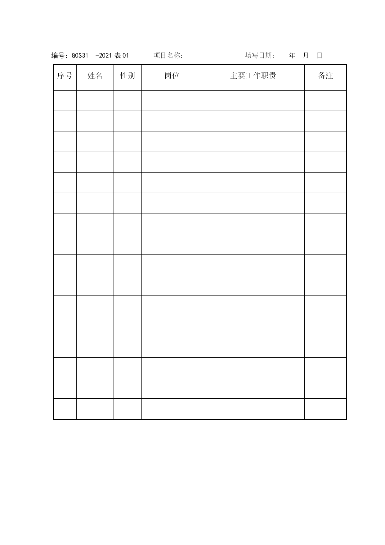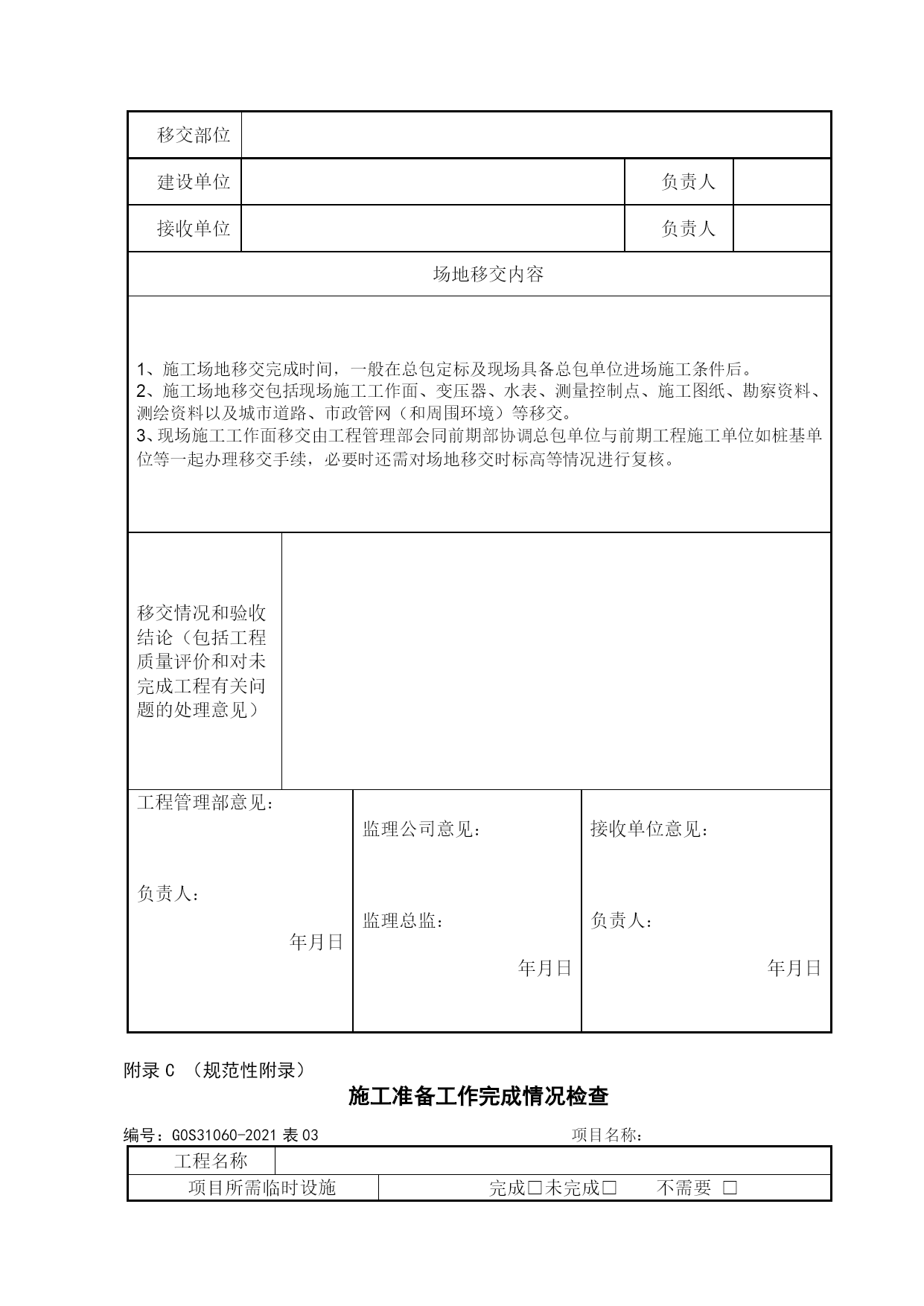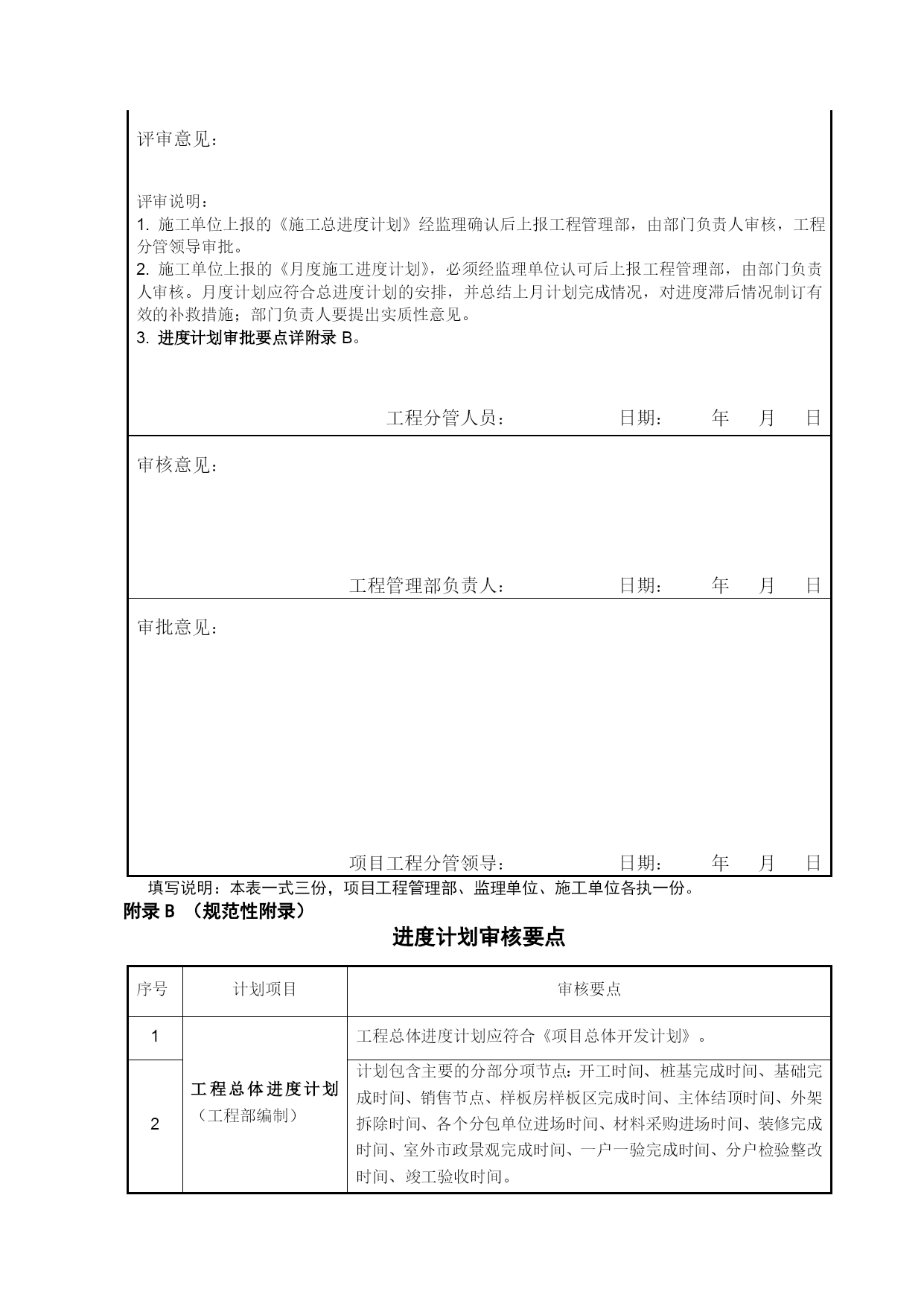 项目运营手册工程弦之建安工程分弦-表单优质资料(可以直接使用,可编辑优质资料,欢迎下载)附录A(规范性附录)施工现场环境、地下管线调查表编号:G0S31010-2021表01项目名称工程名称施工场地位置计划开工时间调查单位填写日期调查内容:经办人:日期:工程管理部负责人:日期:复核意见:工程分管领导:日期:表格说明:工程开工前,工程管理部必须组织填写此表,经各方同意、确认现场环境、地下管线不影响工程施工后才可开工。本表须附场地平面图,共同作为项目公司资料存档。附录B(规范性附录)工程管理部人员花名册编号:G0S31-2021表01项目名称:填写日期:年月日序号姓名性别岗位主要工作职责备注附录A(资料性附录)项目开标记录编号:G0S31030-2021表01项目编号:工程名称:建设单位:开标时间:开标地点:序号投标企业企业资质等级总报价(万元)中标工期质量标准项目经理开标情况备注签字确认唱标人(签字):录标人(签字):见证人(签字):附录B(资料性附录)中标通知书编号:G0S31030-2021模02******公司(建设单位)的**工程,于***年**月**日公开开标后,经评标委员会评定并报集团相关部门备案,现确定你单位为中标人,中标标价为***万元,中标工期***日历天,工程质量符合国家施工验收规范合格标准。项目经理***。你单位收到中标通知书后,在***年**月**日**时前到***(建设单位)与招标人签订承发包合同。本次中标总建筑面积:*****平方米面积填报依据共*幢幢号面积幢号面积其中本次中标包括下列内容打桩工程有弱电工程本次招标未包括土建工程有幕墙工程有安装工程有钢结构(网架)本工程无此内容装饰装修工程本次招标未包括市政工程本工程无此内容消防工程有室外附属工程有招标人:(盖章)招标代理机构:(盖章)法定代表人或委托代表人:法定代表人或委托代表人:(签字或盖章)(签字或盖章)年月日年月日附录A(规范性附录)工程开工准备工作计划编号:G0S31060-2021表01项目名称:工程名称拟开工日期施工单位项目经理监理单位总监理工程师编号工作内容计划完成日期实际完成日期责任人1《监理规划》编写2《监理实施细则》编写3施工环境调查4《施工图预算书》编制5《工程施工承包合同》签订6五通一平7建筑工程开工许可证办理8施工图内审9施工图会审及设计交底10施工组织设计会审11施工准备审查验收12分包商、甲供材料进场计划的编制工程管理部日期工程分管领导日期备注附录B(规范性附录)工程场地移交验收表编号:G0S31060-2021表02项目名称:移交部位建设单位负责人接收单位负责人场地移交内容1、施工场地移交完成时间,一般在总包定标及现场具备总包单位进场施工条件后。2、施工场地移交包括现场施工工作面、变压器、水表、测量控制点、施工图纸、勘察资料、测绘资料以及城市道路、市政管网(和周围环境)等移交。3、现场施工工作面移交由工程管理部会同前期部协调总包单位与前期工程施工单位如桩基单位等一起办理移交手续,必要时还需对场地移交时标高等情况进行复核。移交情况和验收结论(包括工程质量评价和对未完成工程有关问题的处理意见)工程管理部意见:负责人:年月日监理公司意见:监理总监:年月日接收单位意见:负责人:年月日附录C(规范性附录)施工准备工作完成情况检查编号:G0S31060-2021表03项目名称:工程名称项目所需临时设施完成□未完成□不需要□项目相关人员到岗到岗□缺□不需要□五通一平完成□部分完成□不需要□详勘报告报审完成□未完成□不需要□场地周边管网查询完成□无□不需要□施工图报批完成□未完成□不需要□建设工程施工许可证有□无□不需要□施工临时排放手续有□无□不需要□施工用水办理有□无□不需要□施工用电办理有□无□不需要□临时路口手续完成□未完成□不需要□用地红线完成□未完成□不需要□开工验线完成□未完成□不需要□办理施工占道手续完成□未完成□不需要□工程监理到岗到岗□部分到岗□不需要□监理许可证完成□未完成□不需要□监理规划审查完成□未完成□不需要□签订各种服务合同完成□未完成□不需要□施工单位人员到位到位□部分到位□不需要□施工单位机械设备到位到位□部分到位□不需要□施工单位场地交接完成□未完成□不需要□施工图纸会审完成□未完成□不需要□施工组织设计审查完成□未完成□不需要□施工单位开工报告提交□未提交□不需要□项目总体开发计划有□无□不需要□工程管理部分管人员:工程管理部经理:日期:日期:填报要求:施工准备工作完成情况要求在开工前完成。附录A(规范性附录)施工进度计划审