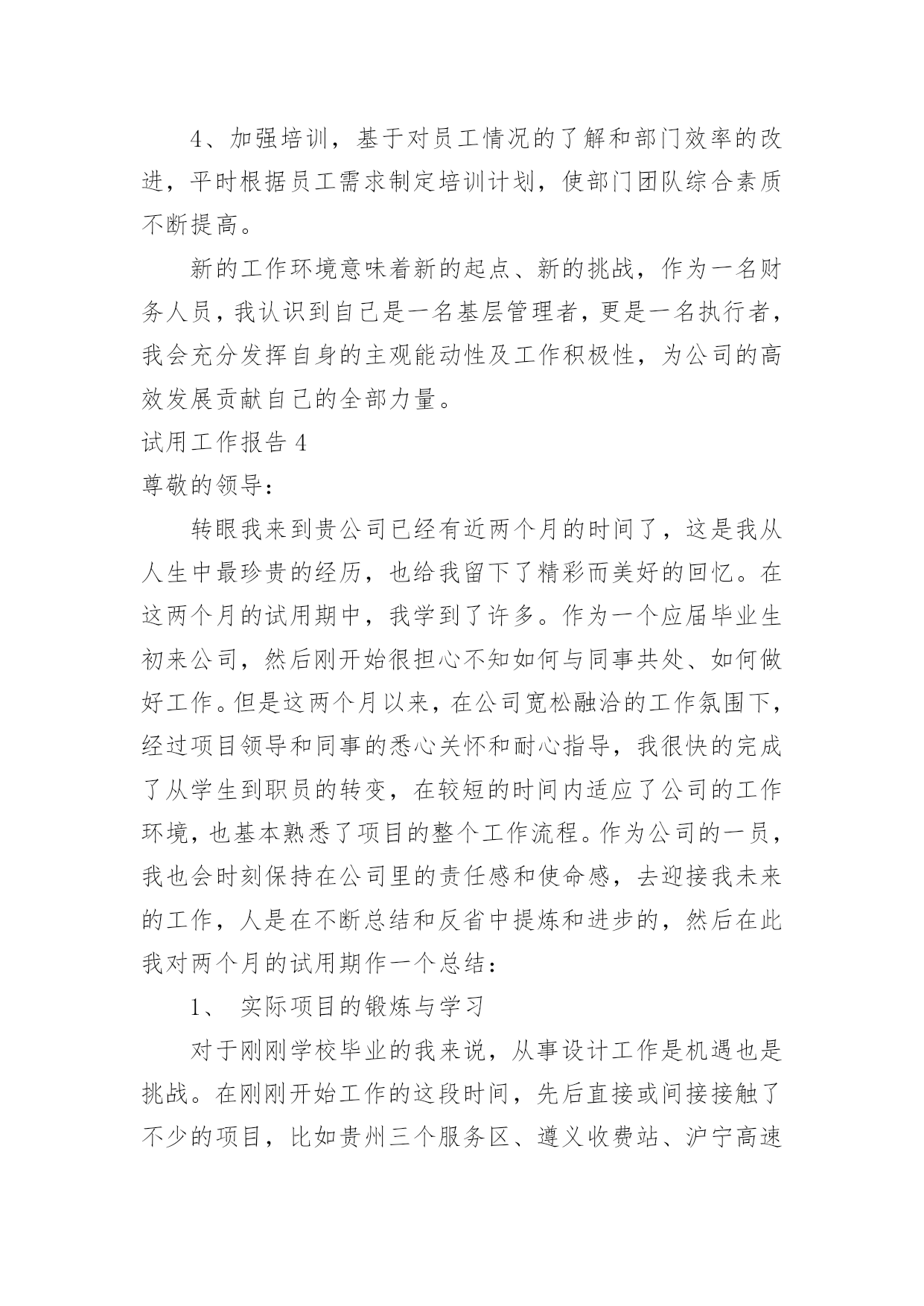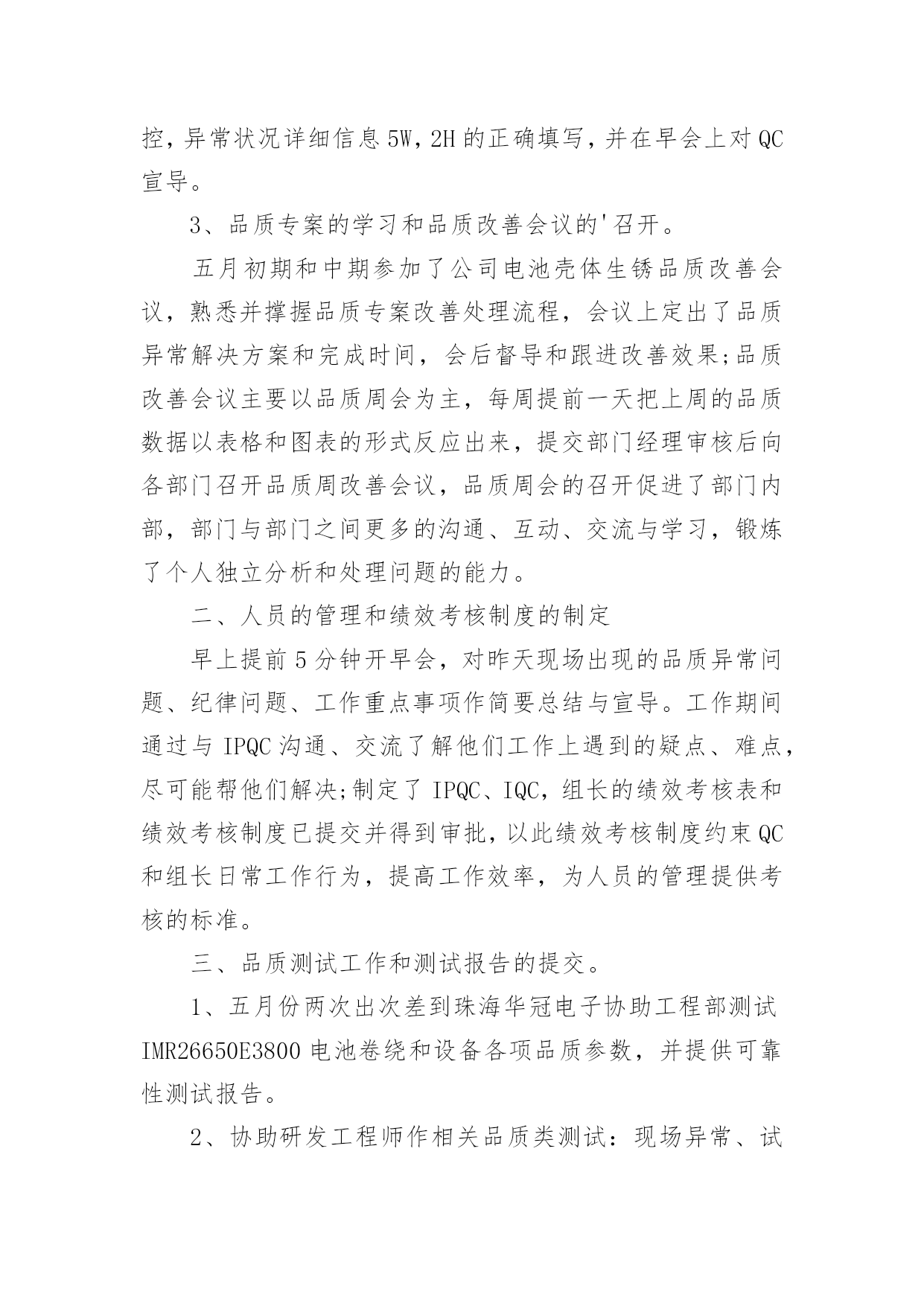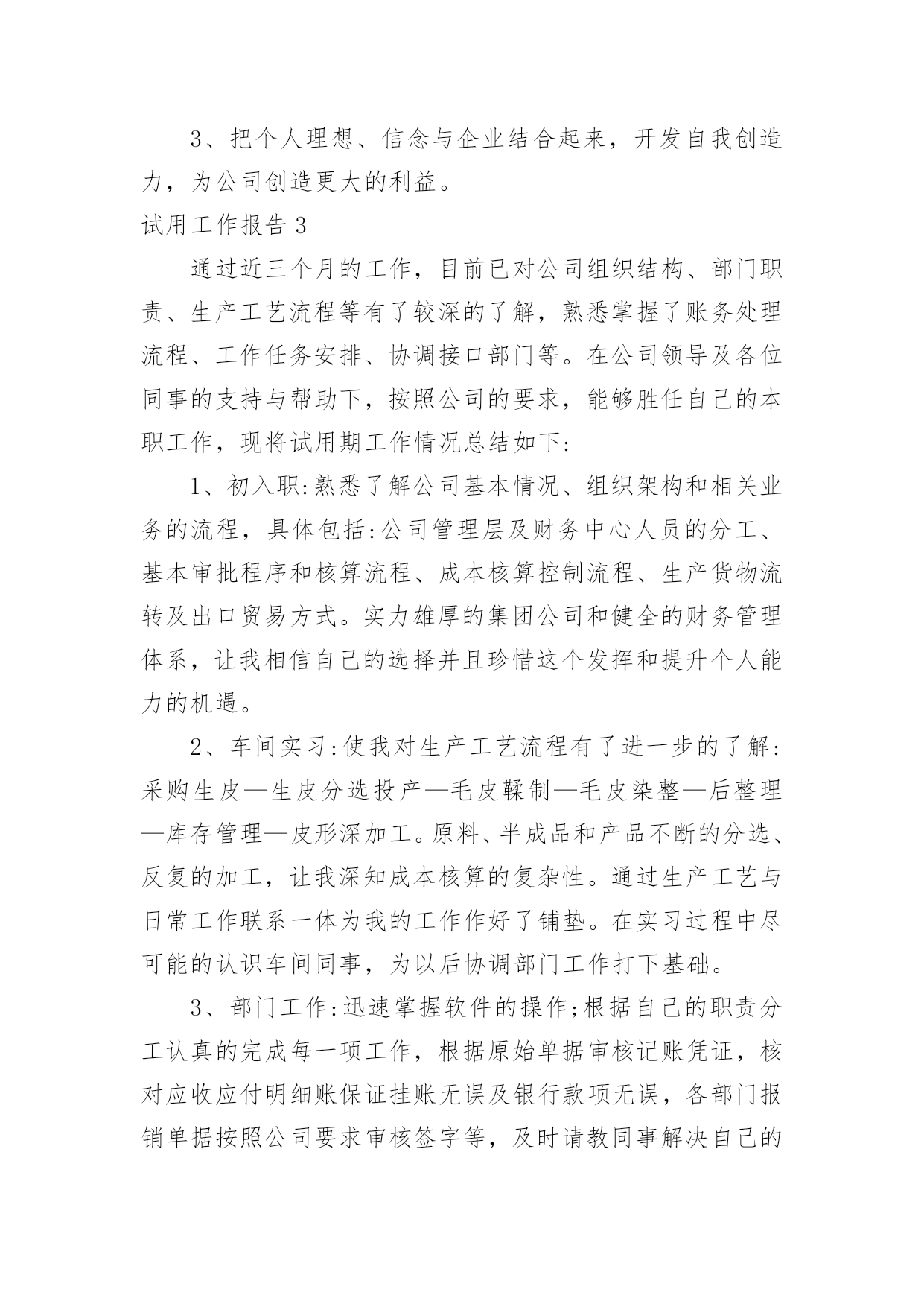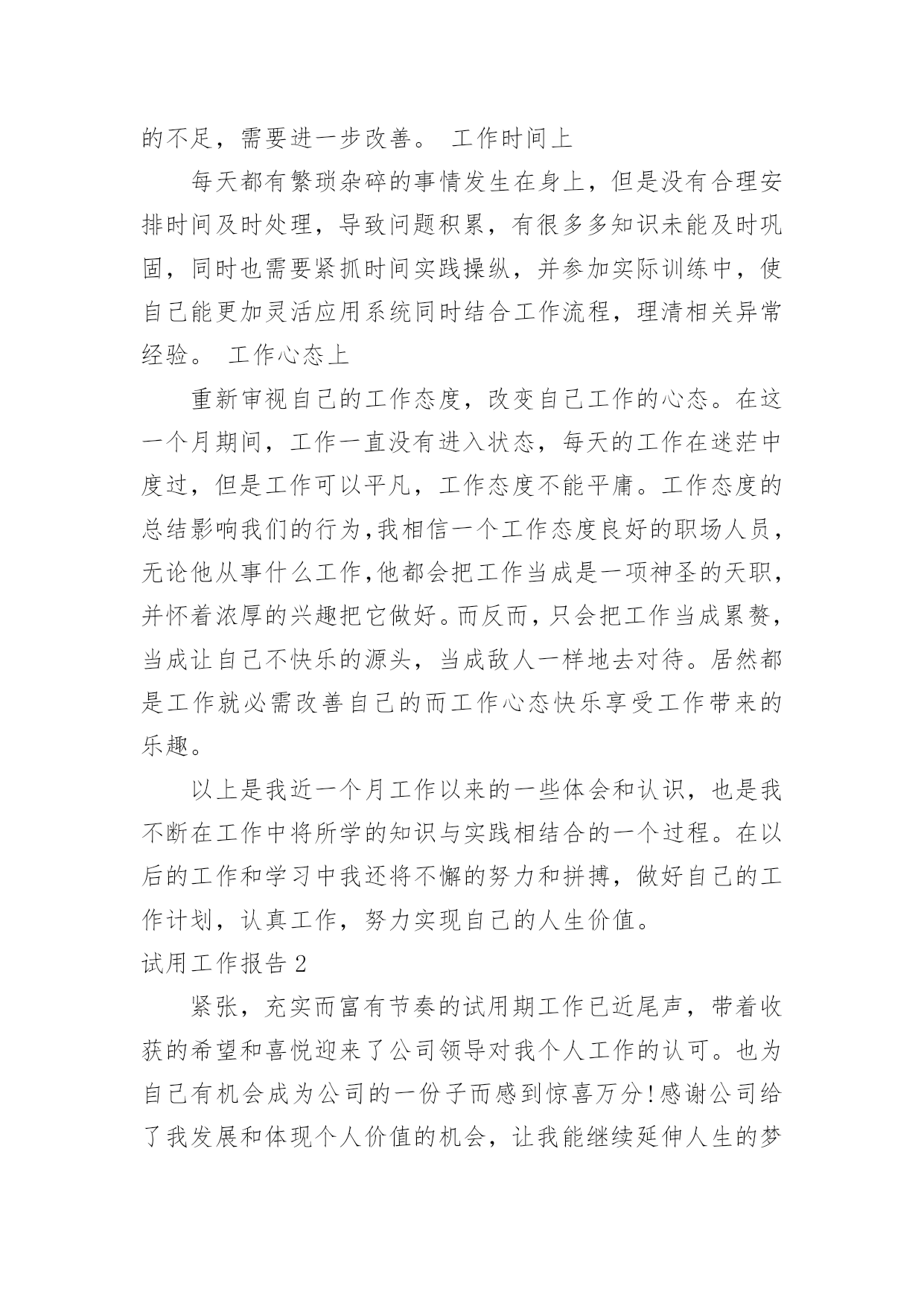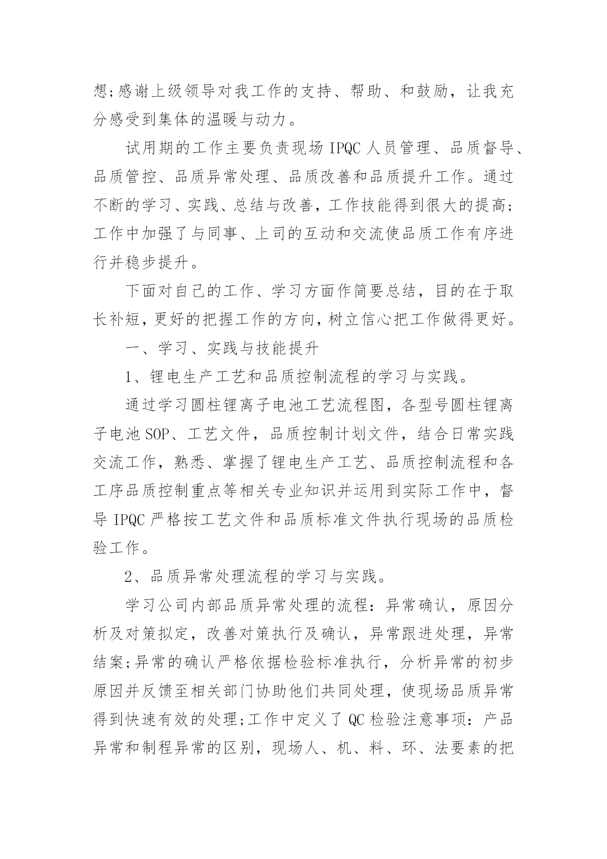 试用工作报告试用工作报告我们眼下的社会,报告使用的频率越来越高,我们在写报告的时候要注意语言要准确、简洁。你所见过的报告是什么样的呢?下面是小编为大家整理的试用工作报告,希望能够帮助到大家。试用工作报告1时间飞逝,转眼间,做为一名供应链试用员工已经有一个月之久。在这供应链学习的日子里,我体会到了公司员工之间的的冲劲氛围和各个部门的巨大魅力,目睹了公司的一个个新项目。供应链部门的工作逐渐完善,并日渐不乱,同时,也看到了公司的新项目带给我们的学习平台和和无穷的机遇与挑战,所以,我在此对于过去的工作做下总结。在过去的一个月里,我只要跟昭桂学习SAP/ERP系统的基本试用方法。在昭耐心的指导下基本上在规定的'时间内完成了大部分的工作需求。在工作中逐渐积累做事的流程和细节。学习了很多供应的业务知识,逐步地了解了部门组内各成员的综合素质和工作范围。就个人业务方面,我主要了解富士康业务。当然这很多得益于昭桂和王平。倪经理人的精心指导,我很是感谢他们。但是在工作的过程中存在许多的不足,需要进一步改善。工作时间上每天都有繁琐杂碎的事情发生在身上,但是没有合理安排时间及时处理,导致问题积累,有很多多知识未能及时巩固,同时也需要紧抓时间实践操纵,并参加实际训练中,使自己能更加灵活应用系统同时结合工作流程,理清相关异常经验。工作心态上重新审视自己的工作态度,改变自己工作的心态。在这一个月期间,工作一直没有进入状态,每天的工作在迷茫中度过,但是工作可以平凡,工作态度不能平庸。工作态度的总结影响我们的行为,我相信一个工作态度良好的职场人员,无论他从事什么工作,他都会把工作当成是一项神圣的天职,并怀着浓厚的兴趣把它做好。而反而,只会把工作当成累赘,当成让自己不快乐的源头,当成敌人一样地去对待。居然都是工作就必需改善自己的而工作心态快乐享受工作带来的乐趣。以上是我近一个月工作以来的一些体会和认识,也是我不断在工作中将所学的知识与实践相结合的一个过程。在以后的工作和学习中我还将不懈的努力和拼搏,做好自己的工作计划,认真工作,努力实现自己的人生价值。试用工作报告2紧张,充实而富有节奏的试用期工作已近尾声,带着收获的希望和喜悦迎来了公司领导对我个人工作的认可。也为自己有机会成为公司的一份子而感到惊喜万分!感谢公司给了我发展和体现个人价值的机会,让我能继续延伸人生的梦想;感谢上级领导对我工作的支持、帮助、和鼓励,让我充分感受到集体的温暖与动力。试用期的工作主要负责现场IPQC人员管理、品质督导、品质管控、品质异常处理、品质改善和品质提升工作。通过不断的学习、实践、总结与改善,工作技能得到很大的提高;工作中加强了与同事、上司的互动和交流使品质工作有序进行并稳步提升。下面对自己的工作、学习方面作简要总结,目的在于取长补短,更好的把握工作的方向,树立信心把工作做得更好。一、学习、实践与技能提升1、锂电生产工艺和品质控制流程的学习与实践。通过学习圆柱锂离子电池工艺流程图,各型号圆柱锂离子电池SOP、工艺文件,品质控制计划文件,结合日常实践交流工作,熟悉、掌握了锂电生产工艺、品质控制流程和各工序品质控制重点等相关专业知识并运用到实际工作中,督导IPQC严格按工艺文件和品质标准文件执行现场的品质检验工作。2、品质异常处理流程的学习与实践。学习公司内部品质异常处理的流程:异常确认,原因分析及对策拟定,改善对策执行及确认,异常跟进处理,异常结案;异常的确认严格依据检验标准执行,分析异常的初步原因并反馈至相关部门协助他们共同处理,使现场品质异常得到快速有效的处理;工作中定义了QC检验注意事项:产品异常和制程异常的区别,现场人、机、料、环、法要素的把控,异常状况详细信息5W,2H的正确填写,并在早会上对QC宣导。3、品质专案的学习和品质改善会议的'召开。五月初期和中期参加了公司电池壳体生锈品质改善会议,熟悉并撑握品质专案改善处理流程,会议上定出了品质异常解决方案和完成时间,会后督导和跟进改善效果;品质改善会议主要以品质周会为主,每周提前一天把上周的品质数据以表格和图表的形式反应出来,提交部门经理审核后向各部门召开品质周改善会议,品质周会的召开促进了部门内部,部门与部门之间更多的沟通、互动、交流与学习,锻炼了个人独立分析和处理问题的能力。二、人员的管理和绩效考核制度的制定早上提前5分钟开早会,对昨天现场出现的品质异常问题、纪律问题、工作重点事项作简要总结与宣导。工作期间通过与IPQC沟通、交流了解他们工作上遇到的疑点、难点,尽可能帮他们解决;制定了IPQC、IQC,组长的绩效考核表和绩效考核制度已提交并得到审批,以此绩效考核制度约束QC和组长日常工作行为,提高工作效率,为人员的管理提供考核的标准。三、品质测试工作和测试报告的提交。1、五月份两次出次差到珠海华冠电子协助工程部测试IMR