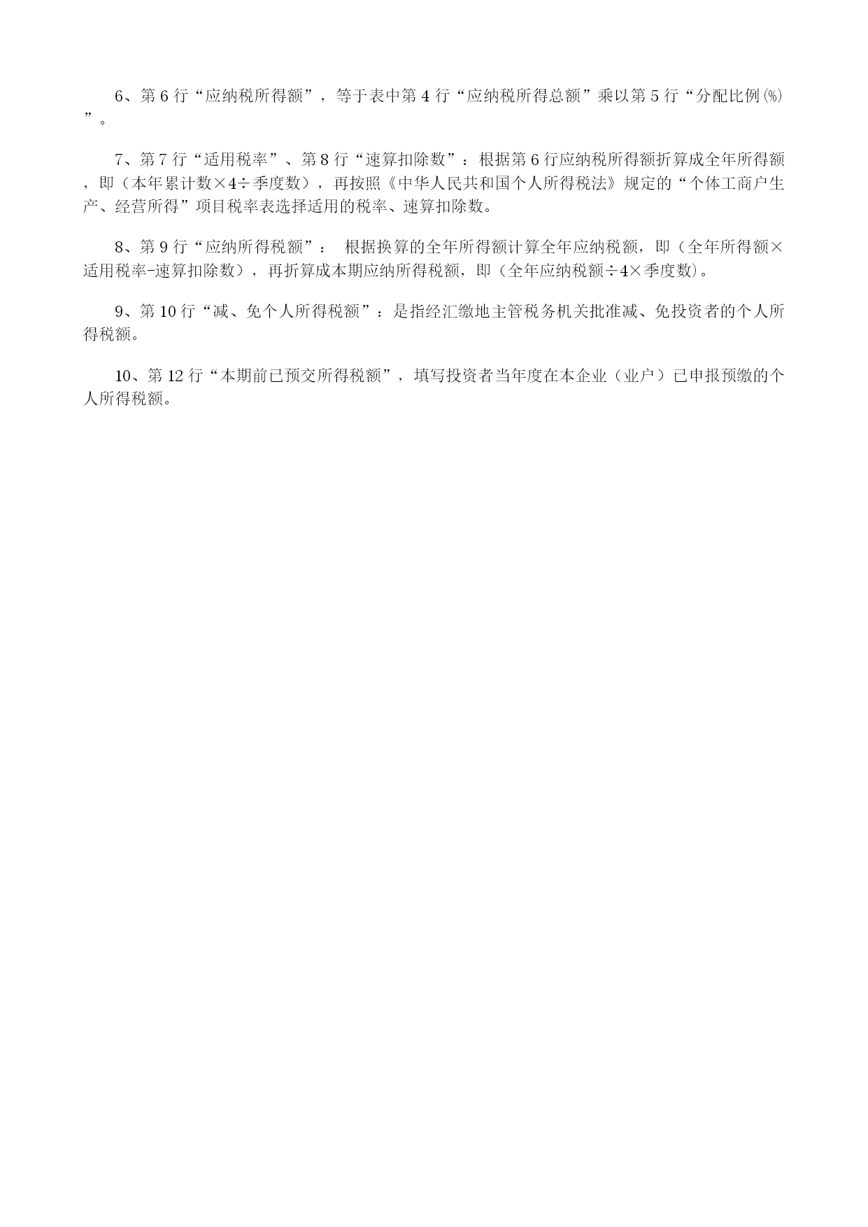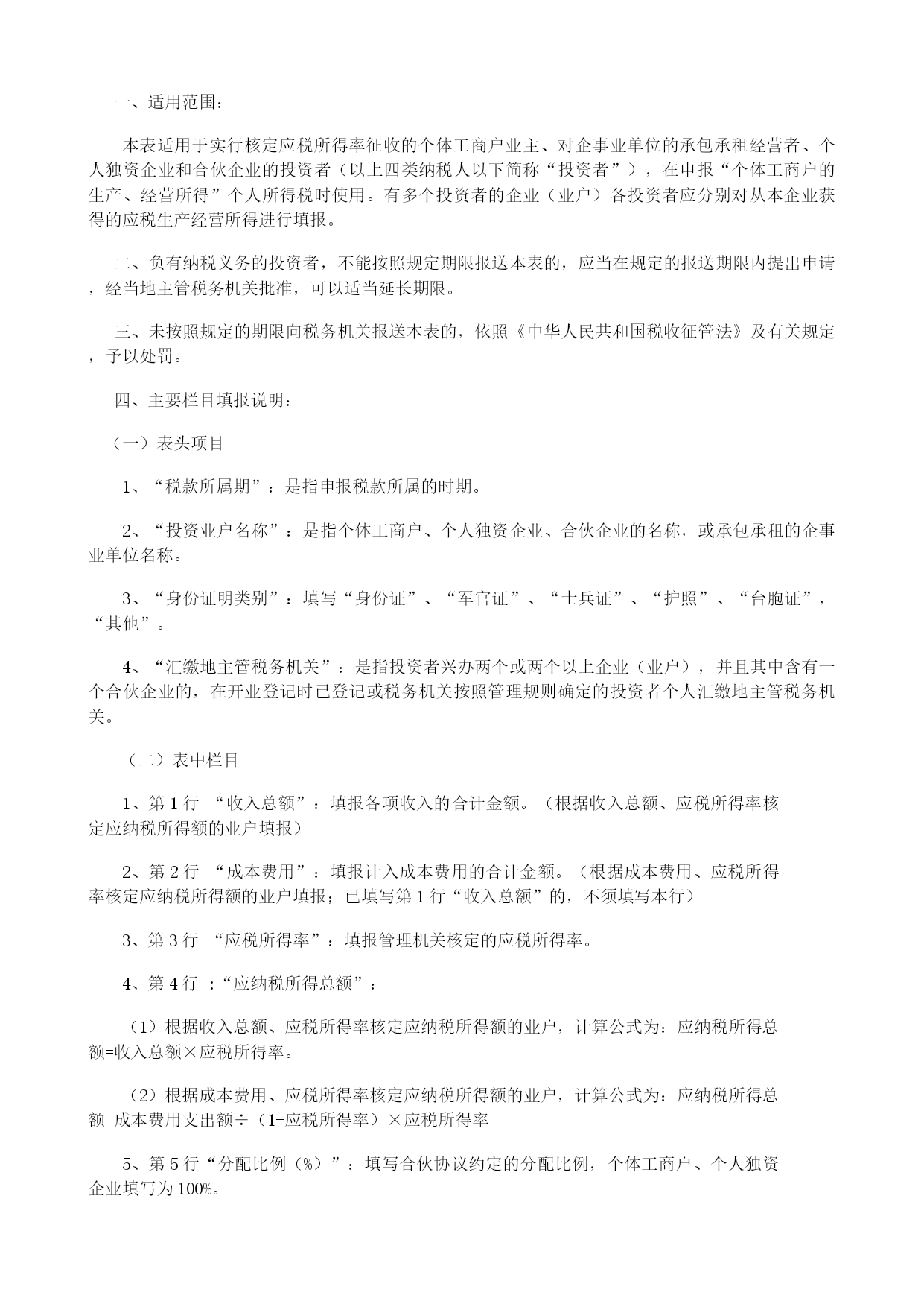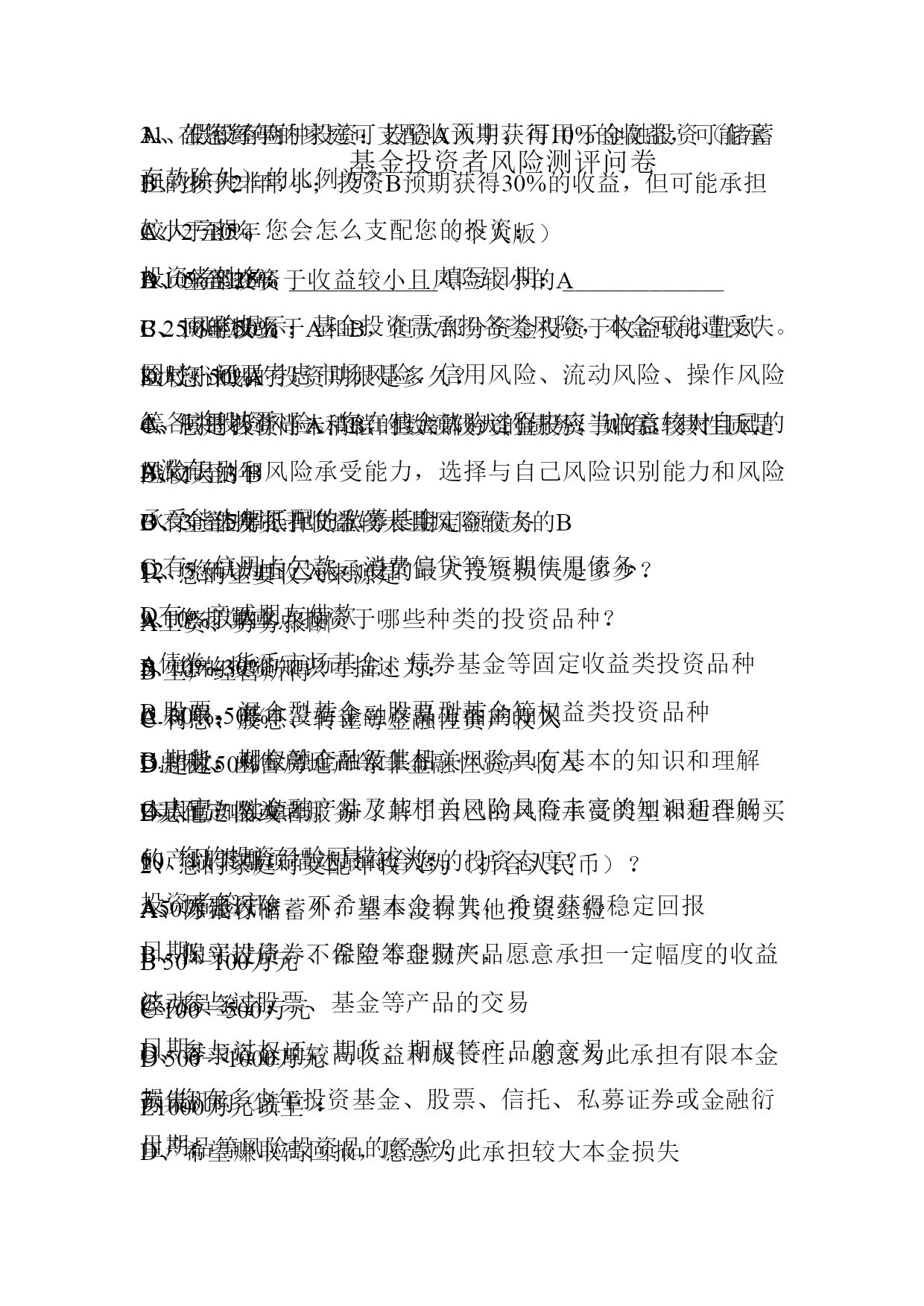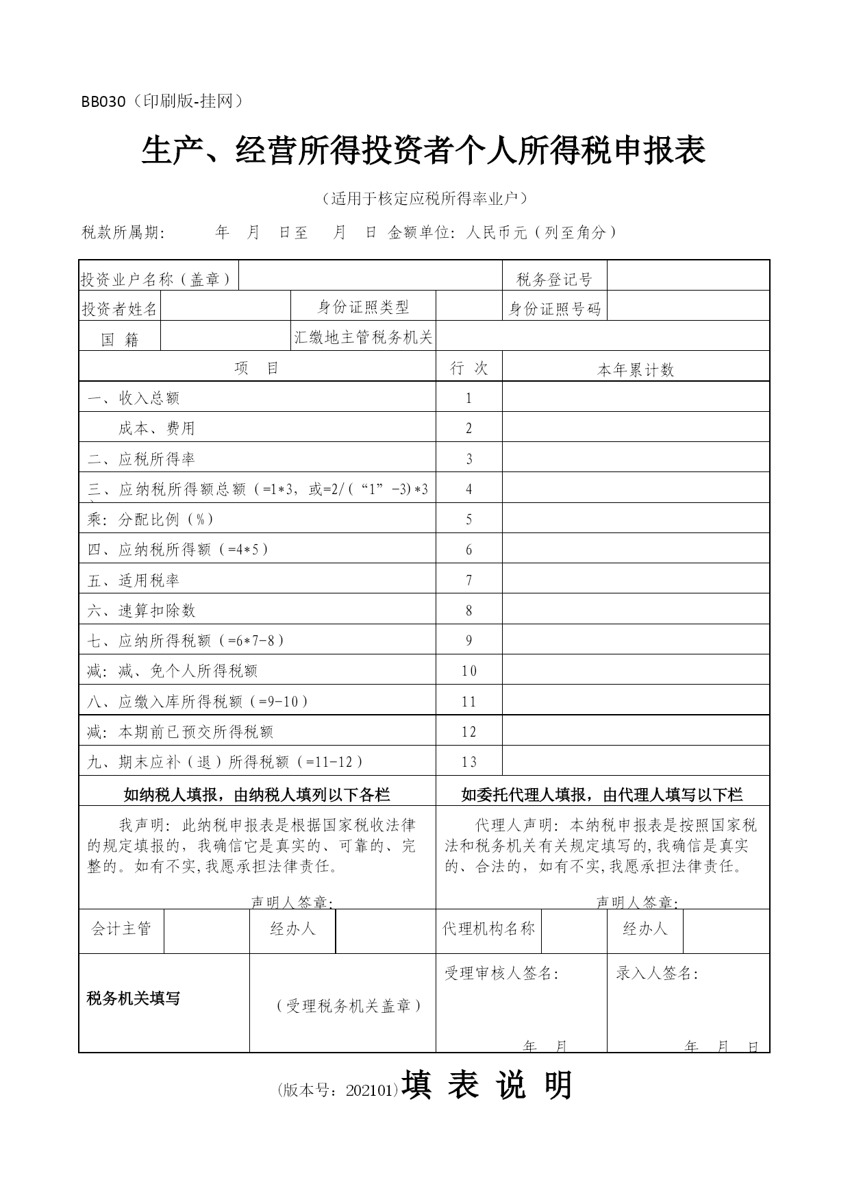 附表-:基金投资者风险测评问卷优质资料(可以直接使用,可编辑优质资料,欢迎下载)基金投资者风险测评问卷(个人版)投资者姓名:____________填写日期:_____________风险提示:基金投资需承担各类风险,本金可能遭受失。同时,还要考虑市场风险、信用风险、流动风险、操作风险等各类投资风险。您在基金认购过程中应当注意核对自己的风险识别和风险承受能力,选择与自己风险识别能力和风险承受能力相匹配的私募基金。1、您的主要收入来源是A工资、劳务报酬B生产经营所得C利息、股息、转让等金融性资产收入D出租、出售房地产等非金融性资产收入E无固定收入2、您的家庭可支配年收入为(折合人民币)?A50万元以下B50—100万元C100—500万元D500—1000万元E1000万元以上3、在您每年的家庭可支配收入中,可用于金融投资(储蓄存款除外)的比例为?A小于10%B10%至25%C25%至50%D大于50%4、您是否有尚未清偿的数额较大的债务,如有,其性质是A没有B有,住房抵押贷款等长期定额债务C有,信用卡欠款、消费信贷等短期信用债务D有,亲戚朋友借款5、您的投资知识可描述为:A.有限:基本没有金融产品方面的知识B.一般:对金融产品及其相关风险具有基本的知识和理解C.丰富:对金融产品及其相关风险具有丰富的知识和理解6、您的投资经验可描述为:A、除银行储蓄外,基本没有其他投资经验B、购买过债券、保险等理财产品C、参与过股票、基金等产品的交易D、参与过权证、期货、期权等产品的交易7、您有多少年投资基金、股票、信托、私募证券或金融衍生产品等风险投资品的经验?A、没有经验B、少于2年C、2至5年D、5至10年E、10年以上8、您计划的投资期限是多久?A、1年以下B、1至3年C、3至5年D、5年以上9、您打算重点投资于哪些种类的投资品种?A债券、货币市场基金、债券基金等固定收益类投资品种B股票、混合型基金、股票型基金等权益类投资品种C期货、期权等金融衍生品D其他产品或者服务10、以下哪项描述最符合您的投资态度?A、厌恶风险,不希望本金损失,希望获得稳定回报B、保守投资,不希望本金损失,愿意承担一定幅度的收益波动C、寻求资金的较高收益和成长性,愿意为此承担有限本金损失D、希望赚取高回报,愿意为此承担较大本金损失11、假设有两种投资:投资A预期获得10%的收益,可能承担的损失非常小;投资B预期获得30%的收益,但可能承担较大亏损。您会怎么支配您的投资:A、全部投资于收益较小且风险较小的AB、同时投资于A和B,但大部分资金投资于收益较小且风险较小的AC、同时投资于A和B,但大部分资金投资于收益较大且风险较大的BD、全部投资于收益较大且风险较大的B12、您认为自己能承受的最大投资损失是多少?A.10%以内B.10%-30%C.30%-50%D.超过50%本人已如实填写,并了解了自己的风险承受类型和适合购买的产品类型。投资者签字:日期:经办员签字:日期:募集机构(盖章):日期:BB030(印刷版-挂网)生产、经营所得投资者个人所得税申报表(适用于核定应税所得率业户)税款所属期:年月日至月日金额单位:人民币元(列至角分)投资业户名称(盖章)税务登记号投资者姓名身份证照类型身份证照号码国籍汇缴地主管税务机关项目行次本年累计数一、收入总额1成本、费用2二、应税所得率3三、应纳税所得额总额(=1*3,或=2/(“1”-3)*3)4乘:分配比例(%)5四、应纳税所得额(=4*5)6五、适用税率7六、速算扣除数8七、应纳所得税额(=6*7-8)9减:减、免个人所得税额10八、应缴入库所得税额(=9-10)11减:本期前已预交所得税额12九、期末应补(退)所得税额(=11-12)13如纳税人填报,由纳税人填列以下各栏如委托代理人填报,由代理人填写以下栏我声明:此纳税申报表是根据国家税收法律的规定填报的,我确信它是真实的、可靠的、完整的。如有不实,我愿承担法律责任。声明人签章:代理人声明:本纳税申报表是按照国家税法和税务机关有关规定填写的,我确信是真实的、合法的,如有不实,我愿承担法律责任。声明人签章:会计主管经办人代理机构名称经办人税务机关填写(受理税务机关盖章)受理审核人签名:年月日录入人签名:年月日(版本号:202101)填表说明一、适用范围:本表适用于实行核定应税所得率征收的个体工商户业主、对企事业单位的承包承租经营者、个人独资企业和合伙企业的投资者(以上四类纳税人以下简称“投资者”),在申报“个体工商户的生产、经营所得”个人所得税时使用。有
