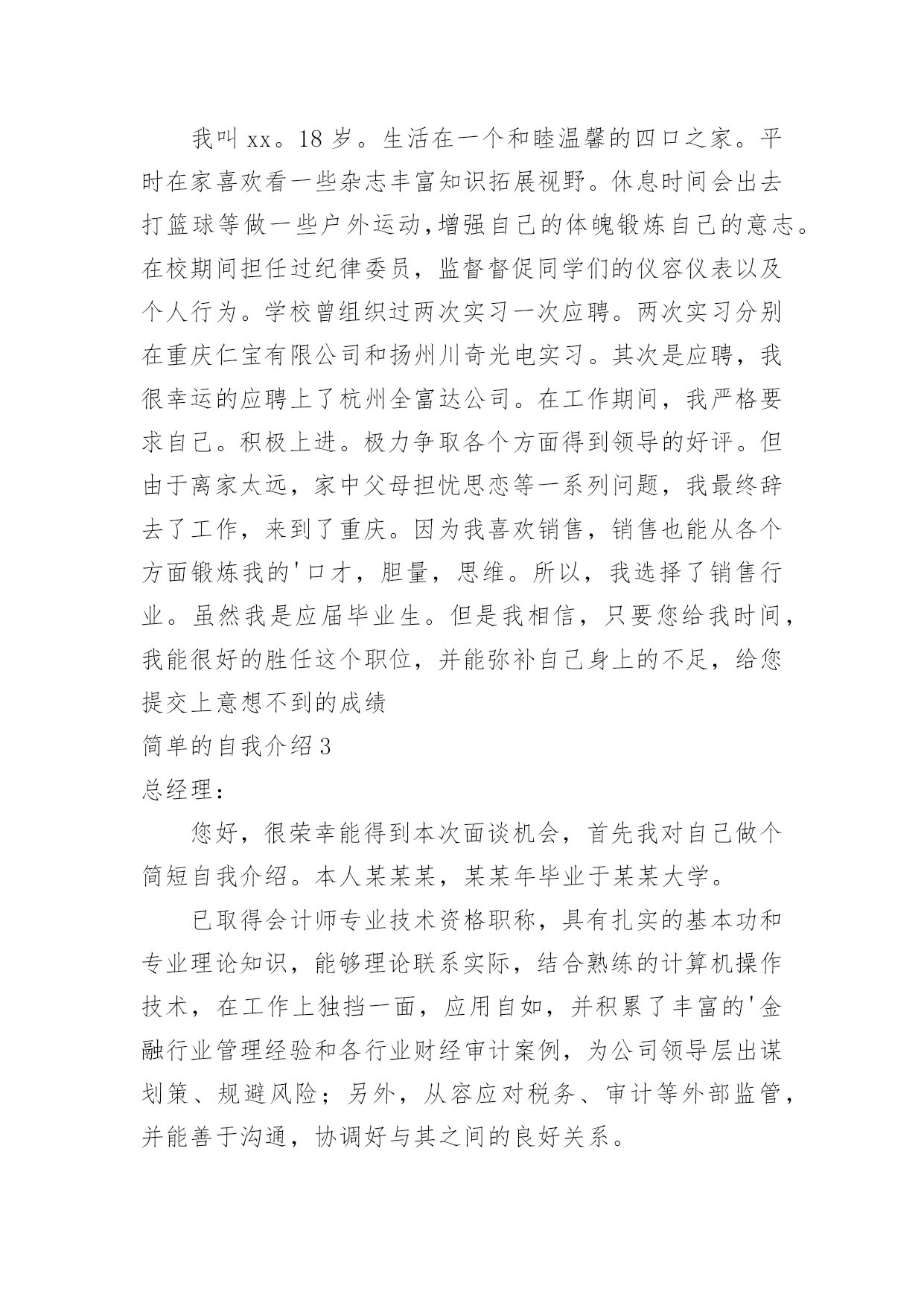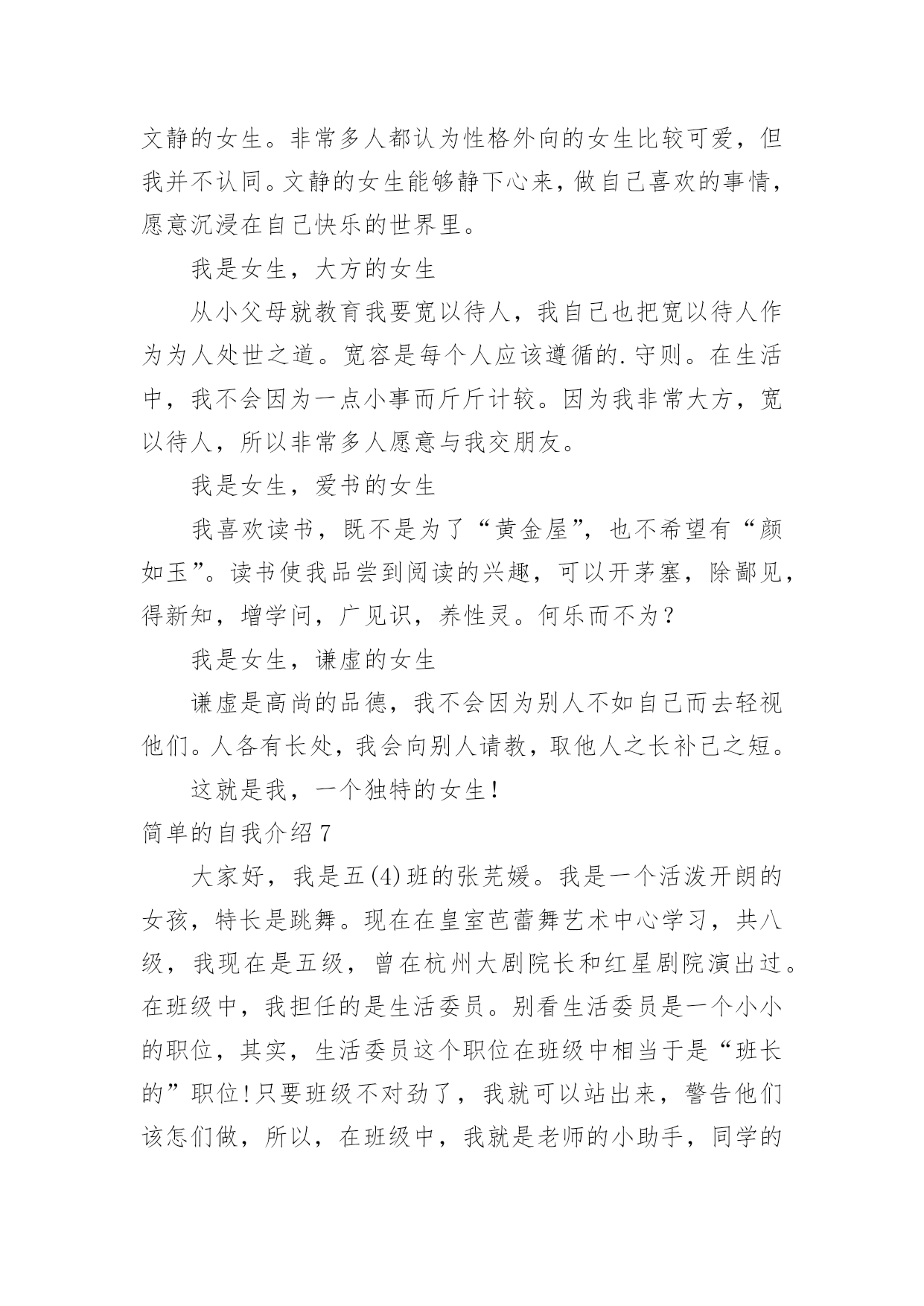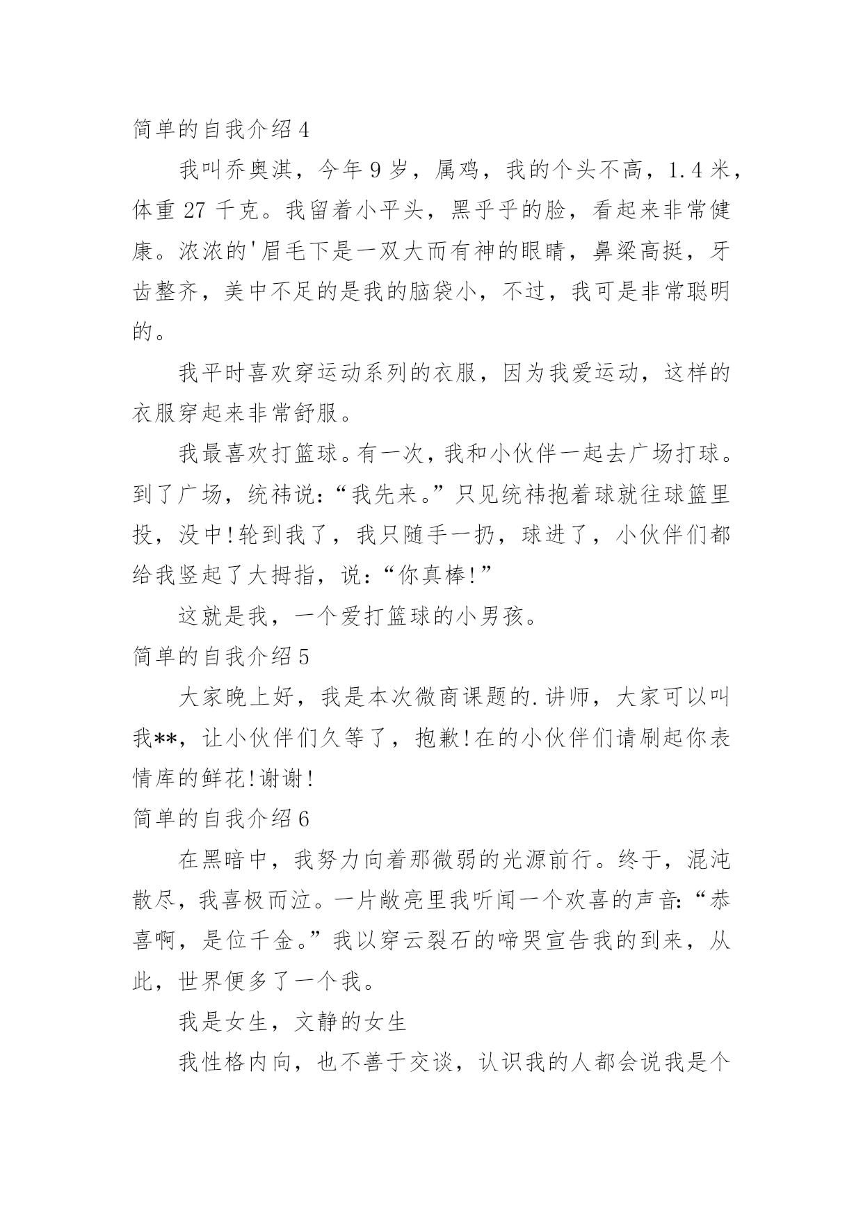 简单的自我介绍简单的自我介绍(必备15篇)当碰到不熟悉的人时,常常需要我们进行自我介绍,自我介绍可以满足我们渴望得到尊重的心理。写起自我介绍来就毫无头绪?下面是小编为大家收集的简单的自我介绍,希望能够帮助到大家。简单的自我介绍1尊敬的各位面试官:上午好。我叫XX,来自XX,目前就读于XX财经大学会计研三。很高兴能参加这次交行的面试,有机会向各位介绍基础知识扎实、细心负责谨慎、热情友好大方的我。我之所以想加入银行,是因为首先,我本科和硕士期间所学的专业都是会计专业,具有一定的财务金融知识;其次,我深知细节决定成败,无论学习和实习,一贯秉承严谨认真的`态度。再次,具有良好的服务意识,善于沟通,有较强的亲和力。最后也是最关键的一点,我从小就对数字特别敏感,喜欢和数字打交道,喜欢数学。所以我觉得我可以达到银行柜员工作的要求,并充分利用自己的优势将工作做好,做细,力求完美。希望有机会为交行服务,谢谢!简单的自我介绍2我叫xx。18岁。生活在一个和睦温馨的四口之家。平时在家喜欢看一些杂志丰富知识拓展视野。休息时间会出去打篮球等做一些户外运动,增强自己的体魄锻炼自己的意志。在校期间担任过纪律委员,监督督促同学们的仪容仪表以及个人行为。学校曾组织过两次实习一次应聘。两次实习分别在重庆仁宝有限公司和扬州川奇光电实习。其次是应聘,我很幸运的应聘上了杭州全富达公司。在工作期间,我严格要求自己。积极上进。极力争取各个方面得到领导的好评。但由于离家太远,家中父母担忧思恋等一系列问题,我最终辞去了工作,来到了重庆。因为我喜欢销售,销售也能从各个方面锻炼我的'口才,胆量,思维。所以,我选择了销售行业。虽然我是应届毕业生。但是我相信,只要您给我时间,我能很好的胜任这个职位,并能弥补自己身上的不足,给您提交上意想不到的成绩简单的自我介绍3总经理:您好,很荣幸能得到本次面谈机会,首先我对自己做个简短自我介绍。本人某某某,某某年毕业于某某大学。已取得会计师专业技术资格职称,具有扎实的基本功和专业理论知识,能够理论联系实际,结合熟练的计算机操作技术,在工作上独挡一面,应用自如,并积累了丰富的'金融行业管理经验和各行业财经审计案例,为公司领导层出谋划策、规避风险;另外,从容应对税务、审计等外部监管,并能善于沟通,协调好与其之间的良好关系。简单的自我介绍4我叫乔奥淇,今年9岁,属鸡,我的个头不高,1.4米,体重27千克。我留着小平头,黑乎乎的脸,看起来非常健康。浓浓的'眉毛下是一双大而有神的眼睛,鼻梁高挺,牙齿整齐,美中不足的是我的脑袋小,不过,我可是非常聪明的。我平时喜欢穿运动系列的衣服,因为我爱运动,这样的衣服穿起来非常舒服。我最喜欢打篮球。有一次,我和小伙伴一起去广场打球。到了广场,统祎说:“我先来。”只见统祎抱着球就往球篮里投,没中!轮到我了,我只随手一扔,球进了,小伙伴们都给我竖起了大拇指,说:“你真棒!”这就是我,一个爱打篮球的小男孩。简单的自我介绍5大家晚上好,我是本次微商课题的.讲师,大家可以叫我**,让小伙伴们久等了,抱歉!在的小伙伴们请刷起你表情库的鲜花!谢谢!简单的自我介绍6在黑暗中,我努力向着那微弱的光源前行。终于,混沌散尽,我喜极而泣。一片敞亮里我听闻一个欢喜的声音:“恭喜啊,是位千金。”我以穿云裂石的啼哭宣告我的到来,从此,世界便多了一个我。我是女生,文静的女生我性格内向,也不善于交谈,认识我的人都会说我是个文静的女生。非常多人都认为性格外向的女生比较可爱,但我并不认同。文静的女生能够静下心来,做自己喜欢的事情,愿意沉浸在自己快乐的世界里。我是女生,大方的女生从小父母就教育我要宽以待人,我自己也把宽以待人作为为人处世之道。宽容是每个人应该遵循的.守则。在生活中,我不会因为一点小事而斤斤计较。因为我非常大方,宽以待人,所以非常多人愿意与我交朋友。我是女生,爱书的女生我喜欢读书,既不是为了“黄金屋”,也不希望有“颜如玉”。读书使我品尝到阅读的兴趣,可以开茅塞,除鄙见,得新知,增学问,广见识,养性灵。何乐而不为?我是女生,谦虚的女生谦虚是高尚的品德,我不会因为别人不如自己而去轻视他们。人各有长处,我会向别人请教,取他人之长补己之短。这就是我,一个独特的女生!简单的自我介绍7大家好,我是五(4)班的张芫媛。我是一个活泼开朗的女孩,特长是跳舞。现在在皇室芭蕾舞艺术中心学习,共八级,我现在是五级,曾在杭州大剧院长和红星剧院演出过。在班级中,我担任的是生活委员。别看生活委员是一个小小的职位,其实,生活委员这个职位在班级中相当于是“班长的”职位!只要班级不对劲了,我就可以站出来,警告他们该怎们做,所以,在班级中,我就是老师的小助手,同学的好伙伴。在家里,我经常帮助爸妈妈打扫卫爸生,如果爸爸妈妈不在家那我就更开心了,因为我可以把家里打扫的'干干净净。简单的
