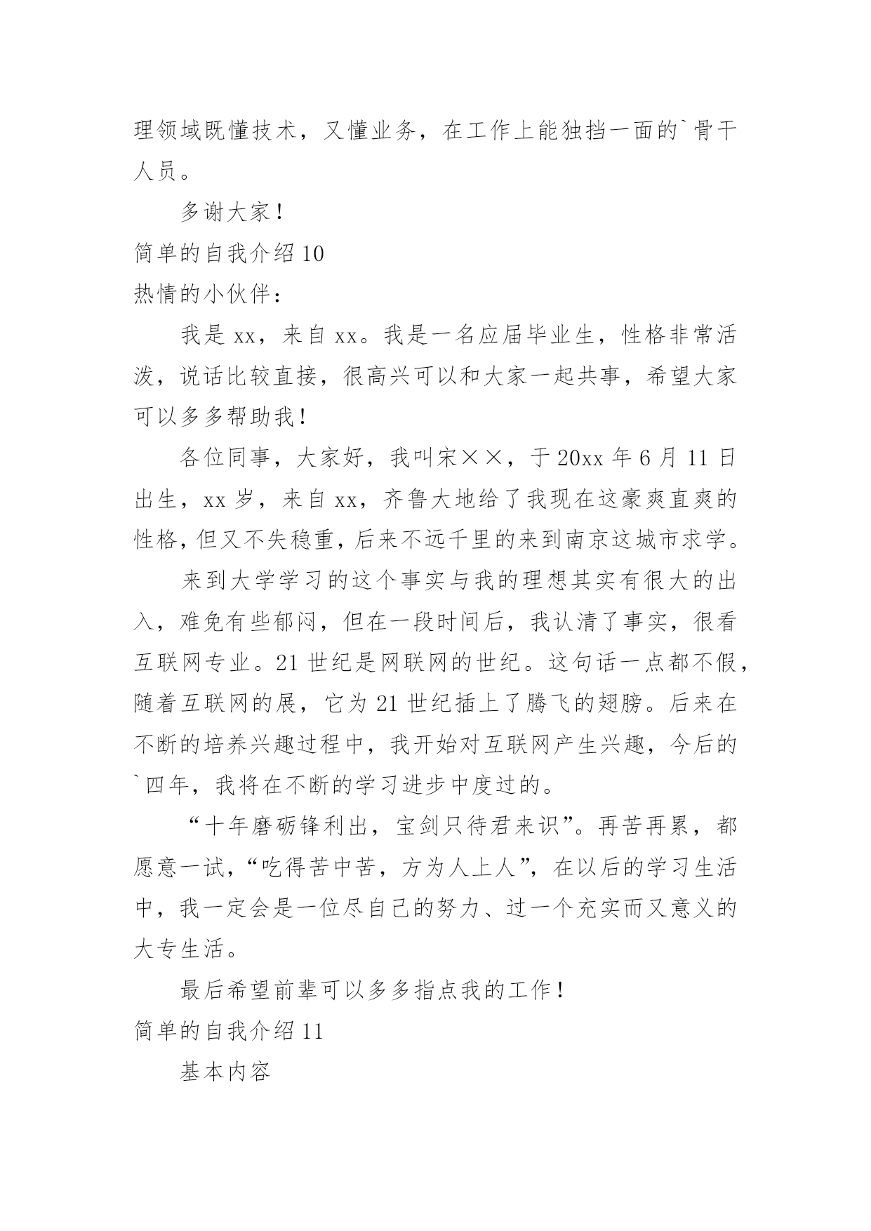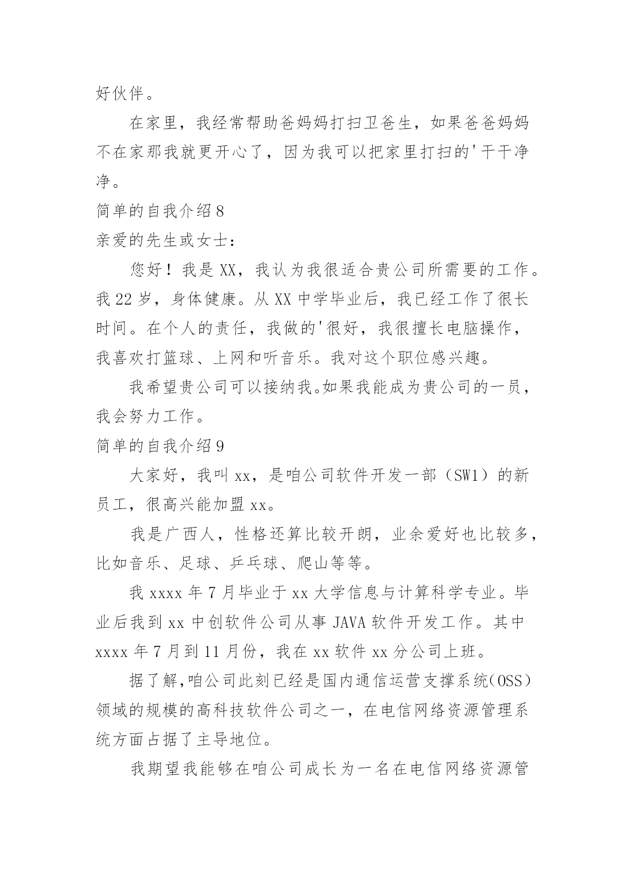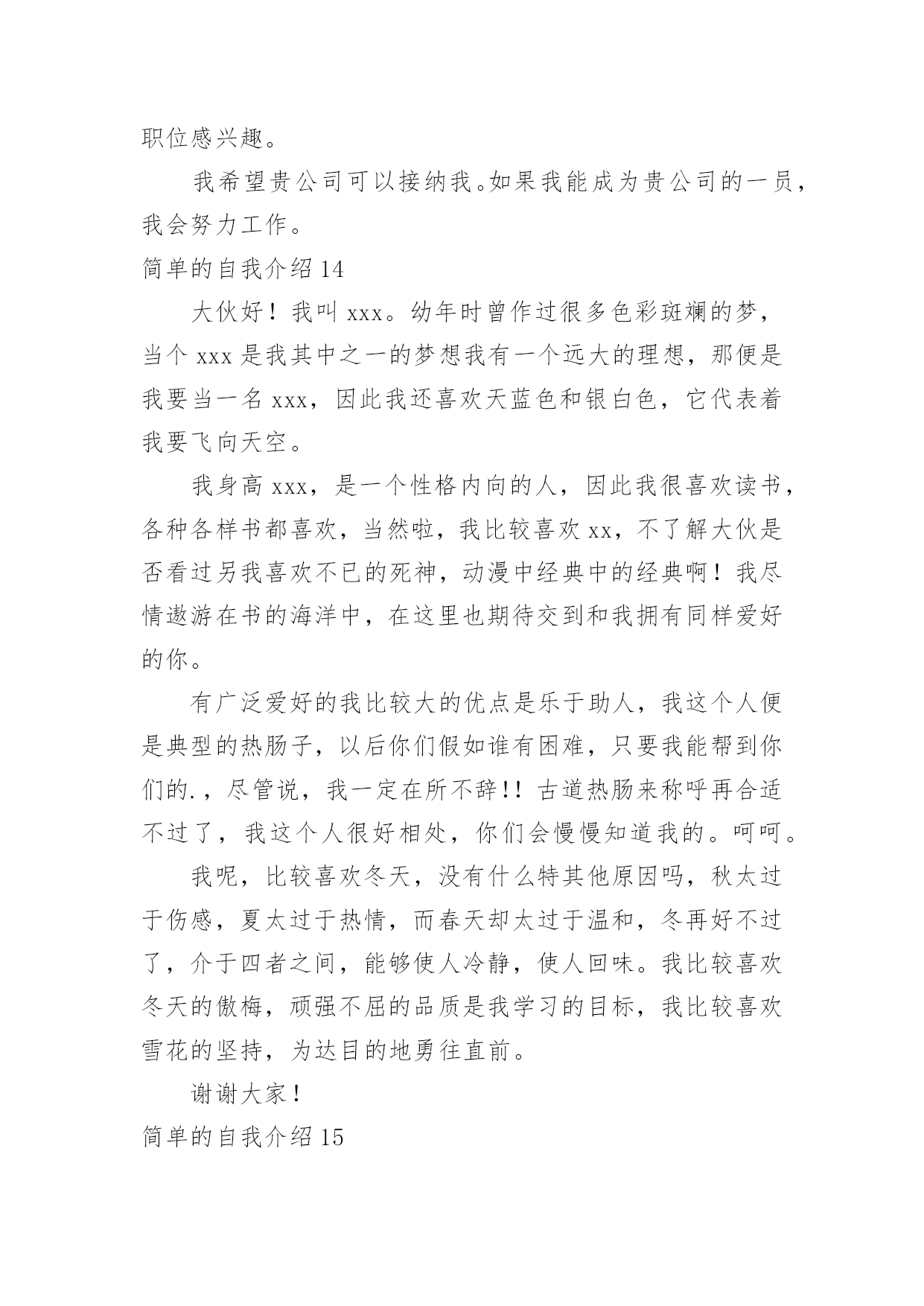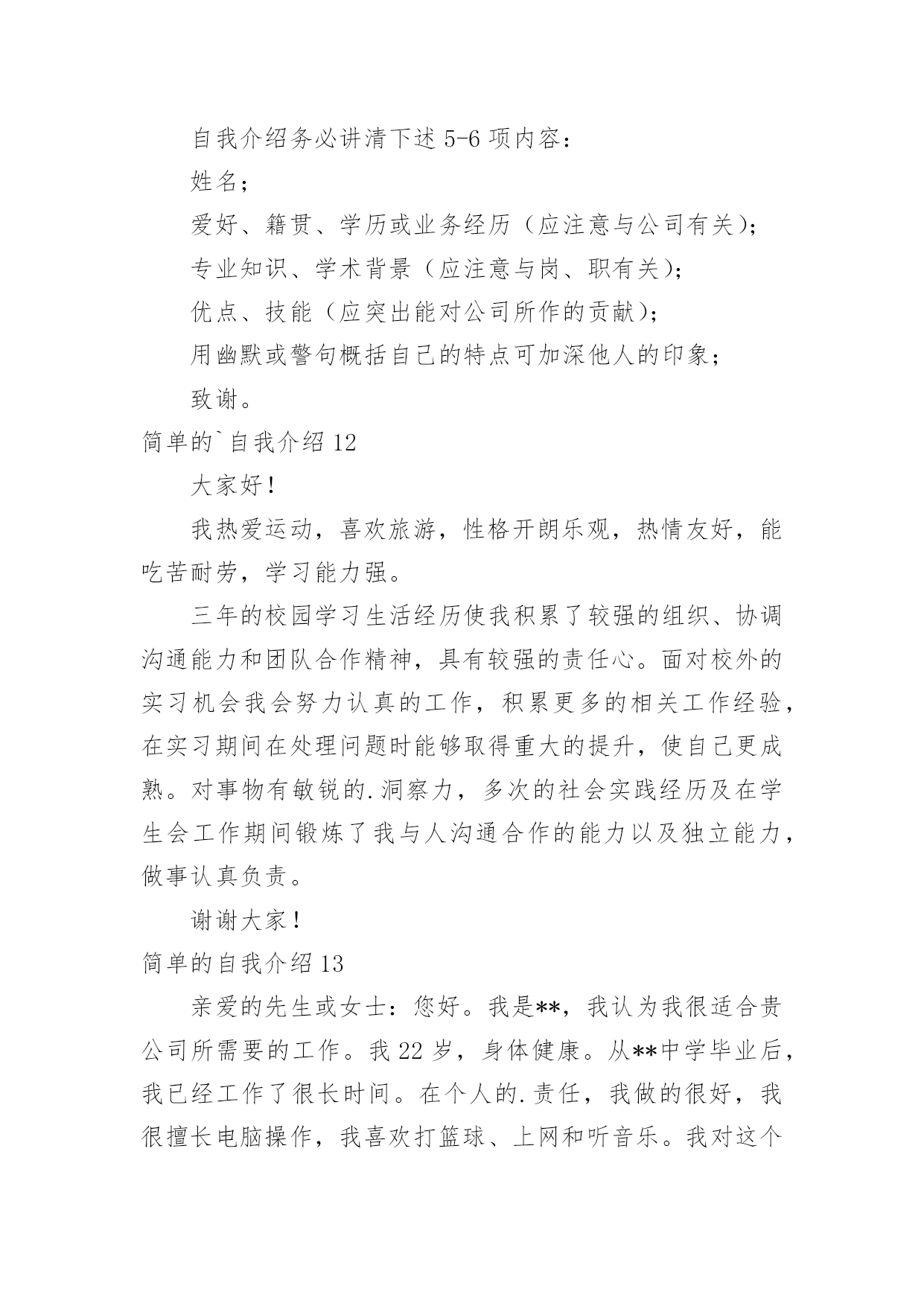 简单的自我介绍简单的自我介绍(必备15篇)当碰到不熟悉的人时,常常需要我们进行自我介绍,自我介绍可以满足我们渴望得到尊重的心理。写起自我介绍来就毫无头绪?下面是小编为大家收集的简单的自我介绍,希望能够帮助到大家。简单的自我介绍1尊敬的各位面试官:上午好。我叫XX,来自XX,目前就读于XX财经大学会计研三。很高兴能参加这次交行的面试,有机会向各位介绍基础知识扎实、细心负责谨慎、热情友好大方的我。我之所以想加入银行,是因为首先,我本科和硕士期间所学的专业都是会计专业,具有一定的财务金融知识;其次,我深知细节决定成败,无论学习和实习,一贯秉承严谨认真的`态度。再次,具有良好的服务意识,善于沟通,有较强的亲和力。最后也是最关键的一点,我从小就对数字特别敏感,喜欢和数字打交道,喜欢数学。所以我觉得我可以达到银行柜员工作的要求,并充分利用自己的优势将工作做好,做细,力求完美。希望有机会为交行服务,谢谢!简单的自我介绍2我叫xx。18岁。生活在一个和睦温馨的四口之家。平时在家喜欢看一些杂志丰富知识拓展视野。休息时间会出去打篮球等做一些户外运动,增强自己的体魄锻炼自己的意志。在校期间担任过纪律委员,监督督促同学们的仪容仪表以及个人行为。学校曾组织过两次实习一次应聘。两次实习分别在重庆仁宝有限公司和扬州川奇光电实习。其次是应聘,我很幸运的应聘上了杭州全富达公司。在工作期间,我严格要求自己。积极上进。极力争取各个方面得到领导的好评。但由于离家太远,家中父母担忧思恋等一系列问题,我最终辞去了工作,来到了重庆。因为我喜欢销售,销售也能从各个方面锻炼我的'口才,胆量,思维。所以,我选择了销售行业。虽然我是应届毕业生。但是我相信,只要您给我时间,我能很好的胜任这个职位,并能弥补自己身上的不足,给您提交上意想不到的成绩简单的自我介绍3总经理:您好,很荣幸能得到本次面谈机会,首先我对自己做个简短自我介绍。本人某某某,某某年毕业于某某大学。已取得会计师专业技术资格职称,具有扎实的基本功和专业理论知识,能够理论联系实际,结合熟练的计算机操作技术,在工作上独挡一面,应用自如,并积累了丰富的'金融行业管理经验和各行业财经审计案例,为公司领导层出谋划策、规避风险;另外,从容应对税务、审计等外部监管,并能善于沟通,协调好与其之间的良好关系。简单的自我介绍4我叫乔奥淇,今年9岁,属鸡,我的个头不高,1.4米,体重27千克。我留着小平头,黑乎乎的脸,看起来非常健康。浓浓的'眉毛下是一双大而有神的眼睛,鼻梁高挺,牙齿整齐,美中不足的是我的脑袋小,不过,我可是非常聪明的。我平时喜欢穿运动系列的衣服,因为我爱运动,这样的衣服穿起来非常舒服。我最喜欢打篮球。有一次,我和小伙伴一起去广场打球。到了广场,统祎说:“我先来。”只见统祎抱着球就往球篮里投,没中!轮到我了,我只随手一扔,球进了,小伙伴们都给我竖起了大拇指,说:“你真棒!”这就是我,一个爱打篮球的小男孩。简单的自我介绍5大家晚上好,我是本次微商课题的.讲师,大家可以叫我**,让小伙伴们久等了,抱歉!在的小伙伴们请刷起你表情库的鲜花!谢谢!简单的自我介绍6在黑暗中,我努力向着那微弱的光源前行。终于,混沌散尽,我喜极而泣。一片敞亮里我听闻一个欢喜的声音:“恭喜啊,是位千金。”我以穿云裂石的啼哭宣告我的到来,从此,世界便多了一个我。我是女生,文静的女生我性格内向,也不善于交谈,认识我的人都会说我是个文静的女生。非常多人都认为性格外向的女生比较可爱,但我并不认同。文静的女生能够静下心来,做自己喜欢的事情,愿意沉浸在自己快乐的世界里。我是女生,大方的女生从小父母就教育我要宽以待人,我自己也把宽以待人作为为人处世之道。宽容是每个人应该遵循的.守则。在生活中,我不会因为一点小事而斤斤计较。因为我非常大方,宽以待人,所以非常多人愿意与我交朋友。我是女生,爱书的女生我喜欢读书,既不是为了“黄金屋”,也不希望有“颜如玉”。读书使我品尝到阅读的兴趣,可以开茅塞,除鄙见,得新知,增学问,广见识,养性灵。何乐而不为?我是女生,谦虚的女生谦虚是高尚的品德,我不会因为别人不如自己而去轻视他们。人各有长处,我会向别人请教,取他人之长补己之短。这就是我,一个独特的女生!简单的自我介绍7大家好,我是五(4)班的张芫媛。我是一个活泼开朗的女孩,特长是跳舞。现在在皇室芭蕾舞艺术中心学习,共八级,我现在是五级,曾在杭州大剧院长和红星剧院演出过。在班级中,我担任的是生活委员。别看生活委员是一个小小的职位,其实,生活委员这个职位在班级中相当于是“班长的”职位!只要班级不对劲了,我就可以站出来,警告他们该怎们做,所以,在班级中,我就是老师的小助手,同学的好伙伴。在家里,我经常帮助爸妈妈打扫卫爸生,如果爸爸妈妈不在家那我就更开心了,因为我可以把家里打扫的'干干净净。简单的