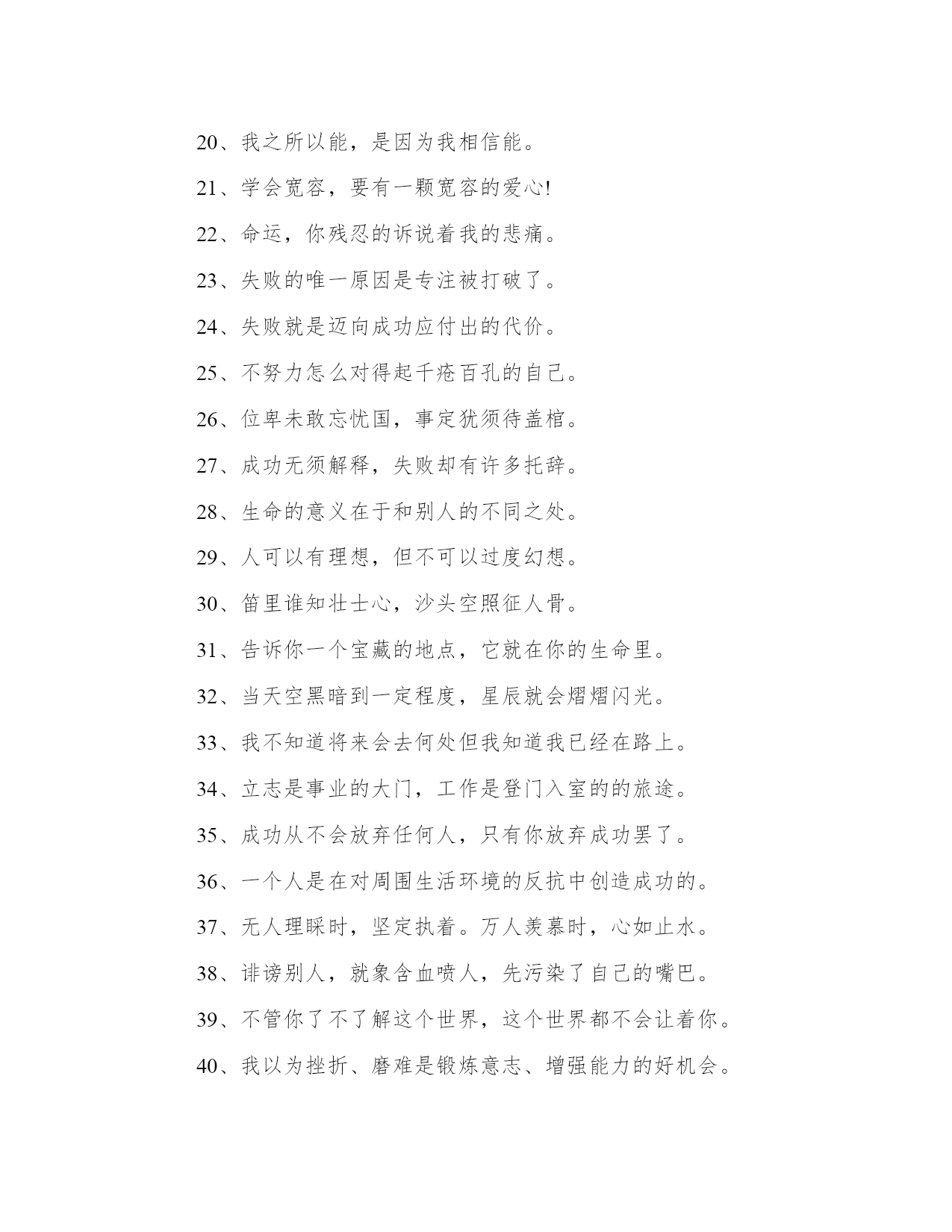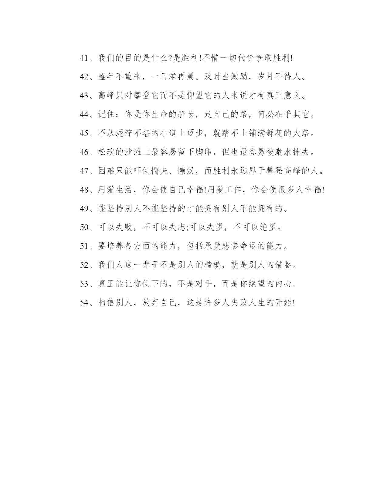 2024年励志精美句子工作报告1、一寸光阴一寸金,寸金难买寸光阴。2、成功并非重要的事,重要的是努力。3、有志始知蓬莱近,无为总觉咫尺远。4、付出不一定有收获,努力了就值得了。5、活鱼会逆流而上,死鱼才会随波逐流。6、前方一片迷雾,不是我自己,是世界。7、梦是心灵的思想,是我们的秘密真情。8、困难里包含着胜利,失败里孕育着成功。9、在逆境中,智者知难而进,愚者消沉不前。10、失去只是一种姿势,得到并不等同于幸福。11、我们的安全感,来自于充分体验不安全感。12、九十九次的理论不如一次的行动来得实际。13、没有灯的小路一样可以行走,只要心还在。14、什么是天才!我想,天才就是勤奋的结果。15、不要沉沦,在任何环境中你都可以选择奋起。16、当你没有借口的那一刻,就是你成功的开始。17、我们看错了这个世界,却说世界欺骗了我们。18、穿透石头的水滴,它的力量来源于日积月累。19、没有伞的孩子,必须努力奔跑!20、我之所以能,是因为我相信能。21、学会宽容,要有一颗宽容的爱心!22、命运,你残忍的诉说着我的悲痛。23、失败的唯一原因是专注被打破了。24、失败就是迈向成功应付出的代价。25、不努力怎么对得起千疮百孔的自己。26、位卑未敢忘忧国,事定犹须待盖棺。27、成功无须解释,失败却有许多托辞。28、生命的意义在于和别人的不同之处。29、人可以有理想,但不可以过度幻想。30、笛里谁知壮士心,沙头空照征人骨。31、告诉你一个宝藏的地点,它就在你的生命里。32、当天空黑暗到一定程度,星辰就会熠熠闪光。33、我不知道将来会去何处但我知道我已经在路上。34、立志是事业的大门,工作是登门入室的的旅途。35、成功从不会放弃任何人,只有你放弃成功罢了。36、一个人是在对周围生活环境的反抗中创造成功的。37、无人理睬时,坚定执着。万人羡慕时,心如止水。38、诽谤别人,就象含血喷人,先污染了自己的嘴巴。39、不管你了不了解这个世界,这个世界都不会让着你。40、我以为挫折、磨难是锻炼意志、增强能力的好机会。41、我们的目的是什么?是胜利!不惜一切代价争取胜利!42、盛年不重来,一日难再晨。及时当勉励,岁月不待人。43、高峰只对攀登它而不是仰望它的人来说才有真正意义。44、记住:你是你生命的船长,走自己的路,何必在乎其它。45、不从泥泞不堪的小道上迈步,就踏不上铺满鲜花的大路。46、松软的沙滩上最容易留下脚印,但也最容易被潮水抹去。47、困难只能吓倒懦夫、懒汉,而胜利永远属于攀登高峰的人。48、用爱生活,你会使自己幸福!用爱工作,你会使很多人幸福!49、能坚持别人不能坚持的才能拥有别人不能拥有的。50、可以失败,不可以失志;可以失望,不可以绝望。51、要培养各方面的能力,包括承受悲惨命运的能力。52、我们人这一辈子不是别人的楷模,就是别人的借鉴。53、真正能让你倒下的,不是对手,而是你绝望的内心。54、相信别人,放弃自己,这是许多人失败人生的开始!