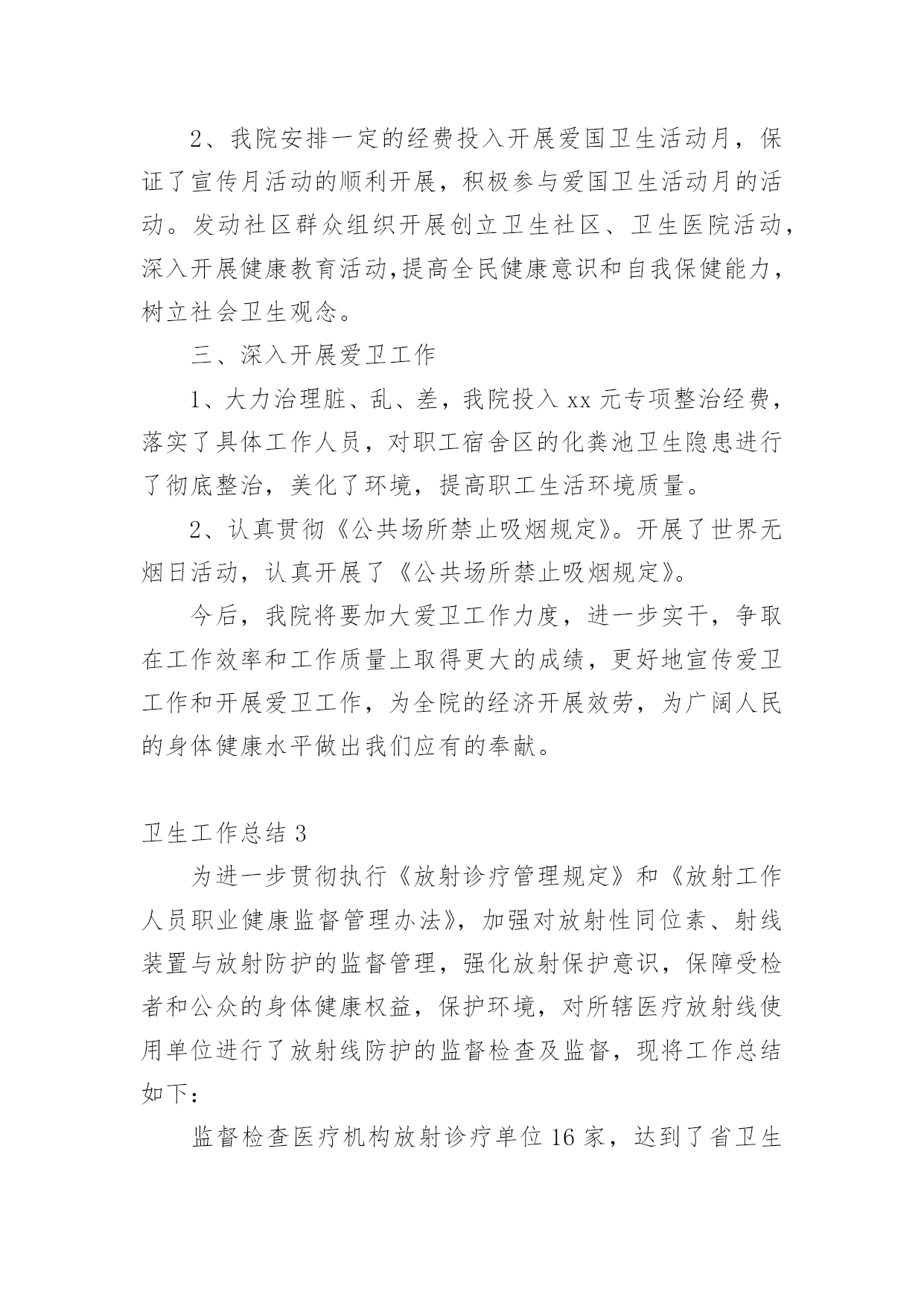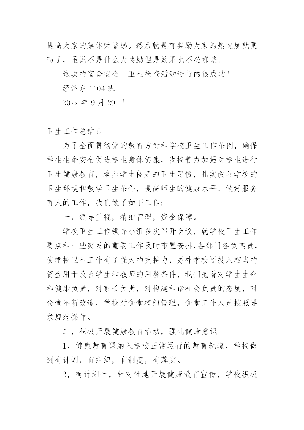 卫生工作总结卫生工作总结15篇(精品)总结是指对某一阶段的工作、学习或思想中的经验或情况加以总结和概括的书面材料,它有助于我们寻找工作和事物发展的规律,从而掌握并运用这些规律,因此十分有必须要写一份总结哦。总结怎么写才不会流于形式呢?以下是小编帮大家整理的卫生工作总结,欢迎阅读,希望大家能够喜欢。卫生工作总结1卫生工作是学校工作的一个重要组成部分。为了提高学生的卫生意识,使之养成良好的卫生习惯,净化、美化校园环境,学校领导对此十分重视,构成了校长亲自抓、教导处和政教处配合抓、班主任督促、值日教师及少先队协助抓的齐抓共管的局面,使我校的卫生工作取得了可喜的成绩,受到各级领导的夸赞。现将工作总结如下:1、健全卫生组织管理为了进一步提高卫生的管理质量,校长亲自组织,构成了“校长亲自抓、教导处配合抓、班主任亲力抓、值日教师及学生协助抓”的卫生管理层层抓的局面,确保了卫生管理渠道的畅通。2、制定卫生管理制度俗话说,没有规矩不成方圆。为了使学校的`卫生管理有章可循,提高卫生管理的质量,学期初,学校针对本校的卫生状况,制定了《卫生检查标准》并提出了教室、包干区每一天两小扫一大扫(早上、中午各小扫一次,下午放学后大扫一次)、办公室一天一大扫、电脑室每节课一小扫一周一大扫的规定。3、健全卫生职责制,把卫生职责落实到班、到人学期初,学校针对校园的布局,划分出若干卫生区域,再把相应的卫生区域分配到班、到人。如,教室、走廊的卫生由本班负责,校园的卫生由各班共同负责,每班负责由学校指定的包干区卫生;厕所卫生由五年级清扫;办公室的卫生由教师轮值,每一天指定专人负责;各室的卫生由专人负责安排学生做好清扫工作。这样,任务明确了,职责落实了,卫生工作也做得扎实了。4、加强卫生保健宣传教育为了提高学生的卫生意识、保健潜力,养成良好的卫生习惯,学校领导、教师十分重视卫生宣传教育工作:(1)、校长、主任经常利用晨会、国旗下的讲话向学生宣讲卫生的重要性,让学生明白讲究卫生光荣,不讲卫生的可耻,提高学生的卫生意识。(2)、各班班主任在班里做到时时讲、天天讲、针对问题着重讲,不断纠正学生的不良卫生习惯,使学生逐渐养成良好的卫生习惯,掌握必须的卫生保健知识。(3)、利用黑板报宣传卫生保健知识,提高学生的卫生保健意识和潜力。(4)、举行卫生保健知识讲座,促进他们的健康成长。卫生保健知识由专人负责,做到有主题、有针对,定期开展。每学期进行两次慢性病的教育,做到有教案、有课件、有图片,使学生明白什么是慢性病,了解有关的常识,并用所学的知识进行相关的宣传。(5)、引导学生对废弃物进行分类丢放,利用可回收资源,增强学生的环保意识。5、加强卫生监督力度,提高卫生管理效果为了提高卫生管理效果,本学期,学校在卫生工作中十分重视加强卫生的监督力度,如:(1)、每一天课前安排学校少先队值日生(值日领导及值日教师协助)对各班教室、包干区的卫生进行检查、评比量化,并把检查结果于第二天在校务日志中公布。此外,在其它时段,由专门负责该工作的教师安排值日生对各班的卫生状况进行不定时的突击检查,检查结果及时公布。(2)、把各班的卫生状况纳入礼貌班评比。(3)、设立卫生监督岗。每节课下课之后,学校要求各班都要安排卫生监督员在本班所负责的教室、走廊、包干区值勤上岗,发现垃圾,及时清理,发现不良行为,及时指正或向老师上报。以上是我校在卫生方面所做的一些工作,经过全校师生的共同努力,取得了一些可喜的成绩,但还要继续努力,不断地提高师生的卫生意识和自制力,使他们养成良好的卫生习惯,使我校的卫生工作再上一个新台阶。卫生工作总结2xx年,我院爱国卫生工作在区委、区政府和局爱卫办的指导下,在区党委的具体领导下,通过全院干部职工的努力,具体做了以下主要工作一、积极响应号召,广泛宣传爱国卫生的`活动我院的爱国卫生活动月以全民动手为主,广泛发动全院干部职工参与治理环境脏乱差,重点去除医院卫生死角、手术室、门诊部的公共厕所、门诊输液室等地方进行全面彻底地除四害活动,防止疾病传播,保障了群众健康,促进两个文明建设,我院利用拉横幅字幕标语的形式宣传卫生月标语和爱卫条例。如发动起来,讲究卫生,减少疾病,提高健康水平、人人参与爱国卫生月活动,等标语进行反复宣传,激发广阔人民性群众的卫生荣誉感,促使群众保护医院环境,自觉做到不乱扔、乱倒、乱吐,提高全民爱卫意识。二、抓环境卫生制度管理1、制定了卫生管理制度,落实责任,进行定期检查,我院在年初制定了爱国卫生工作意见,并成立了领导小组,主要领导全面负责,分管领导具体抓爱卫工作,各科室具体负责各办公室及门前的卫生工作,专职清洁工负责公共场所等的清洁卫生,并进行了院办公室组织定期和不定期检查,保证了全院清洁卫生工作有人管,有具体的人员做,保持医院的良好环境。2、我院安排一定的经费投入开展爱国卫