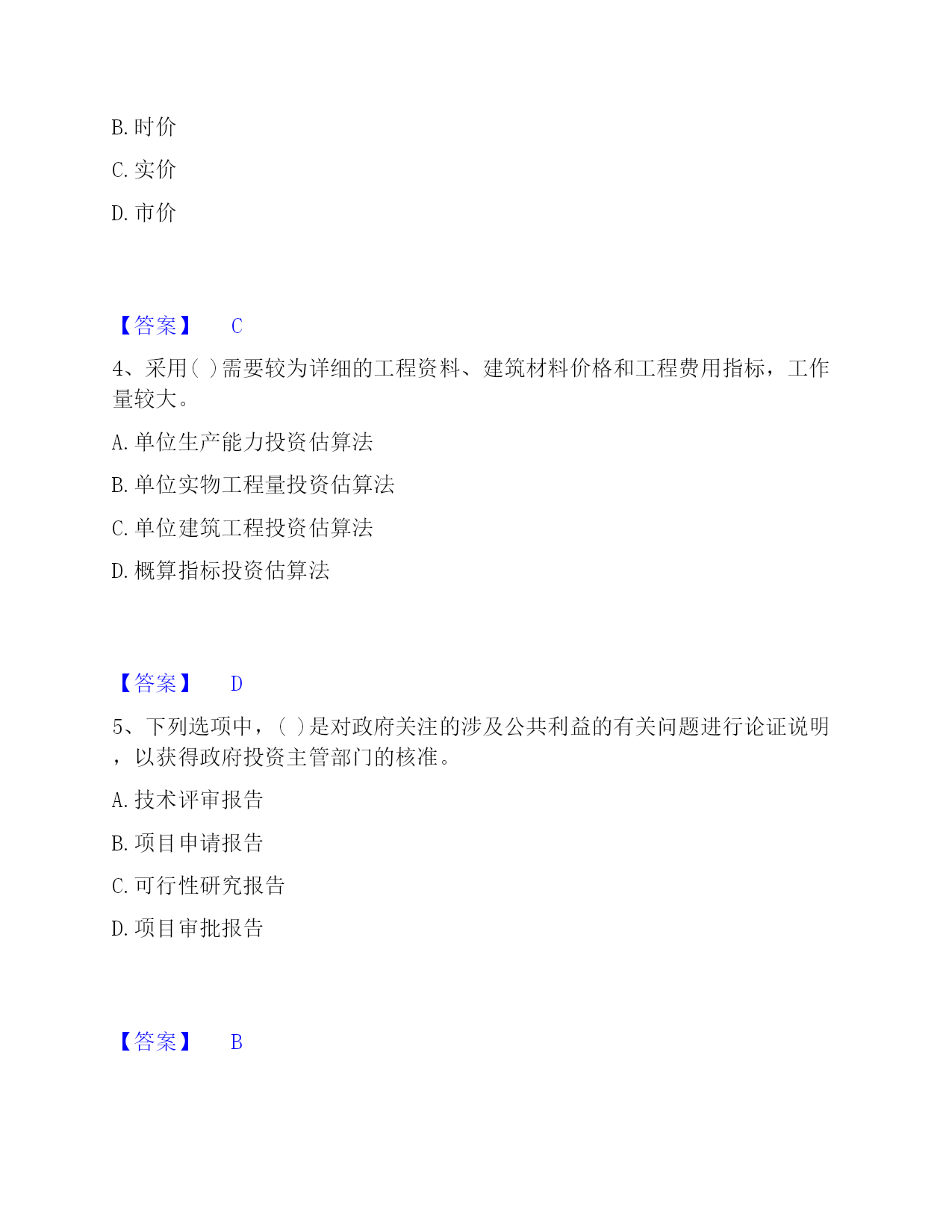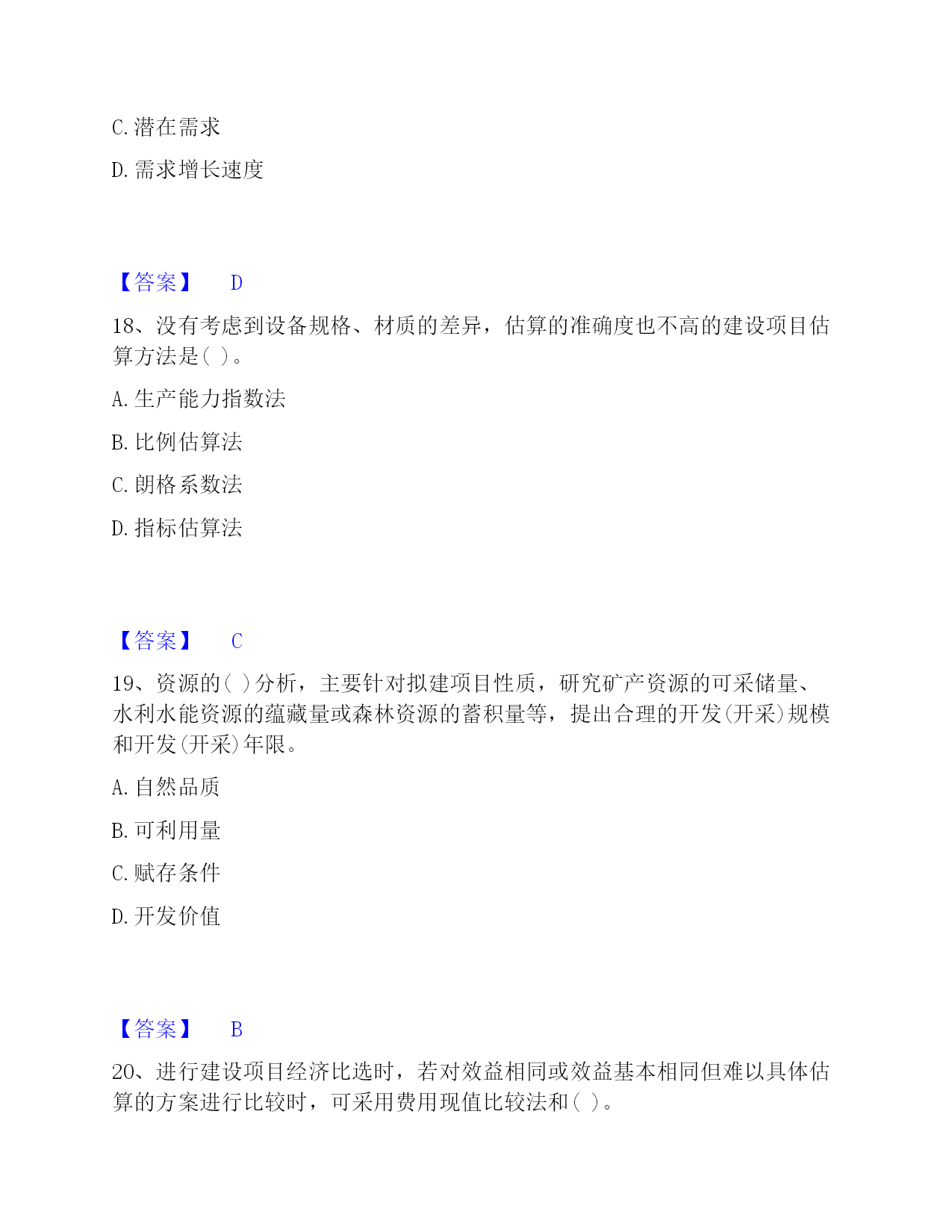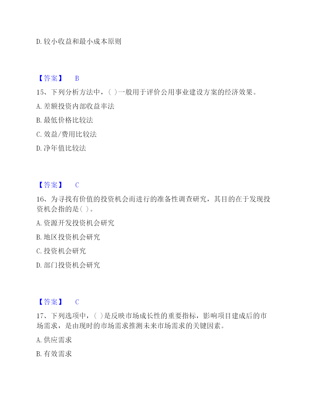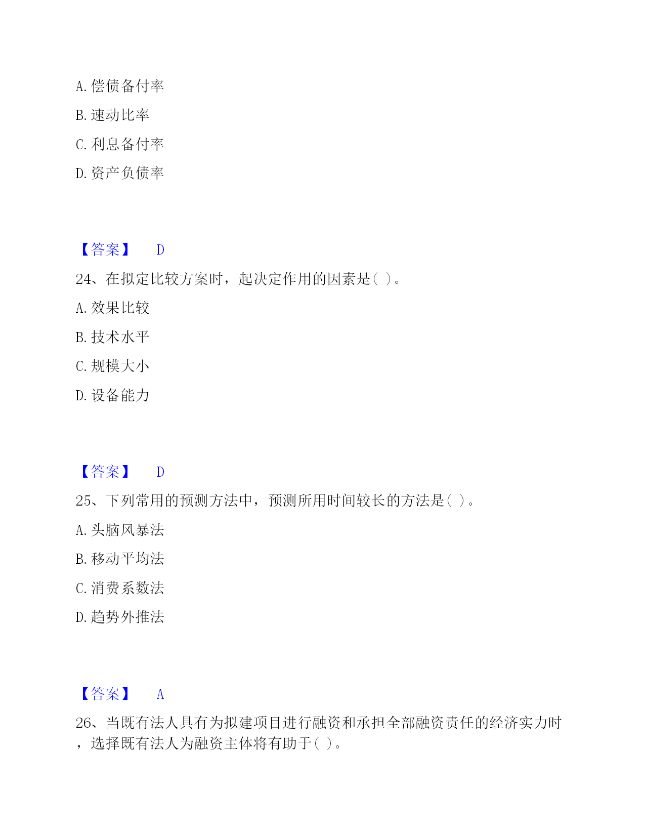 2022-2023年投资项目管理师之投资建设项目决策自我检测试卷A卷附答案单选题(共50题)1、在项目可行性研究阶段,应采用()和分类估算法。A.比例估算法B.系数估算法C.指标估算法D.生产能力指数法【答案】C2、如果扶贫是建设项目的(),则项目的关键利益相关者就应该是穷人,这就要求制定相应的瞄准机制和制度来真正保证贫困人口受益。A.关键目标B.首要目标C.次要目标D.重点目标【答案】B3、若能合理判断未来市场价格变动趋势,投入物和产出物可采用相对变动价格,即采用()。A.基价B.时价C.实价D.市价【答案】C4、采用()需要较为详细的工程资料、建筑材料价格和工程费用指标,工作量较大。A.单位生产能力投资估算法B.单位实物工程量投资估算法C.单位建筑工程投资估算法D.概算指标投资估算法【答案】D5、下列选项中,()是对政府关注的涉及公共利益的有关问题进行论证说明,以获得政府投资主管部门的核准。A.技术评审报告B.项目申请报告C.可行性研究报告D.项目审批报告【答案】B6、全面识别整个社会为项目付出的代价,以及项目为提高社会福利所作出的贡献,评价项目投资的()。A.客观真实性B.经济合理性C.科学系统性D.客观合理性【答案】B7、有甲、乙、丙、丁四个备选的技术方案,确定采用技术先进性、适用性、可靠性、安全性和经济性等标准进行评价,假定各项指标的重要性相同,各方案的评价分述见表。请对四个方案进行排序,应推荐的方案是()。A.方案甲B.方案乙C.方案丙D.方案丁【答案】B8、下列自然资源中,()对人类的农业生产起着决定性作用。A.物种资源B.矿产资源C.水资源D.气候资源【答案】D9、按照生产能力指数法(n=0.8,CF=1.1).如将设计中的化工生产系统的生产能力提高到3倍,投资额将增加()。A.118.9%B.158.3%C.164.9%D.191.5%【答案】C10、下列不属于进口从属费用的是()。A.国外运费B.国外运输保险费C.进口关税D.海关管理费【答案】D11、()是指能使项目计算期内各年净现金流量累计等于零时的折现率。A.财务内部收益率B.财务净现值C.项目资本金净利润率D.项目投资回收期【答案】A12、对建设期投入物价格,由于需要预测的年限较短,既要考虑相对价格变动因素,又要考虑价格总水平变动因素,即应采用()。A.时价B.现价C.实价D.基价【答案】A13、某建设项目年设计生产能力为10000台,产品单台销售价格为800元,年固定成本为132万元,单台产品可变成本360元,单台产品销售税金为40元,则盈亏平衡点为()台。A.3000B.3500C.3200D.3300【答案】D14、从经济效益的角度来考察评价项目技术方案,经济性体现为()。A.最大收益和最大成本原则B.最大收益和最小成本原则C.较小收益和最大成本原则D.较小收益和最小成本原则【答案】B15、下列分析方法中,()一般用于评价公用事业建设方案的经济效果。A.差额投资内部收益率法B.最低价格比较法C.效益/费用比较法D.净年值比较法【答案】C16、为寻找有价值的投资机会而进行的准备性调查研究,其目的在于发现投资机会指的是()。A.资源开发投资机会研究B.地区投资机会研究C.投资机会研究D.部门投资机会研究【答案】C17、下列选项中,()是反映市场成长性的重要指标,影响项目建成后的市场需求,是由现时的市场需求推测未来市场需求的关键因素。A.供应需求B.有效需求C.潜在需求D.需求增长速度【答案】D18、没有考虑到设备规格、材质的差异,估算的准确度也不高的建设项目估算方法是()。A.生产能力指数法B.比例估算法C.朗格系数法D.指标估算法【答案】C19、资源的()分析,主要针对拟建项目性质,研究矿产资源的可采储量、水利水能资源的蕴藏量或森林资源的蓄积量等,提出合理的开发(开采)规模和开发(开采)年限。A.自然品质B.可利用量C.赋存条件D.开发价值【答案】B20、进行建设项目经济比选时,若对效益相同或效益基本相同但难以具体估算的方案进行比较时,可采用费用现值比较法和()。A.净年值比较法B.水平分析法C.垂直分析法D.等额年费用比较法【答案】D21、企业或机构投资者委托的评估项目,其重点评估项目是()。A.侧重于项目的经济及社会影响评价B.分析论证资源配置的合理性C.侧重于分析融资主体的清偿能力D.评估盈利能力、资金的流动性等