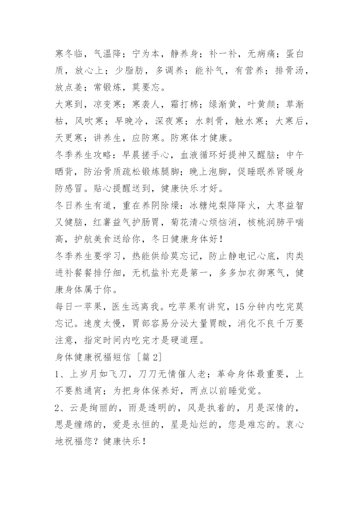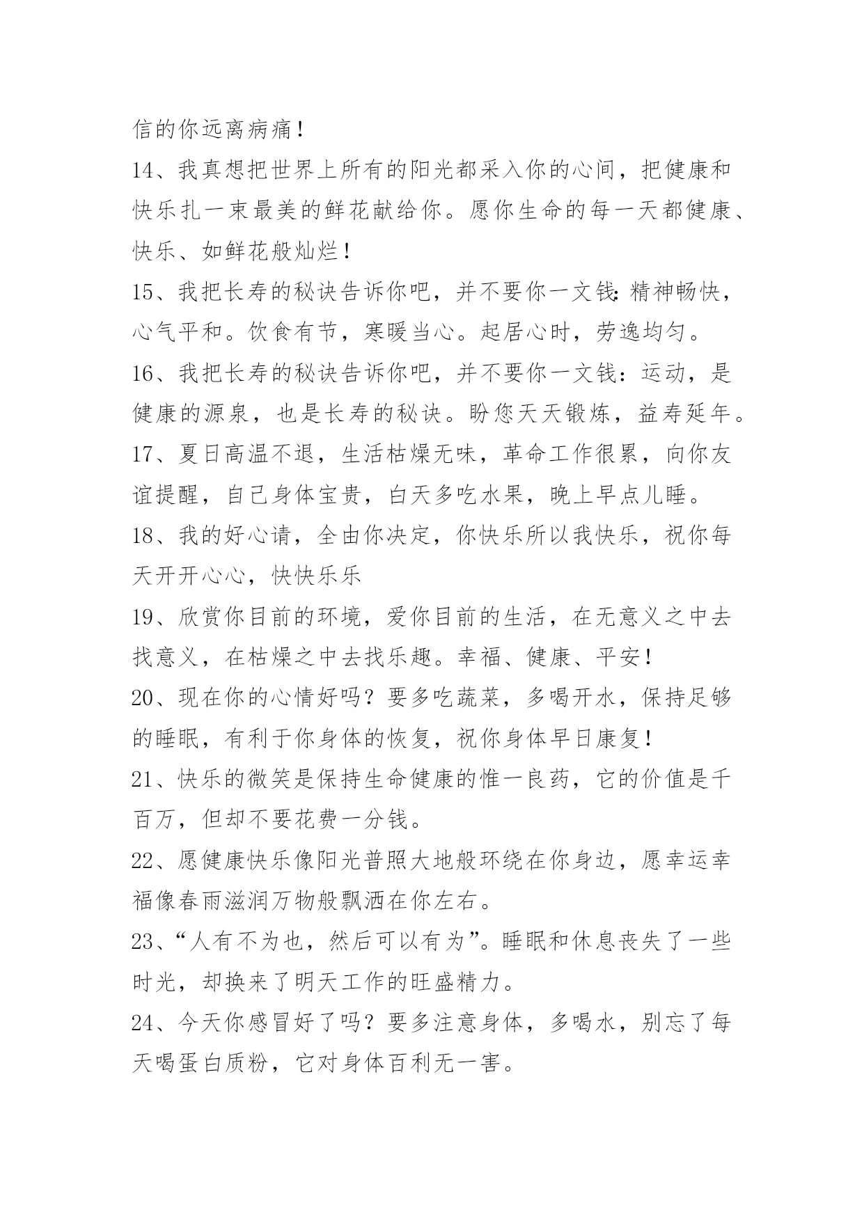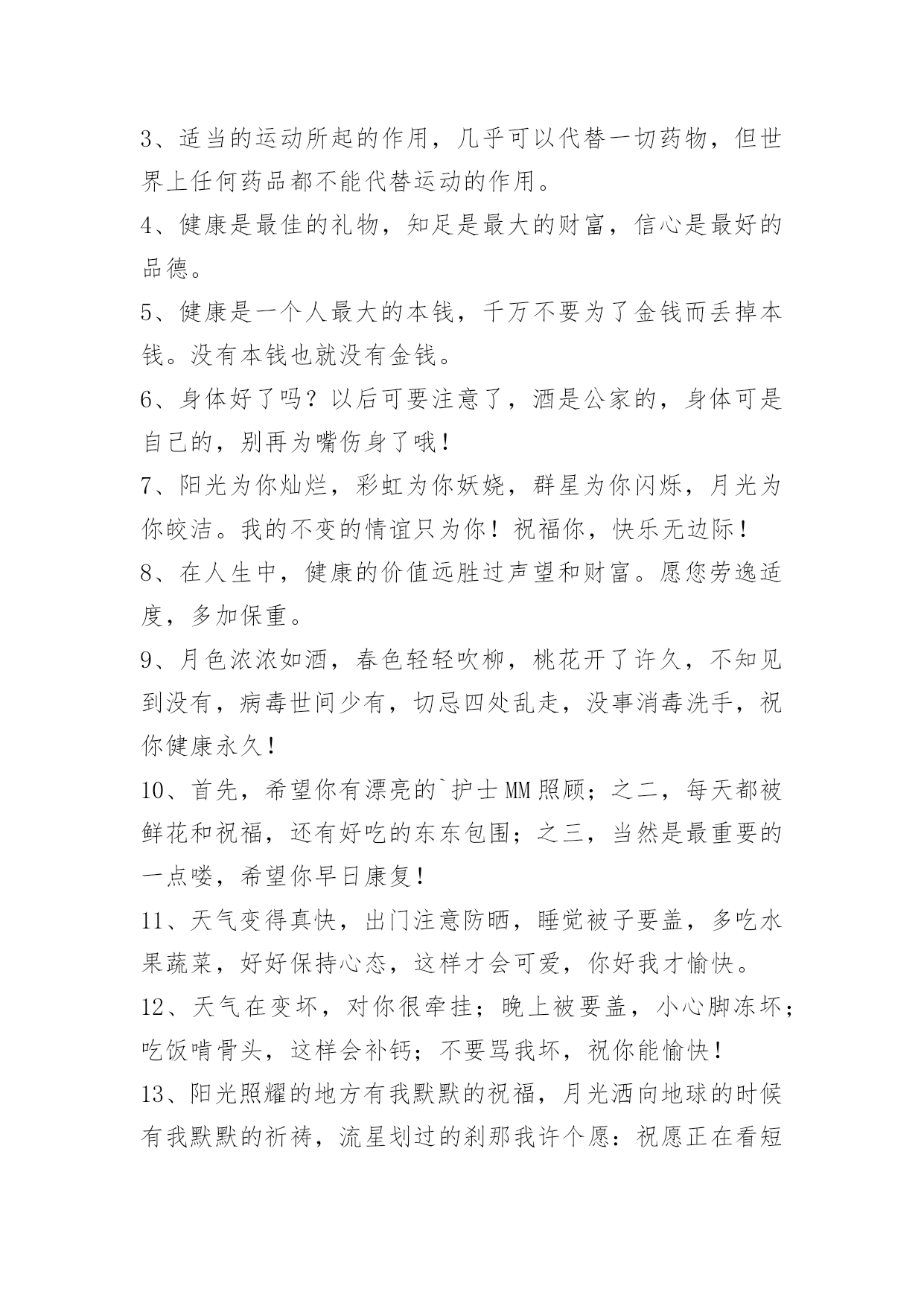 身体健康祝福短信身体健康祝福短信冬季进补选红枣,滋阴润燥还补气,外加银耳和百合,进补功效没得说。黑米、黑豆、黑食品餐餐不能忘。鸡肉、鸭汤也要补,补血养肾数第一。冬季养生听我讲:萝卜多吃有好处,化痰止咳不用医生开药方;进补之时先引补,牛肉、红枣加红糖,调理脾胃不用忙;黄豆、山药和栗子,补气养血它最棒!食醋解酒:食醋能解酒,主要是由于酒中的乙醇与食醋中的机酸,随立脚点消化吸收,在人体的胃肠内相遇而起醋化反应,从而减轻了酒精的毒性。早睡又早起,作息时间要调好;每天八杯水,排毒养颜有疗效;水果餐餐有,青春不会老;不用化妆品,皮肤照样好;不碰烧烤肉,癌症不见了。冬季精神调养要注意,凡事看开莫动气,宁静为本养元气,出门走走莫忘记,多多锻炼有力气,快快乐乐心欢喜,健康身体属于你。寒冬又到,脂肪要少;平日多补,蛋白重要;纤维少沾,蔗糖不能少;维生素补充,适当就好;食盐属咸,过度不好;健康养生,陪你过冬。只道是,岁月容易把人抛:少了俊俏,多了唠叨,老了容貌,呆了头脑。看如今,物价也易把人抛:薄了烧饼,瘦了油条,瘪了钱包,添了烦恼。寒冬临,气温降;宁为本,静养身;补一补,无病痛;蛋白质,放心上;少脂肪,多调养;能补气,有营养;排骨汤,放点姜;常锻炼,莫要忘。大寒到,凉变寒;寒袭人,霜打棉;绿渐黄,叶黄颜;草渐枯,风吹寒;早晚冷,深夜寒;水刺骨,触水寒;大寒后,天更寒;讲养生,应防寒。防寒体才健康。冬季养生攻略:早晨搓手心,血液循环好提神又醒脑;中午晒背,防治骨质疏松锻炼腿脚;晚上泡脚,促睡眠养肾暖身防感冒。贴心提醒送到,健康快乐才好。冬日养生有道,重在养阴除燥:冰糖炖梨降降火,大枣益智又健脑,红薯益气护肠胃,菊花清心烦恼消,核桃润肺平喘高,护航美食送给你,冬日健康身体好!冬季养生要学习,热能供给莫忘记,防止静电记心底,肉类进补餐餐排仔细,无机盐补充是第一,多多加衣御寒气,健康身体属于你。每日一苹果,医生远离我。吃苹果有讲究,15分钟内吃完莫忘记。速度太慢,胃部容易分泌大量胃酸,消化不良千万要注意,指定时间内吃完才是硬道理。身体健康祝福短信[篇2]1、上岁月如飞刀,刀刀无情催人老;革命身体最重要,上不要熬通宵;为把身体保养好,两点以前睡觉觉。2、云是绚丽的,雨是透明的,风是执着的,月是深情的,思是缠绵的,爱是永恒的,星是灿烂的,您是难忘的。衷心地祝福您?健康快乐!3、适当的运动所起的作用,几乎可以代替一切药物,但世界上任何药品都不能代替运动的作用。4、健康是最佳的礼物,知足是最大的财富,信心是最好的品德。5、健康是一个人最大的本钱,千万不要为了金钱而丢掉本钱。没有本钱也就没有金钱。6、身体好了吗?以后可要注意了,酒是公家的,身体可是自己的,别再为嘴伤身了哦!7、阳光为你灿烂,彩虹为你妖娆,群星为你闪烁,月光为你皎洁。我的不变的情谊只为你!祝福你,快乐无边际!8、在人生中,健康的价值远胜过声望和财富。愿您劳逸适度,多加保重。9、月色浓浓如酒,春色轻轻吹柳,桃花开了许久,不知见到没有,病毒世间少有,切忌四处乱走,没事消毒洗手,祝你健康永久!10、首先,希望你有漂亮的`护士MM照顾;之二,每天都被鲜花和祝福,还有好吃的东东包围;之三,当然是最重要的一点喽,希望你早日康复!11、天气变得真快,出门注意防晒,睡觉被子要盖,多吃水果蔬菜,好好保持心态,这样才会可爱,你好我才愉快。12、天气在变坏,对你很牵挂;晚上被要盖,小心脚冻坏;吃饭啃骨头,这样会补钙;不要骂我坏,祝你能愉快!13、阳光照耀的地方有我默默的祝福,月光洒向地球的时候有我默默的祈祷,流星划过的刹那我许个愿:祝愿正在看短信的你远离病痛!14、我真想把世界上所有的阳光都采入你的心间,把健康和快乐扎一束最美的鲜花献给你。愿你生命的每一天都健康、快乐、如鲜花般灿烂!15、我把长寿的秘诀告诉你吧,并不要你一文钱:精神畅快,心气平和。饮食有节,寒暖当心。起居心时,劳逸均匀。16、我把长寿的秘诀告诉你吧,并不要你一文钱:运动,是健康的源泉,也是长寿的秘诀。盼您天天锻炼,益寿延年。17、夏日高温不退,生活枯燥无味,革命工作很累,向你友谊提醒,自己身体宝贵,白天多吃水果,晚上早点儿睡。18、我的好心请,全由你决定,你快乐所以我快乐,祝你每天开开心心,快快乐乐19、欣赏你目前的环境,爱你目前的生活,在无意义之中去找意义,在枯燥之中去找乐趣。幸福、健康、平安!20、现在你的心情好吗?要多吃蔬菜,多喝开水,保持足够的睡眠,有利于你身体的恢复,祝你身体早日康复!21、快乐的微笑是保持生命健康的惟一良药,它的价值是千百万,但却不要花费一分钱。22、愿健康快乐像阳光普照大地般环绕在你身边,愿幸运幸福像春雨滋润万物般飘洒在你左右。23、“人有不为也,然后可以有为”。睡眠和休息丧失了一些时光,却换来了明天工作的旺盛精力。24