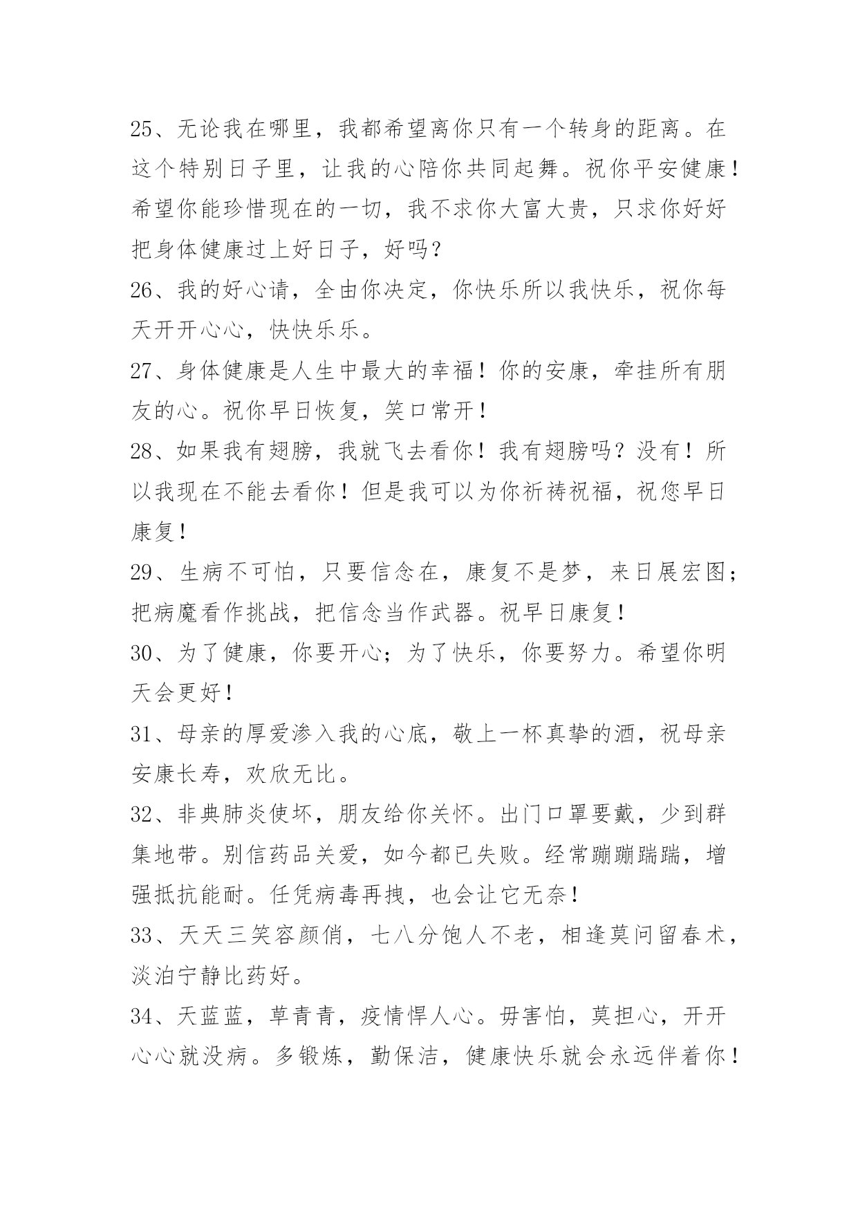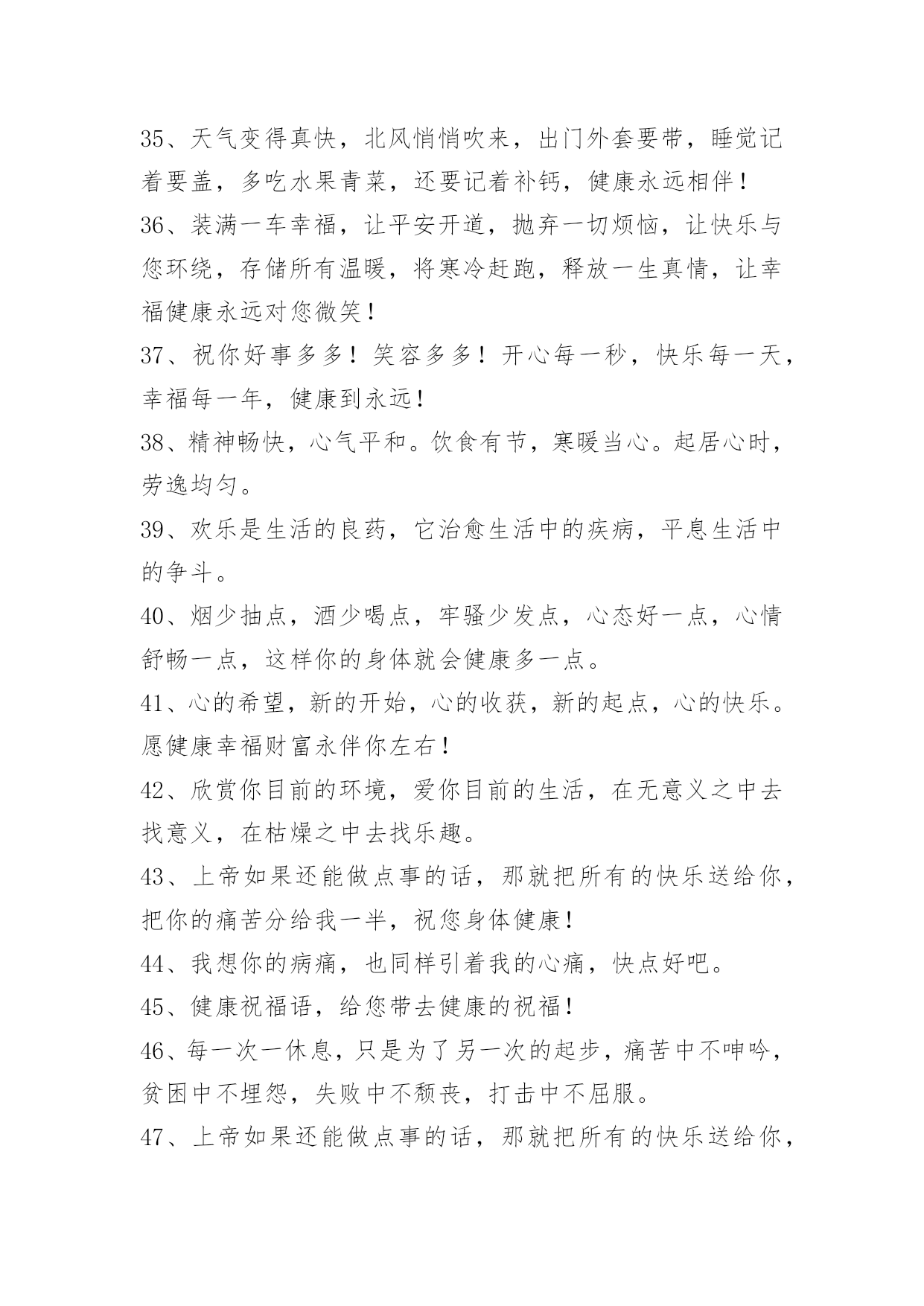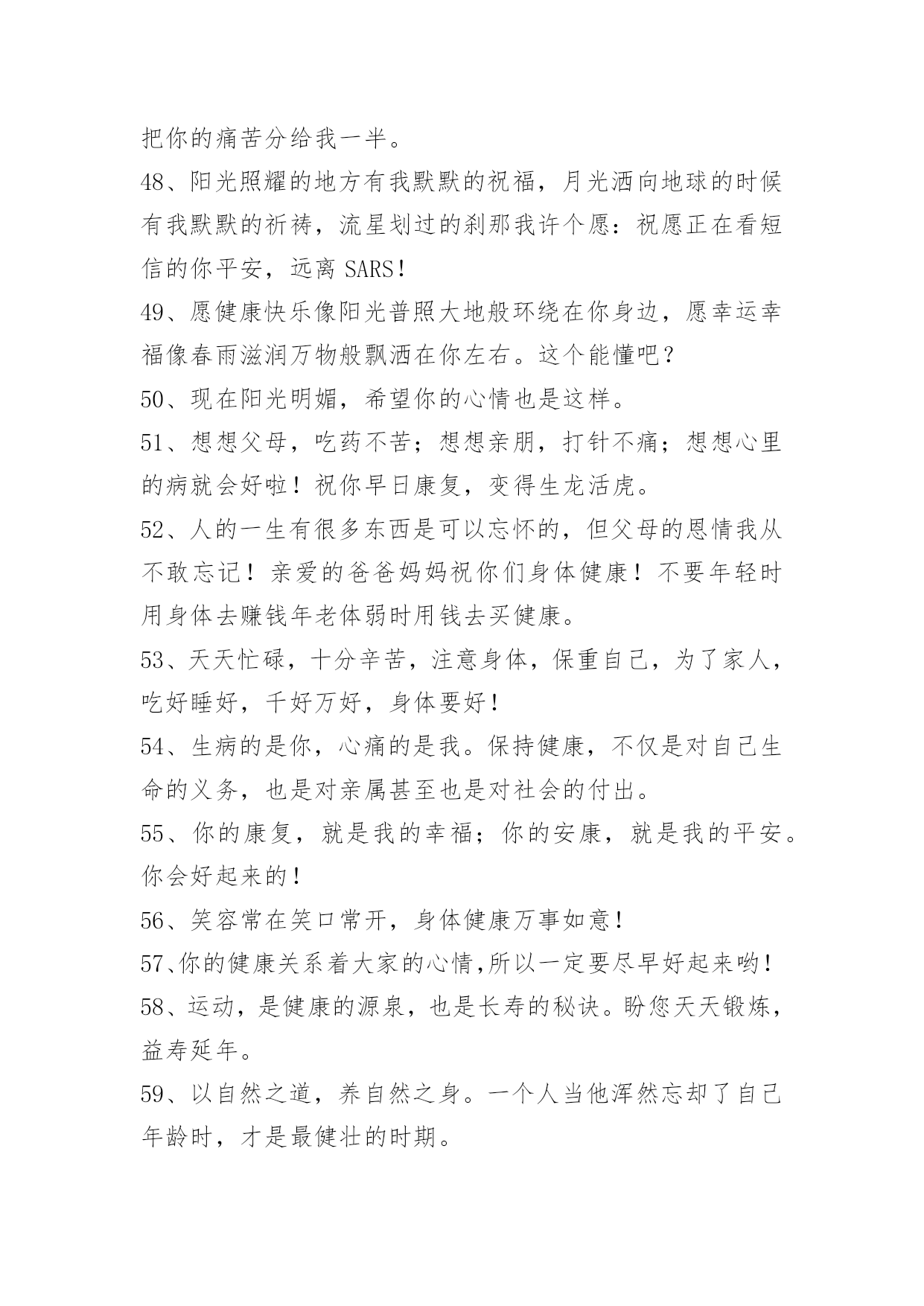 身体健康祝福短信身体健康祝福短信冬季进补选红枣,滋阴润燥还补气,外加银耳和百合,进补功效没得说。黑米、黑豆、黑食品餐餐不能忘。鸡肉、鸭汤也要补,补血养肾数第一。冬季养生听我讲:萝卜多吃有好处,化痰止咳不用医生开药方;进补之时先引补,牛肉、红枣加红糖,调理脾胃不用忙;黄豆、山药和栗子,补气养血它最棒!食醋解酒:食醋能解酒,主要是由于酒中的乙醇与食醋中的机酸,随立脚点消化吸收,在人体的胃肠内相遇而起醋化反应,从而减轻了酒精的毒性。早睡又早起,作息时间要调好;每天八杯水,排毒养颜有疗效;水果餐餐有,青春不会老;不用化妆品,皮肤照样好;不碰烧烤肉,癌症不见了。冬季精神调养要注意,凡事看开莫动气,宁静为本养元气,出门走走莫忘记,多多锻炼有力气,快快乐乐心欢喜,健康身体属于你。寒冬又到,脂肪要少;平日多补,蛋白重要;纤维少沾,蔗糖不能少;维生素补充,适当就好;食盐属咸,过度不好;健康养生,陪你过冬。只道是,岁月容易把人抛:少了俊俏,多了唠叨,老了容貌,呆了头脑。看如今,物价也易把人抛:薄了烧饼,瘦了油条,瘪了钱包,添了烦恼。寒冬临,气温降;宁为本,静养身;补一补,无病痛;蛋白质,放心上;少脂肪,多调养;能补气,有营养;排骨汤,放点姜;常锻炼,莫要忘。大寒到,凉变寒;寒袭人,霜打棉;绿渐黄,叶黄颜;草渐枯,风吹寒;早晚冷,深夜寒;水刺骨,触水寒;大寒后,天更寒;讲养生,应防寒。防寒体才健康。冬季养生攻略:早晨搓手心,血液循环好提神又醒脑;中午晒背,防治骨质疏松锻炼腿脚;晚上泡脚,促睡眠养肾暖身防感冒。贴心提醒送到,健康快乐才好。冬日养生有道,重在养阴除燥:冰糖炖梨降降火,大枣益智又健脑,红薯益气护肠胃,菊花清心烦恼消,核桃润肺平喘高,护航美食送给你,冬日健康身体好!冬季养生要学习,热能供给莫忘记,防止静电记心底,肉类进补餐餐排仔细,无机盐补充是第一,多多加衣御寒气,健康身体属于你。每日一苹果,医生远离我。吃苹果有讲究,15分钟内吃完莫忘记。速度太慢,胃部容易分泌大量胃酸,消化不良千万要注意,指定时间内吃完才是硬道理。身体健康祝福短信[篇2]1、上岁月如飞刀,刀刀无情催人老;革命身体最重要,上不要熬通宵;为把身体保养好,两点以前睡觉觉。2、云是绚丽的,雨是透明的,风是执着的,月是深情的,思是缠绵的,爱是永恒的,星是灿烂的,您是难忘的。衷心地祝福您?健康快乐!3、适当的运动所起的作用,几乎可以代替一切药物,但世界上任何药品都不能代替运动的作用。4、健康是最佳的礼物,知足是最大的财富,信心是最好的品德。5、健康是一个人最大的本钱,千万不要为了金钱而丢掉本钱。没有本钱也就没有金钱。6、身体好了吗?以后可要注意了,酒是公家的,身体可是自己的,别再为嘴伤身了哦!7、阳光为你灿烂,彩虹为你妖娆,群星为你闪烁,月光为你皎洁。我的不变的情谊只为你!祝福你,快乐无边际!8、在人生中,健康的价值远胜过声望和财富。愿您劳逸适度,多加保重。9、月色浓浓如酒,春色轻轻吹柳,桃花开了许久,不知见到没有,病毒世间少有,切忌四处乱走,没事消毒洗手,祝你健康永久!10、首先,希望你有漂亮的`护士MM照顾;之二,每天都被鲜花和祝福,还有好吃的东东包围;之三,当然是最重要的一点喽,希望你早日康复!11、天气变得真快,出门注意防晒,睡觉被子要盖,多吃水果蔬菜,好好保持心态,这样才会可爱,你好我才愉快。12、天气在变坏,对你很牵挂;晚上被要盖,小心脚冻坏;吃饭啃骨头,这样会补钙;不要骂我坏,祝你能愉快!13、阳光照耀的地方有我默默的祝福,月光洒向地球的时候有我默默的祈祷,流星划过的刹那我许个愿:祝愿正在看短信的你远离病痛!14、我真想把世界上所有的阳光都采入你的心间,把健康和快乐扎一束最美的鲜花献给你。愿你生命的每一天都健康、快乐、如鲜花般灿烂!15、我把长寿的秘诀告诉你吧,并不要你一文钱:精神畅快,心气平和。饮食有节,寒暖当心。起居心时,劳逸均匀。16、我把长寿的秘诀告诉你吧,并不要你一文钱:运动,是健康的源泉,也是长寿的秘诀。盼您天天锻炼,益寿延年。17、夏日高温不退,生活枯燥无味,革命工作很累,向你友谊提醒,自己身体宝贵,白天多吃水果,晚上早点儿睡。18、我的好心请,全由你决定,你快乐所以我快乐,祝你每天开开心心,快快乐乐19、欣赏你目前的环境,爱你目前的生活,在无意义之中去找意义,在枯燥之中去找乐趣。幸福、健康、平安!20、现在你的心情好吗?要多吃蔬菜,多喝开水,保持足够的睡眠,有利于你身体的恢复,祝你身体早日康复!21、快乐的微笑是保持生命健康的惟一良药,它的价值是千百万,但却不要花费一分钱。22、愿健康快乐像阳光普照大地般环绕在你身边,愿幸运幸福像春雨滋润万物般飘洒在你左右。23、“人有不为也,然后可以有为”。睡眠和休息丧失了一些时光,却换来了明天工作的旺盛精力。24