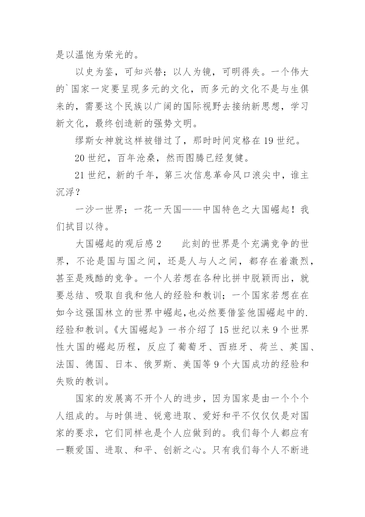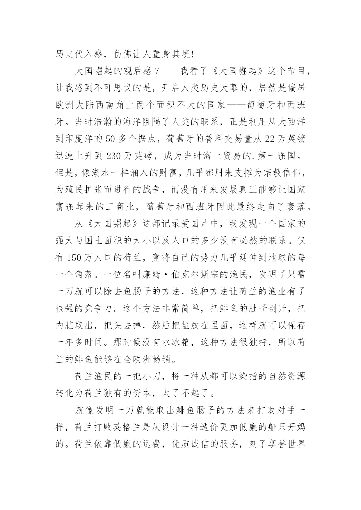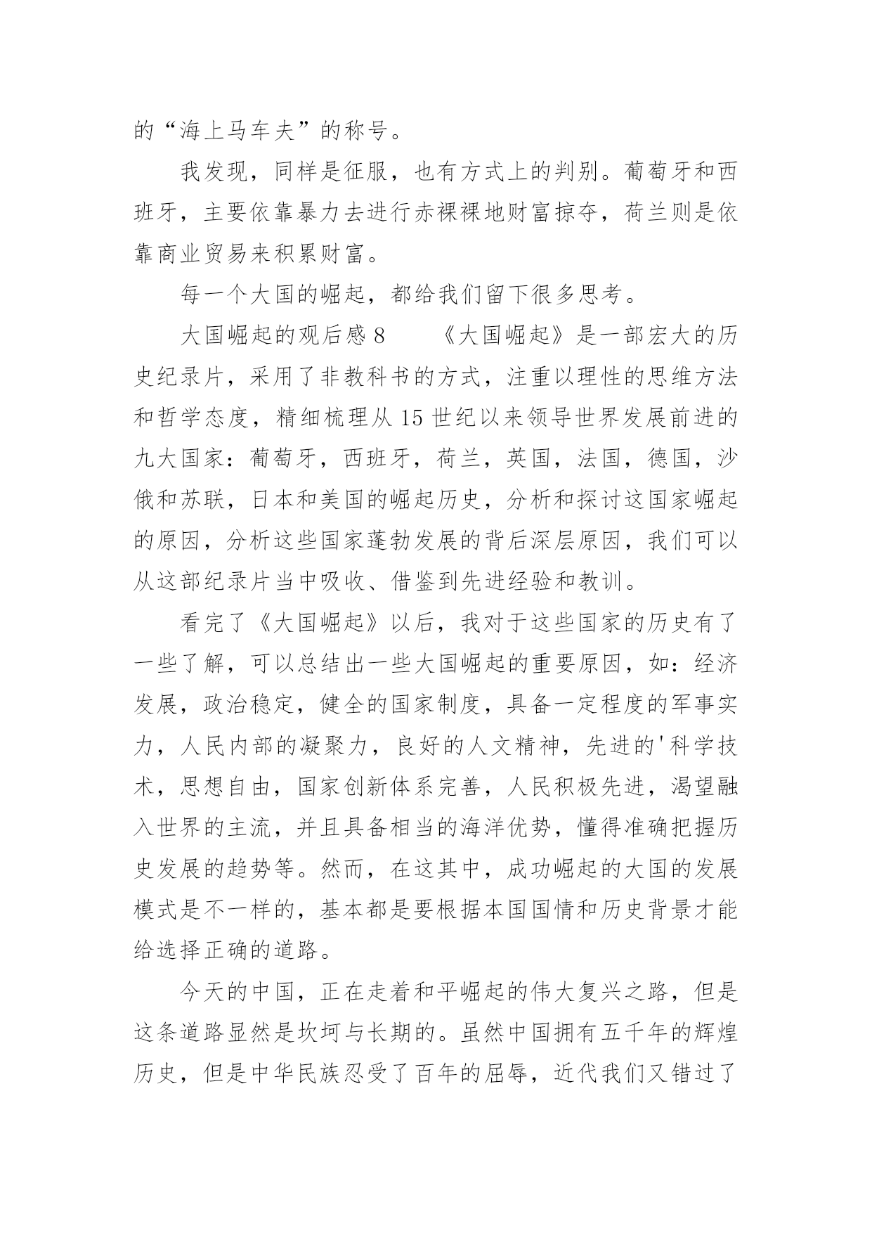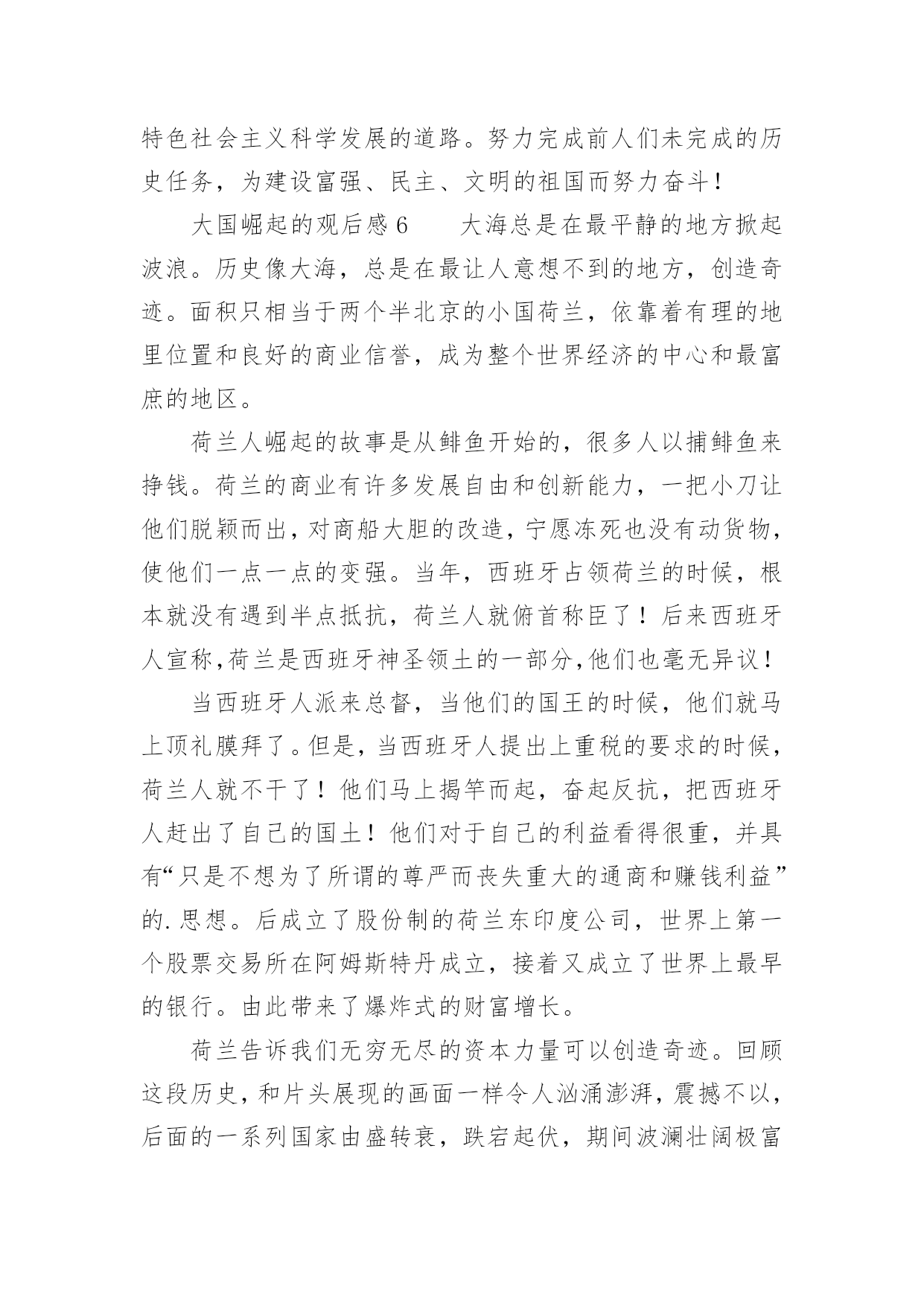 大国崛起的观后感大国崛起的观后感看完一部作品后,对人生或者事物一定产生了许多感想吧,让我们好好写份观后感,把你的收获感想写下来吧。想必许多人都在为如何写好观后感而烦恼吧,以下是小编精心整理的大国崛起的观后感,仅供参考,欢迎大家阅读。大国崛起的观后感1格物致知,我们不难发现,伟大时代的背后总会有一支巨擎、一只伟大的推手。历史呼唤英雄,英雄也领航着历史前进的风向标。《大国崛起》显然是命定中国的,那么新世纪中国的这只推手——如果有找到的话——你准备好了吗?开启海洋时代的大幕之后,崛起的魔棒先后在9个国家中相继传递,粲然全球角落。当时在东方的泱泱大清帝国并不是没有机会图强,1840年国门破开之时,日本还没有步入明治维新时代,比肩而启的中日两国,在1894年甲午战争后彻底改变格局。厘清落后的原因可能很繁杂,但其中根本之一要归咎于当时所谓大一统的封建文化:禁海、禁锢人文思想、四书五经等儒学教科书历经百世不更新,世世代代用“之乎者也”的老旧模型造人、造物、造社会,结果导致中国在很长一段历史时期里人文没有进步、科技没有创新、社会没有发展,被人乐道的康乾盛世说白了也不过是农业盛世,老百姓混得有口饭吃饱而已,好像中华民族在世界之林中就是以温饱为荣光的。以史为鉴,可知兴替;以人为镜,可明得失。一个伟大的`国家一定要呈现多元的文化,而多元的文化不是与生俱来的,需要这个民族以广阔的国际视野去接纳新思想,学习新文化,最终创造新的强势文明。缪斯女神就这样被错过了,那时时间定格在19世纪。20世纪,百年沧桑,然而图腾已经复健。21世纪,新的千年,第三次信息革命风口浪尖中,谁主沉浮?一沙一世界;一花一天国——中国特色之大国崛起!我们拭目以待。大国崛起的观后感2此刻的世界是个充满竞争的世界,不论是国与国之间,还是人与人之间,都存在着激烈,甚至是残酷的竞争。一个人若想在各种比拼中脱颖而出,就要总结、吸取自我和他人的经验和教训;一个国家若想在在如今这强国林立的世界中崛起,也必然要借鉴他国崛起中的.经验和教训。《大国崛起》一书介绍了15世纪以来9个世界性大国的崛起历程,反应了葡萄牙、西班牙、荷兰、英国、法国、德国、日本、俄罗斯、美国等9个大国成功的经验和失败的教训。国家的发展离不开个人的进步,因为国家是由一个个个人组成的。与时俱进、锐意进取、爱好和平不仅仅仅是对国家的要求,它们同样也是个人应做到的。我们每个人都应有一颗爱国、进取、和平、创新之心。只有我们每个人不断进行自我提高,我们祖国的实力才能逐渐加强,我国的国际地位才会不断提高。当然,我所谓之人人进取等并非是说每个人都要按同一种方式去做事,而是期望我们人人都怀着强大祖国的理想去为祖国的发展而拼搏,并在此基础上发扬自我的个性。我认为,发扬每个人的个性十分重要,因为人的个性得到较为充分的发扬,是一个国家的独立自主创新潜力不断提高的重要前提。《大国崛起》既为我们国家的发展有所启示,也对我们个人的发展有很大的帮忙。大国崛起的观后感3《大国崛起》是一部近代全球的发展史,它以历史和全球的视野解读了15世纪以来包括:葡萄牙、西班牙、荷兰、英国、法国、德国、日本、俄罗斯和美国。这九个先后崛起的大国适时出发、各领风骚,演绎出大国风采的历程。深入文脉,纵观列强的发展史。我们不免会发现,看似偶然的崛起,似乎都是必然的历史结局。上世纪,应对帝国主义的侵略,毛主席曾精炼而深刻的总结了中华民族的特性:我们中华民族有同自我的敌人血战到底的气概,有在自力更生的基础上光复旧物的决心,有自立于世界民族之林的潜力。八年艰苦抗战,向世人证明了中华民族同敌人血战到底的民族气概,30年改革开放所取得的举世瞩目的成就,向世人展现了我们在自力更生的基础上光复旧物的.巨大成就。随着“中国崛起”“当中国统治世界”等言论不断涌现世界舞台时,我们亦感到:中华民族自立于世界民族之林的日子亦将来临。能否担负起民族复兴的伟大使命,经受住世界体系对我们的考验,是当代中华儿女必然要应对的挑战。大国崛起的观后感4《大国崛起》是由周艳执导的12集历史题材电视纪录片,于20xx年11月13日在中央电视台财经频道首播。该片记录了葡萄牙、西班牙、荷兰、英国、法国、德国、日本、俄罗斯、美国九个国家相继崛起的过程,并总结了国家崛起的历史规律。《大国崛起》讲述了15世纪以来,人类社会的发展进入了一个新的阶段,原先割裂的世界开始真正意义上地连成了一个整体,彼此隔膜的世界各国开始相互认识和了解,也展开了相互的竞争。在近现代以来的世界舞台上,有九个国家在不同的历史时期先后登场,对人类社会发展产生了重大影响。它们是:葡萄牙、西班牙、荷兰、英国、法国、德国、日本、俄罗斯、美国。该片解读了15世纪以来9个世界性大国崛起的历史,探究其兴盛背后的原因,分别诠释了各大国500年的兴起史,为中国的现代化发展进一