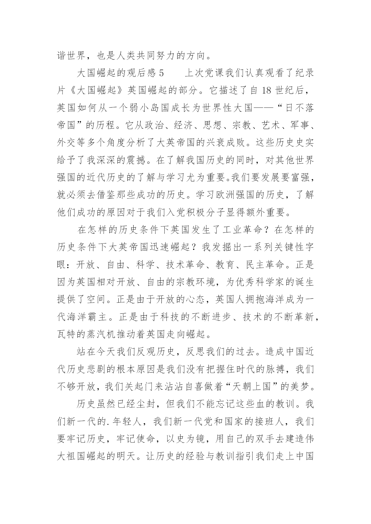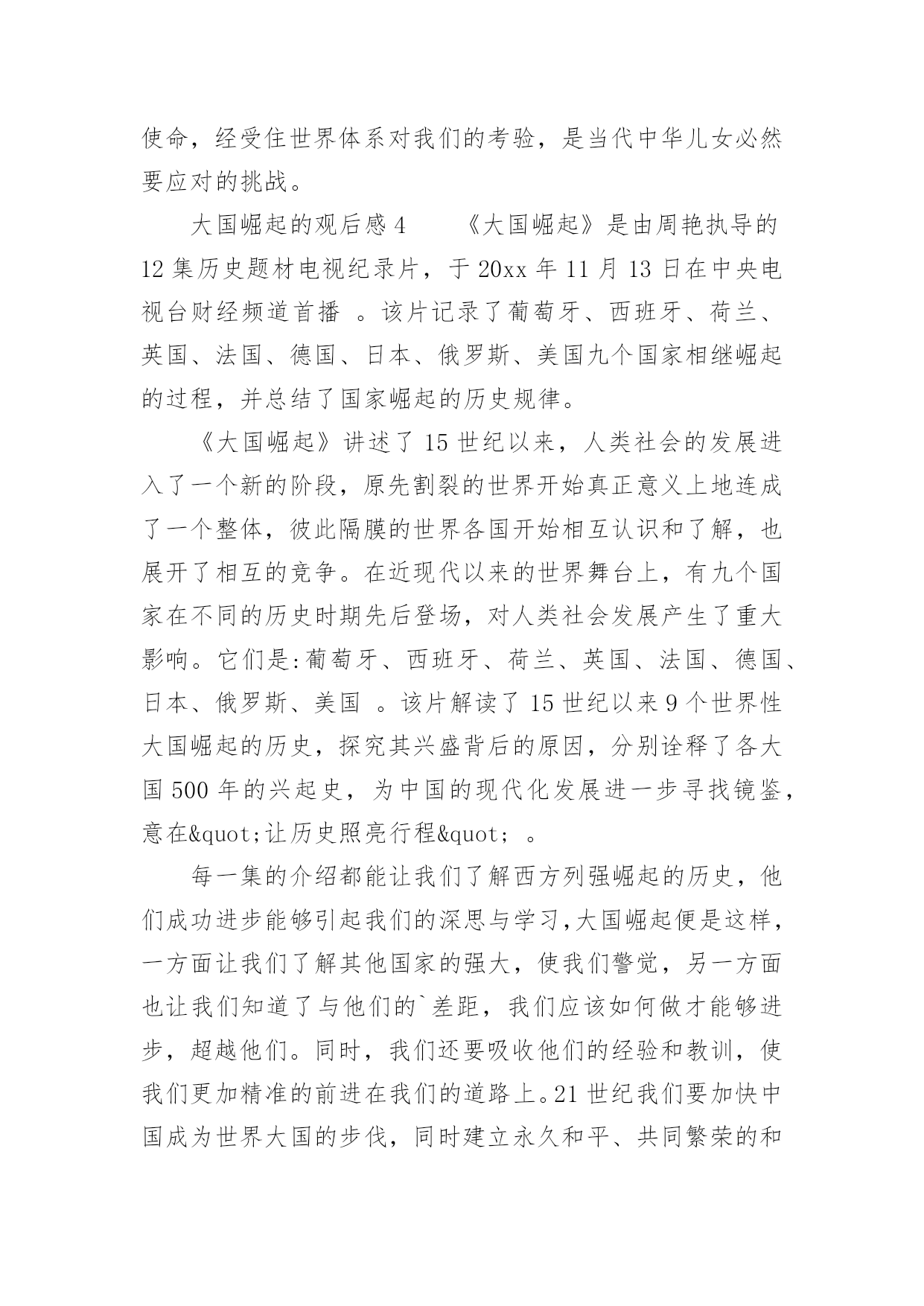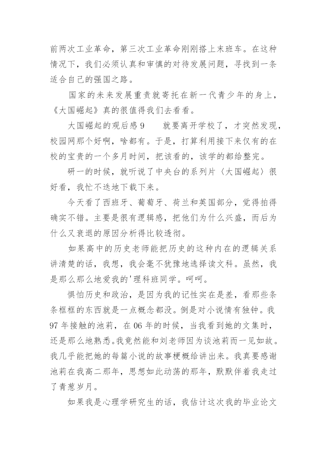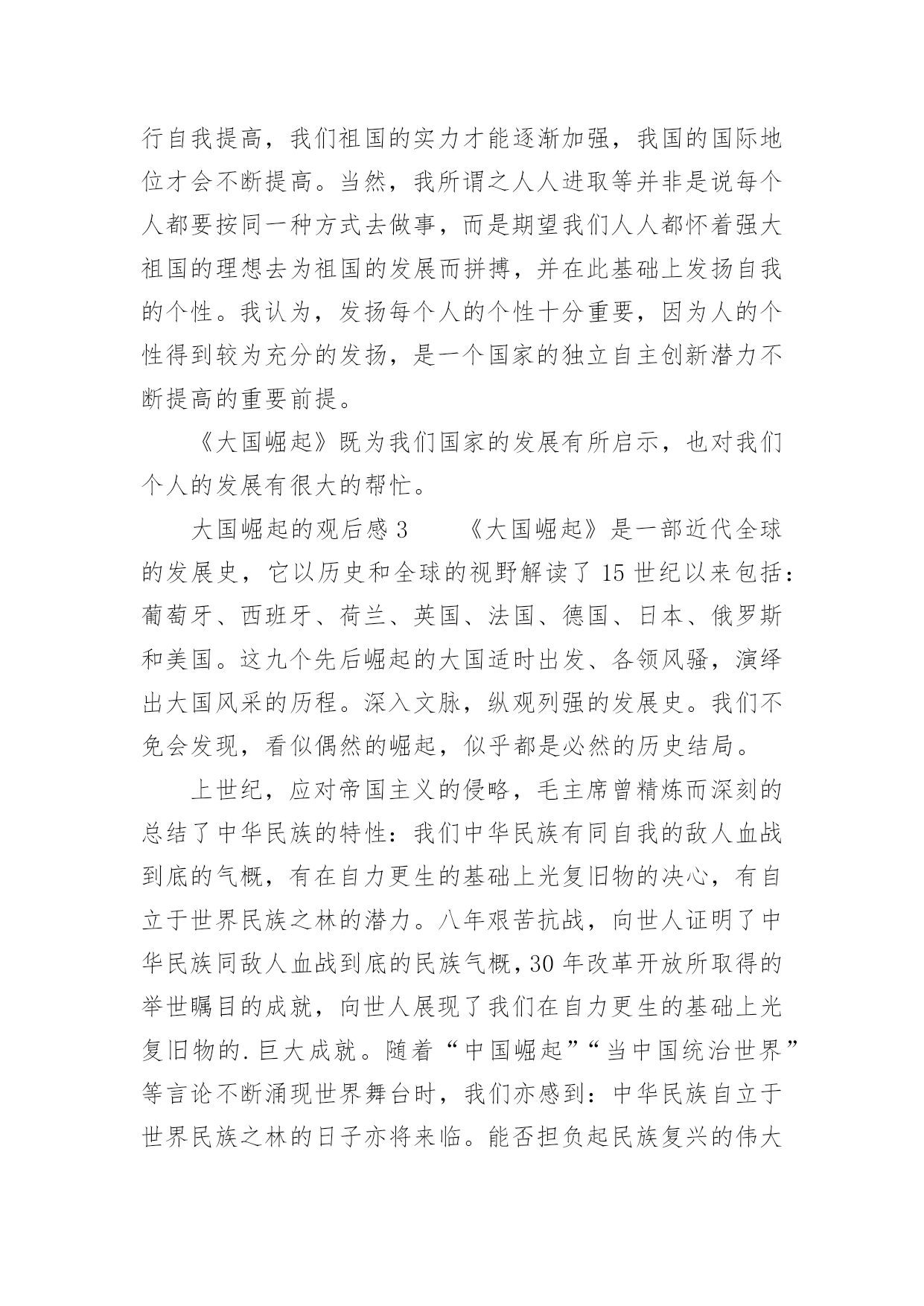 大国崛起的观后感大国崛起的观后感看完一部作品后,对人生或者事物一定产生了许多感想吧,让我们好好写份观后感,把你的收获感想写下来吧。想必许多人都在为如何写好观后感而烦恼吧,以下是小编精心整理的大国崛起的观后感,仅供参考,欢迎大家阅读。大国崛起的观后感1格物致知,我们不难发现,伟大时代的背后总会有一支巨擎、一只伟大的推手。历史呼唤英雄,英雄也领航着历史前进的风向标。《大国崛起》显然是命定中国的,那么新世纪中国的这只推手——如果有找到的话——你准备好了吗?开启海洋时代的大幕之后,崛起的魔棒先后在9个国家中相继传递,粲然全球角落。当时在东方的泱泱大清帝国并不是没有机会图强,1840年国门破开之时,日本还没有步入明治维新时代,比肩而启的中日两国,在1894年甲午战争后彻底改变格局。厘清落后的原因可能很繁杂,但其中根本之一要归咎于当时所谓大一统的封建文化:禁海、禁锢人文思想、四书五经等儒学教科书历经百世不更新,世世代代用“之乎者也”的老旧模型造人、造物、造社会,结果导致中国在很长一段历史时期里人文没有进步、科技没有创新、社会没有发展,被人乐道的康乾盛世说白了也不过是农业盛世,老百姓混得有口饭吃饱而已,好像中华民族在世界之林中就是以温饱为荣光的。以史为鉴,可知兴替;以人为镜,可明得失。一个伟大的`国家一定要呈现多元的文化,而多元的文化不是与生俱来的,需要这个民族以广阔的国际视野去接纳新思想,学习新文化,最终创造新的强势文明。缪斯女神就这样被错过了,那时时间定格在19世纪。20世纪,百年沧桑,然而图腾已经复健。21世纪,新的千年,第三次信息革命风口浪尖中,谁主沉浮?一沙一世界;一花一天国——中国特色之大国崛起!我们拭目以待。大国崛起的观后感2此刻的世界是个充满竞争的世界,不论是国与国之间,还是人与人之间,都存在着激烈,甚至是残酷的竞争。一个人若想在各种比拼中脱颖而出,就要总结、吸取自我和他人的经验和教训;一个国家若想在在如今这强国林立的世界中崛起,也必然要借鉴他国崛起中的.经验和教训。《大国崛起》一书介绍了15世纪以来9个世界性大国的崛起历程,反应了葡萄牙、西班牙、荷兰、英国、法国、德国、日本、俄罗斯、美国等9个大国成功的经验和失败的教训。国家的发展离不开个人的进步,因为国家是由一个个个人组成的。与时俱进、锐意进取、爱好和平不仅仅仅是对国家的要求,它们同样也是个人应做到的。我们每个人都应有一颗爱国、进取、和平、创新之心。只有我们每个人不断进行自我提高,我们祖国的实力才能逐渐加强,我国的国际地位才会不断提高。当然,我所谓之人人进取等并非是说每个人都要按同一种方式去做事,而是期望我们人人都怀着强大祖国的理想去为祖国的发展而拼搏,并在此基础上发扬自我的个性。我认为,发扬每个人的个性十分重要,因为人的个性得到较为充分的发扬,是一个国家的独立自主创新潜力不断提高的重要前提。《大国崛起》既为我们国家的发展有所启示,也对我们个人的发展有很大的帮忙。大国崛起的观后感3《大国崛起》是一部近代全球的发展史,它以历史和全球的视野解读了15世纪以来包括:葡萄牙、西班牙、荷兰、英国、法国、德国、日本、俄罗斯和美国。这九个先后崛起的大国适时出发、各领风骚,演绎出大国风采的历程。深入文脉,纵观列强的发展史。我们不免会发现,看似偶然的崛起,似乎都是必然的历史结局。上世纪,应对帝国主义的侵略,毛主席曾精炼而深刻的总结了中华民族的特性:我们中华民族有同自我的敌人血战到底的气概,有在自力更生的基础上光复旧物的决心,有自立于世界民族之林的潜力。八年艰苦抗战,向世人证明了中华民族同敌人血战到底的民族气概,30年改革开放所取得的举世瞩目的成就,向世人展现了我们在自力更生的基础上光复旧物的.巨大成就。随着“中国崛起”“当中国统治世界”等言论不断涌现世界舞台时,我们亦感到:中华民族自立于世界民族之林的日子亦将来临。能否担负起民族复兴的伟大使命,经受住世界体系对我们的考验,是当代中华儿女必然要应对的挑战。大国崛起的观后感4《大国崛起》是由周艳执导的12集历史题材电视纪录片,于20xx年11月13日在中央电视台财经频道首播。该片记录了葡萄牙、西班牙、荷兰、英国、法国、德国、日本、俄罗斯、美国九个国家相继崛起的过程,并总结了国家崛起的历史规律。《大国崛起》讲述了15世纪以来,人类社会的发展进入了一个新的阶段,原先割裂的世界开始真正意义上地连成了一个整体,彼此隔膜的世界各国开始相互认识和了解,也展开了相互的竞争。在近现代以来的世界舞台上,有九个国家在不同的历史时期先后登场,对人类社会发展产生了重大影响。它们是:葡萄牙、西班牙、荷兰、英国、法国、德国、日本、俄罗斯、美国。该片解读了15世纪以来9个世界性大国崛起的历史,探究其兴盛背后的原因,分别诠释了各大国500年的兴起史,为中国的现代化发展进一