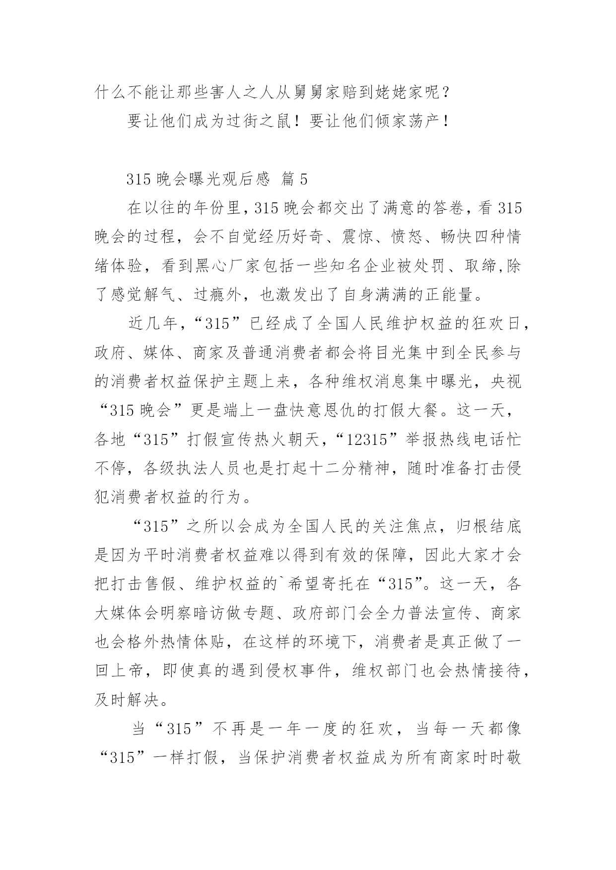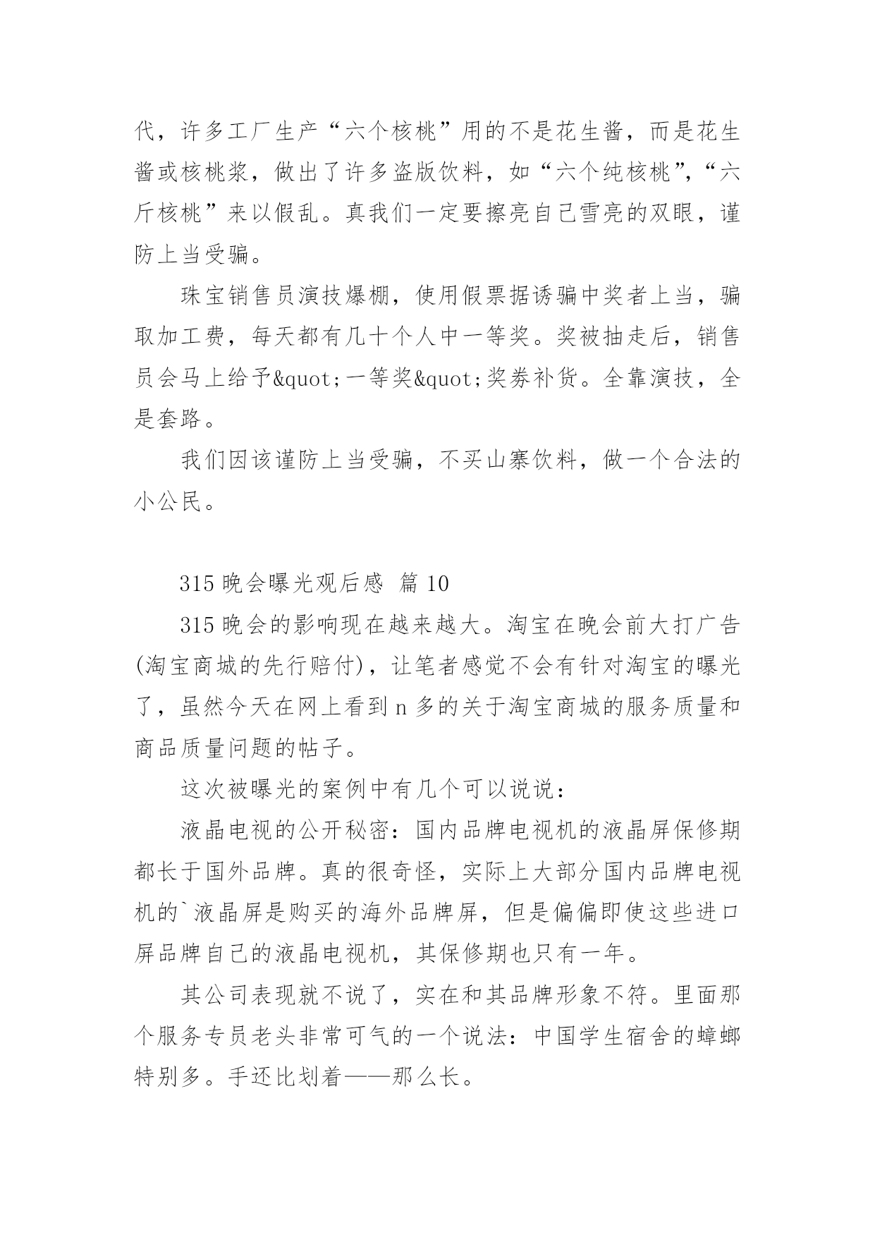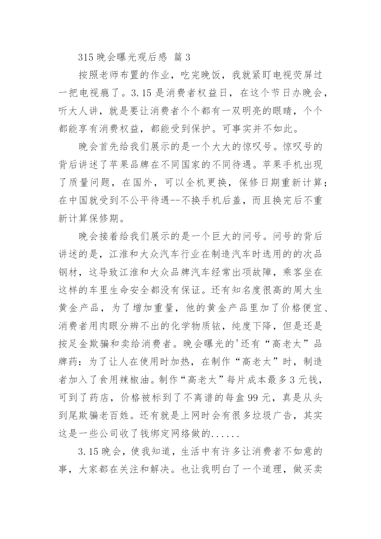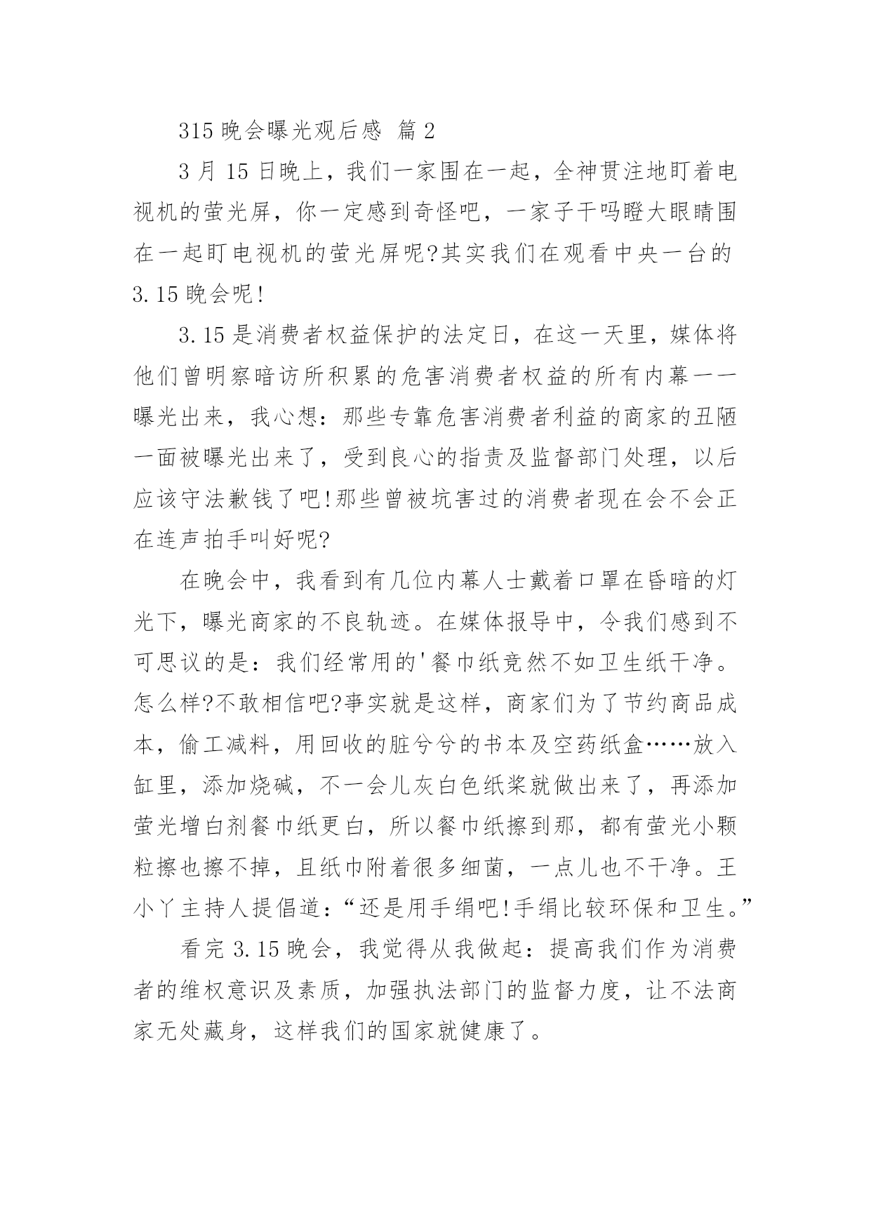 315晚会曝光观后感315晚会曝光观后感(精选24篇)看完一部经典作品以后,相信大家的收获肯定不少吧,需要好好地对所收获的东西写一篇观后感了。为了让您不再为写观后感头疼,下面是小编收集整理的315晚会曝光观后感,仅供参考,大家一起来看看吧。315晚会曝光观后感篇1看完整台晚会,我感到有一丝的恐惧。现在社会上骗子真多,人们造假冒伪劣产品的技术也很高,所以人们很容易上当受骗。有些大学生看到报纸上写着只要交9万元就能让他们上南非有名的大学,就信以为真,结果来到了南非,不但没有大学上,反而让他们去摆地摊、打工,落得的`下场真是非常可怜的。还有一个叫朱逊的小男孩,2岁时得了轻微咳嗽,到医院去打针,因为护士的不负责任,打了过量的庆大霉素,造成了药物性耳聋,现在他已经10岁了,可他还是听不到声音,这可是一辈子的痛苦。还有的人因为喝了假酒,吃了假药送了命。我们对那些骗子早就深恶痛绝,对那些不负责任的人非常气愤,真想把这些丑恶的现象一起消灭掉。我希望天天都是“3.15”,不再让那些坏人有机可乘。315晚会曝光观后感篇23月15日晚上,我们一家围在一起,全神贯注地盯着电视机的萤光屏,你一定感到奇怪吧,一家子干吗瞪大眼睛围在一起盯电视机的萤光屏呢?其实我们在观看中央一台的3.15睌会呢!3.15是消费者权益保护的法定日,在这一天里,媒体将他们曾明察暗访所积累的危害消费者权益的所有内幕一一曝光出来,我心想:那些专靠危害消费者利益的商家的丑陋一面被曝光出来了,受到良心的指责及监督部门处理,以后应该守法歉钱了吧!那些曾被坑害过的消费者现在会不会正在连声拍手叫好呢?在晚会中,我看到有几位内幕人士戴着口罩在昏暗的灯光下,曝光商家的不良轨迹。在媒体报导中,令我们感到不可思议的是:我们经常用的'餐巾纸竞然不如卫生纸干净。怎么样?不敢相信吧?亊实就是这样,商家们为了节约商品成本,偷工减料,用回收的脏兮兮的书本及空药纸盒……放入缸里,添加烧碱,不一会儿灰白色纸桨就做出来了,再添加萤光增白剂餐巾纸更白,所以餐巾纸擦到那,都有萤光小颗粒擦也擦不掉,且纸巾附着很多细菌,一点儿也不干净。王小丫主持人提倡道:“还是用手绢吧!手绢比较环保和卫生。”看完3.15晚会,我觉得从我做起:提高我们作为消费者的维权意识及素质,加强执法部门的监督力度,让不法商家无处藏身,这样我们的国家就健康了。315晚会曝光观后感篇3按照老师布置的作业,吃完晚饭,我就紧盯电视荧屏过一把电视瘾了。3.15是消费者权益日,在这个节日办晚会,听大人讲,就是要让消费者个个都有一双明亮的眼睛,个个都能享有消费权益,都能受到保护。可事实并不如此。晚会首先给我们展示的是一个大大的惊叹号。惊叹号的背后讲述了苹果品牌在不同国家的不同待遇。苹果手机出现了质量问题,在国外,可以全机更换,保修日期重新计算;在中国就受到不公平待遇--不换手机后盖,而且换完后不重新计算保修期。晚会接着给我们展示的是一个巨大的问号。问号的背后讲述的是,江淮和大众汽车行业在制造汽车时选用的的次品钢材,这导致江淮和大众品牌汽车经常出项故障,乘客坐在这样的车里生命安全都没有保证。还有知名度很高的周大生黄金产品,为了增加重量,他的黄金产品里加了价格便宜、消费者用肉眼分辨不出的化学物质铱,纯度下降,但是还是按足金欺骗和卖给消费者。晚会曝光的'还有“高老太”品牌药:为了让人在使用时加热,在制作“高老太”时,制造者加入了食用辣椒油。制作“高老太”每片成本最多3元钱,可到了药店,价格被标到了不离谱的每盒99元,真是从头到尾欺骗老百姓。还有就是上网时会有很多垃圾广告,其实这是一些公司收了钱绑定网络做的......3.15晚会,使我知道,生活中有许多让消费者不如意的事,大家都在关注和解决。也让我明白了一个道理,做买卖要以诚待人,如果起贪念,迟早会被发现和曝光的。这和生活中做人一样,大家都应该以诚相待和睦相处。315晚会曝光观后感篇4看了几年的3.15晚会,感触颇多!看了晚会上曝光的那么多坑人的、可怕的事,想想现在的人到底为了什么?人,到底为什么而活着?现在的社会到底怎么了?人,是地球上最高等的生物了,与其它的生物相比所不同的除了人类有自己独特的,复杂的语言外,那就是人与人之间的一种感情了。其它动物也有感情,但那总比不上人与人之间的了!人可以有仇恨,但人可以宽容,可以理解,可以相逢一笑泯恩仇!可是让我不能理解的是,随着社会的进步,人们生活水平的不断提高,而人与人之间的'感情却在淡薄,人的心理也有不断扭曲的嫌疑,诈骗、坑人、造假。有个人行为,有公司行为,有单位行为,出门在外,还能相信谁?打开手机有“后门”收费,如钝刀割肉,让人不知不觉;上医院看病,谋财不说,也许还会害命;吃动物怕激素;吃植物怕色素;就是喝水也要担心有害元素;人祸、人祸,就是天灾,我想也多半起因于人祸!弄