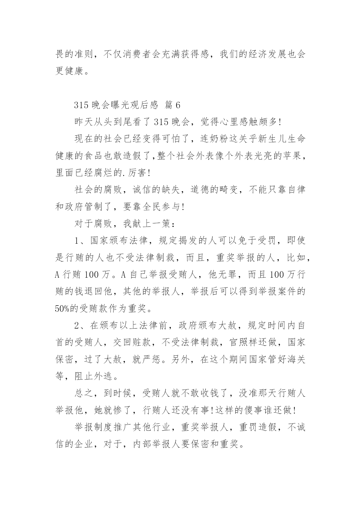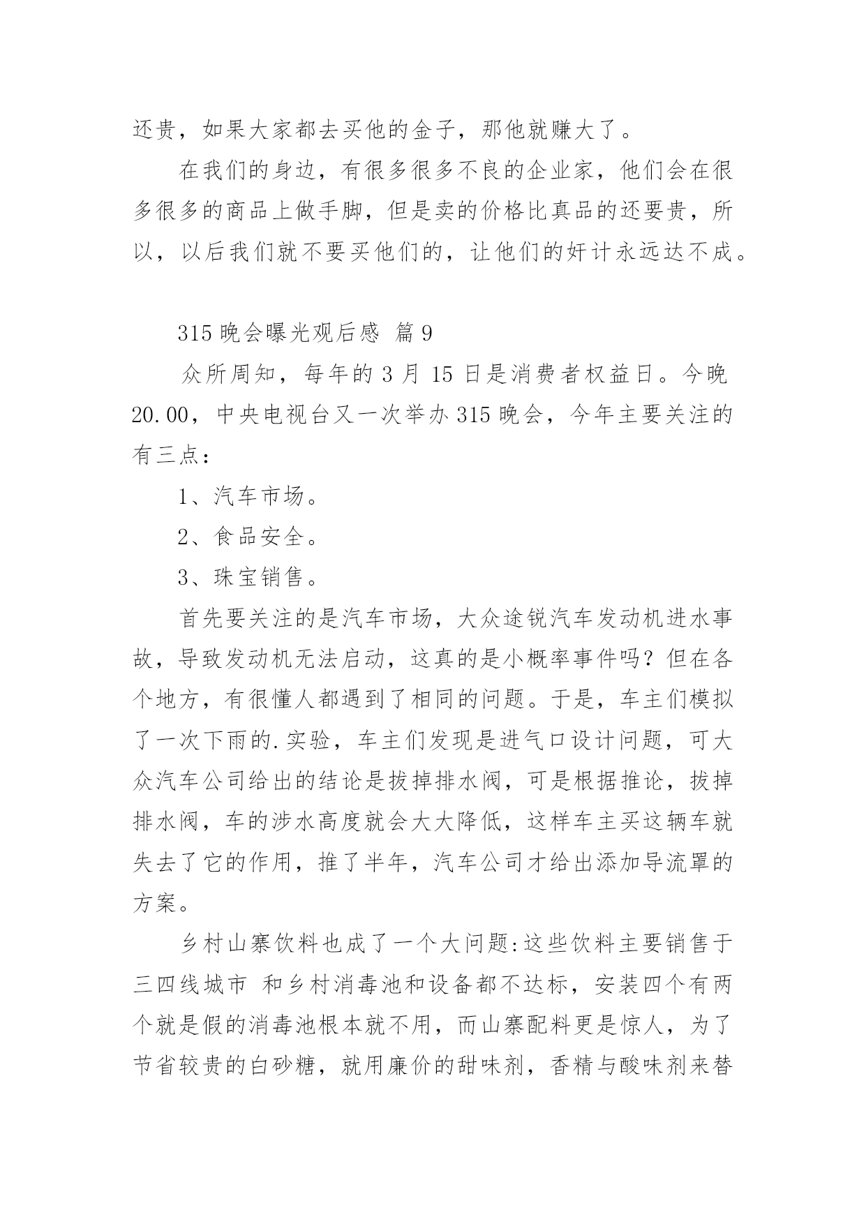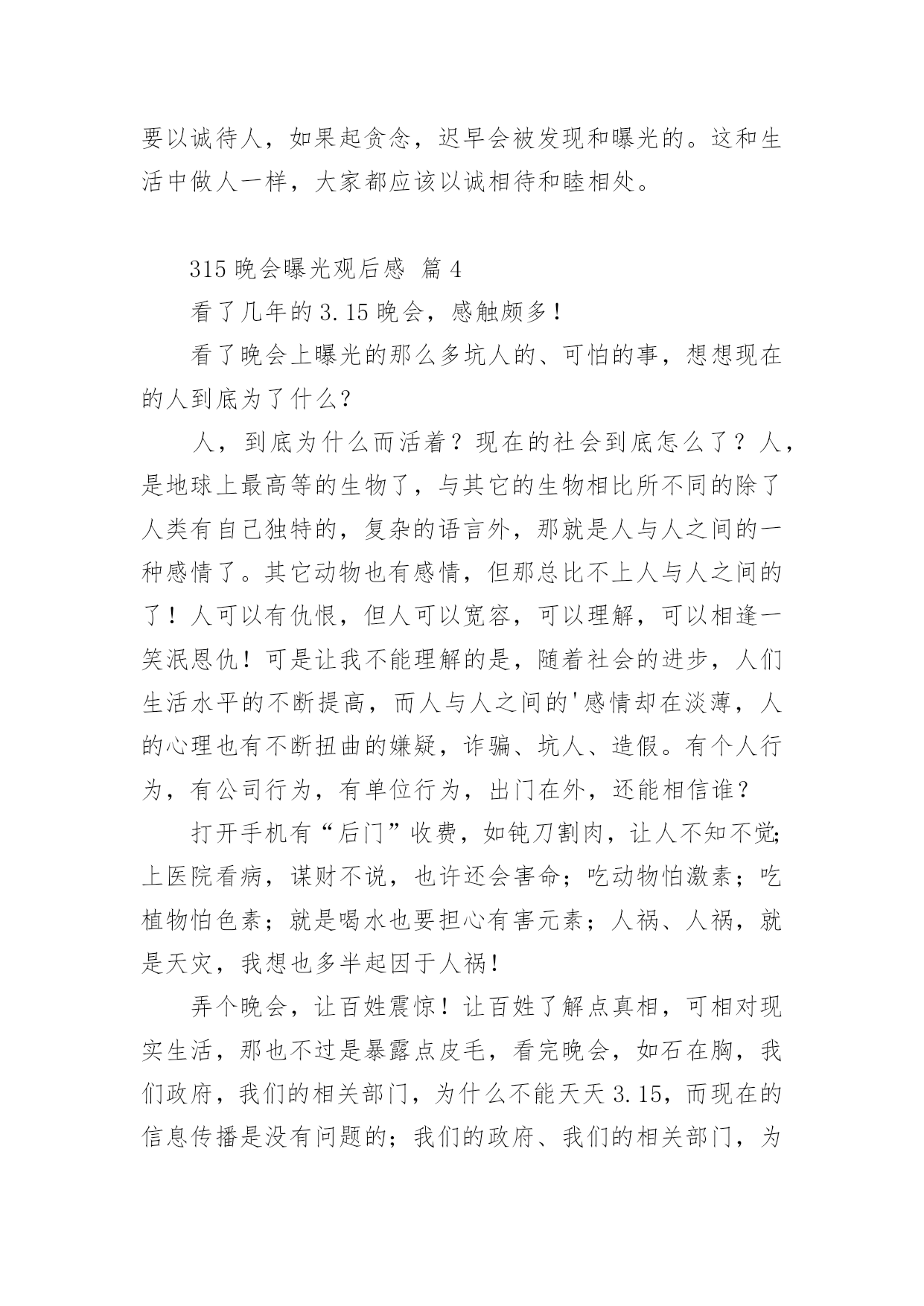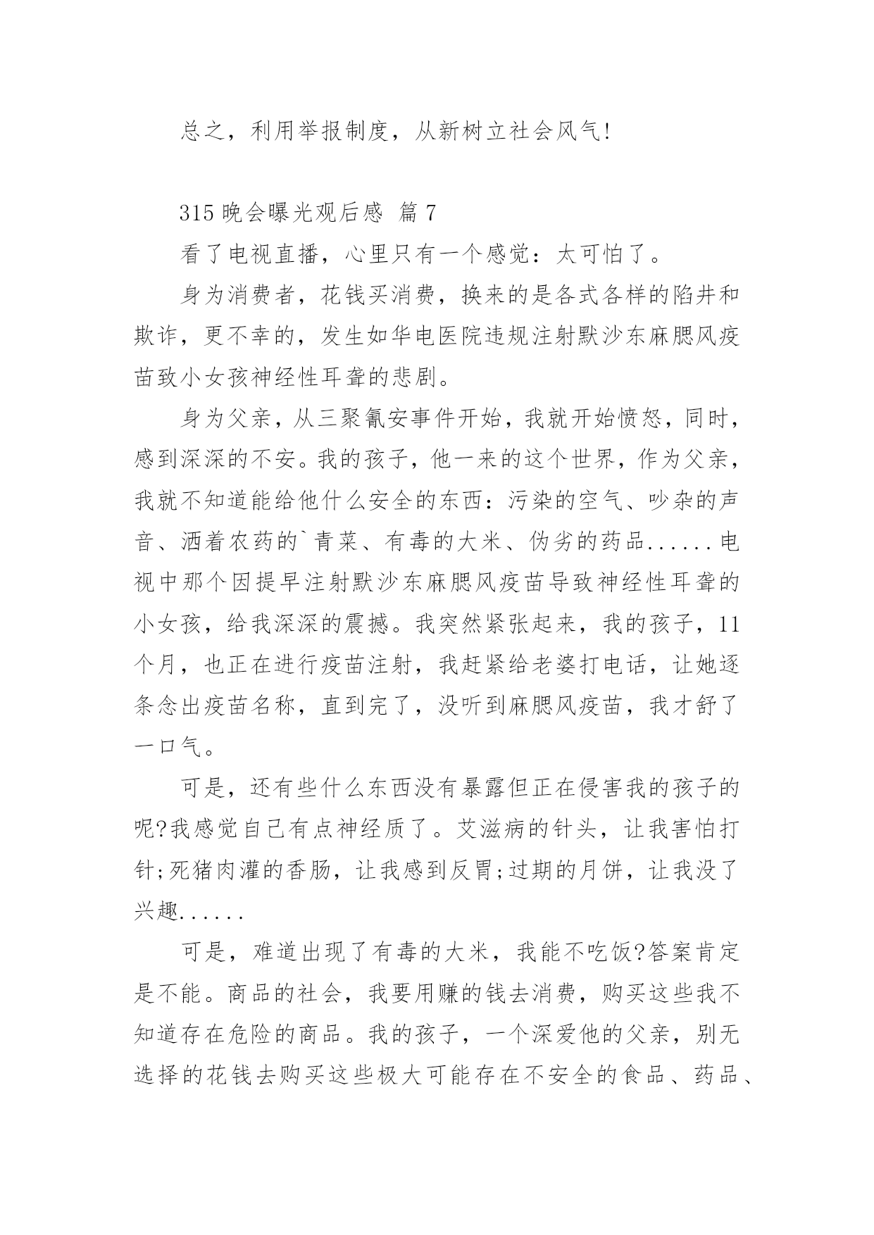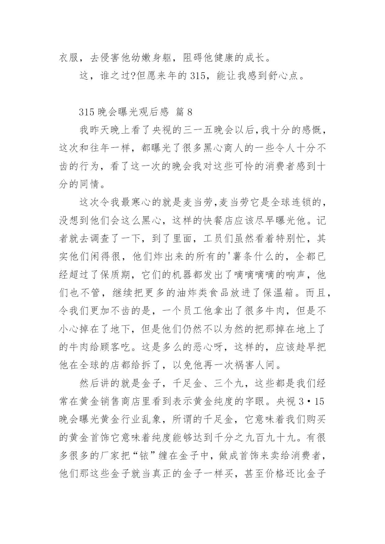 315晚会曝光观后感315晚会曝光观后感(精选24篇)看完一部经典作品以后,相信大家的收获肯定不少吧,需要好好地对所收获的东西写一篇观后感了。为了让您不再为写观后感头疼,下面是小编收集整理的315晚会曝光观后感,仅供参考,大家一起来看看吧。315晚会曝光观后感篇1看完整台晚会,我感到有一丝的恐惧。现在社会上骗子真多,人们造假冒伪劣产品的技术也很高,所以人们很容易上当受骗。有些大学生看到报纸上写着只要交9万元就能让他们上南非有名的大学,就信以为真,结果来到了南非,不但没有大学上,反而让他们去摆地摊、打工,落得的`下场真是非常可怜的。还有一个叫朱逊的小男孩,2岁时得了轻微咳嗽,到医院去打针,因为护士的不负责任,打了过量的庆大霉素,造成了药物性耳聋,现在他已经10岁了,可他还是听不到声音,这可是一辈子的痛苦。还有的人因为喝了假酒,吃了假药送了命。我们对那些骗子早就深恶痛绝,对那些不负责任的人非常气愤,真想把这些丑恶的现象一起消灭掉。我希望天天都是“3.15”,不再让那些坏人有机可乘。315晚会曝光观后感篇23月15日晚上,我们一家围在一起,全神贯注地盯着电视机的萤光屏,你一定感到奇怪吧,一家子干吗瞪大眼睛围在一起盯电视机的萤光屏呢?其实我们在观看中央一台的3.15睌会呢!3.15是消费者权益保护的法定日,在这一天里,媒体将他们曾明察暗访所积累的危害消费者权益的所有内幕一一曝光出来,我心想:那些专靠危害消费者利益的商家的丑陋一面被曝光出来了,受到良心的指责及监督部门处理,以后应该守法歉钱了吧!那些曾被坑害过的消费者现在会不会正在连声拍手叫好呢?在晚会中,我看到有几位内幕人士戴着口罩在昏暗的灯光下,曝光商家的不良轨迹。在媒体报导中,令我们感到不可思议的是:我们经常用的'餐巾纸竞然不如卫生纸干净。怎么样?不敢相信吧?亊实就是这样,商家们为了节约商品成本,偷工减料,用回收的脏兮兮的书本及空药纸盒……放入缸里,添加烧碱,不一会儿灰白色纸桨就做出来了,再添加萤光增白剂餐巾纸更白,所以餐巾纸擦到那,都有萤光小颗粒擦也擦不掉,且纸巾附着很多细菌,一点儿也不干净。王小丫主持人提倡道:“还是用手绢吧!手绢比较环保和卫生。”看完3.15晚会,我觉得从我做起:提高我们作为消费者的维权意识及素质,加强执法部门的监督力度,让不法商家无处藏身,这样我们的国家就健康了。315晚会曝光观后感篇3按照老师布置的作业,吃完晚饭,我就紧盯电视荧屏过一把电视瘾了。3.15是消费者权益日,在这个节日办晚会,听大人讲,就是要让消费者个个都有一双明亮的眼睛,个个都能享有消费权益,都能受到保护。可事实并不如此。晚会首先给我们展示的是一个大大的惊叹号。惊叹号的背后讲述了苹果品牌在不同国家的不同待遇。苹果手机出现了质量问题,在国外,可以全机更换,保修日期重新计算;在中国就受到不公平待遇--不换手机后盖,而且换完后不重新计算保修期。晚会接着给我们展示的是一个巨大的问号。问号的背后讲述的是,江淮和大众汽车行业在制造汽车时选用的的次品钢材,这导致江淮和大众品牌汽车经常出项故障,乘客坐在这样的车里生命安全都没有保证。还有知名度很高的周大生黄金产品,为了增加重量,他的黄金产品里加了价格便宜、消费者用肉眼分辨不出的化学物质铱,纯度下降,但是还是按足金欺骗和卖给消费者。晚会曝光的'还有“高老太”品牌药:为了让人在使用时加热,在制作“高老太”时,制造者加入了食用辣椒油。制作“高老太”每片成本最多3元钱,可到了药店,价格被标到了不离谱的每盒99元,真是从头到尾欺骗老百姓。还有就是上网时会有很多垃圾广告,其实这是一些公司收了钱绑定网络做的......3.15晚会,使我知道,生活中有许多让消费者不如意的事,大家都在关注和解决。也让我明白了一个道理,做买卖要以诚待人,如果起贪念,迟早会被发现和曝光的。这和生活中做人一样,大家都应该以诚相待和睦相处。315晚会曝光观后感篇4看了几年的3.15晚会,感触颇多!看了晚会上曝光的那么多坑人的、可怕的事,想想现在的人到底为了什么?人,到底为什么而活着?现在的社会到底怎么了?人,是地球上最高等的生物了,与其它的生物相比所不同的除了人类有自己独特的,复杂的语言外,那就是人与人之间的一种感情了。其它动物也有感情,但那总比不上人与人之间的了!人可以有仇恨,但人可以宽容,可以理解,可以相逢一笑泯恩仇!可是让我不能理解的是,随着社会的进步,人们生活水平的不断提高,而人与人之间的'感情却在淡薄,人的心理也有不断扭曲的嫌疑,诈骗、坑人、造假。有个人行为,有公司行为,有单位行为,出门在外,还能相信谁?打开手机有“后门”收费,如钝刀割肉,让人不知不觉;上医院看病,谋财不说,也许还会害命;吃动物怕激素;吃植物怕色素;就是喝水也要担心有害元素;人祸、人祸,就是天灾,我想也多半起因于人祸!弄
