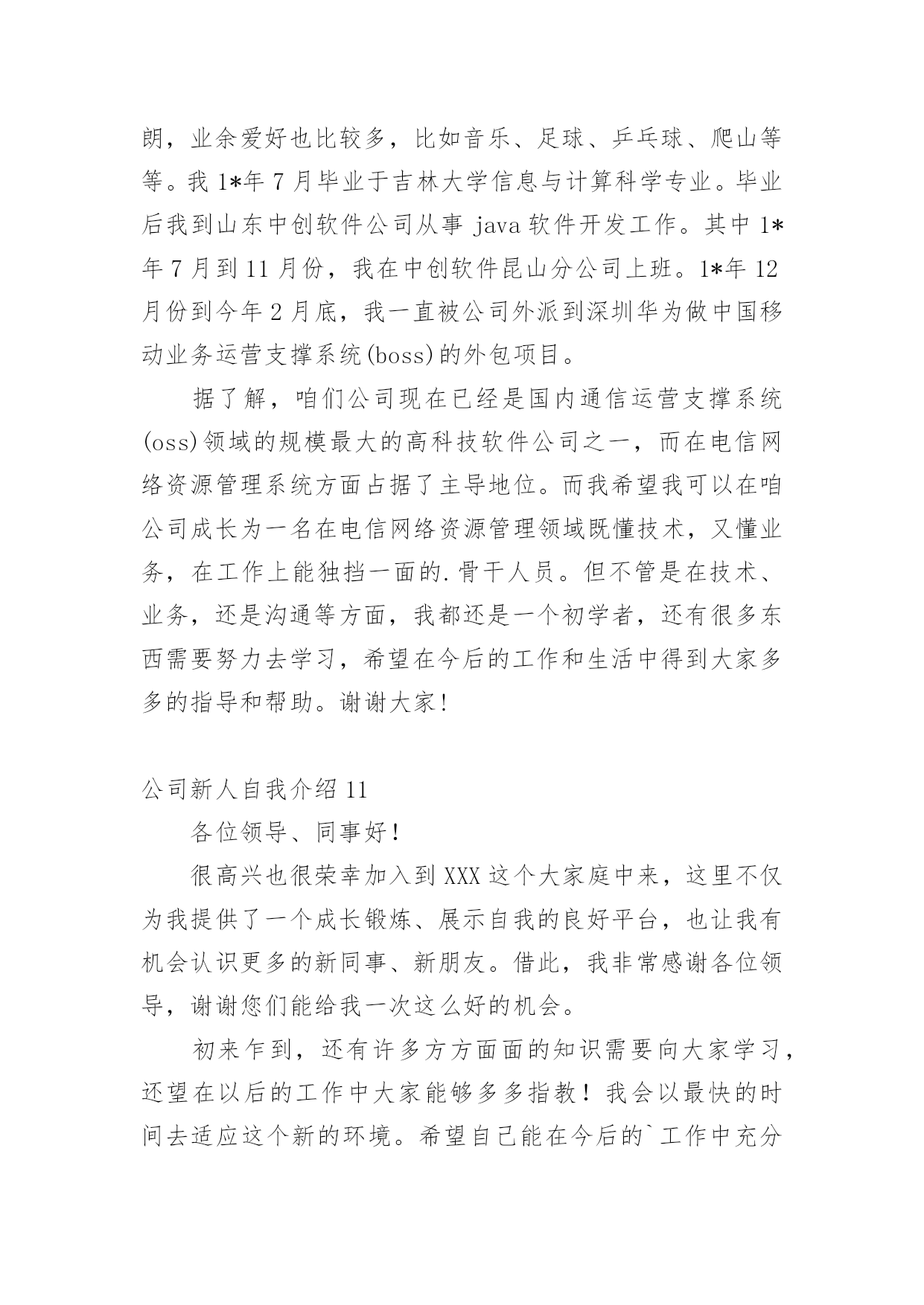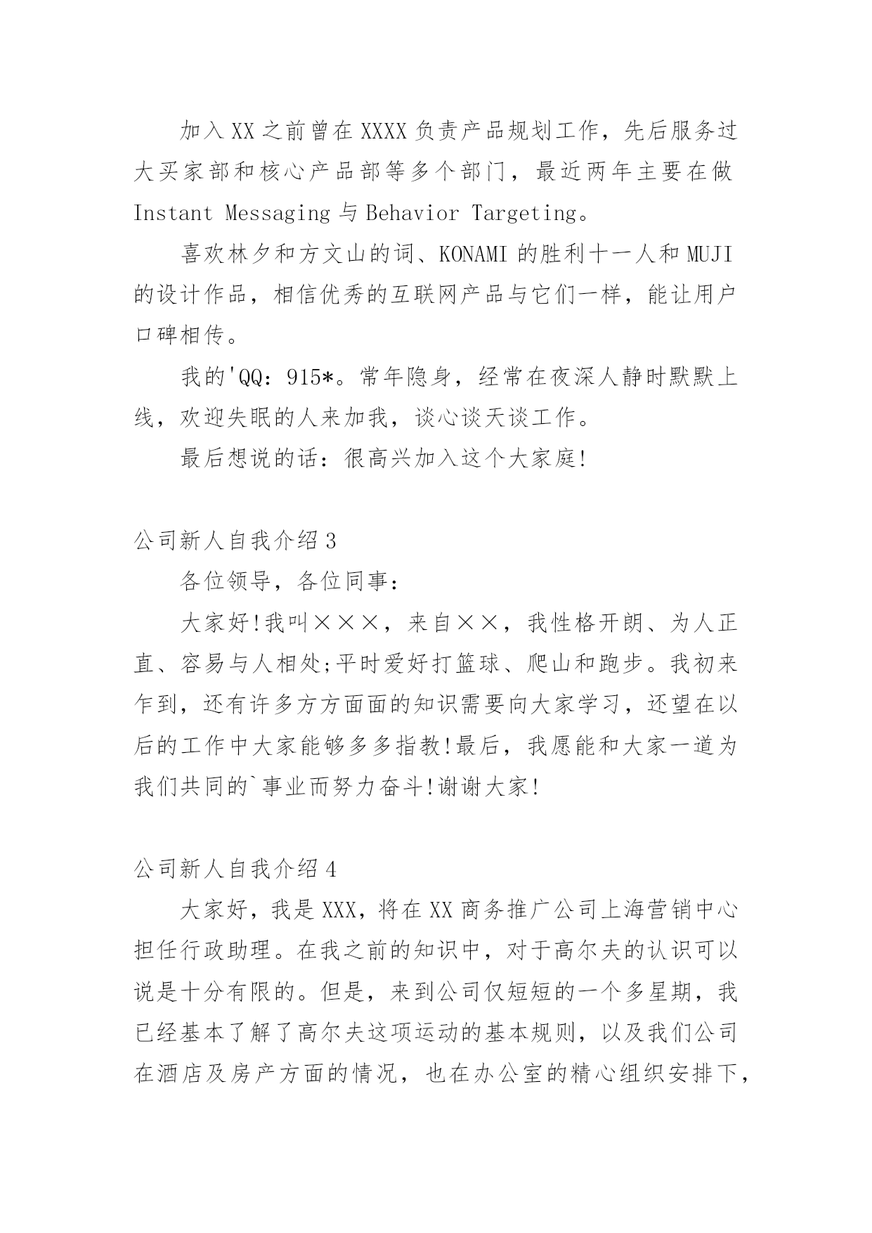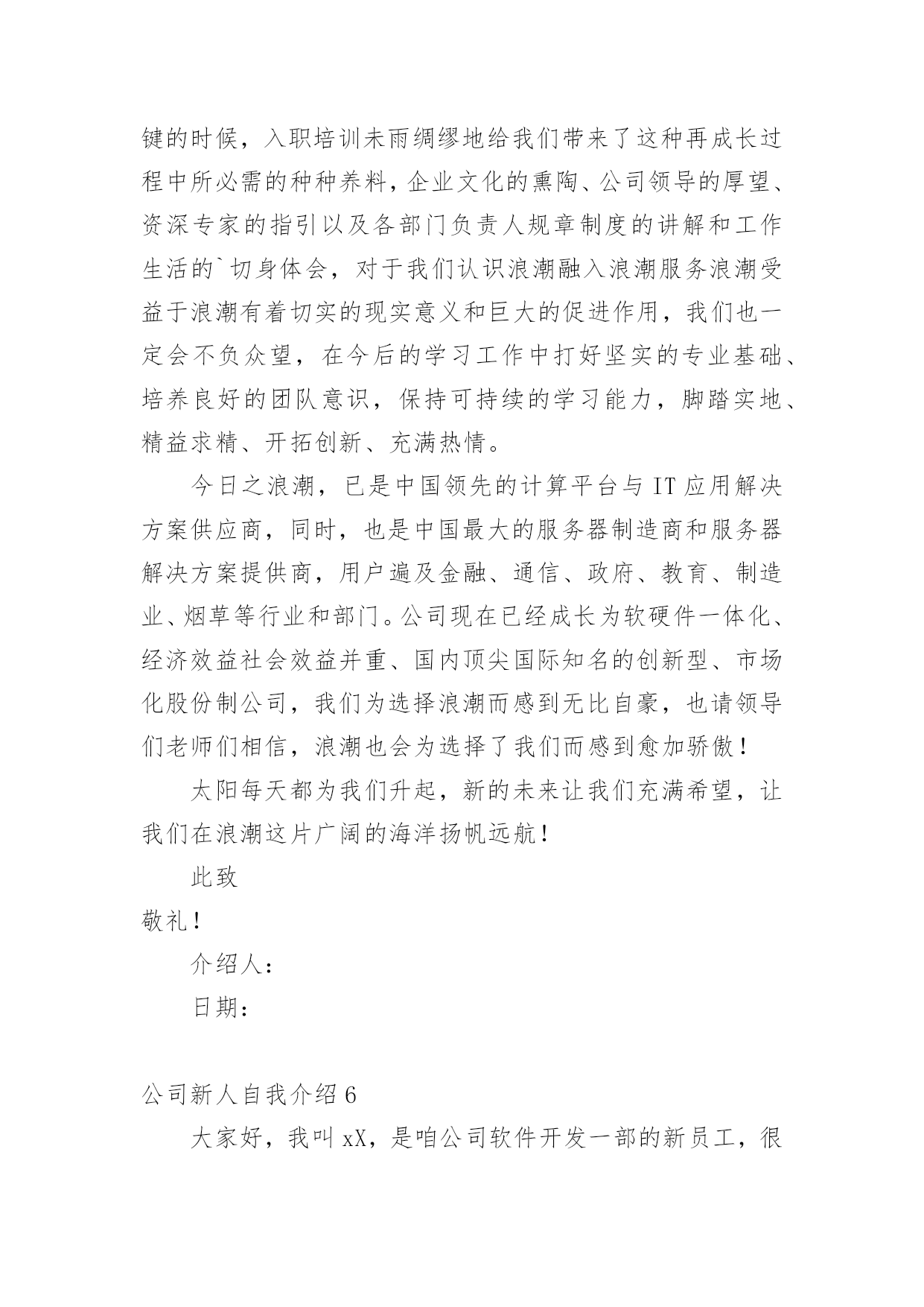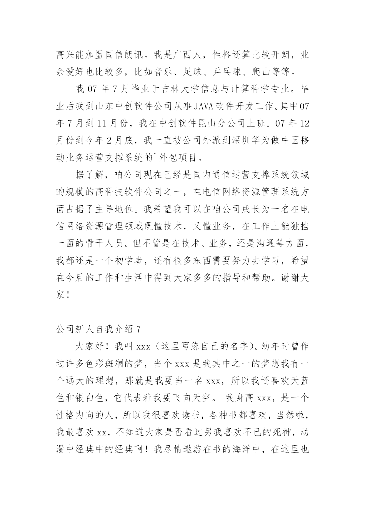 公司新人自我介绍当我们在一个陌生场合中,时常需要用到自我介绍,通过自我介绍可以得到他人的认可。那么你真的会写自我介绍吗?以下是小编整理的公司新人自我介绍,希望能够帮助到大家。公司新人自我介绍1大家好,我叫xxx,来到xx公司已经有一个星期了,对于一个新入职的员工来说,我想在今后的工作上还有很多的`东西需要去学习,需要去向很多同事们、领导们去请教,在此,先谢谢大家了我会以最快的时间去适应这个新的环境。希望自己能在今后的工作中充分发挥自己的专业特长,高效率完成公司领导安排的每一项工作,为xx公司的明天贡献自己的一份力量。谢谢。公司新人自我介绍2身份证上的名字是XXX,最常用的花名叫无忌;不过现在连芷若都没找到,更别提赵敏了。男性,三十,家在南京人在上海,心在哪里不好说,有时篮球场,有时互联网。7月1日正式成为XX一名光荣的产品经理,目前会先关注XXX业务。加入XX之前曾在XXXX负责产品规划工作,先后服务过大买家部和核心产品部等多个部门,最近两年主要在做InstantMessaging与BehaviorTargeting。喜欢林夕和方文山的词、KONAMI的胜利十一人和MUJI的设计作品,相信优秀的互联网产品与它们一样,能让用户口碑相传。我的'QQ:915*。常年隐身,经常在夜深人静时默默上线,欢迎失眠的人来加我,谈心谈天谈工作。最后想说的话:很高兴加入这个大家庭!公司新人自我介绍3各位领导,各位同事:大家好!我叫×××,来自××,我性格开朗、为人正直、容易与人相处;平时爱好打篮球、爬山和跑步。我初来乍到,还有许多方方面面的知识需要向大家学习,还望在以后的工作中大家能够多多指教!最后,我愿能和大家一道为我们共同的`事业而努力奋斗!谢谢大家!公司新人自我介绍4大家好,我是XXX,将在XX商务推广公司上海营销中心担任行政助理。在我之前的知识中,对于高尔夫的认识可以说是十分有限的。但是,来到公司仅短短的一个多星期,我已经基本了解了高尔夫这项运动的基本规则,以及我们公司在酒店及房产方面的情况,也在办公室的精心组织安排下,参观了公司的'球场和酒店式公寓,了解了集团的发展历史和宏伟战略规划,这使我对公司有了进一步认识,也使我看到了公司光明的发展前景。而我也将在未来的日子里,充分利用我之前的行政工作经验,结合公司的实际运作情况,认真仔细地工作。在保证遵守公司基本塬则的大前提下,努力为上海营销中心,乃至全公司的同事们服务,做好行政的工作,为公司的发展添砖加瓦。公司新人自我介绍5敬爱的老师,亲爱的同学们:此刻请允许我还这样称呼大家,为期一周的08届新员工入职培训到今天就要暂告一段落了,这段充实而愉快的经历让我们受到了人生中第一次重大转折的职业洗礼,在培训中我们聆听了辛总对企业文化高屋建瓴又深入浅出的讲解阐述,我们感受到冷总一点也不冷,很温暖也很亲切,我们接受着丁老师每天的问候,我们的回答‘好,很好,非常好’已经成了我们新的职业写照,还有苏老师热情爽朗的笑声,袁经理从电影中给予的深刻启迪,准妈妈老师的不辞劳苦早来晚走,点点滴滴等等等等,我们都不会忘记,是你们的关怀培养让我们健康成长、快速成才、获得成功,在此请允许我代表所有参加培训的同事们向各位领导各位老师表示衷心的感谢!祝愿你们工作顺利,健康开心!在由一名单纯的学生成长到一位职业的社会人的最关键的时候,入职培训未雨绸缪地给我们带来了这种再成长过程中所必需的种种养料,企业文化的熏陶、公司领导的厚望、资深专家的指引以及各部门负责人规章制度的讲解和工作生活的`切身体会,对于我们认识浪潮融入浪潮服务浪潮受益于浪潮有着切实的现实意义和巨大的促进作用,我们也一定会不负众望,在今后的学习工作中打好坚实的专业基础、培养良好的团队意识,保持可持续的学习能力,脚踏实地、精益求精、开拓创新、充满热情。今日之浪潮,已是中国领先的计算平台与IT应用解决方案供应商,同时,也是中国最大的服务器制造商和服务器解决方案提供商,用户遍及金融、通信、政府、教育、制造业、烟草等行业和部门。公司现在已经成长为软硬件一体化、经济效益社会效益并重、国内顶尖国际知名的创新型、市场化股份制公司,我们为选择浪潮而感到无比自豪,也请领导们老师们相信,浪潮也会为选择了我们而感到愈加骄傲!太阳每天都为我们升起,新的未来让我们充满希望,让我们在浪潮这片广阔的海洋扬帆远航!此致敬礼!介绍人:日期:公司新人自我介绍6大家好,我叫xX,是咱公司软件开发一部的新员工,很高兴能加盟国信朗讯。我是广西人,性格还算比较开朗,业余爱好也比较多,比如音乐、足球、乒乓球、爬山等等。我07年7月毕业于吉林大学信息与计算科学专业。毕业后我到山东中创软件公司从事JAVA软件开发工作。其中07年7月到11月份,我在中创软件昆山分公司上班。07年12月份到今年2月底,我一直被公司外派