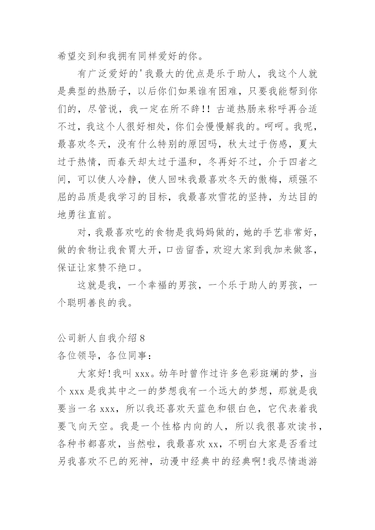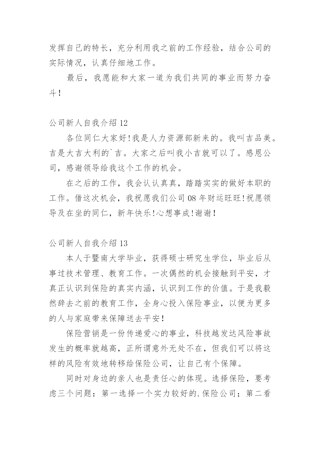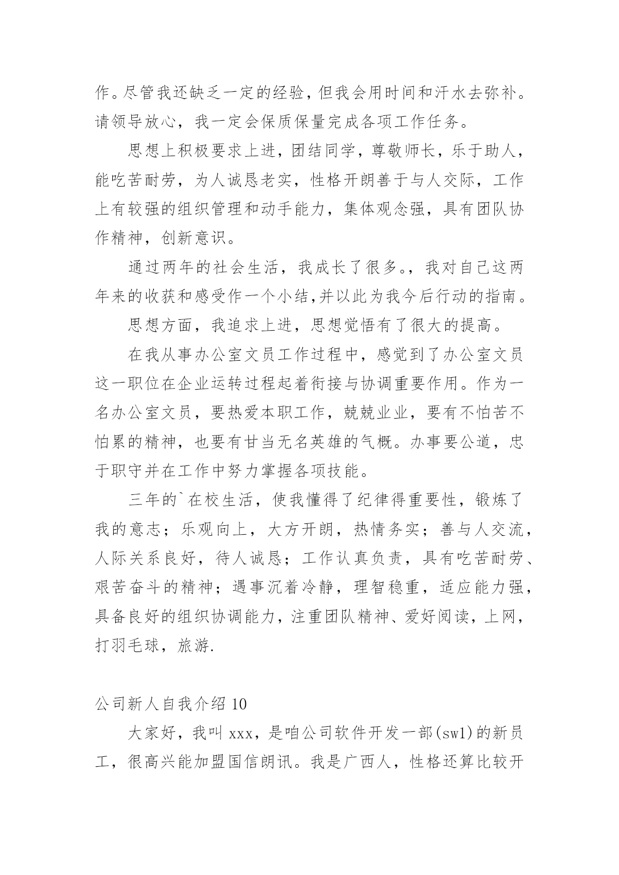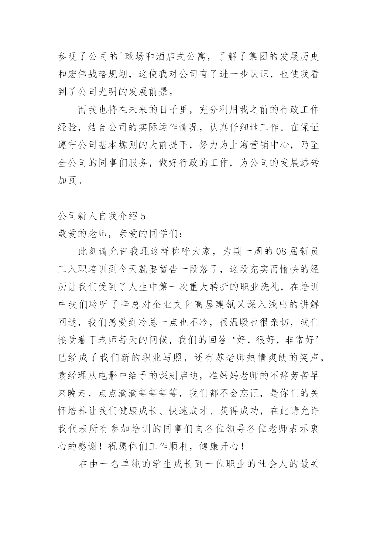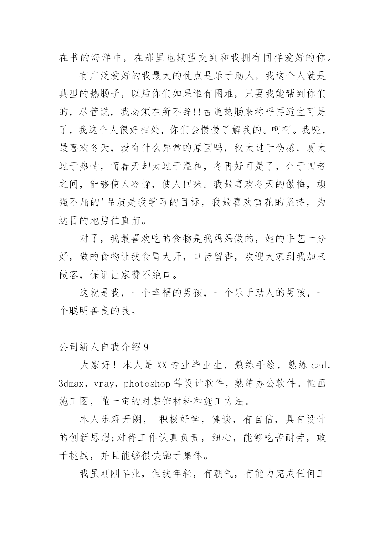 公司新人自我介绍当我们在一个陌生场合中,时常需要用到自我介绍,通过自我介绍可以得到他人的认可。那么你真的会写自我介绍吗?以下是小编整理的公司新人自我介绍,希望能够帮助到大家。公司新人自我介绍1大家好,我叫xxx,来到xx公司已经有一个星期了,对于一个新入职的员工来说,我想在今后的工作上还有很多的`东西需要去学习,需要去向很多同事们、领导们去请教,在此,先谢谢大家了我会以最快的时间去适应这个新的环境。希望自己能在今后的工作中充分发挥自己的专业特长,高效率完成公司领导安排的每一项工作,为xx公司的明天贡献自己的一份力量。谢谢。公司新人自我介绍2身份证上的名字是XXX,最常用的花名叫无忌;不过现在连芷若都没找到,更别提赵敏了。男性,三十,家在南京人在上海,心在哪里不好说,有时篮球场,有时互联网。7月1日正式成为XX一名光荣的产品经理,目前会先关注XXX业务。加入XX之前曾在XXXX负责产品规划工作,先后服务过大买家部和核心产品部等多个部门,最近两年主要在做InstantMessaging与BehaviorTargeting。喜欢林夕和方文山的词、KONAMI的胜利十一人和MUJI的设计作品,相信优秀的互联网产品与它们一样,能让用户口碑相传。我的'QQ:915*。常年隐身,经常在夜深人静时默默上线,欢迎失眠的人来加我,谈心谈天谈工作。最后想说的话:很高兴加入这个大家庭!公司新人自我介绍3各位领导,各位同事:大家好!我叫×××,来自××,我性格开朗、为人正直、容易与人相处;平时爱好打篮球、爬山和跑步。我初来乍到,还有许多方方面面的知识需要向大家学习,还望在以后的工作中大家能够多多指教!最后,我愿能和大家一道为我们共同的`事业而努力奋斗!谢谢大家!公司新人自我介绍4大家好,我是XXX,将在XX商务推广公司上海营销中心担任行政助理。在我之前的知识中,对于高尔夫的认识可以说是十分有限的。但是,来到公司仅短短的一个多星期,我已经基本了解了高尔夫这项运动的基本规则,以及我们公司在酒店及房产方面的情况,也在办公室的精心组织安排下,参观了公司的'球场和酒店式公寓,了解了集团的发展历史和宏伟战略规划,这使我对公司有了进一步认识,也使我看到了公司光明的发展前景。而我也将在未来的日子里,充分利用我之前的行政工作经验,结合公司的实际运作情况,认真仔细地工作。在保证遵守公司基本塬则的大前提下,努力为上海营销中心,乃至全公司的同事们服务,做好行政的工作,为公司的发展添砖加瓦。公司新人自我介绍5敬爱的老师,亲爱的同学们:此刻请允许我还这样称呼大家,为期一周的08届新员工入职培训到今天就要暂告一段落了,这段充实而愉快的经历让我们受到了人生中第一次重大转折的职业洗礼,在培训中我们聆听了辛总对企业文化高屋建瓴又深入浅出的讲解阐述,我们感受到冷总一点也不冷,很温暖也很亲切,我们接受着丁老师每天的问候,我们的回答‘好,很好,非常好’已经成了我们新的职业写照,还有苏老师热情爽朗的笑声,袁经理从电影中给予的深刻启迪,准妈妈老师的不辞劳苦早来晚走,点点滴滴等等等等,我们都不会忘记,是你们的关怀培养让我们健康成长、快速成才、获得成功,在此请允许我代表所有参加培训的同事们向各位领导各位老师表示衷心的感谢!祝愿你们工作顺利,健康开心!在由一名单纯的学生成长到一位职业的社会人的最关键的时候,入职培训未雨绸缪地给我们带来了这种再成长过程中所必需的种种养料,企业文化的熏陶、公司领导的厚望、资深专家的指引以及各部门负责人规章制度的讲解和工作生活的`切身体会,对于我们认识浪潮融入浪潮服务浪潮受益于浪潮有着切实的现实意义和巨大的促进作用,我们也一定会不负众望,在今后的学习工作中打好坚实的专业基础、培养良好的团队意识,保持可持续的学习能力,脚踏实地、精益求精、开拓创新、充满热情。今日之浪潮,已是中国领先的计算平台与IT应用解决方案供应商,同时,也是中国最大的服务器制造商和服务器解决方案提供商,用户遍及金融、通信、政府、教育、制造业、烟草等行业和部门。公司现在已经成长为软硬件一体化、经济效益社会效益并重、国内顶尖国际知名的创新型、市场化股份制公司,我们为选择浪潮而感到无比自豪,也请领导们老师们相信,浪潮也会为选择了我们而感到愈加骄傲!太阳每天都为我们升起,新的未来让我们充满希望,让我们在浪潮这片广阔的海洋扬帆远航!此致敬礼!介绍人:日期:公司新人自我介绍6大家好,我叫xX,是咱公司软件开发一部的新员工,很高兴能加盟国信朗讯。我是广西人,性格还算比较开朗,业余爱好也比较多,比如音乐、足球、乒乓球、爬山等等。我07年7月毕业于吉林大学信息与计算科学专业。毕业后我到山东中创软件公司从事JAVA软件开发工作。其中07年7月到11月份,我在中创软件昆山分公司上班。07年12月份到今年2月底,我一直被公司外派