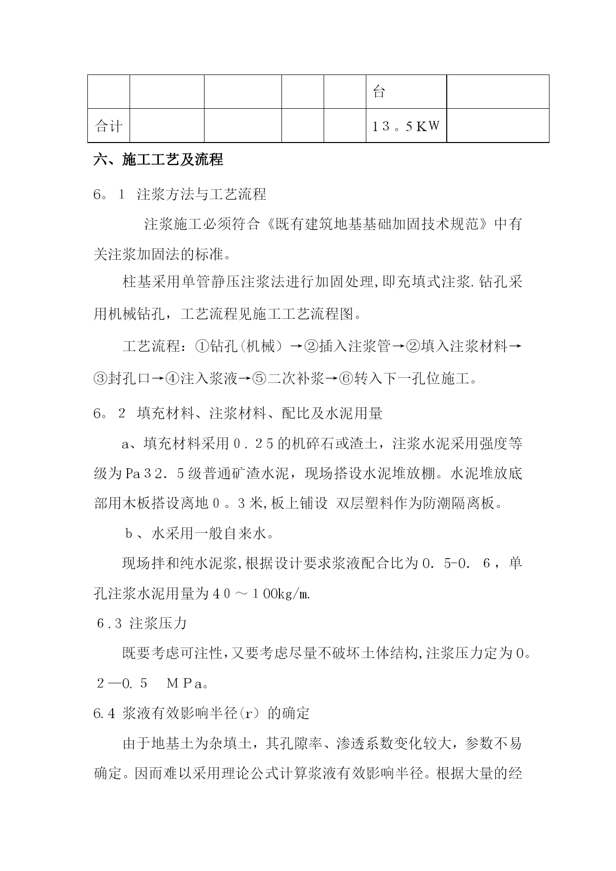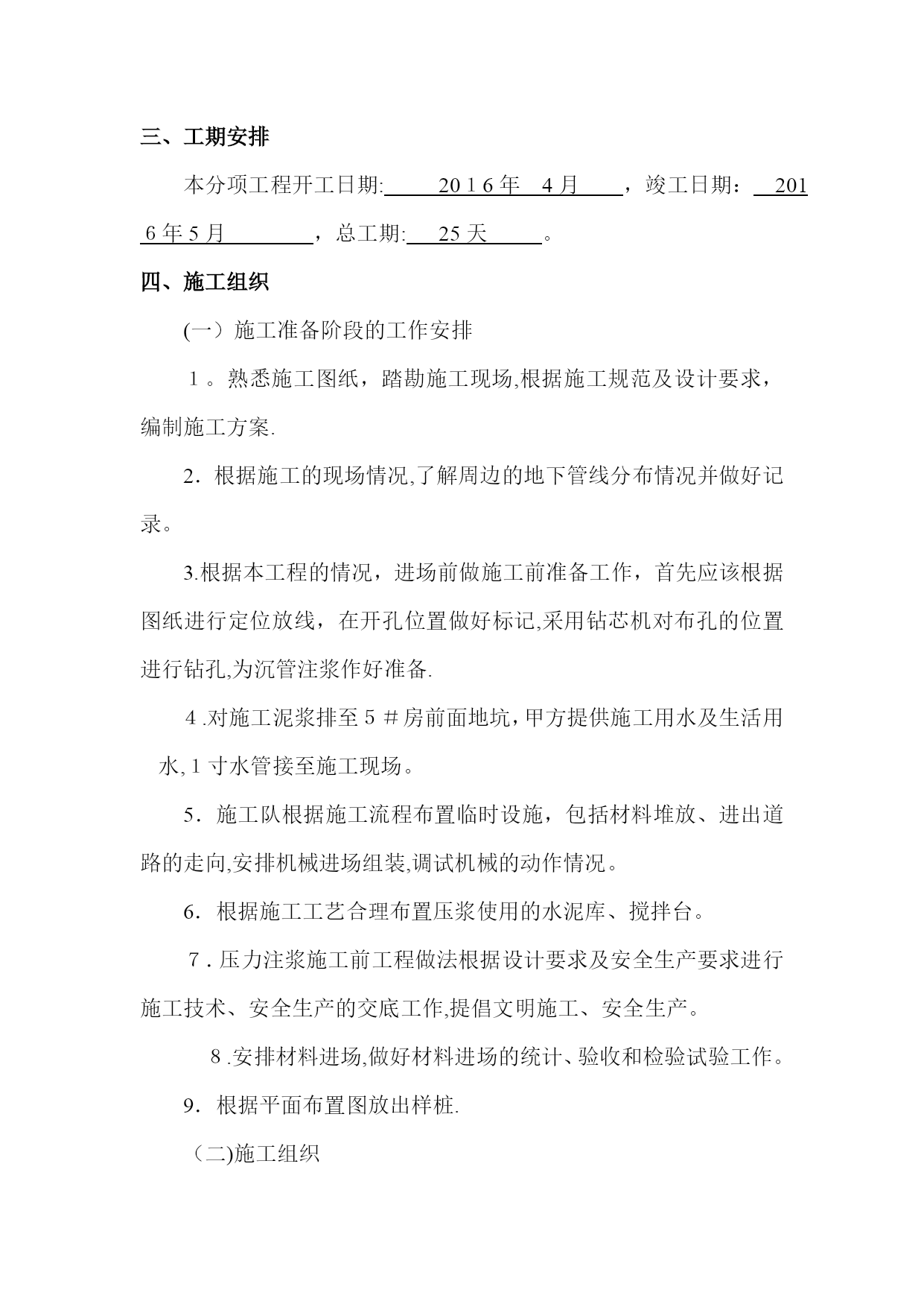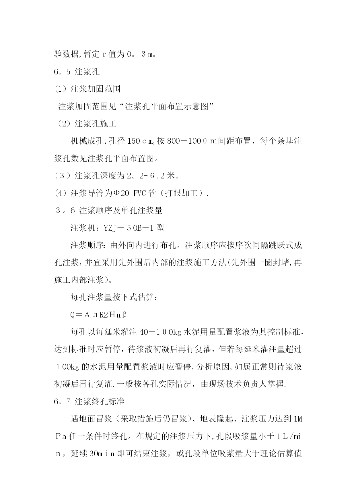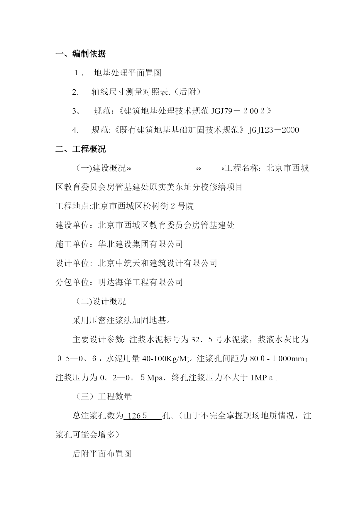 地基及基础加固压密注浆施工方案(完整资料)(可以直接使用,可编辑优秀版资料,欢迎下载)北京市西城区教育委员会房管基建处原实美东址分校修缮项目地基与基础加固专项施工方案2016年3月目录编制依据…………………………………………………………………………..1工程概况……………………………………………………………………………1建设概况……………………………………………………………………1设计概况……………………………………………………………………1工程数量……………………………………………………………………1工期安排……………………………………………………………………………1施工组织……………………………………………………………………。。……1施工准备阶段的工作安排…………………………………………………1施工组织……………………………………………………………………2资源组织……………………………………………………………………………2劳动力组织…………………………………………………………………2机械组织……………………………………………………………………2施工工艺及流程……………………………………………………………………3质量保证措施………………………………………………………………………5质量保证措施………………………………………………………………5技术控制措施………………………………………………………………6安全施工措施………………………………………………………………………6文明施工措施………………………………………………………………………7环境保护措施………………………………………………………………………7一、编制依据1.地基处理平面置图2.轴线尺寸测量对照表.(后附)3。规范:《建筑地基处理技术规范JGJ79-2002》4.规范:《既有建筑地基基础加固技术规范》JGJ123-2000二、工程概况(一)建设概况ﻩﻩﻩﻩﻩ工程名称:北京市西城区教育委员会房管基建处原实美东址分校修缮项目工程地点:北京市西城区松树街2号院建设单位:北京市西城区教育委员会房管基建处施工单位:华北建设集团有限公司设计单位:北京中筑天和建筑设计有限公司分包单位:明达海洋工程有限公司(二)设计概况采用压密注浆法加固地基。主要设计参数:注浆水泥标号为32.5号水泥浆,浆液水灰比为0.5—0。6,水泥用量40-100Kg/M;。注浆孔间距为800-1000mm;注浆压力为0。2—0。5Mpa.终孔注浆压力不大于1MPa.(三)工程数量总注浆孔数为1265孔。(由于不完全掌握现场地质情况,注浆孔可能会增多)后附平面布置图三、工期安排本分项工程开工日期:2016年4月,竣工日期:2016年5月,总工期:25天。四、施工组织(一)施工准备阶段的工作安排1。熟悉施工图纸,踏勘施工现场,根据施工规范及设计要求,编制施工方案.2.根据施工的现场情况,了解周边的地下管线分布情况并做好记录。3.根据本工程的情况,进场前做施工前准备工作,首先应该根据图纸进行定位放线,在开孔位置做好标记,采用钻芯机对布孔的位置进行钻孔,为沉管注浆作好准备.4.对施工泥浆排至5#房前面地坑,甲方提供施工用水及生活用水,1寸水管接至施工现场。5.施工队根据施工流程布置临时设施,包括材料堆放、进出道路的走向,安排机械进场组装,调试机械的动作情况。6.根据施工工艺合理布置压浆使用的水泥库、搅拌台。7.压力注浆施工前工程做法根据设计要求及安全生产要求进行施工技术、安全生产的交底工作,提倡文明施工、安全生产。8.安排材料进场,做好材料进场的统计、验收和检验试验工作。9.根据平面布置图放出样桩.(二)施工组织作业安排:本工程计划3套设备白天进行作业。五、资源组织(一)劳动力组织本工程配备管理人员7人,工作内容见下表所示:管理类别人数内容管理类别人数内容项目经理1负责工程全面工作安全负责人1负责工程施工现场安全质量负责人1负责工程施工质量施工负责人1负责工程施工技术负责人1负责工程施工技术施工员1工程施工现场管理本工程配备劳动力10名,组成三个班组,班长1人,操作组员7人。(二)机械组织机械需要量计划表序号机具名你规格型号单位数量功率用途1跟管钻孔型钻机SH-30台24KW/台压水泥浆2搅拌机SM-200台22KW/台拌制水泥浆3振动机台11.5KW/台沉管合计13。5KW六、施工工艺及流程6。1注浆方法与工艺流程注浆施工必须符合《既有建筑地基基础加固技术规范》中有关注浆加固法的标准。柱基采用单管静压注浆法进行加固处理,即充填式注