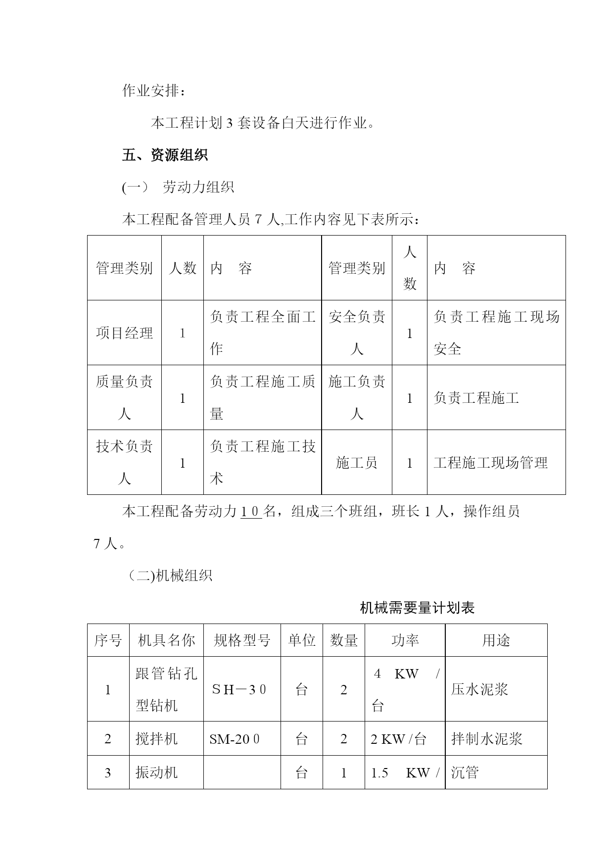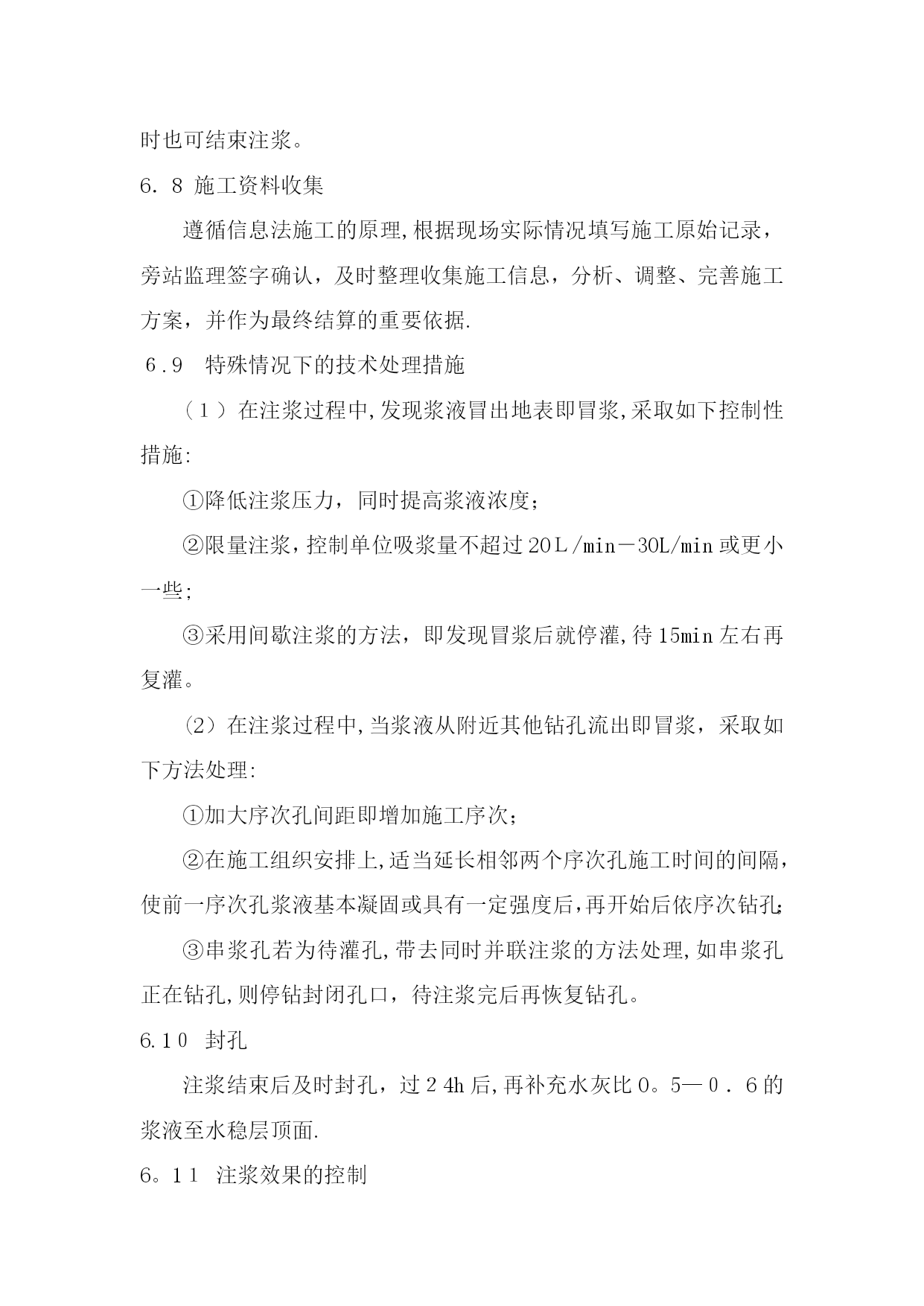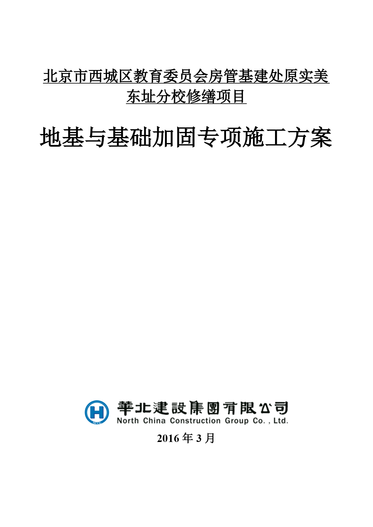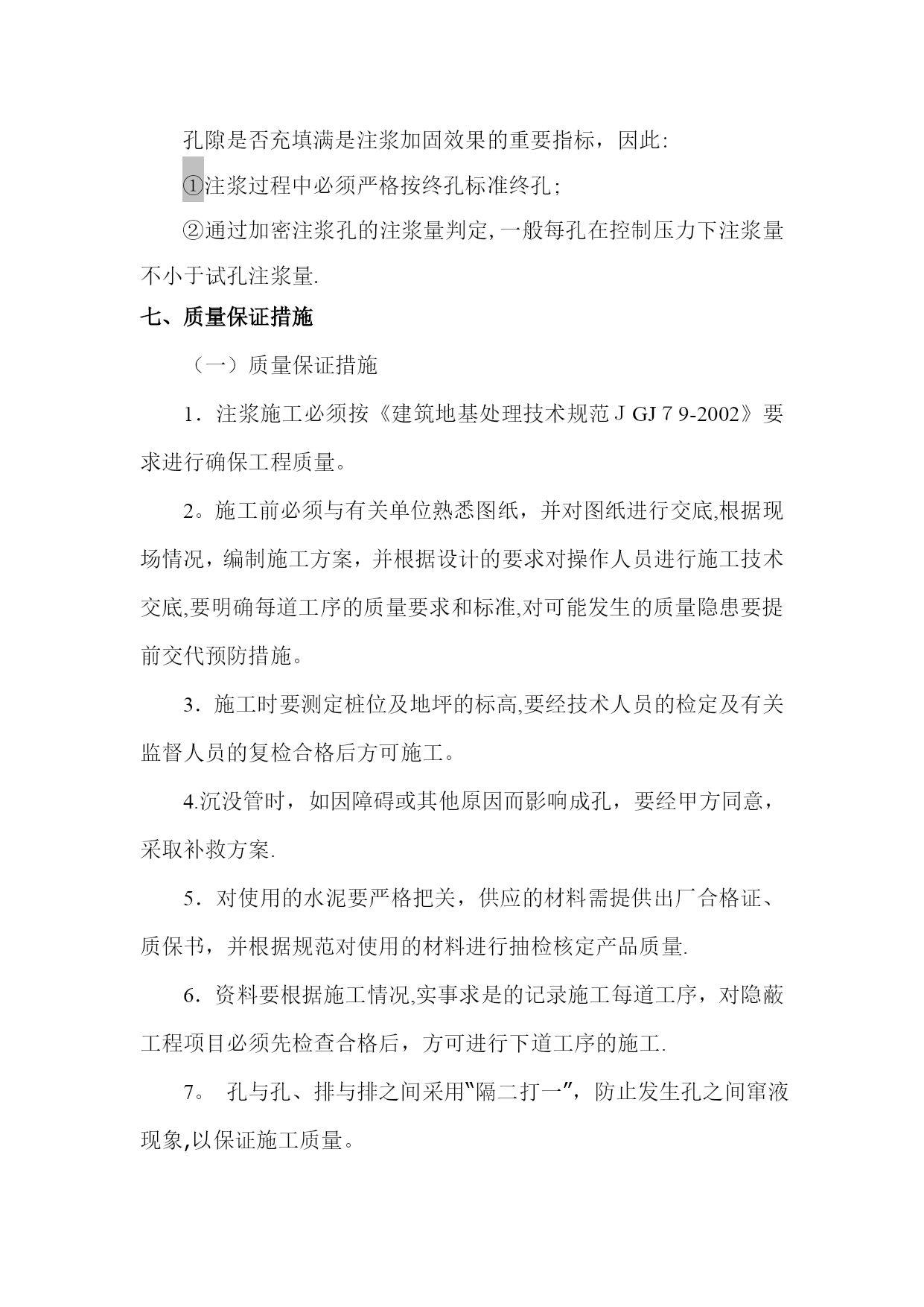 地基及基础加固压密注浆施工方案(完整资料)(可以直接使用,可编辑优秀版资料,欢迎下载)北京市西城区教育委员会房管基建处原实美东址分校修缮项目地基与基础加固专项施工方案2016年3月目录编制依据…………………………………………………………………………..1工程概况……………………………………………………………………………1建设概况……………………………………………………………………1设计概况……………………………………………………………………1工程数量……………………………………………………………………1工期安排……………………………………………………………………………1施工组织……………………………………………………………………。。……1施工准备阶段的工作安排…………………………………………………1施工组织……………………………………………………………………2资源组织……………………………………………………………………………2劳动力组织…………………………………………………………………2机械组织……………………………………………………………………2施工工艺及流程……………………………………………………………………3质量保证措施………………………………………………………………………5质量保证措施………………………………………………………………5技术控制措施………………………………………………………………6安全施工措施………………………………………………………………………6文明施工措施………………………………………………………………………7环境保护措施………………………………………………………………………7一、编制依据1.地基处理平面置图2.轴线尺寸测量对照表.(后附)3。规范:《建筑地基处理技术规范JGJ79-2002》4.规范:《既有建筑地基基础加固技术规范》JGJ123-2000二、工程概况(一)建设概况ﻩﻩﻩﻩﻩ工程名称:北京市西城区教育委员会房管基建处原实美东址分校修缮项目工程地点:北京市西城区松树街2号院建设单位:北京市西城区教育委员会房管基建处施工单位:华北建设集团有限公司设计单位:北京中筑天和建筑设计有限公司分包单位:明达海洋工程有限公司(二)设计概况采用压密注浆法加固地基。主要设计参数:注浆水泥标号为32.5号水泥浆,浆液水灰比为0.5—0。6,水泥用量40-100Kg/M;。注浆孔间距为800-1000mm;注浆压力为0。2—0。5Mpa.终孔注浆压力不大于1MPa.(三)工程数量总注浆孔数为1265孔。(由于不完全掌握现场地质情况,注浆孔可能会增多)后附平面布置图三、工期安排本分项工程开工日期:2016年4月,竣工日期:2016年5月,总工期:25天。四、施工组织(一)施工准备阶段的工作安排1。熟悉施工图纸,踏勘施工现场,根据施工规范及设计要求,编制施工方案.2.根据施工的现场情况,了解周边的地下管线分布情况并做好记录。3.根据本工程的情况,进场前做施工前准备工作,首先应该根据图纸进行定位放线,在开孔位置做好标记,采用钻芯机对布孔的位置进行钻孔,为沉管注浆作好准备.4.对施工泥浆排至5#房前面地坑,甲方提供施工用水及生活用水,1寸水管接至施工现场。5.施工队根据施工流程布置临时设施,包括材料堆放、进出道路的走向,安排机械进场组装,调试机械的动作情况。6.根据施工工艺合理布置压浆使用的水泥库、搅拌台。7.压力注浆施工前工程做法根据设计要求及安全生产要求进行施工技术、安全生产的交底工作,提倡文明施工、安全生产。8.安排材料进场,做好材料进场的统计、验收和检验试验工作。9.根据平面布置图放出样桩.(二)施工组织作业安排:本工程计划3套设备白天进行作业。五、资源组织(一)劳动力组织本工程配备管理人员7人,工作内容见下表所示:管理类别人数内容管理类别人数内容项目经理1负责工程全面工作安全负责人1负责工程施工现场安全质量负责人1负责工程施工质量施工负责人1负责工程施工技术负责人1负责工程施工技术施工员1工程施工现场管理本工程配备劳动力10名,组成三个班组,班长1人,操作组员7人。(二)机械组织机械需要量计划表序号机具名你规格型号单位数量功率用途1跟管钻孔型钻机SH-30台24KW/台压水泥浆2搅拌机SM-200台22KW/台拌制水泥浆3振动机台11.5KW/台沉管合计13。5KW六、施工工艺及流程6。1注浆方法与工艺流程注浆施工必须符合《既有建筑地基基础加固技术规范》中有关注浆加固法的标准。柱基采用单管静压注浆法进行加固处理,即充填式注