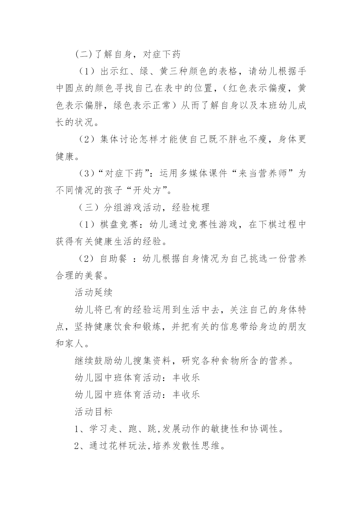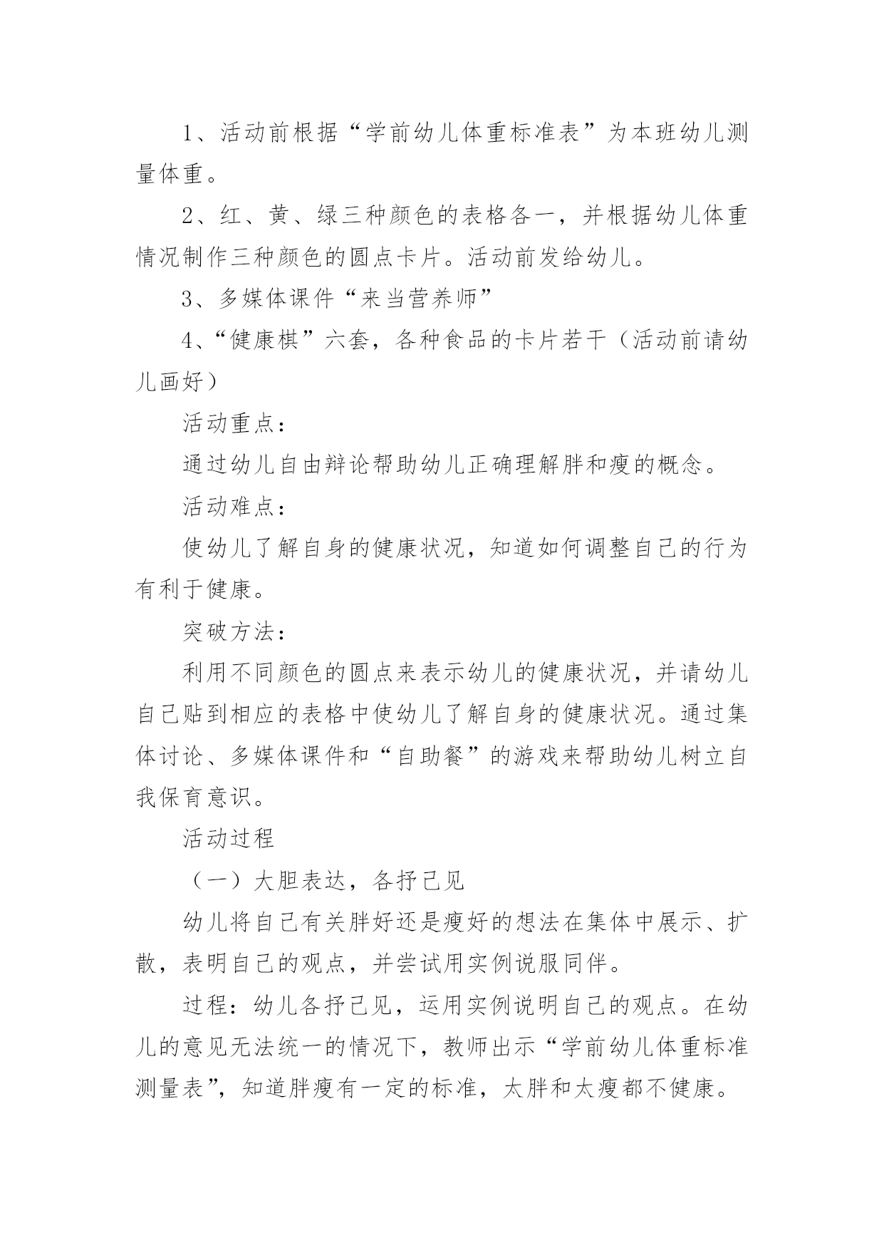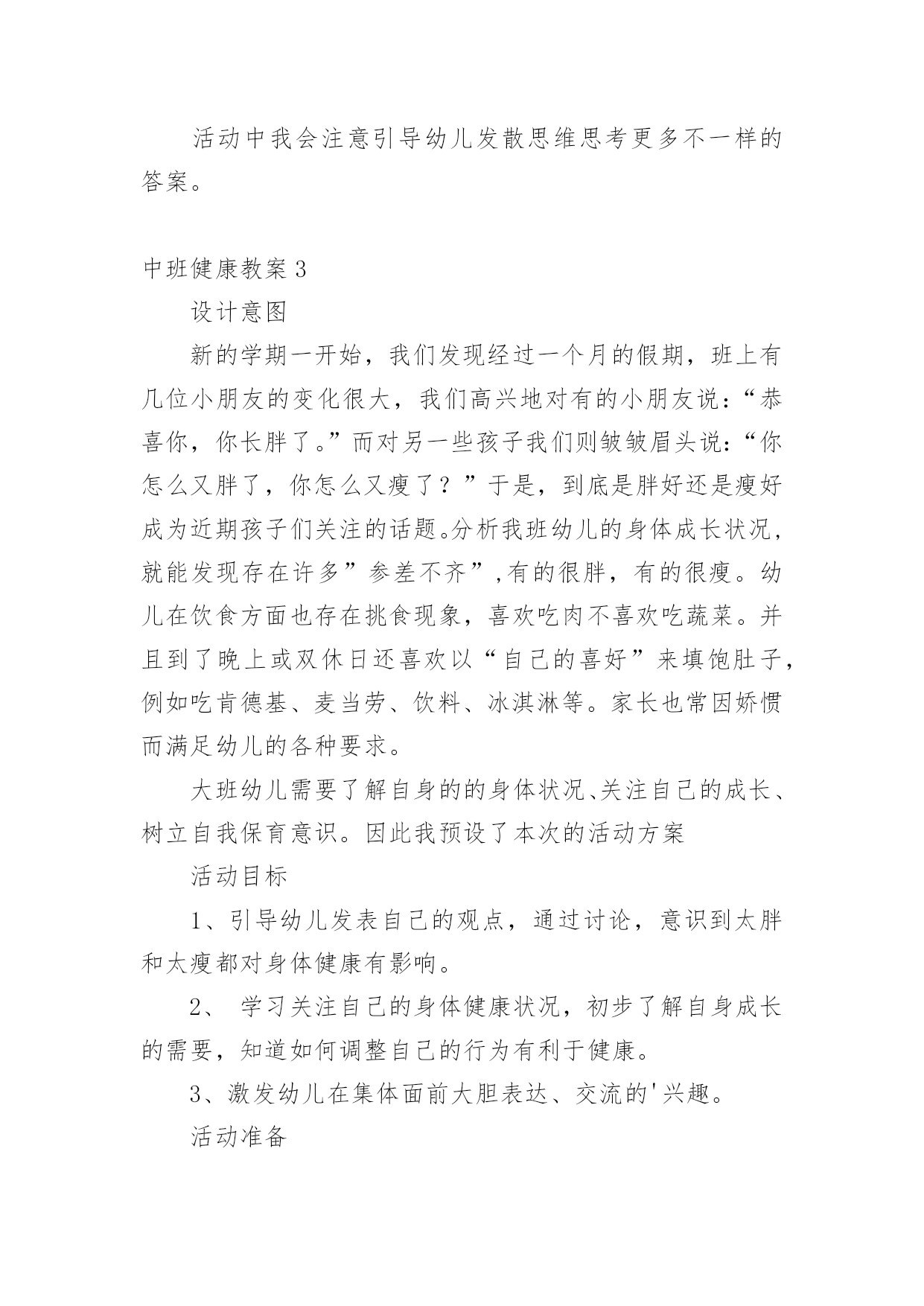 中班健康教案中班健康教案精选[15篇]作为一名为他人授业解惑的教育工作者,时常要开展教案准备工作,教案有助于顺利而有效地开展教学活动。快来参考教案是怎么写的吧!下面是小编收集整理的中班健康教案,供大家参考借鉴,希望可以帮助到有需要的朋友。中班健康教案1活动目标:1、学习弯腰半蹲走;2、锻炼运动的持久性;3、培养初步的规则意识。活动准备:幼儿打扮成小老鼠,纤维袋20个,不同高低的隧道两条,音乐磁带。活动重点:学习弯腰半蹲走活动难点:能加快速度通过不同高度的隧道活动过程:(一)幼儿随音乐入场,做热身运动。教师带领幼儿边念儿歌边动作入场,共同游戏“机灵鼠小弟”(二)练习弯腰半蹲走1、教师引导幼儿观察隧道,自由发挥过隧道的不同方式师:今天鼠妈妈要带孩子们去外面运粮食,看,这是我们要经过的一条隧道,孩子们想想,你有什么好办法可以经过这条隧道,大家都来试试看。2、集体演示①请个别幼儿表演刚才过隧道的不同方法。②教师根据幼儿的表演引出弯腰半蹲走。师:刚才孩子们都想出了很好的办法,可是我们小老鼠在运粮食时很容易被小猫抓住,我们要想出一个能很快通过隧道的方法。3、幼儿集体鱼贯式尝试练习“弯腰半蹲走”。4、集体讲述:你在练习中发现了什么问题?怎样蹲才能更快的通过隧道?5、教师总结幼儿交流的意见,讲解动作要领,进行动作示范。(示范可由幼儿>也可由老师)6、幼儿集体鱼贯式练习一遍,要求慢速通过高隧道。7、增加难度,引出另外一条稍底的`隧道,幼儿尝试练习。8、再次提出要求,请幼儿加快速度通过不同高度的两条隧道。(三)游戏:运粮食1、过渡语:小老鼠这么棒,妈妈寻找到了一些粮食,可妈妈老了,有点搬不动,请你们帮妈妈去运粮食,好吗?2、游戏要求:小老鼠经过这条高一些的隧道,走过独木桥,运一包粮食,再从矮一些的隧道回来。3、幼儿鱼贯式游戏一次。(四)游戏结束1、围着粮食庆祝胜利,同时放松身体。2、带着粮食高兴地出活动室。 中班健康教案2活动目标1、初步了解不同的病菌会传播不同疾病。2、学会对抗不同病菌的方法。3、敢于大胆表达自己的想法,感受分享的乐趣。重点难点1、幼儿了解常见病菌的危害及发病原因。(重点)2、幼儿能根据不同情况准确地说出相应解决方法。(难点)活动准备物质准备:自制绘本故事《病菌来了》,病菌头饰经验准备:幼儿知道细菌的概念活动过程一、谈话导入师:小朋友们,昨天我在回家的路上看见有一个小朋友小手弄得黑黑的就要去吃东西,这样可以吗?(不可以,手上面有细菌)其实细菌也分很多种,会让我们生病的细菌就叫做病菌,我今天就带来了一个关于病菌的故事。二、故事分享《病菌来了》1、教师通过阅读与提问的方式让幼儿认识各种病菌。师:有几位病菌来开会了?他们是谁呢?(引起拉肚子的病菌拉拉,引起感冒的冒冒,引起皮肤病的皮皮和引起牙疼的牙牙)他们做了什么,为什么要这么做呢?(导致人类生病,攻占人体)教师引导幼儿结合自身经历熟悉四种常见病菌并知道发病症状2、通过提问和思考,幼儿了解各个病菌致病原因及预防方法师:拉拉是通过怎样进入人体的呢?(不干净的食物,脏兮兮的'小手等)这位小朋友打喷嚏的时候没有捂住口鼻,谁就顺着喷嚏跑出来攻陷其他人体了?(感冒病菌冒冒)3、幼儿自主思考师:既然病菌侵入到身体里以后这么厉害那为什么病菌大王还是没有占领世界呢?(大家预防得好,人们有相应的医疗措施)三、游戏《病菌来了》师:我刚刚听到我们小朋友都有很多的办法对抗病菌,那么现在老师就要带上病菌标志变成病菌,看看我们小朋友能不能当小小健康卫士。1、教师引导游戏老师说出一些容易致病的状况,幼儿给出解决办法,做出相应动作。师:我要附在小朋友们的手上(我们要洗手)2、幼儿自主思考部分幼儿戴病菌头饰版作病菌向前,幼儿自主说出有益身体的方法击退病(教师可适当引导)3、幼儿主导教师装作病菌侵入人体,另一名教师配合做出相应发病动作,幼儿想办法帮助“生病的”老师。四、活动延伸教师与幼儿一起总结故事与游戏,教师肯定幼儿的表现也提出病菌潜伏在我们身边,我们随时不能掉以轻心,请幼儿回家收集其他会让我们生病的原因,然后小组讨论应对办法,教师协助幼儿记录,做一本《健康小卫士》手册。活动总结这次活动比较成功的是通过和小朋友互动翻阅自制绘本的方式让幼儿乐在其中,大部分幼儿能认识的针对不同的病菌我们有不同的预防方法,其中还存在的不足是幼儿对于预防病菌的方法认识较为局限,容易跟前面的小朋友说一样的答案,以后的活动中我会注意引导幼儿发散思维思考更多不一样的答案。中班健康教案3设计意图新的学期一开始,我们发现经过一个月的假期,班上有几位小朋友的变化很大,我们高兴地对有的小朋友说:“恭喜你,你长胖了。”而对另一些孩子我们则皱皱眉头说:“你怎么又胖了,你怎么又瘦了?”于是,到底是胖好还是瘦好成为近期孩子们关注的话题。分析我班幼儿的身