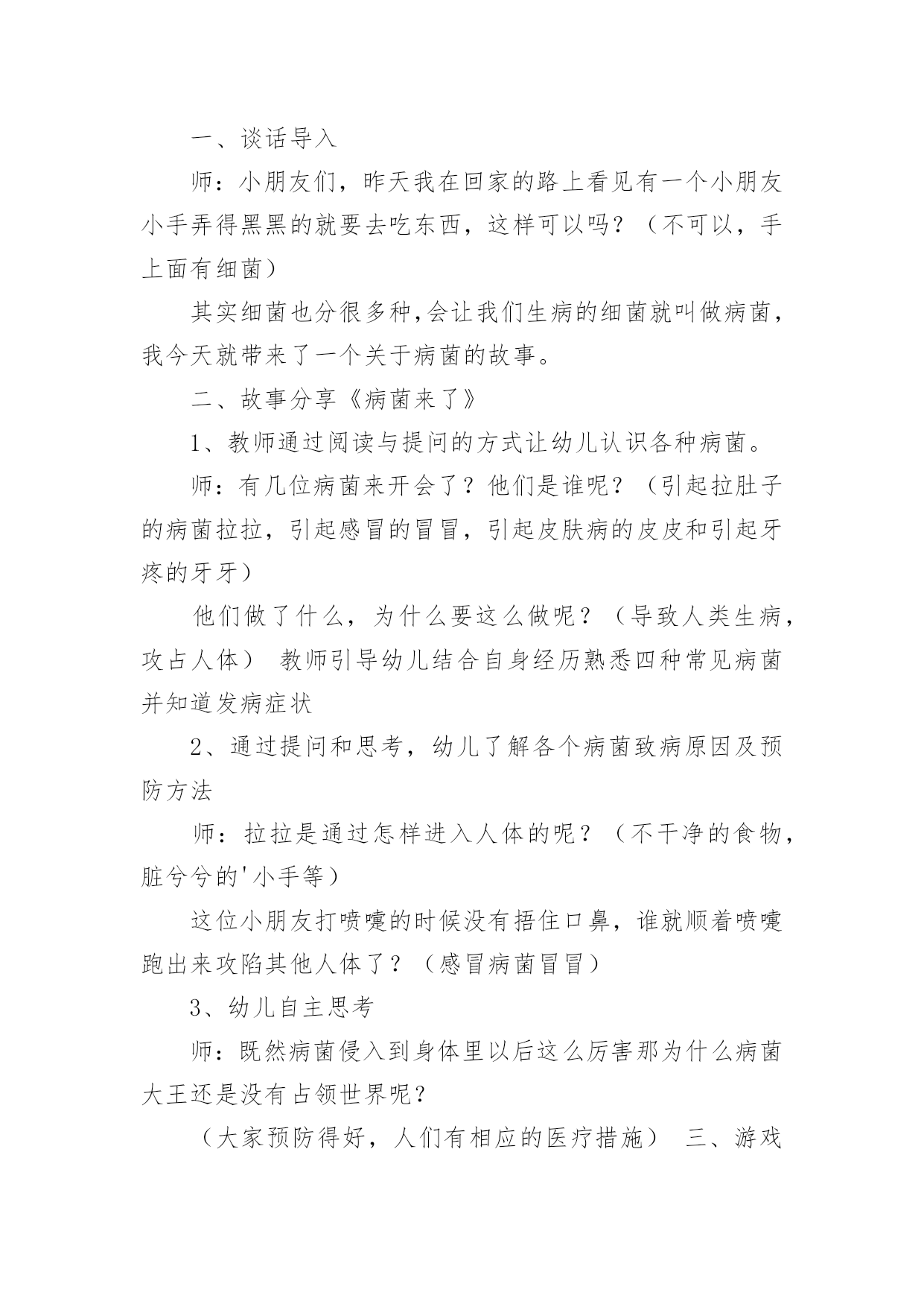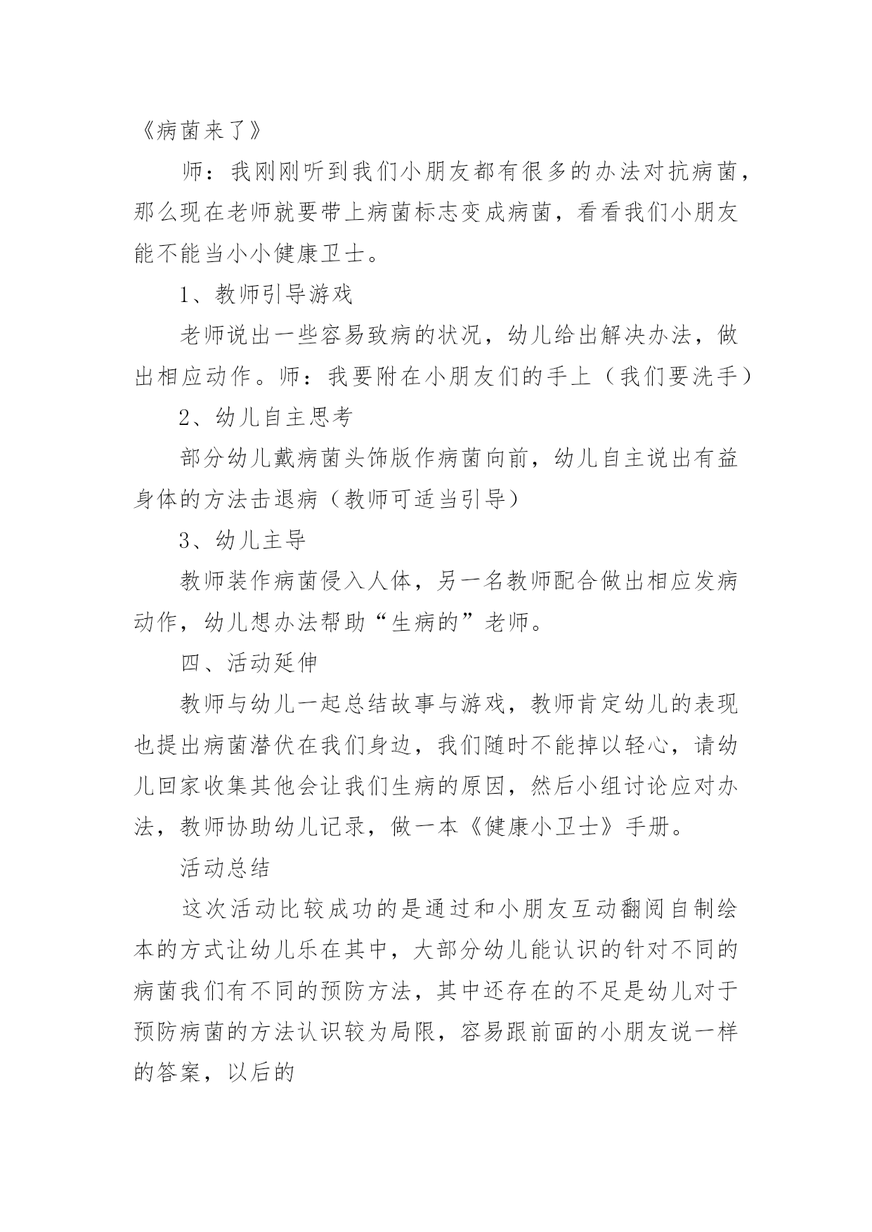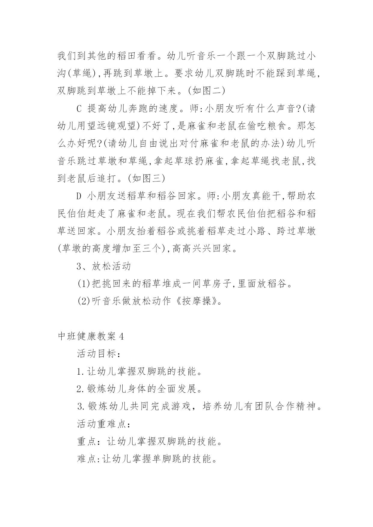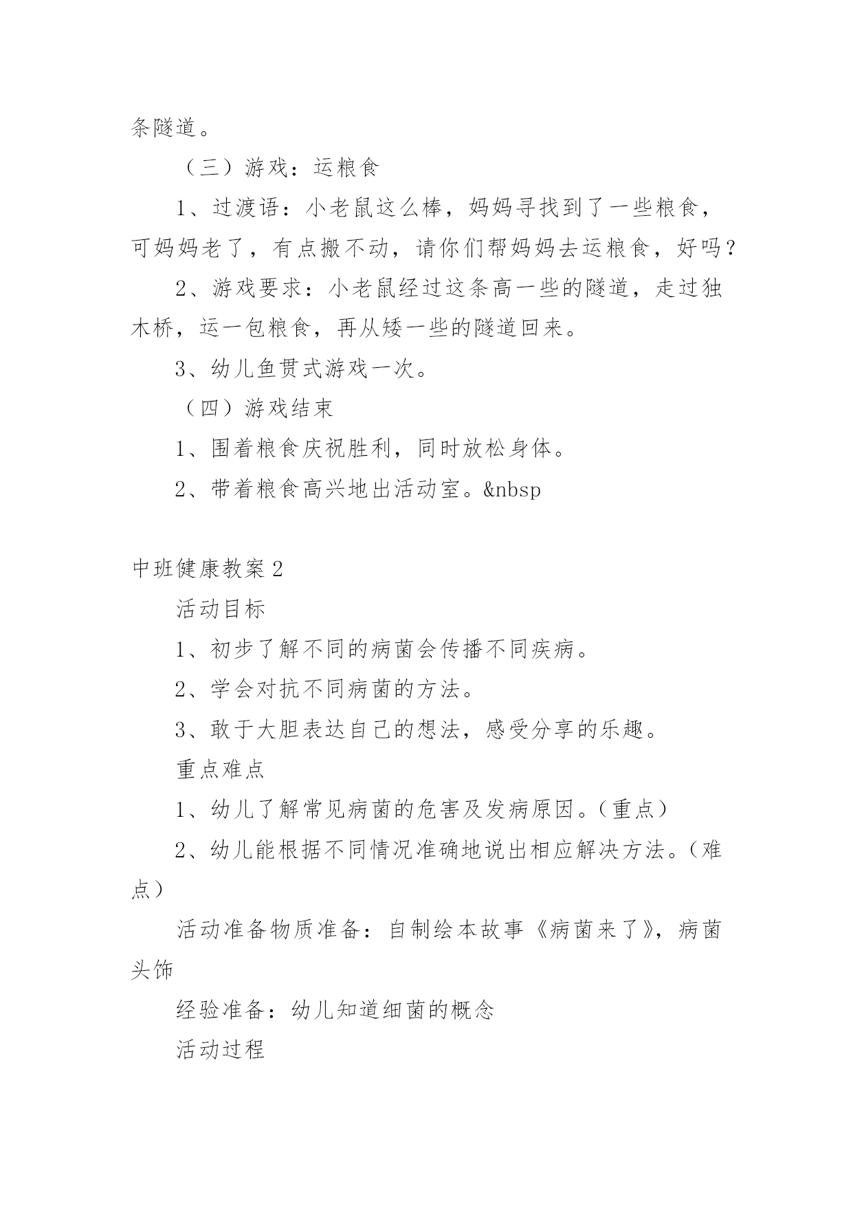 中班健康教案中班健康教案精选[15篇]作为一名为他人授业解惑的教育工作者,时常要开展教案准备工作,教案有助于顺利而有效地开展教学活动。快来参考教案是怎么写的吧!下面是小编收集整理的中班健康教案,供大家参考借鉴,希望可以帮助到有需要的朋友。中班健康教案1活动目标:1、学习弯腰半蹲走;2、锻炼运动的持久性;3、培养初步的规则意识。活动准备:幼儿打扮成小老鼠,纤维袋20个,不同高低的隧道两条,音乐磁带。活动重点:学习弯腰半蹲走活动难点:能加快速度通过不同高度的隧道活动过程:(一)幼儿随音乐入场,做热身运动。教师带领幼儿边念儿歌边动作入场,共同游戏“机灵鼠小弟”(二)练习弯腰半蹲走1、教师引导幼儿观察隧道,自由发挥过隧道的不同方式师:今天鼠妈妈要带孩子们去外面运粮食,看,这是我们要经过的一条隧道,孩子们想想,你有什么好办法可以经过这条隧道,大家都来试试看。2、集体演示①请个别幼儿表演刚才过隧道的不同方法。②教师根据幼儿的表演引出弯腰半蹲走。师:刚才孩子们都想出了很好的办法,可是我们小老鼠在运粮食时很容易被小猫抓住,我们要想出一个能很快通过隧道的方法。3、幼儿集体鱼贯式尝试练习“弯腰半蹲走”。4、集体讲述:你在练习中发现了什么问题?怎样蹲才能更快的通过隧道?5、教师总结幼儿交流的意见,讲解动作要领,进行动作示范。(示范可由幼儿>也可由老师)6、幼儿集体鱼贯式练习一遍,要求慢速通过高隧道。7、增加难度,引出另外一条稍底的`隧道,幼儿尝试练习。8、再次提出要求,请幼儿加快速度通过不同高度的两条隧道。(三)游戏:运粮食1、过渡语:小老鼠这么棒,妈妈寻找到了一些粮食,可妈妈老了,有点搬不动,请你们帮妈妈去运粮食,好吗?2、游戏要求:小老鼠经过这条高一些的隧道,走过独木桥,运一包粮食,再从矮一些的隧道回来。3、幼儿鱼贯式游戏一次。(四)游戏结束1、围着粮食庆祝胜利,同时放松身体。2、带着粮食高兴地出活动室。 中班健康教案2活动目标1、初步了解不同的病菌会传播不同疾病。2、学会对抗不同病菌的方法。3、敢于大胆表达自己的想法,感受分享的乐趣。重点难点1、幼儿了解常见病菌的危害及发病原因。(重点)2、幼儿能根据不同情况准确地说出相应解决方法。(难点)活动准备物质准备:自制绘本故事《病菌来了》,病菌头饰经验准备:幼儿知道细菌的概念活动过程一、谈话导入师:小朋友们,昨天我在回家的路上看见有一个小朋友小手弄得黑黑的就要去吃东西,这样可以吗?(不可以,手上面有细菌)其实细菌也分很多种,会让我们生病的细菌就叫做病菌,我今天就带来了一个关于病菌的故事。二、故事分享《病菌来了》1、教师通过阅读与提问的方式让幼儿认识各种病菌。师:有几位病菌来开会了?他们是谁呢?(引起拉肚子的病菌拉拉,引起感冒的冒冒,引起皮肤病的皮皮和引起牙疼的牙牙)他们做了什么,为什么要这么做呢?(导致人类生病,攻占人体)教师引导幼儿结合自身经历熟悉四种常见病菌并知道发病症状2、通过提问和思考,幼儿了解各个病菌致病原因及预防方法师:拉拉是通过怎样进入人体的呢?(不干净的食物,脏兮兮的'小手等)这位小朋友打喷嚏的时候没有捂住口鼻,谁就顺着喷嚏跑出来攻陷其他人体了?(感冒病菌冒冒)3、幼儿自主思考师:既然病菌侵入到身体里以后这么厉害那为什么病菌大王还是没有占领世界呢?(大家预防得好,人们有相应的医疗措施)三、游戏《病菌来了》师:我刚刚听到我们小朋友都有很多的办法对抗病菌,那么现在老师就要带上病菌标志变成病菌,看看我们小朋友能不能当小小健康卫士。1、教师引导游戏老师说出一些容易致病的状况,幼儿给出解决办法,做出相应动作。师:我要附在小朋友们的手上(我们要洗手)2、幼儿自主思考部分幼儿戴病菌头饰版作病菌向前,幼儿自主说出有益身体的方法击退病(教师可适当引导)3、幼儿主导教师装作病菌侵入人体,另一名教师配合做出相应发病动作,幼儿想办法帮助“生病的”老师。四、活动延伸教师与幼儿一起总结故事与游戏,教师肯定幼儿的表现也提出病菌潜伏在我们身边,我们随时不能掉以轻心,请幼儿回家收集其他会让我们生病的原因,然后小组讨论应对办法,教师协助幼儿记录,做一本《健康小卫士》手册。活动总结这次活动比较成功的是通过和小朋友互动翻阅自制绘本的方式让幼儿乐在其中,大部分幼儿能认识的针对不同的病菌我们有不同的预防方法,其中还存在的不足是幼儿对于预防病菌的方法认识较为局限,容易跟前面的小朋友说一样的答案,以后的活动中我会注意引导幼儿发散思维思考更多不一样的答案。中班健康教案3设计意图新的学期一开始,我们发现经过一个月的假期,班上有几位小朋友的变化很大,我们高兴地对有的小朋友说:“恭喜你,你长胖了。”而对另一些孩子我们则皱皱眉头说:“你怎么又胖了,你怎么又瘦了?”于是,到底是胖好还是瘦好成为近期孩子们关注的话题。分析我班幼儿的身
