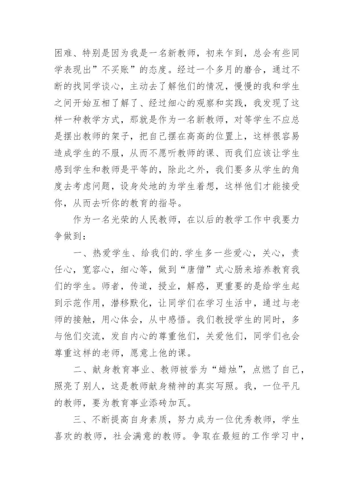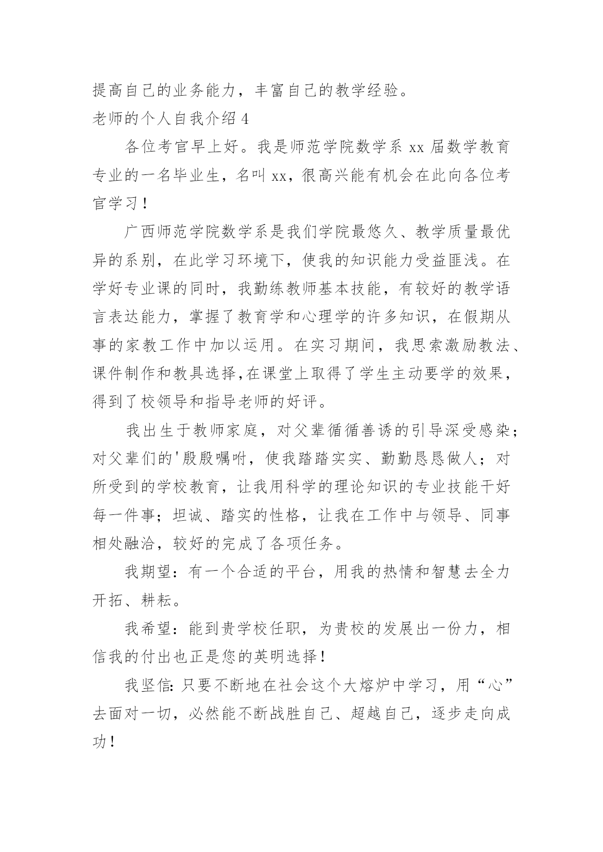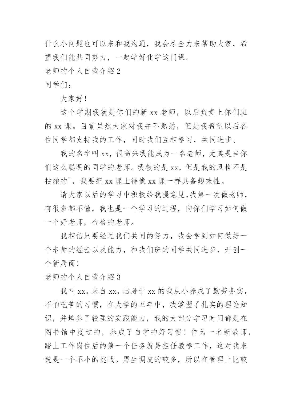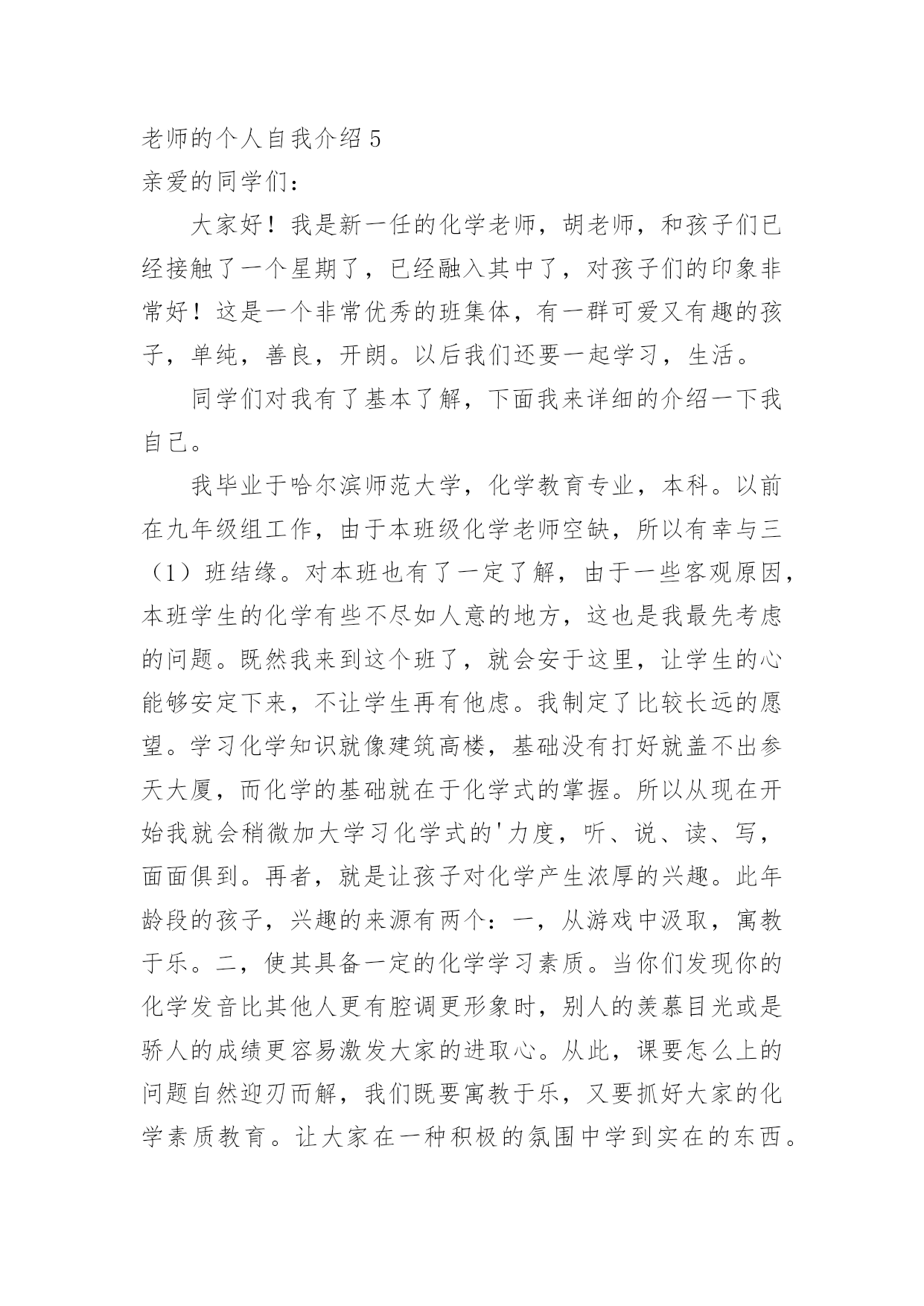老师的个人自我介绍老师的个人自我介绍当来到一个新环境中,常常要进行自我介绍,自我介绍可以给陌生人留下一个好的印象。那么我们该怎么去写自我介绍呢?以下是小编为大家整理的老师的个人自我介绍,仅供参考,大家一起来看看吧。老师的个人自我介绍1亲爱的同学们:大家好,我是代替你们生病的侯老师给你们讲解化学的代课老师,我姓杨,希望大家以后看到我可以叫我杨老师,不要叫我化学老师,因为如果我是教动物学的,那你们不是要叫我动物老师,如果被我听到了谁叫我化学老师,那么我会请你去一楼办公室免费领取化学试卷一份。言归正传,大家都知道化学是一门贴近生活的学科,记忆的东西也很多,所以我希望大家上课能都备一个笔记本,多做笔记,好记性不如烂笔头。这样也方便以后复习。其次我上课有一些自己的规矩,一不许上课吃东西,二上课要不许交头接耳,如果有问题可以举手提问,但不准在下面窃窃私语。上课大家要认真听讲,上课效率高才能有多的'时间学习其他科目,有多的时间来做课外活动。课下大家像找我打球什么的我热烈欢迎,如果生活上有什么小问题也可以来和我沟通,我会尽全力来帮助大家,希望我们能共同努力,一起学好化学这门课。老师的个人自我介绍2同学们:大家好!这个学期我就是你们的新xx老师,以后负责上你们班的xx课。目前虽然大家对我并不熟悉,但是我希望以后各位同学都支持我的工作,同时我们互相学习,共同进步。我的名字叫xx,很高兴我能成为一名老师,尤其是当你们这么聪明的同学的老师。我教的是xx,但是我的风格不是枯燥的`,我要把xx课上得像xx课一样具备趣味性。请大家以后的学习中积极给我提意见,我第一次做老师,有很多都不懂,我也是一个学习的过程,向你们学习如何做一个好老师,合格的老师。我相信只要经过我们共同的努力,我会学到如何做好一个老师的经验以及能力,和我们班的同学共同进步,开创一个新局面!老师的个人自我介绍3我叫xx,来自xx,出身于xx的我从小养成了勤劳务实,不怕吃苦的习惯,在大学的五年中,我掌握了扎实的理论知识,并培养了较强的实践能力,我的大部分学习时间都是在图书馆中度过的,养成了自学的好习惯!作为一名新教师,踏上工作岗位后的第一个任务就是担任教学工作,这对我来说是一个不小的挑战。男生调皮的较多,所以在管理上比较困难、特别是因为我是一名新教师,初来乍到,总会有些同学表现出”不买账”的态度。经过一个多月的磨合,通过不断的找同学谈心,主动去了解他们的情况,慢慢的我和学生之间开始互相了解了、经过细心的观察和实践,我发现了这样一种教学方式,那就是作为一名新教师,对等学生不应总是摆出教师的架子,把自己摆在高高的位置上,这样很容易造成学生的不服,从而不愿听教师的课、而我们应该让学生感到学生和教师是平等的,除此之外,我们要多从学生的角度去考虑问题,设身处地的为学生着想,这样他们才能接受你,从而去听你的教育的指导。作为一名光荣的人民教师,在以后的教学工作中我要力争做到:一、热爱学生、给我们的.学生多一些爱心,关心,责任心,宽容心,细心等,做到“唐僧”式心肠来培养教育我们的学生。师者,传道,授业,解惑,更重要的是给学生起到示范作用,潜移默化,让同学们在学习生活中,通过与老师的接触,用心体会,从中感悟。我们教授学生的同时,多与他们交流,发自内心的尊重他们,关爱他们,同学们也会尊重这样的老师,愿意上他的课。二、献身教育事业、教师被誉为“蜡烛”,点燃了自己,照亮了别人,这是教师献身精神的真实写照。我,一位平凡的教师,要为教育事业添砖加瓦。三、不断提高自身素质,努力成为一位优秀教师,学生喜欢的教师,社会满意的教师。争取在最短的工作学习中,提高自己的业务能力,丰富自己的教学经验。老师的个人自我介绍4各位考官早上好。我是师范学院数学系xx届数学教育专业的一名毕业生,名叫xx,很高兴能有机会在此向各位考官学习!广西师范学院数学系是我们学院最悠久、教学质量最优异的系别,在此学习环境下,使我的知识能力受益匪浅。在学好专业课的同时,我勤练教师基本技能,有较好的教学语言表达能力,掌握了教育学和心理学的许多知识,在假期从事的家教工作中加以运用。在实习期间,我思索激励教法、课件制作和教具选择,在课堂上取得了学生主动要学的效果,得到了校领导和指导老师的好评。我出生于教师家庭,对父辈循循善诱的引导深受感染;对父辈们的'殷殷嘱咐,使我踏踏实实、勤勤恳恳做人;对所受到的学校教育,让我用科学的理论知识的专业技能干好每一件事;坦诚、踏实的性格,让我在工作中与领导、同事相处融洽,较好的完成了各项任务。我期望:有一个合适的平台,用我的热情和智慧去全力开拓、耕耘。我希望:能到贵学校任职,为贵校的发展出一份力,相信我的付出也正是您的英明选择!我坚信:只要不断地在社会这个大熔炉中学习,用“心”去面对一切,必然能不断战胜自己、超越自己,逐步走向成功