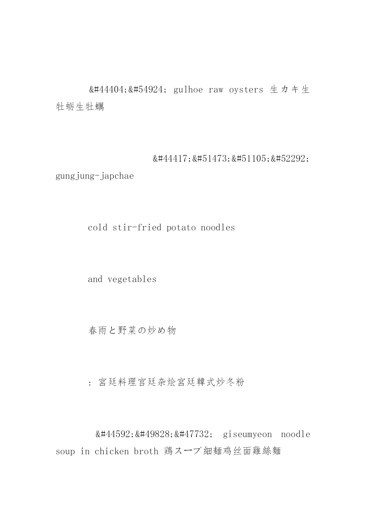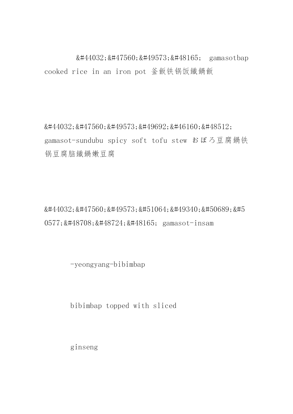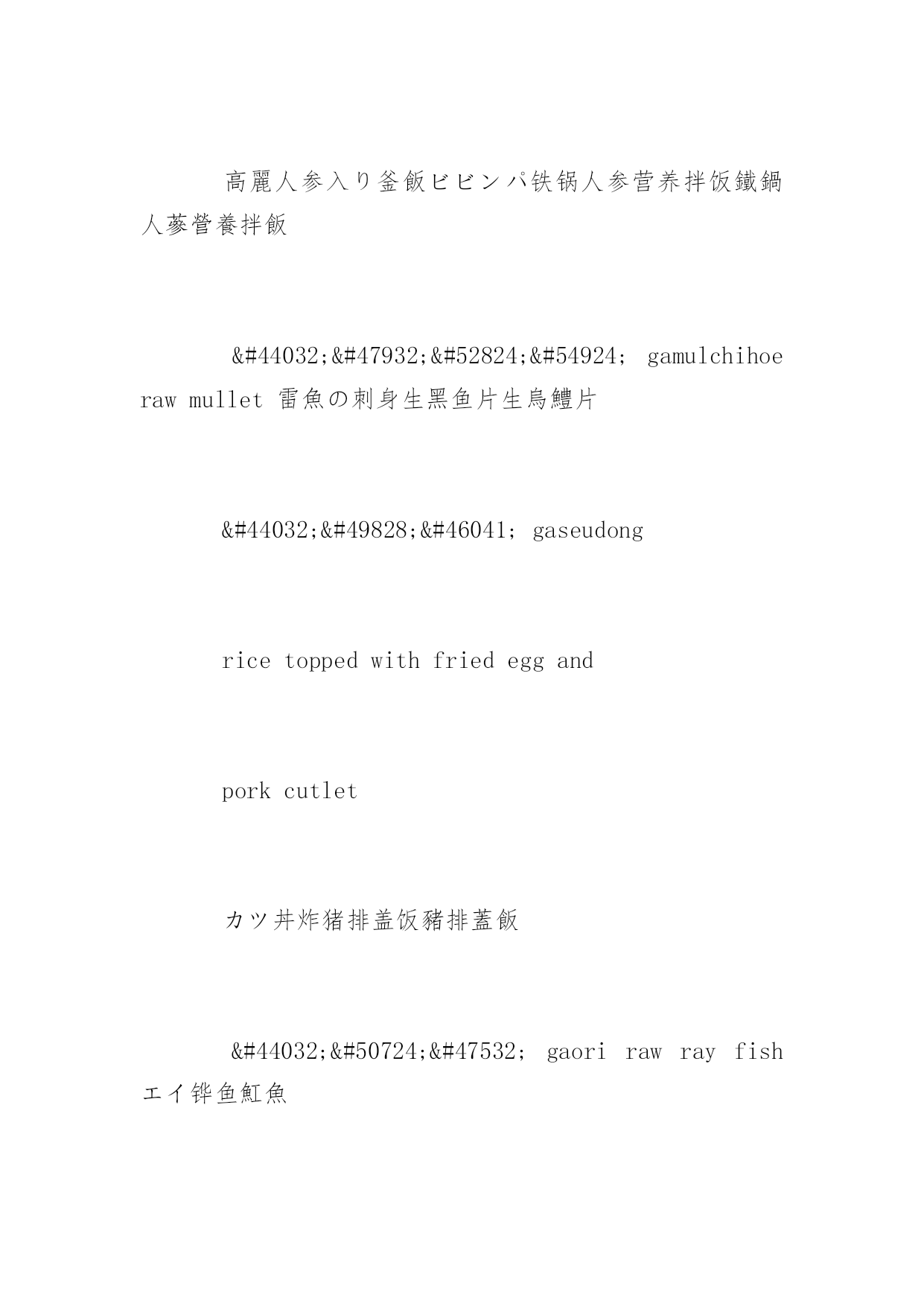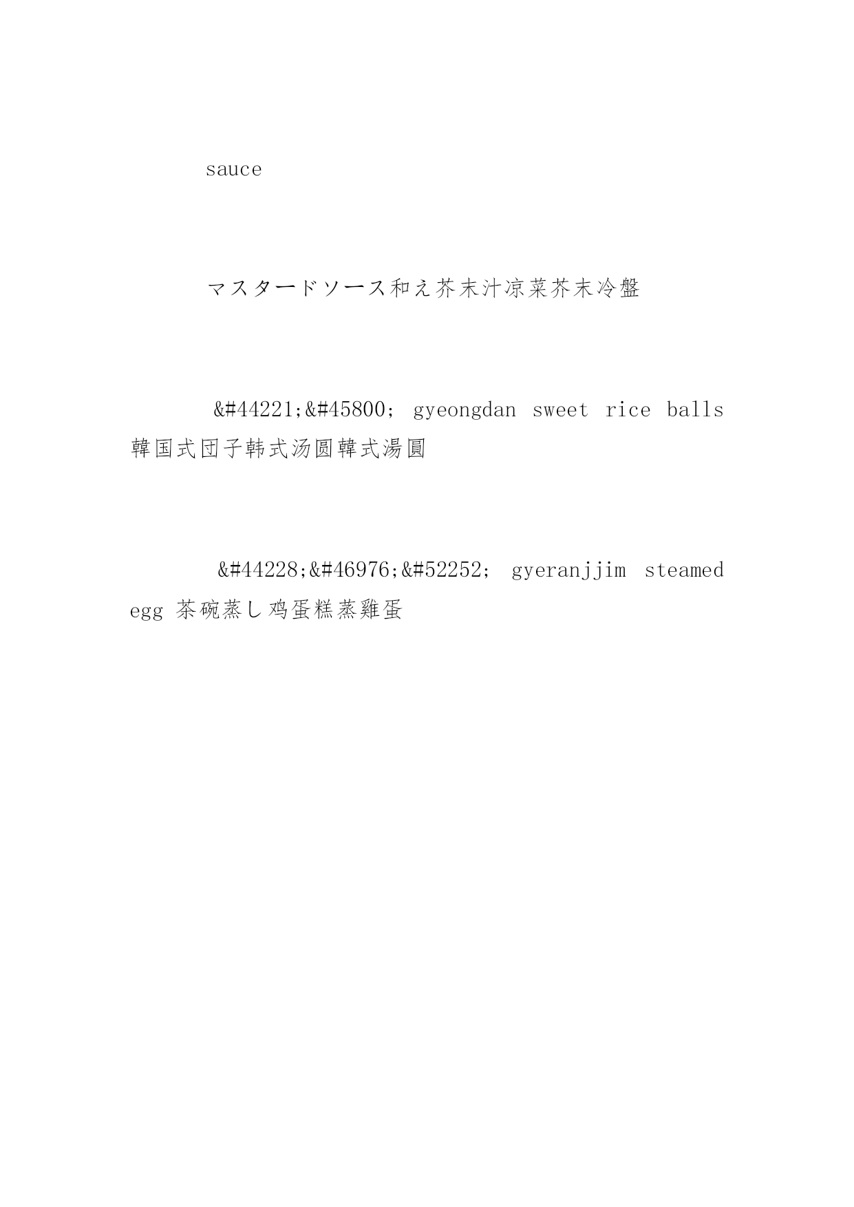 韩语考试餐厅食物词汇2017年韩语考试餐厅食物词汇Youmaybetoocunningforone,butnotforall.以下是小编为大家搜索整理的2017年韩语考试餐厅食物词汇,希望能给大家带来帮助!更多精彩内容请及时关注我们应届毕业生考试网!굴찜guljjimsteamedoysters蒸カキ清蒸牡蛎清蒸牡蠣굴탕수gul-tangsuyuksweetandsouroystersカキ酢豚糖醋牡蛎糖醋牡蠣굴해물파전gul-haemul-pajeonoysterandseafoodpancakeカキのお好み焼き牡蛎海鲜葱饼牡蠣海鮮蔥餅굴회gulhoerawoysters生カキ生牡蛎生牡蠣궁중잡채gungjung-japchaecoldstir-friedpotatonoodlesandvegetables春雨と野菜の炒め物:宮廷料理宫廷杂烩宮廷韓式炒冬粉기스면giseumyeonnoodlesoupinchickenbroth鶏スープ細麺鸡丝面雞絲麵김밥gimbapricerolledinlaver韓国式のり巻き紫菜包饭海苔壽司김치kimchikimchiキムチ泡菜泡菜김치만두kimchi-mandudumplingsstuffedwithkimchiキムチ餃子泡菜饺子泡菜餃子김치말이kimchi-marihand-rolledkimchisushiキムチ巻き泡菜手卷泡菜手捲김치보쌈kimchi-bossamkimchiwrapswithpork蒸し豚肉のキムチ白菜包み泡菜包肉泡菜生菜包飯김치볶음밥kimchi-bokkeumbapfriedricewithkimchiキムチチャーハン辣白菜炒饭泡菜炒飯김치전kimchijeonkimchipancakeキムチのチヂミ泡菜饼泡菜煎餅가리비찜garibijjimsteamedscallops帆立貝の蒸し物清蒸扇贝清蒸扇貝가마솥굴비빔밥gamasot-gul-bibimbapbibimbaptoppedwithoystersカキの釜飯ビビンパ铁锅牡蛎拌饭鐵鍋牡蠣拌飯가마솥날치알비빔밥gamasot-nalchial-bibimbapbibimbaptoppedwithfishroe魚卵入り釜飯ビビンパ铁锅飞鱼子拌饭鐵鍋飛魚卵拌飯가마솥밥gamasotbapcookedriceinanironpot釜飯铁锅饭鐵鍋飯가마솥순두부gamasot-sundubuspicysofttofustewおぼろ豆腐鍋铁锅豆腐脑鐵鍋嫩豆腐가마솥인삼영양비빔밥gamasot-insam-yeongyang-bibimbapbibimbaptoppedwithslicedginseng高麗人参入り釜飯ビビンパ铁锅人参营养拌饭鐵鍋人蔘營養拌飯가물치회gamulchihoerawmullet雷魚の刺身生黑鱼片生烏鱧片가스동gaseudongricetoppedwithfriedeggandporkcutletカツ丼炸猪排盖饭豬排蓋飯가오리gaorirawrayfishエイ铧鱼魟魚가자미구이